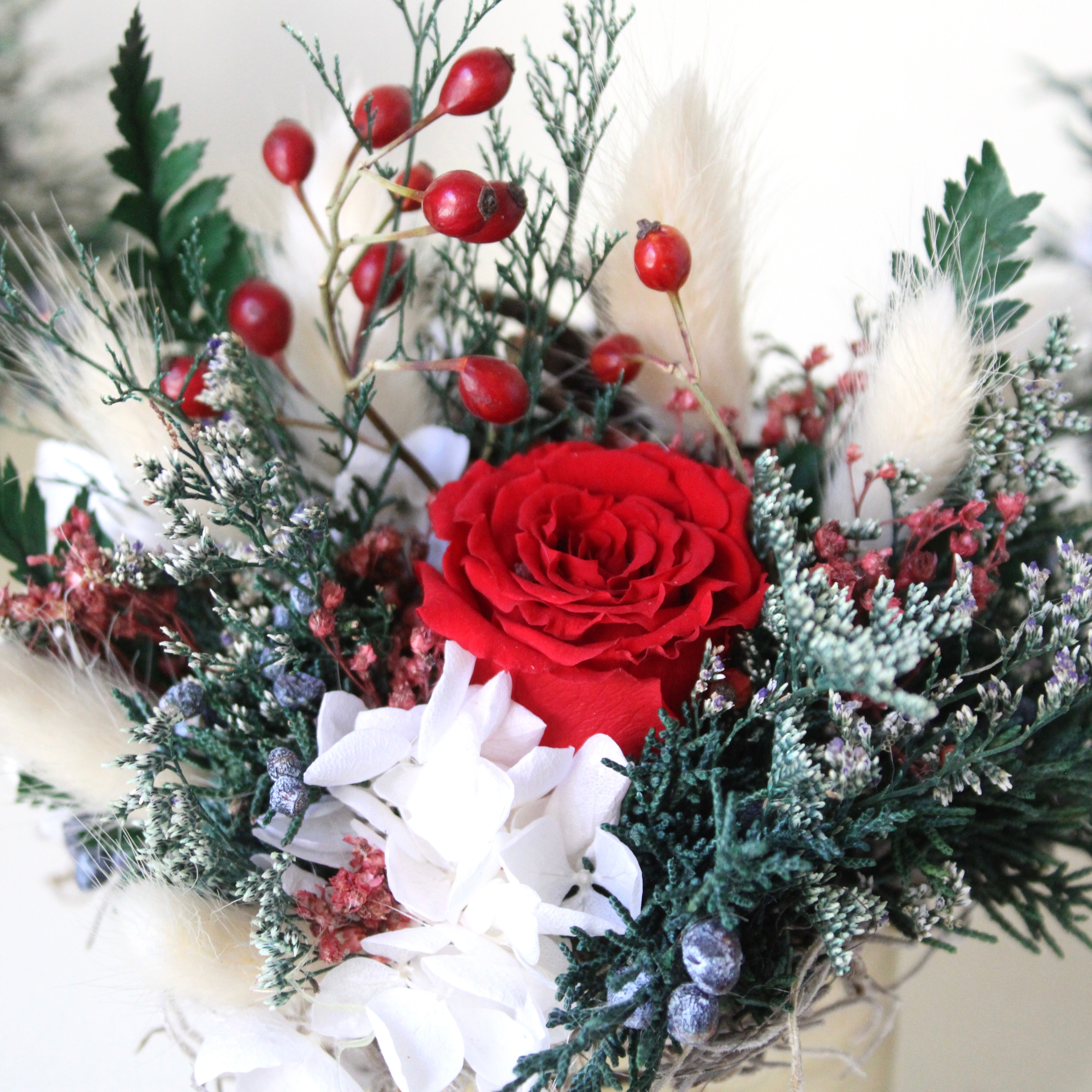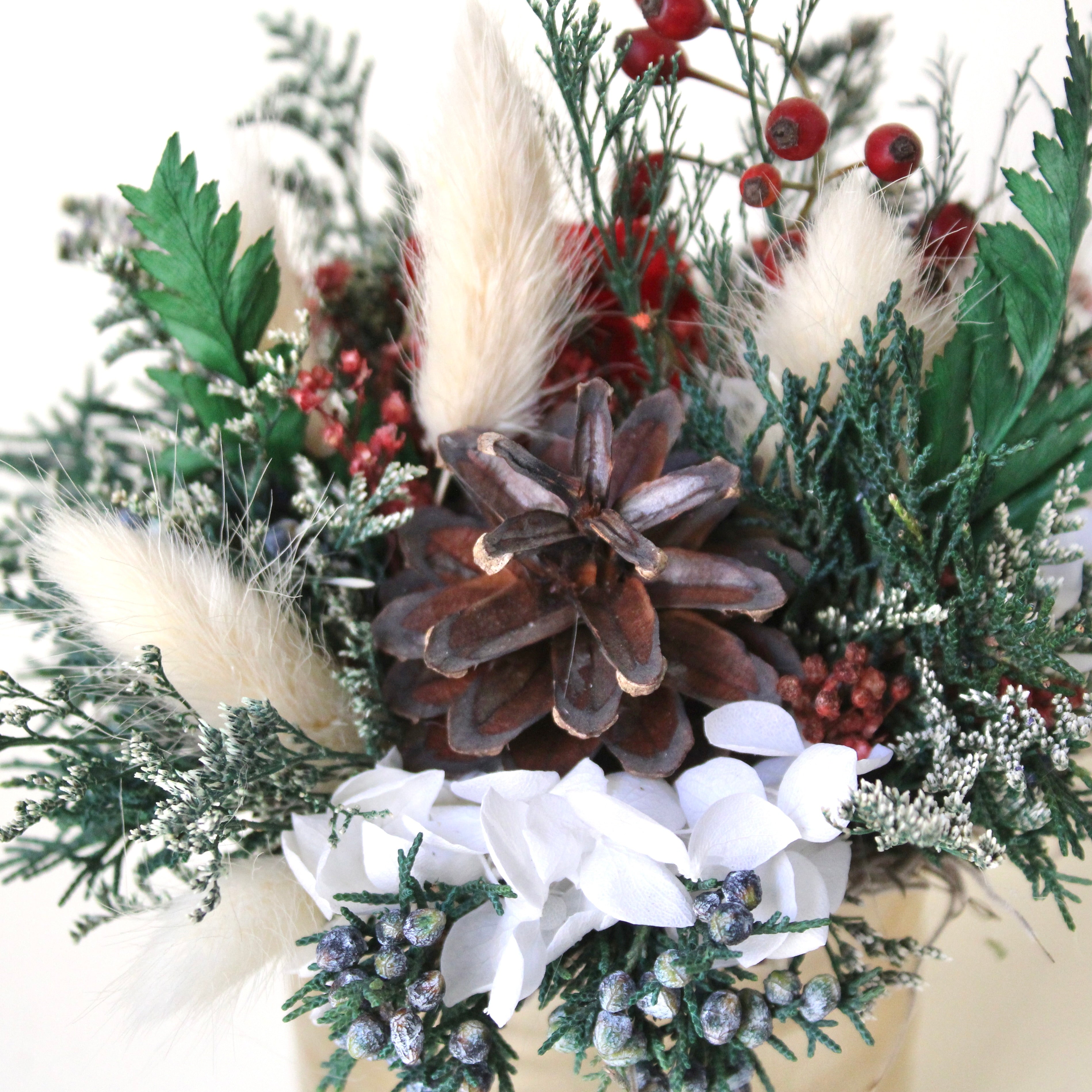 Good Tidings Cup features bunny tails, pinecone, hydrangea, juniper, cassia, reships, broom bloom, and preserved rose.