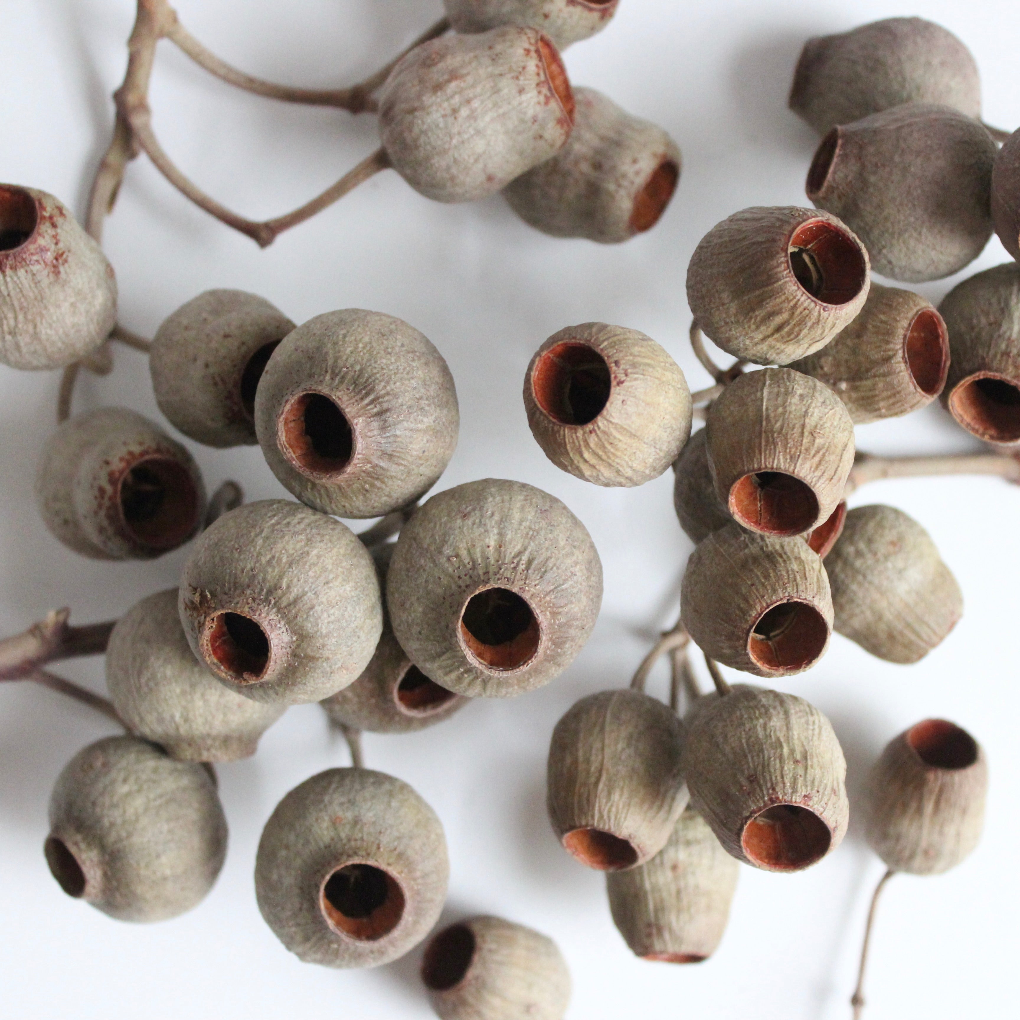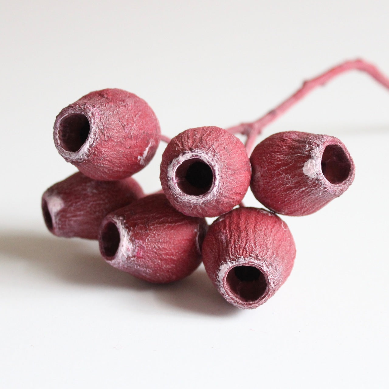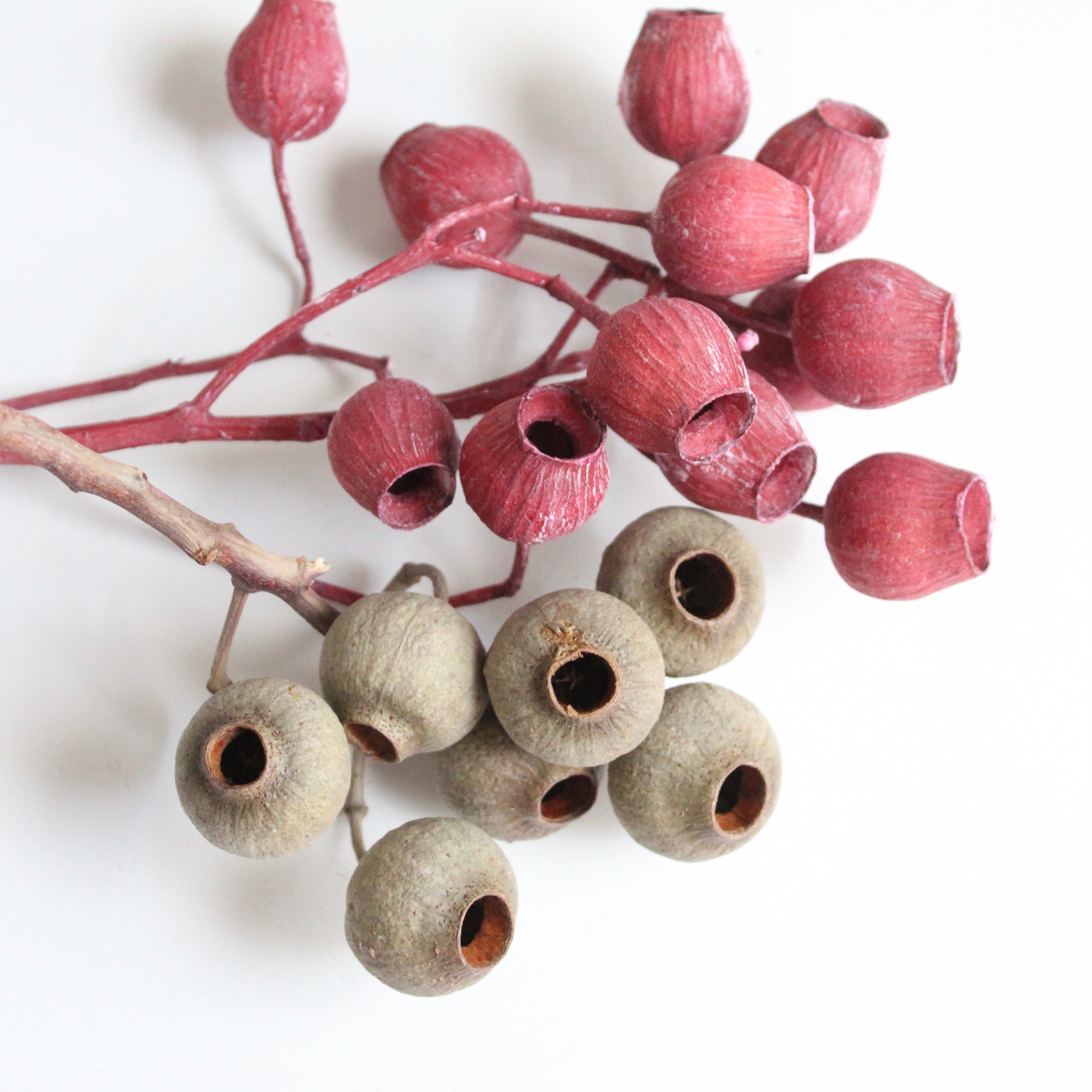 Bell Gum Branch has been dyed a soft red and boasts intriguing pods. Pair with other pods and branches for a minimal, modern display or add to softer florals and leaves for a solid design detail.