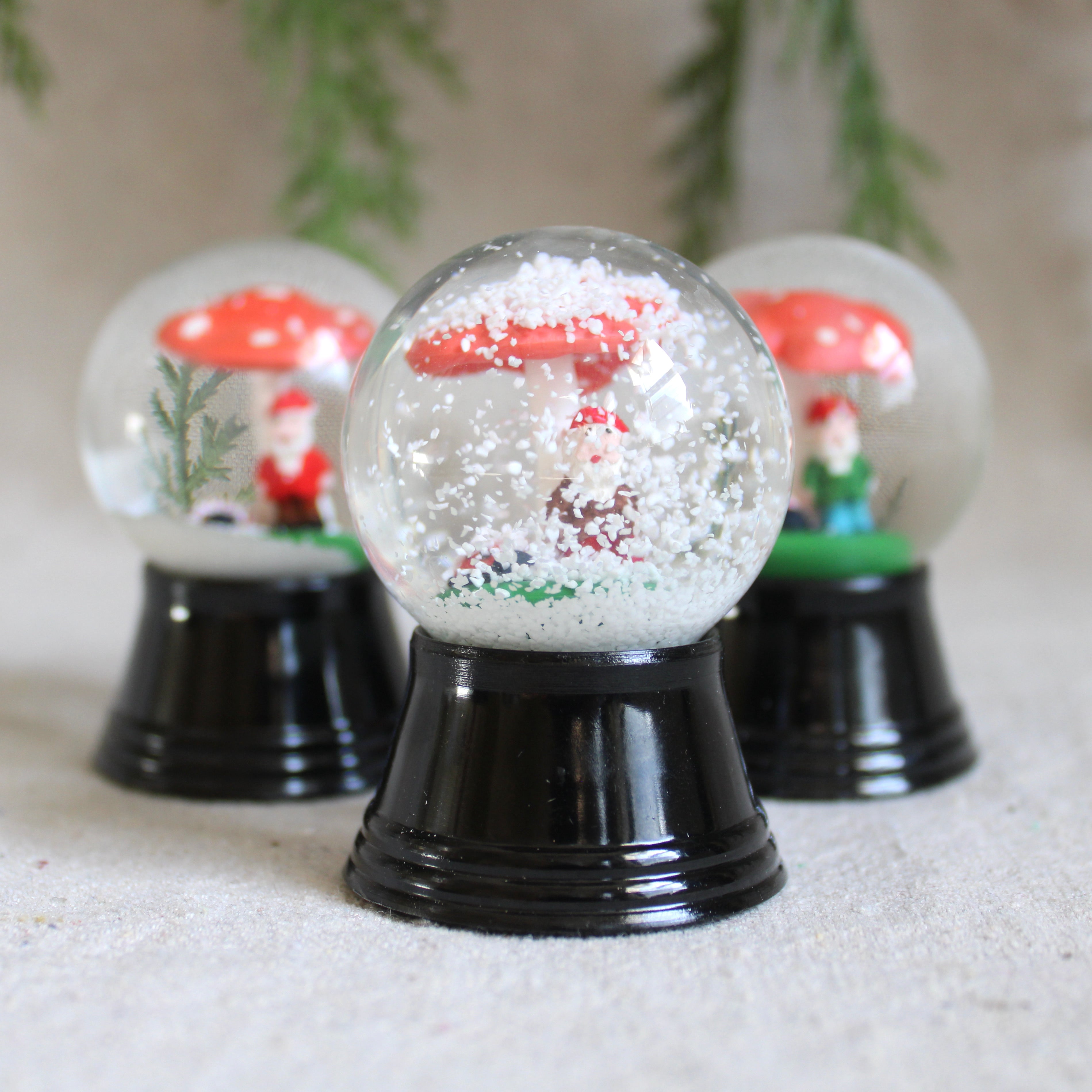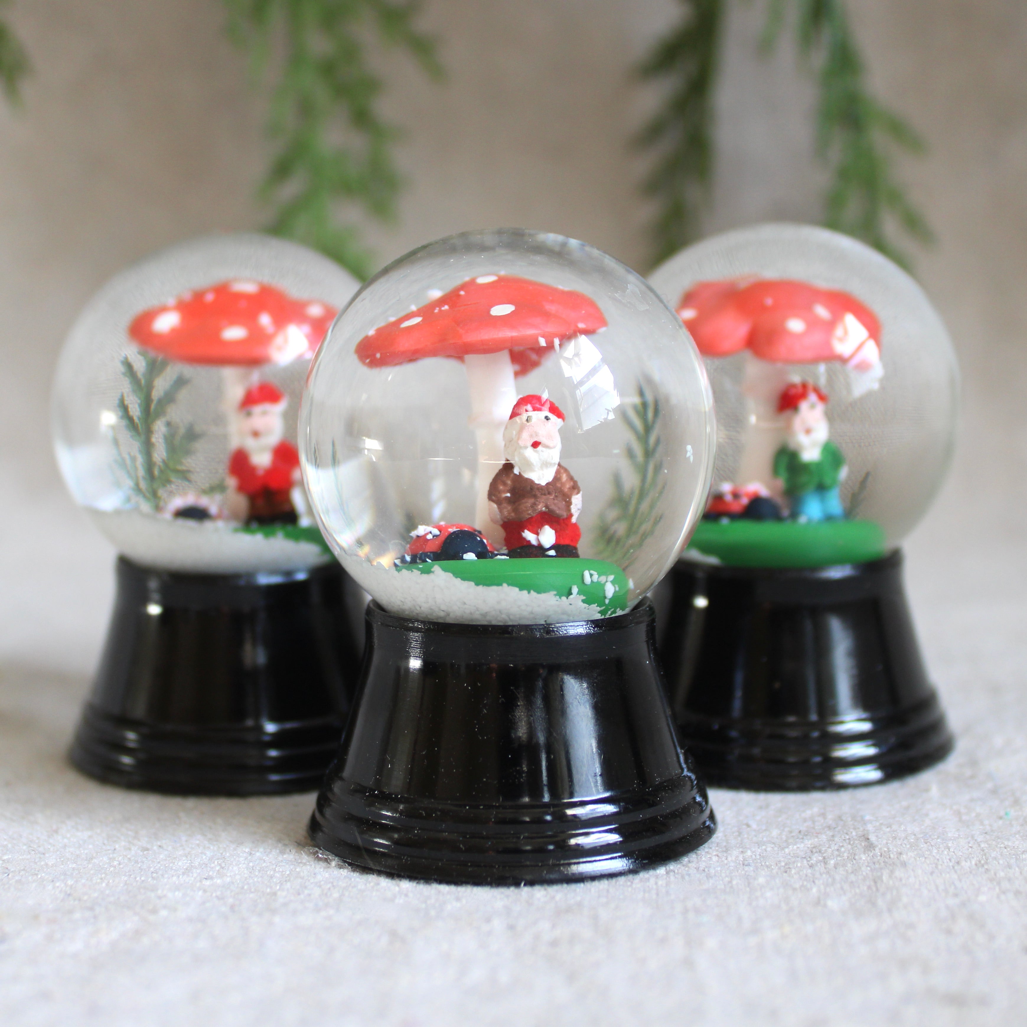 Give a shake and create a winter wonderland! A sweet little gnome sits happily beneath a mushroom awaiting dreamy snowfall.