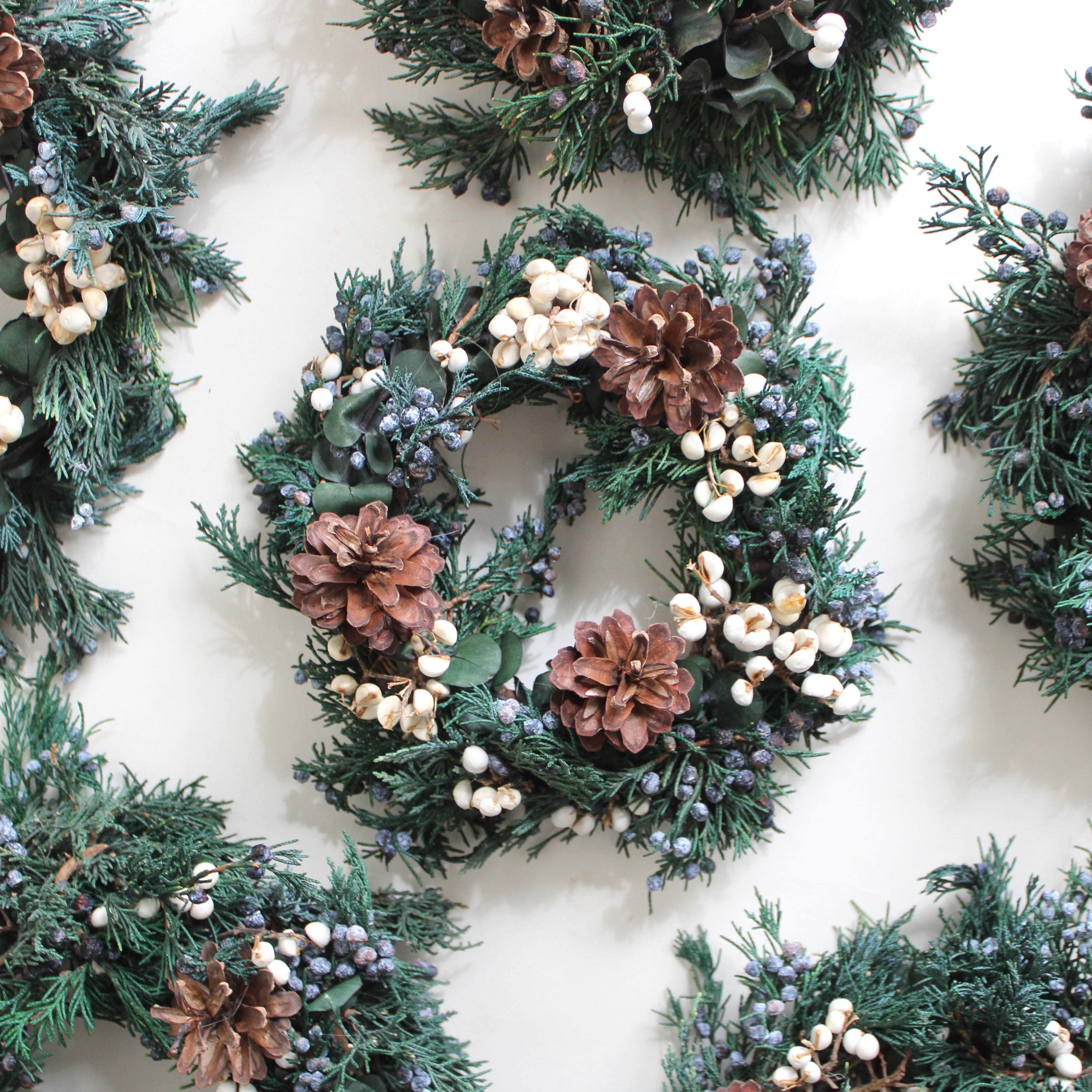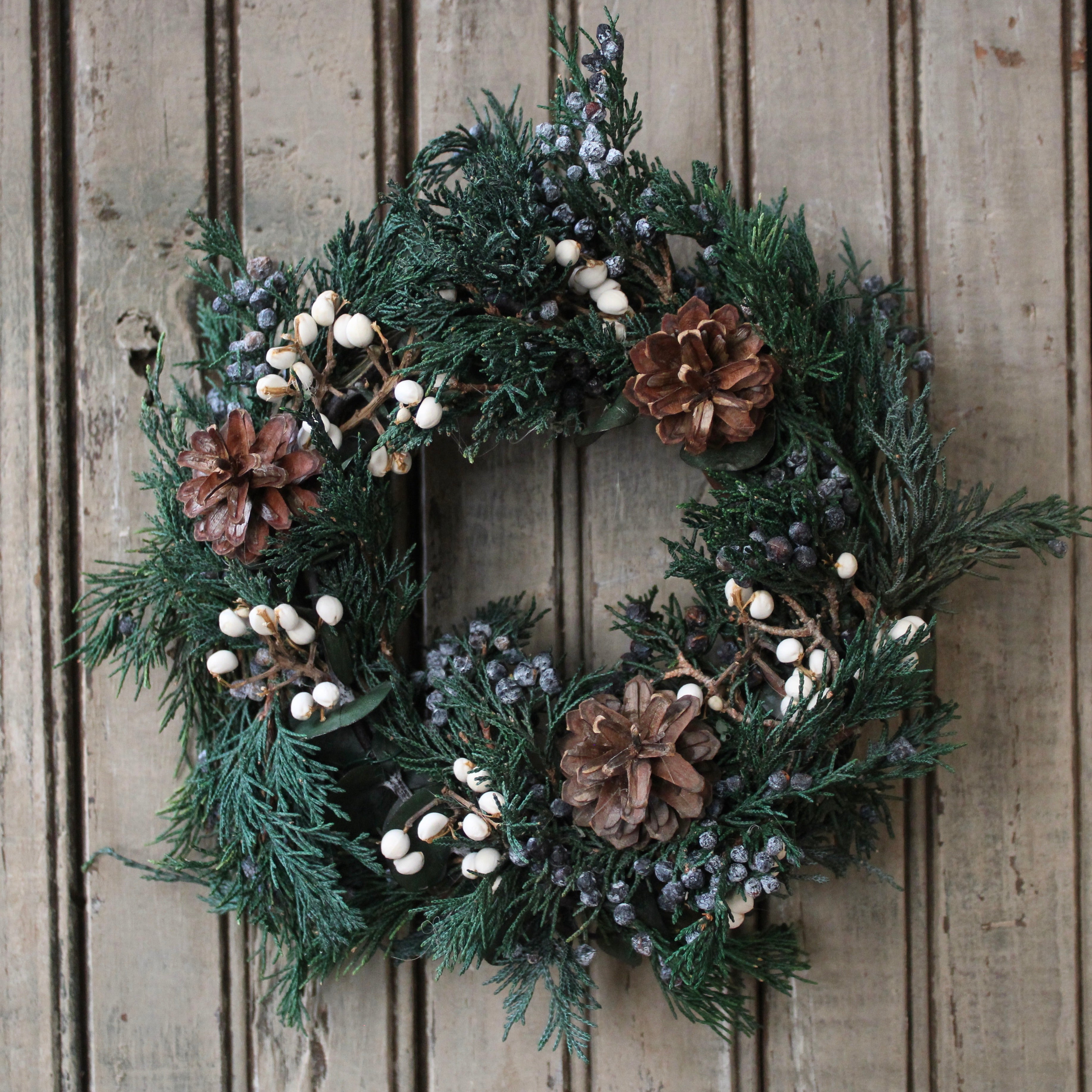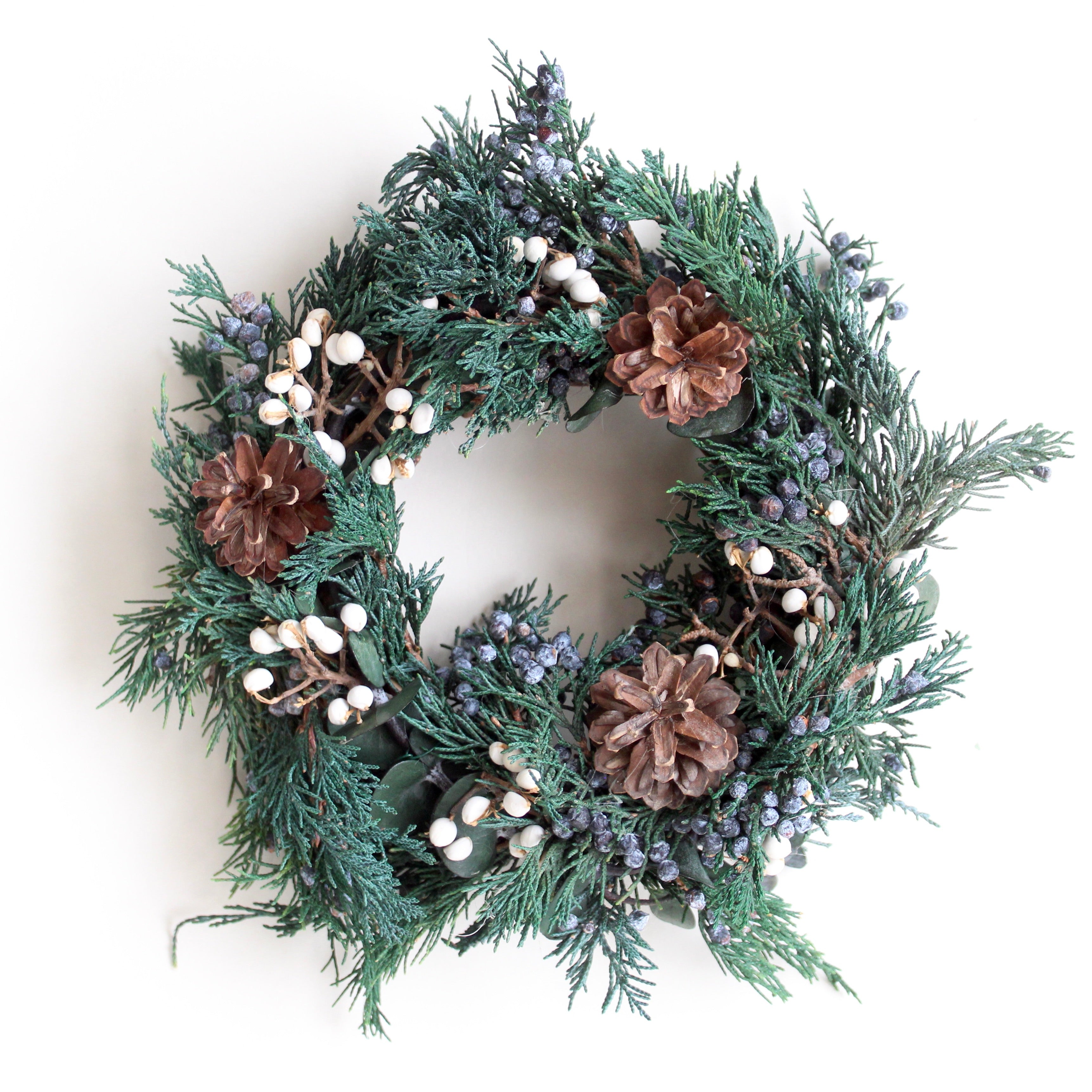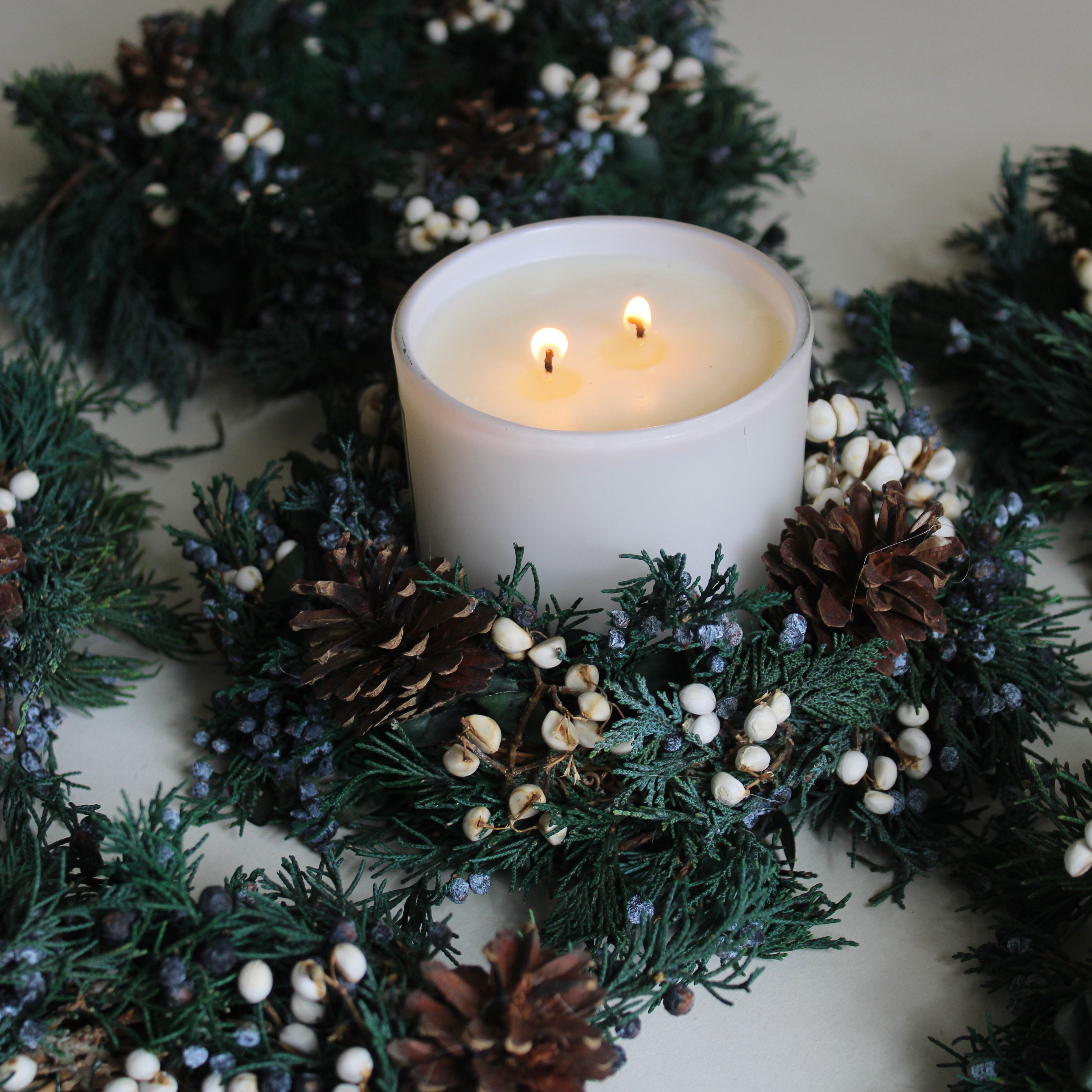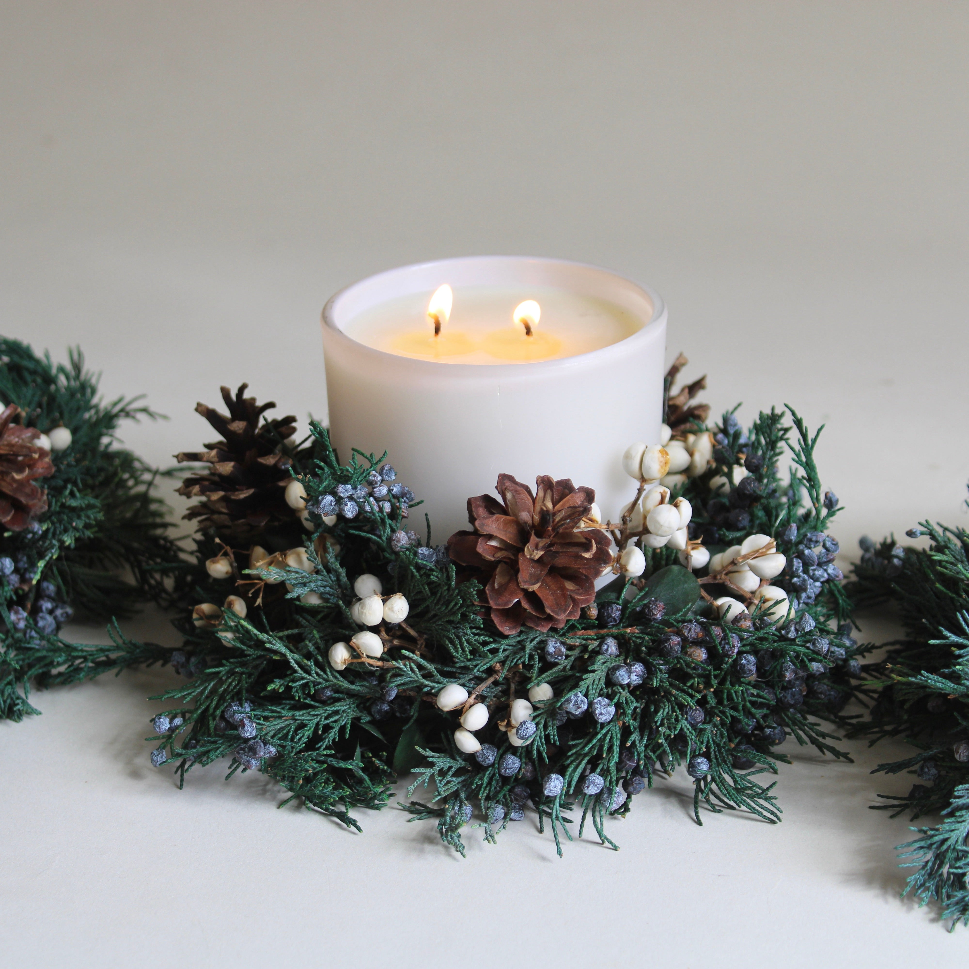 Evergreen Candle Ring Wreath features tallow berry, eucalyptus, juniper, and pinecones.