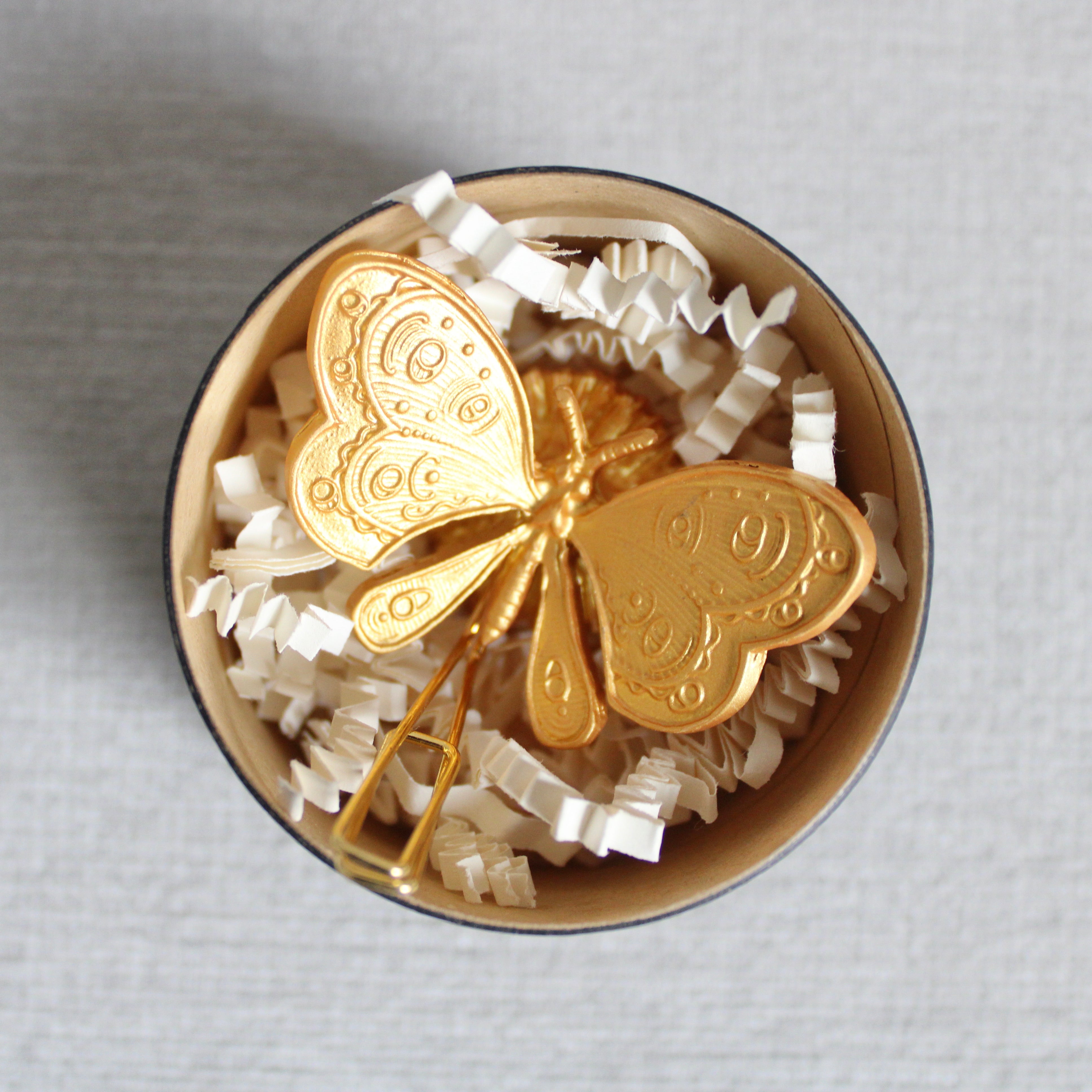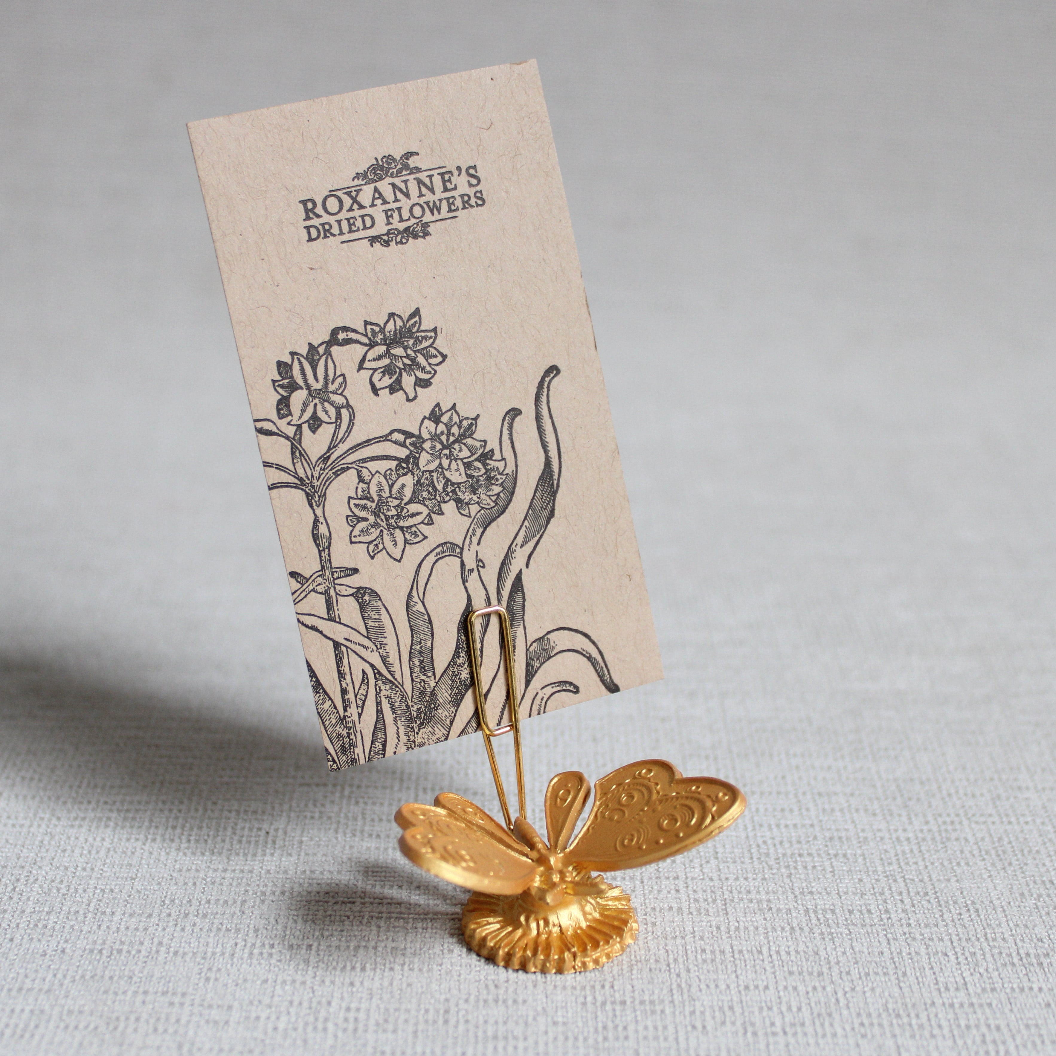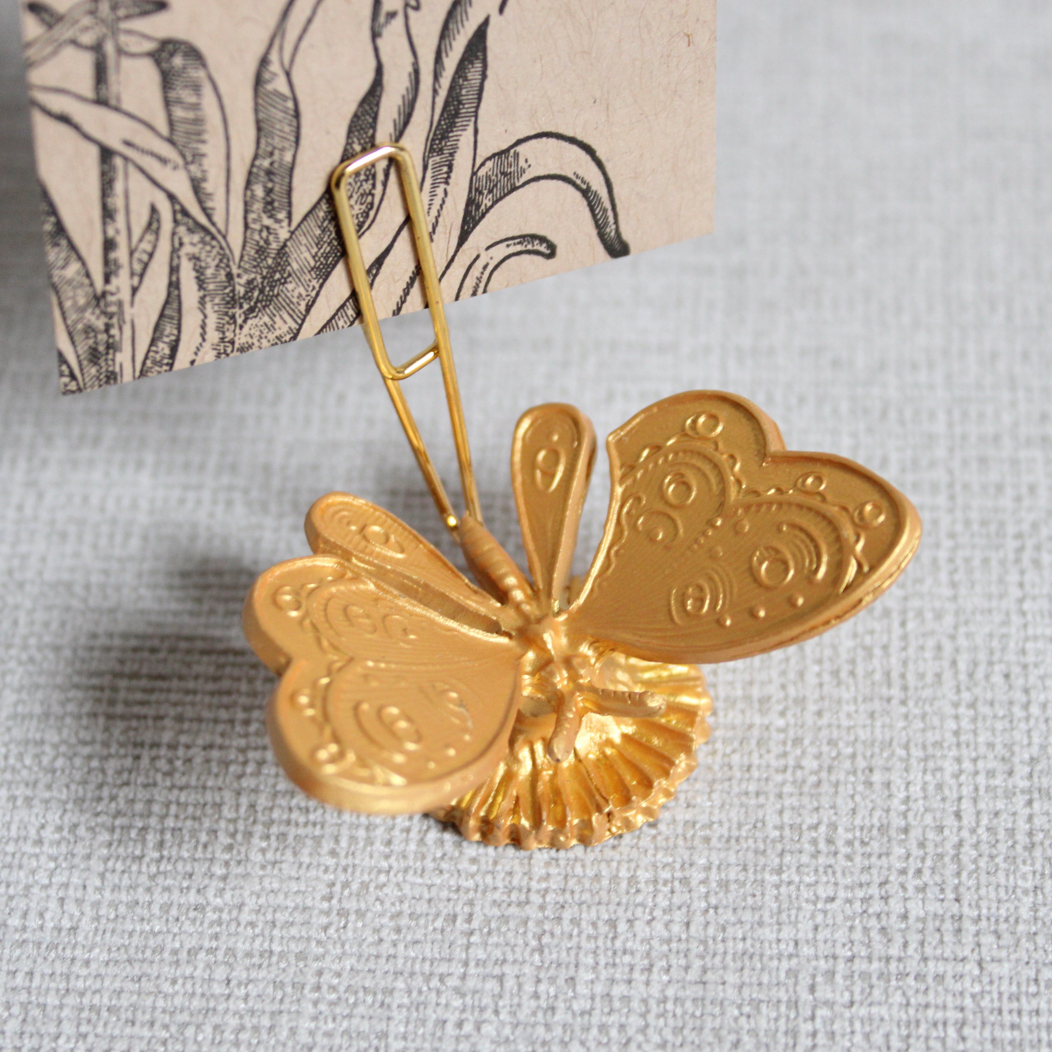 A beautiful, little, gold butterfly to hold your favorite photo, piece of ephemera, or beloved kept flowers. Inspired by Victorian calling card holders, romance, nature, ornament, and memories.