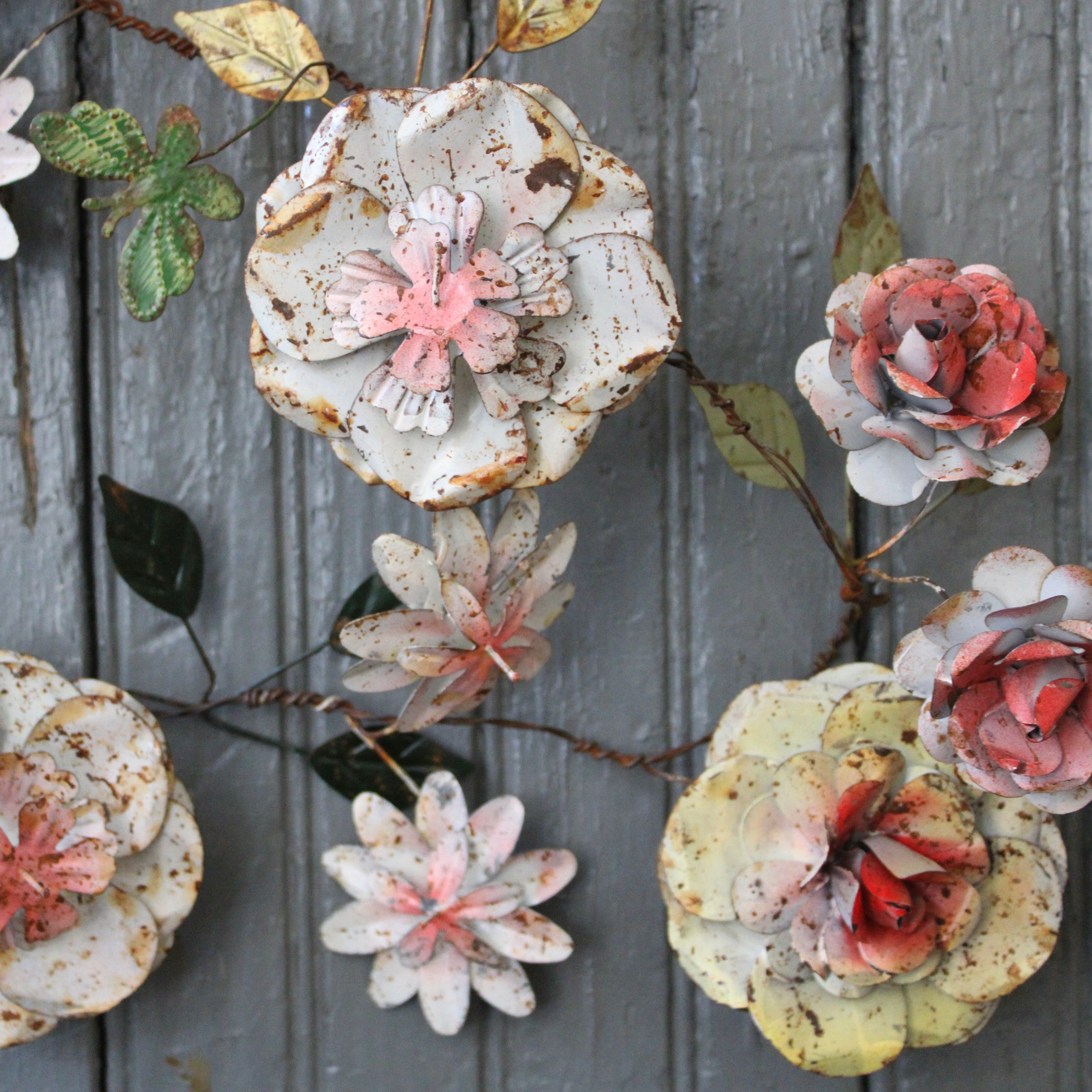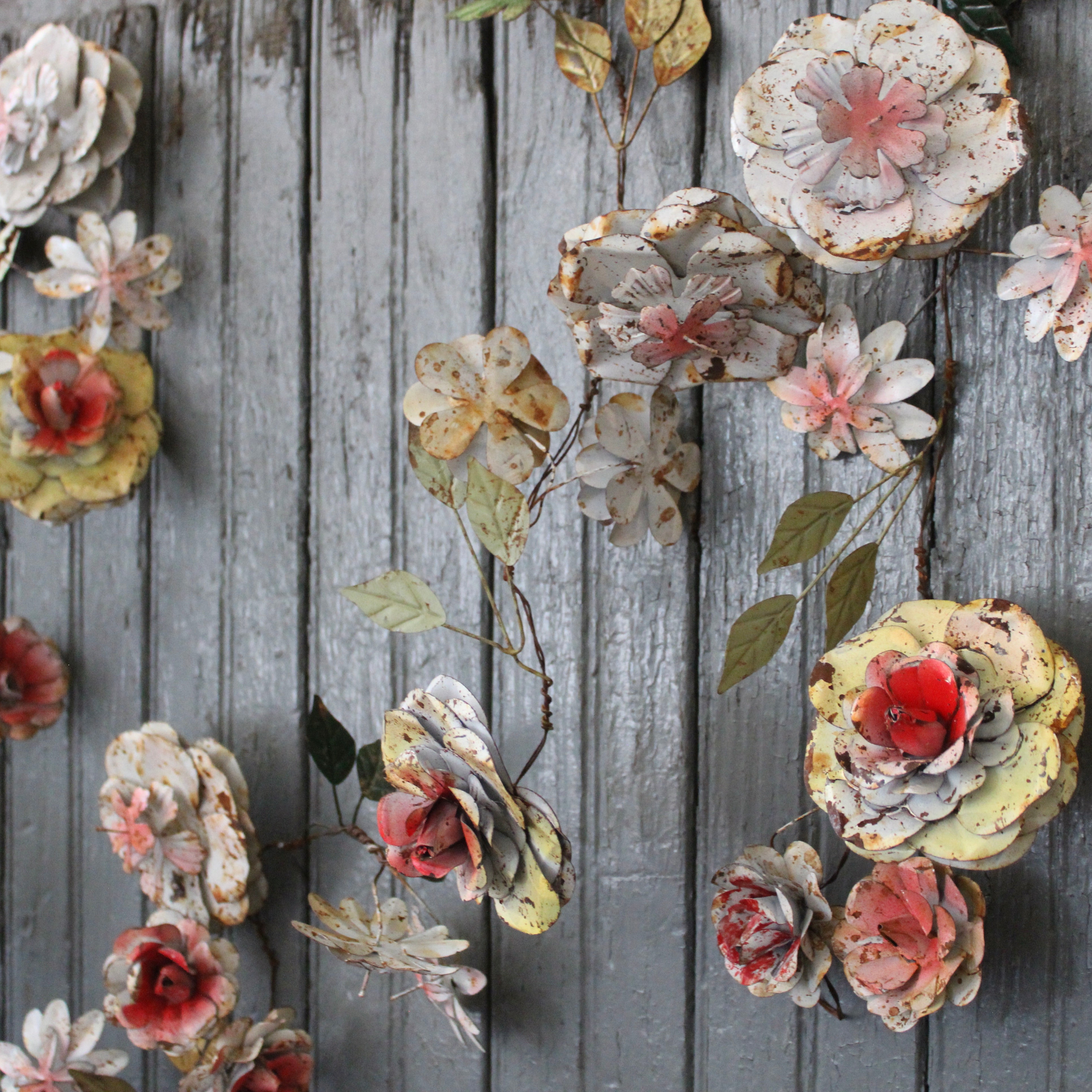 Whether saved for special occasions or displayed year-round, this beautiful garland adds timeless charm to any space. Inspired by the past, each vintage-style metal flower is crafted on a bendable strand for a custom display. Lovely in a garden cottage setting and just as enchanting as a whimsical accent in a modern home.