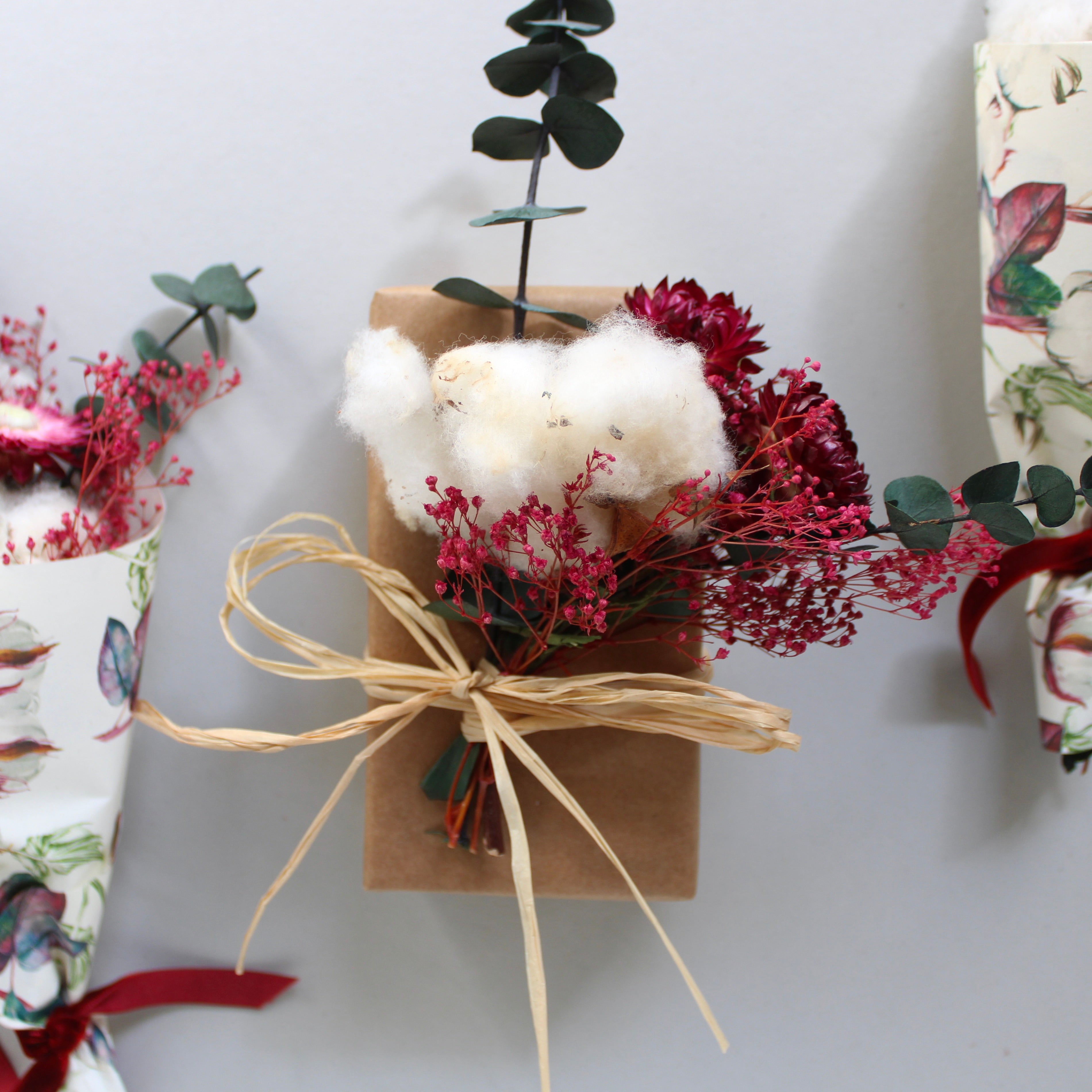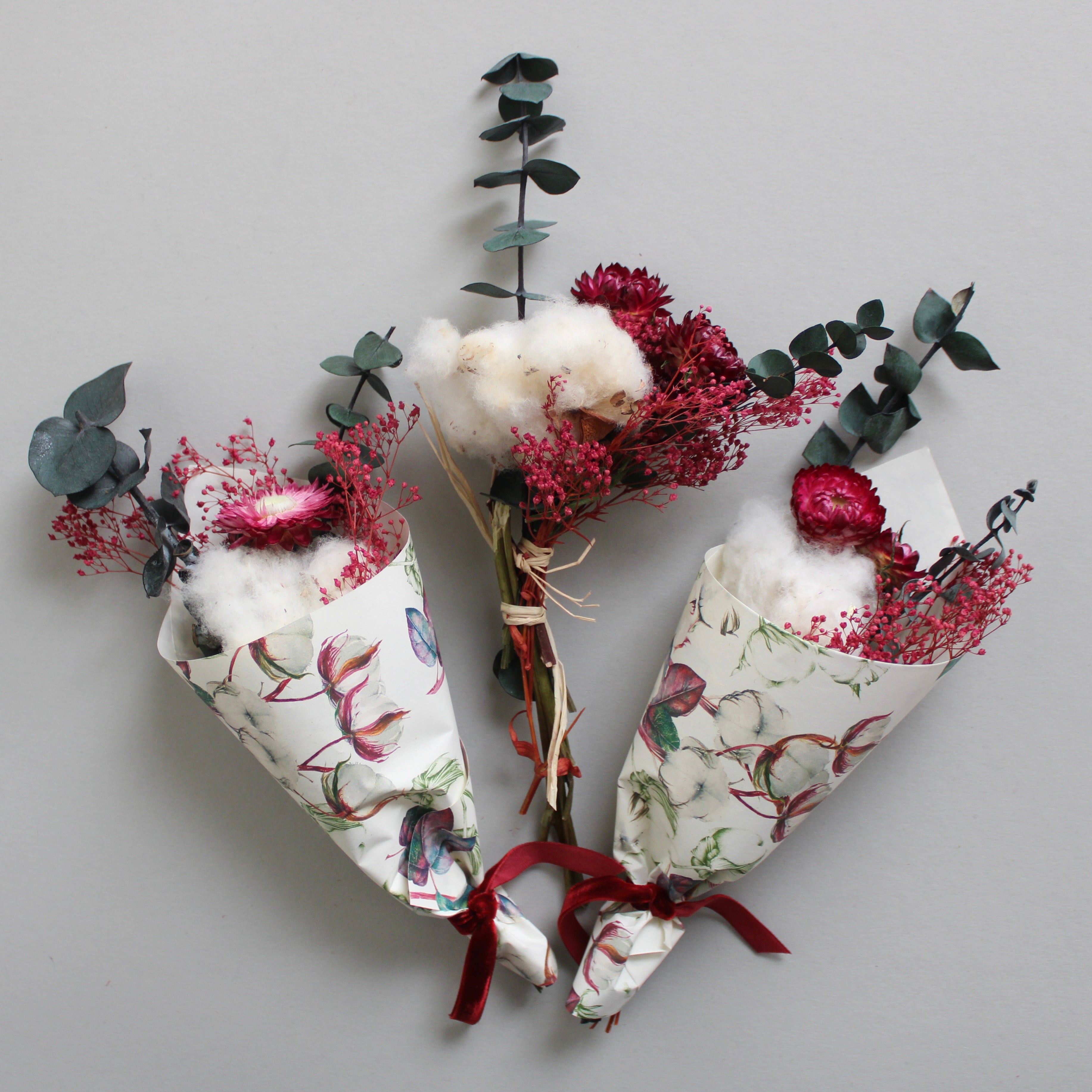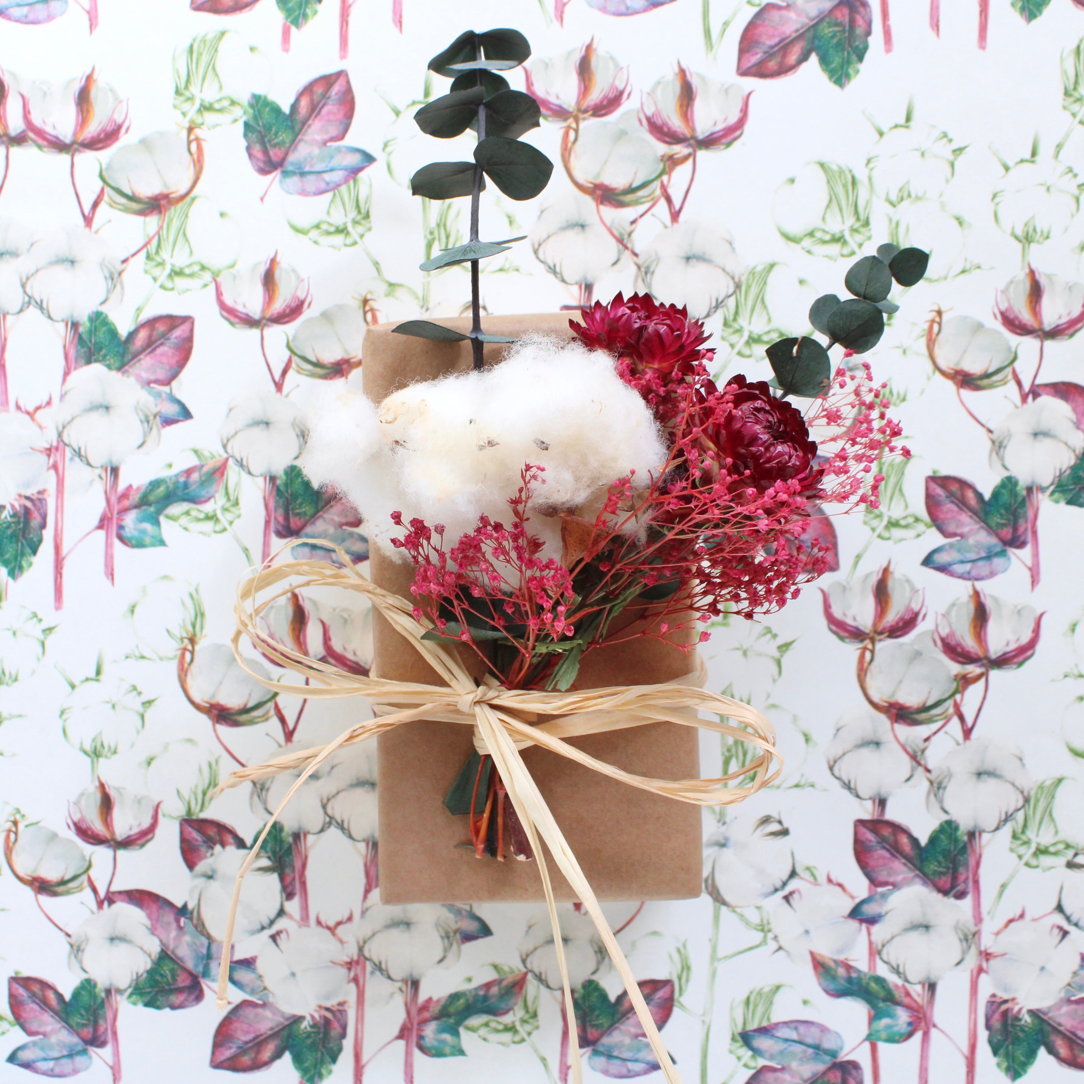 Mini Cotton Bouquet features cotton, eucalyptus, strawflower, and broom bloom.