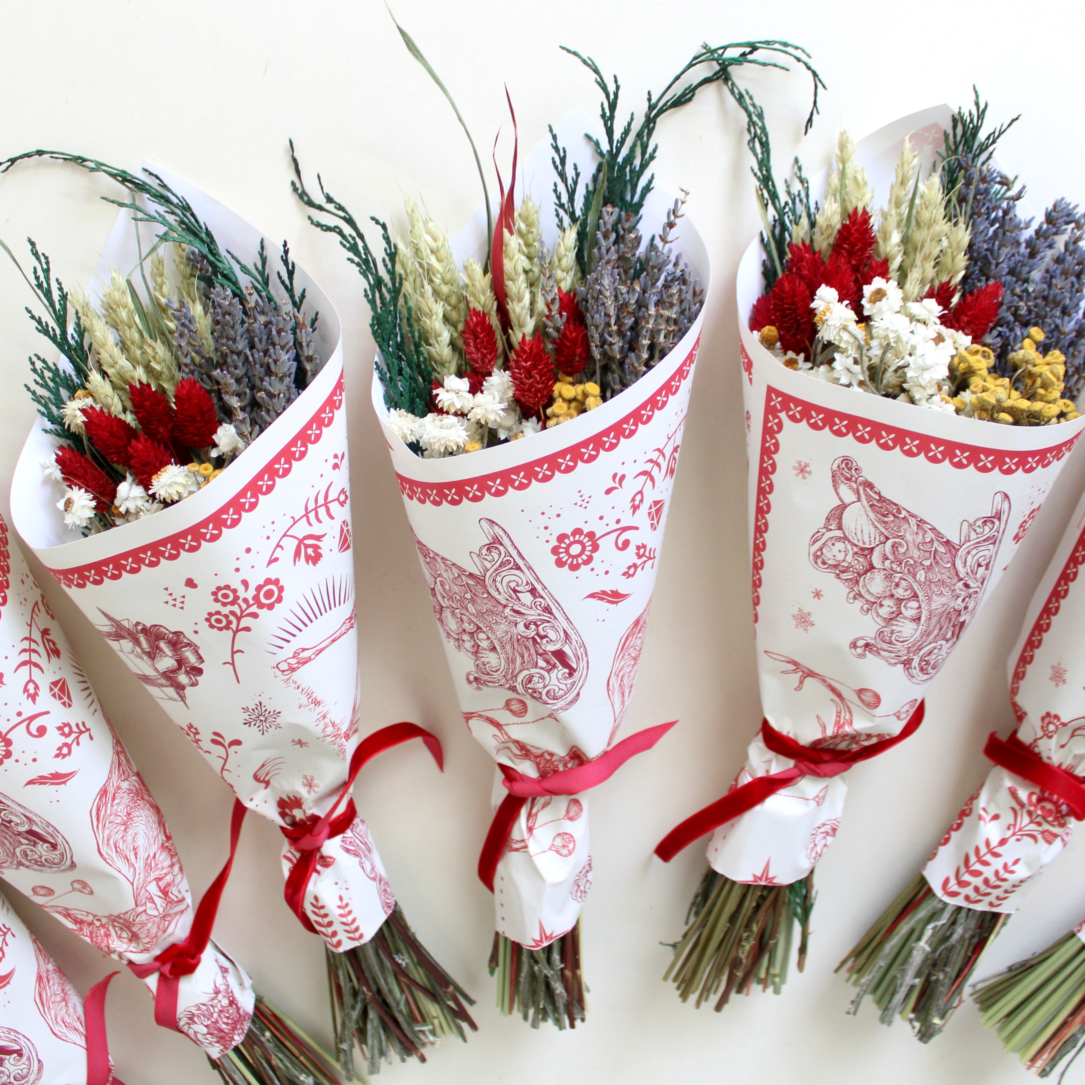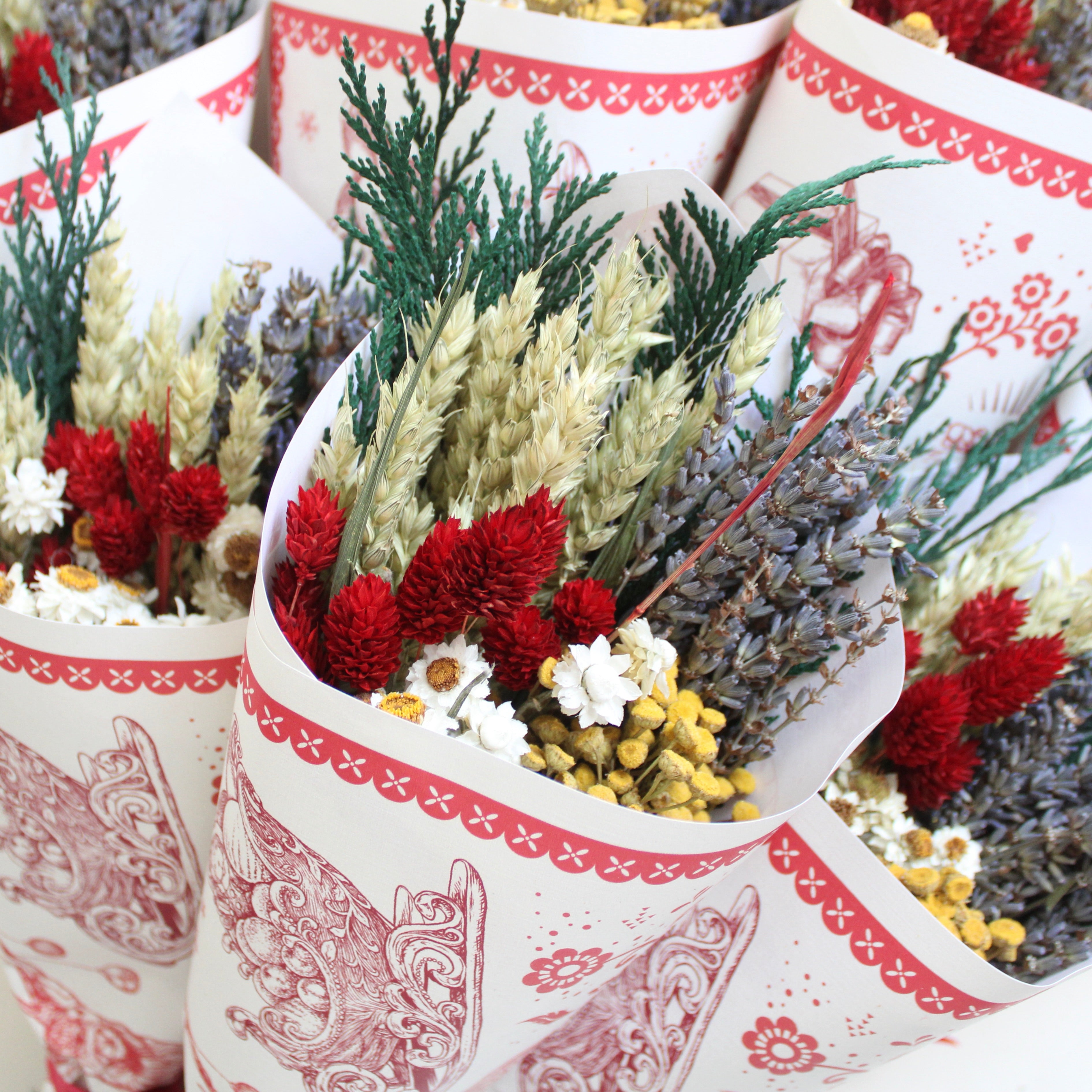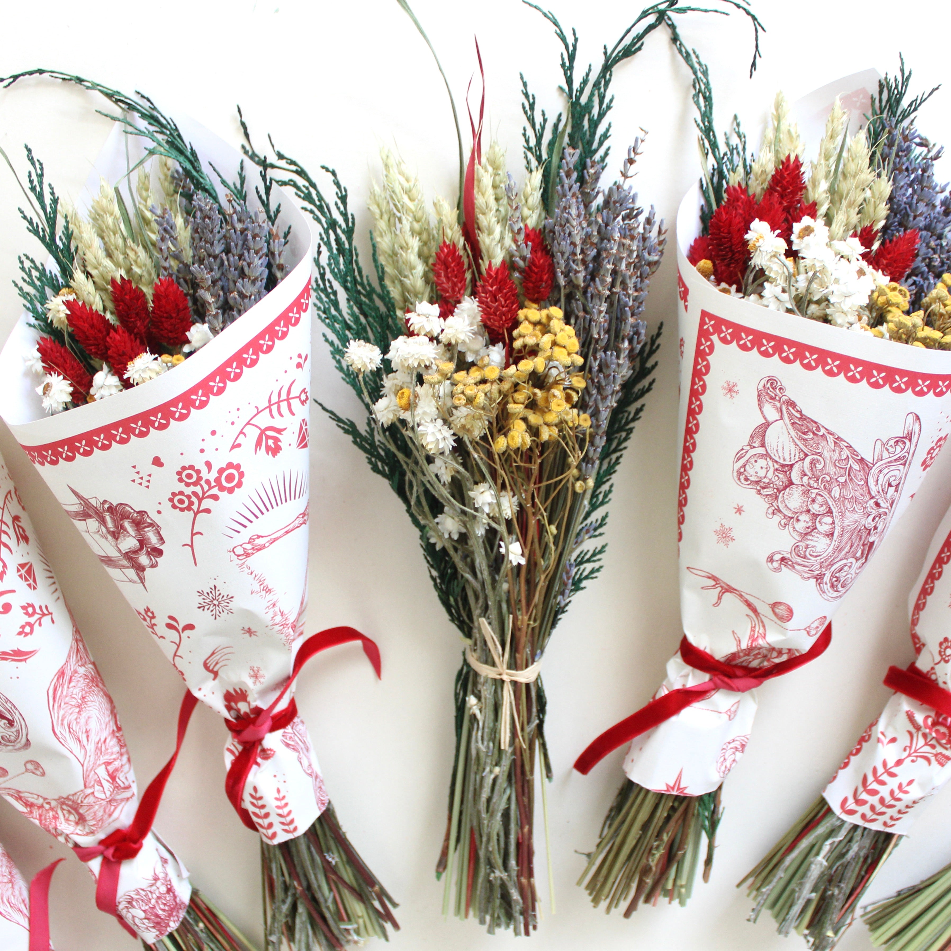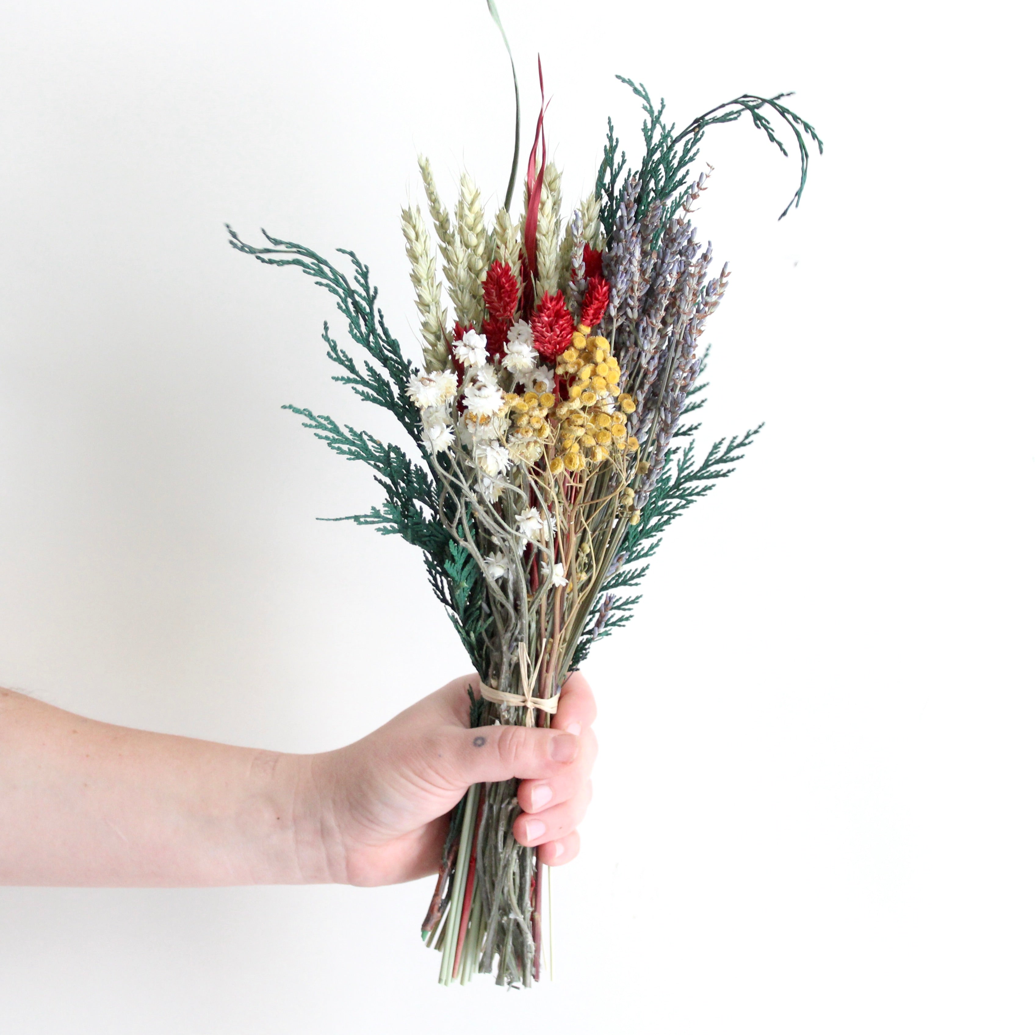 Swedish Holiday Bouquet features cedar, wheat, lavender, tansy, ammobium, and phalaris.