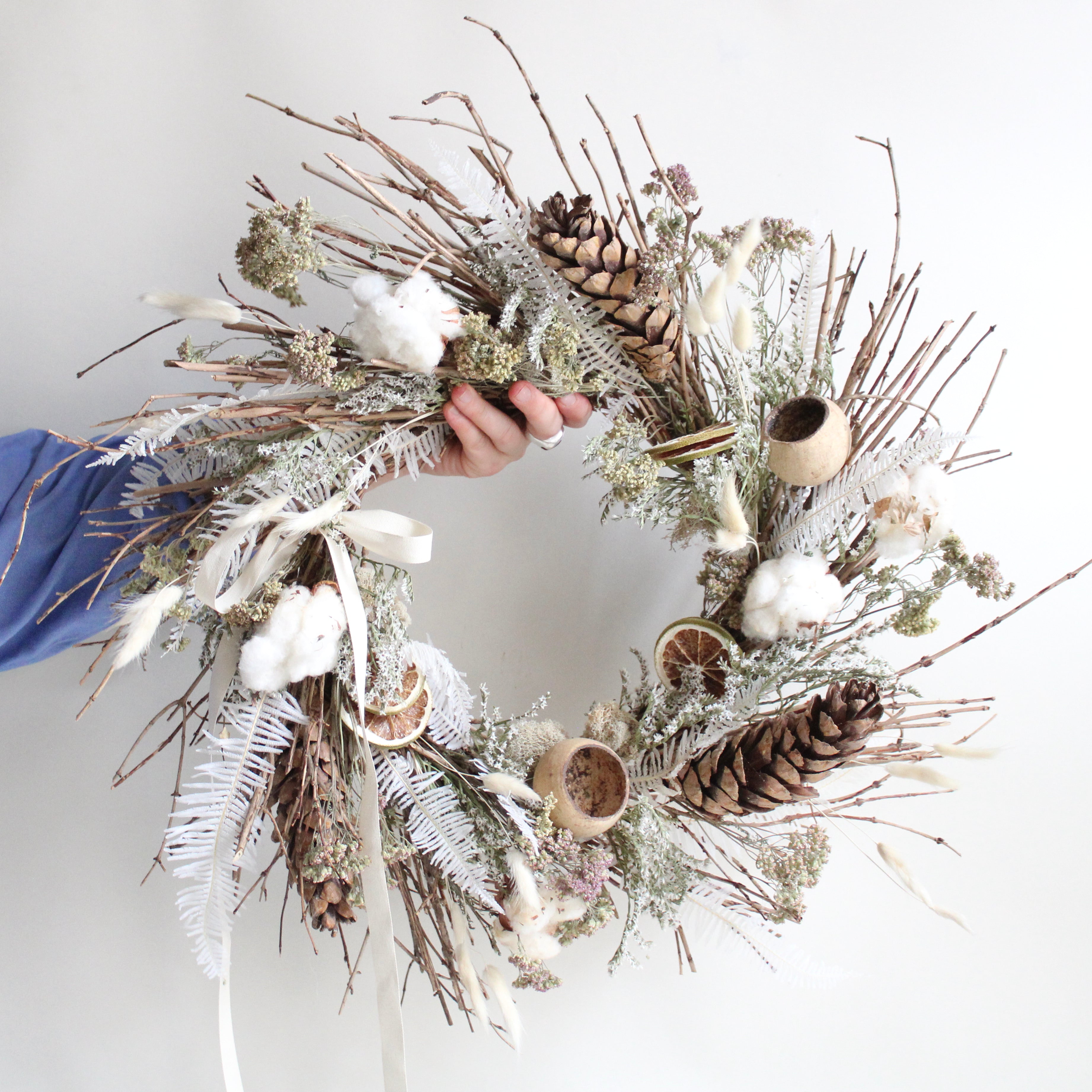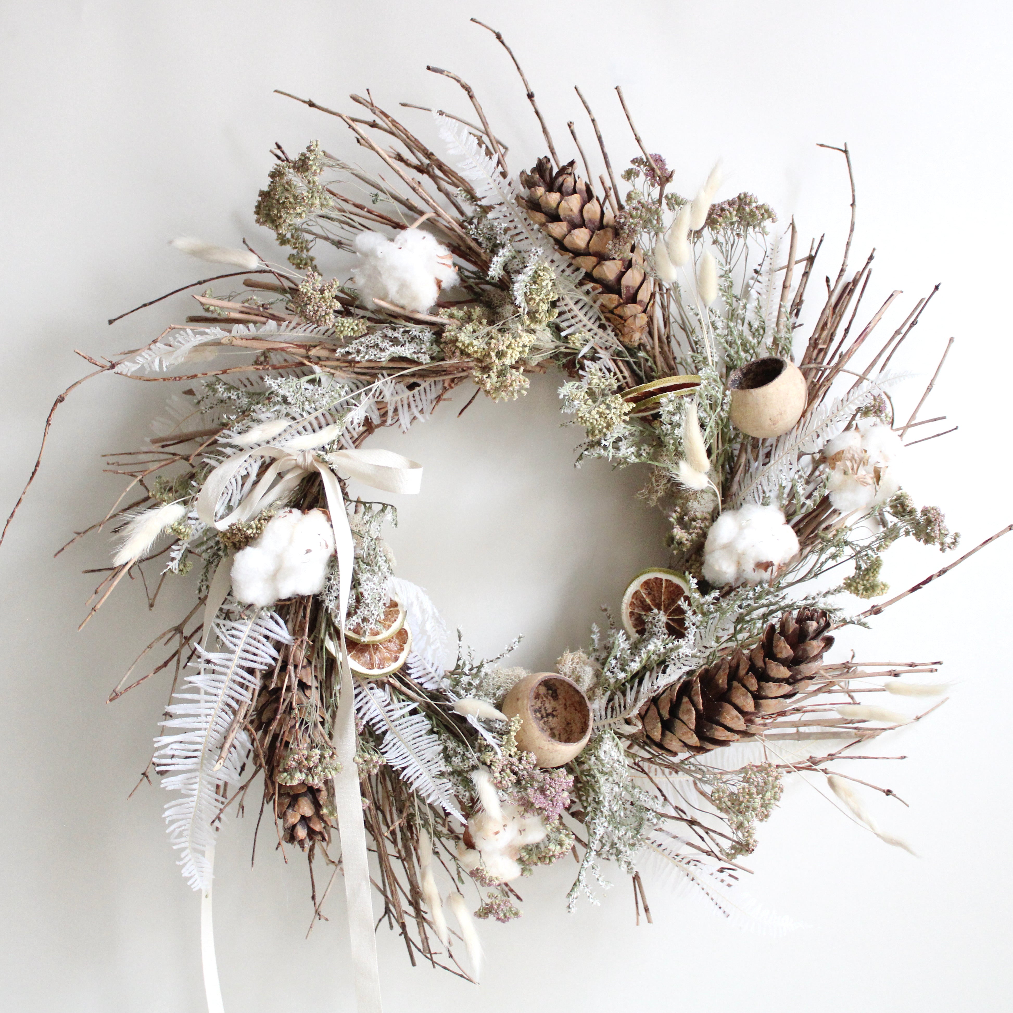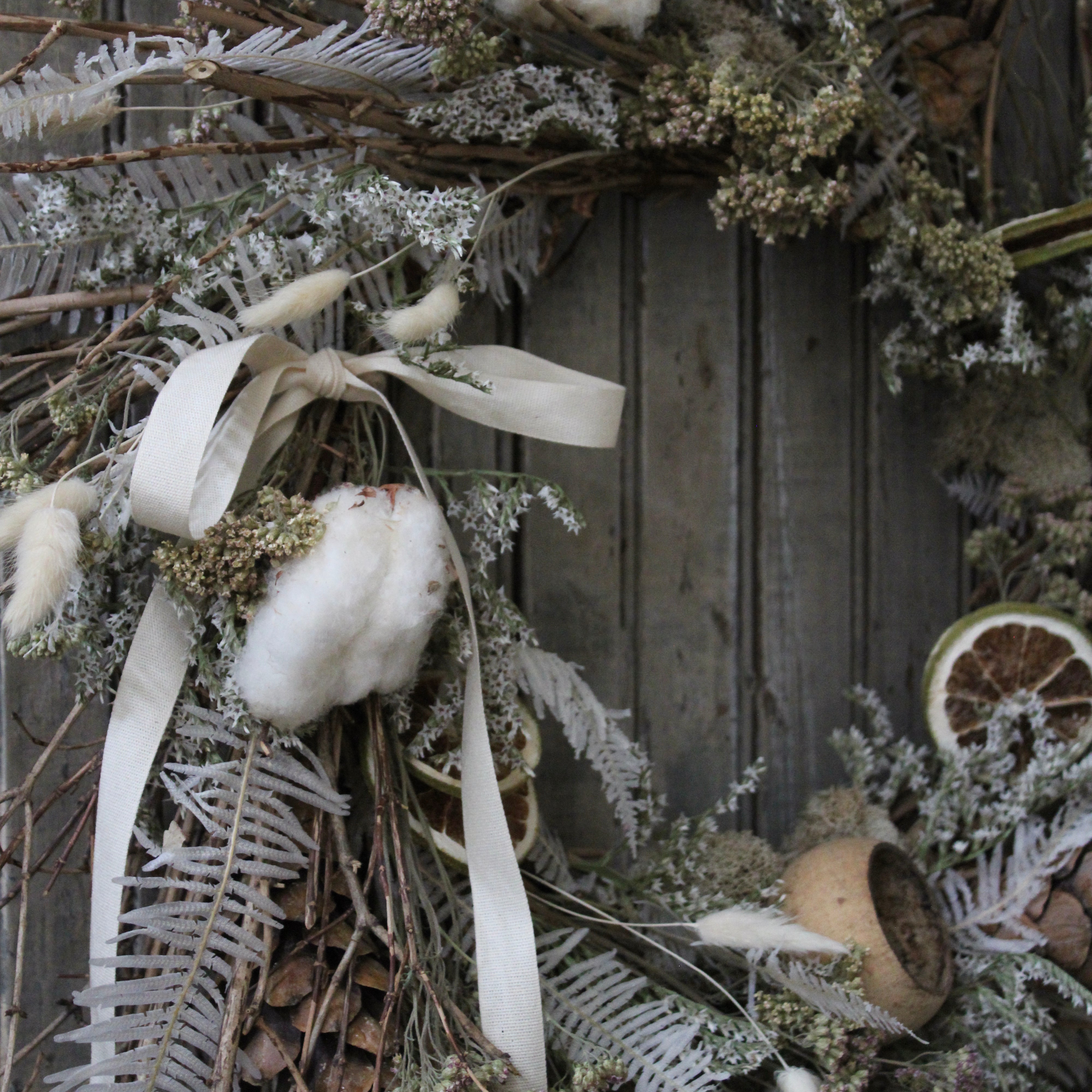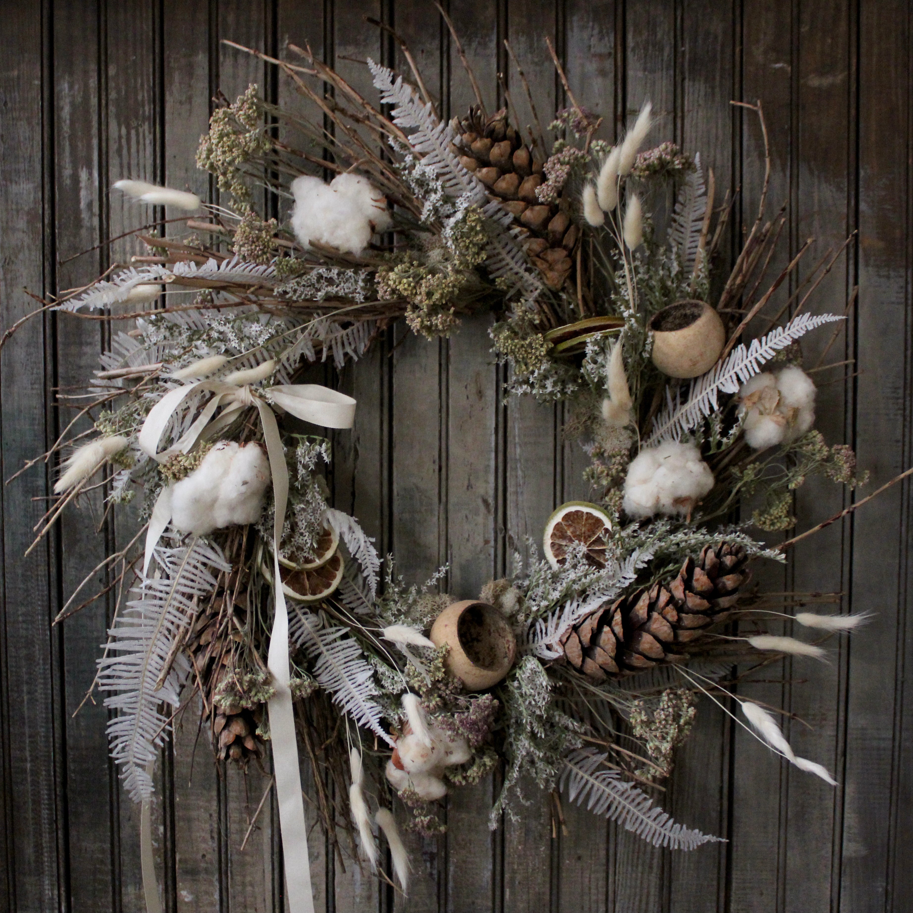 The Winter Solstice Wreath features cotton, fern, statice, bunny tail grass, pine cone, lime slices, and bell cup.