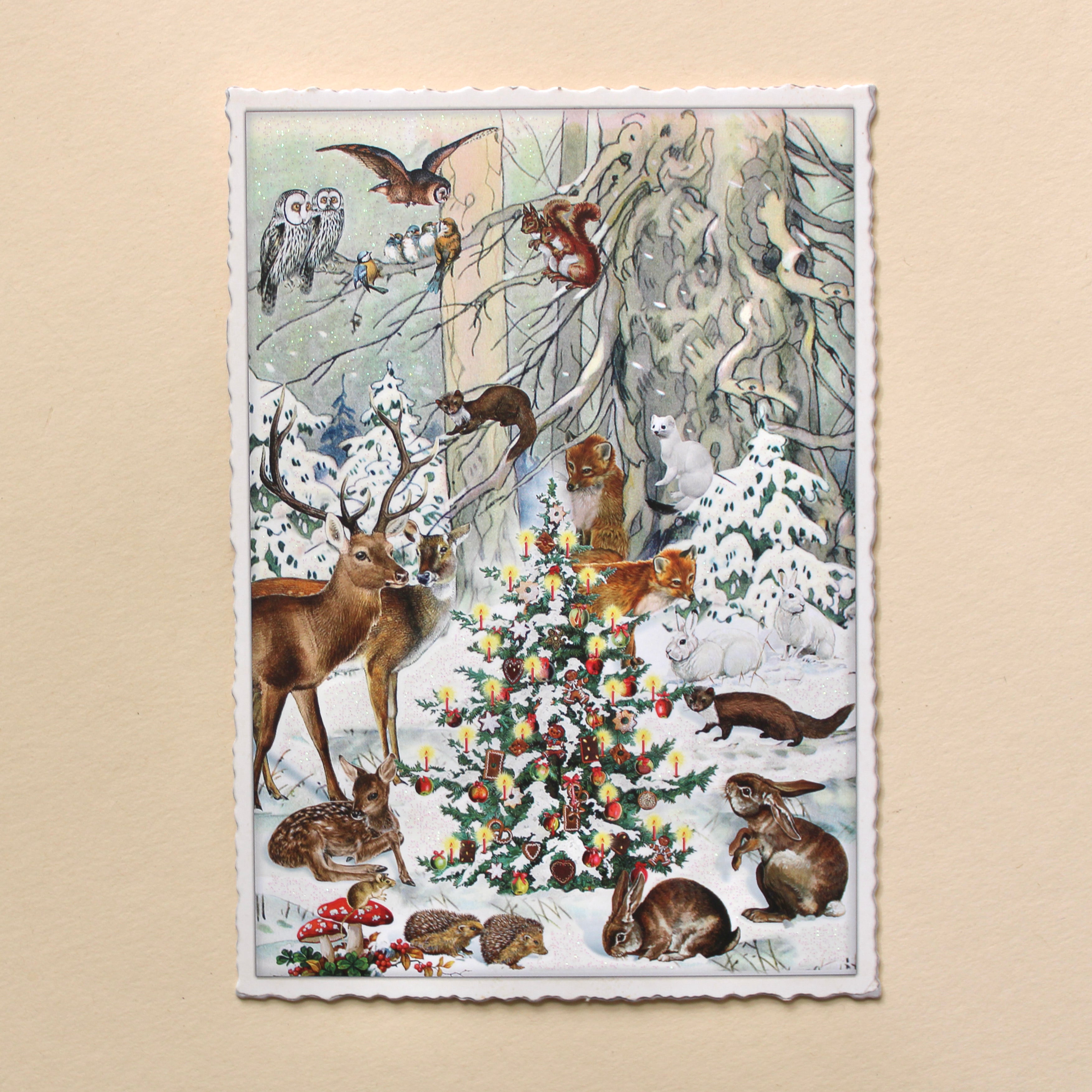 Include with a gift or send snail mail this holiday season. This most festive postcard features the sweetest scene of woodland fauna gathered round a decorated Christmas tree. Too cute!