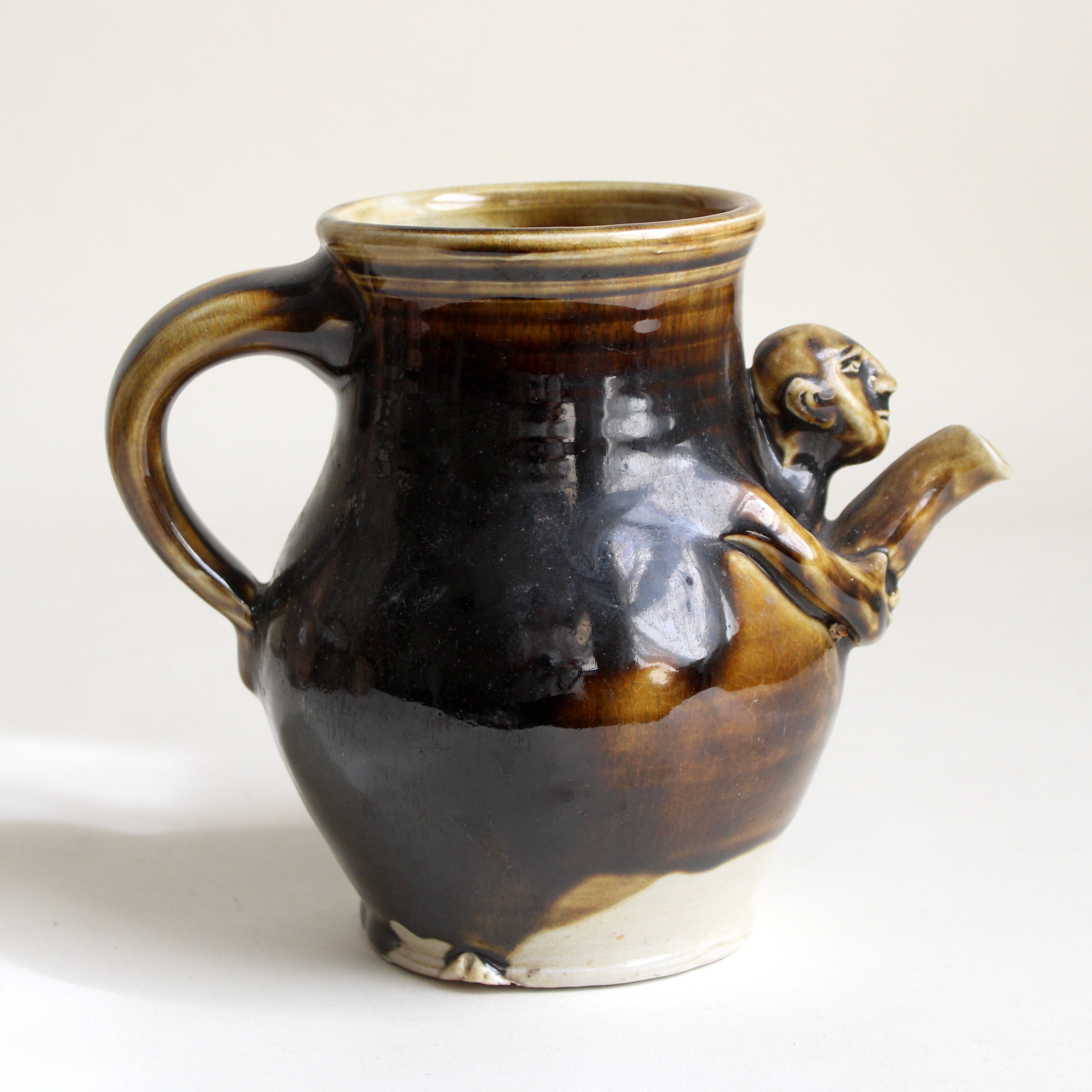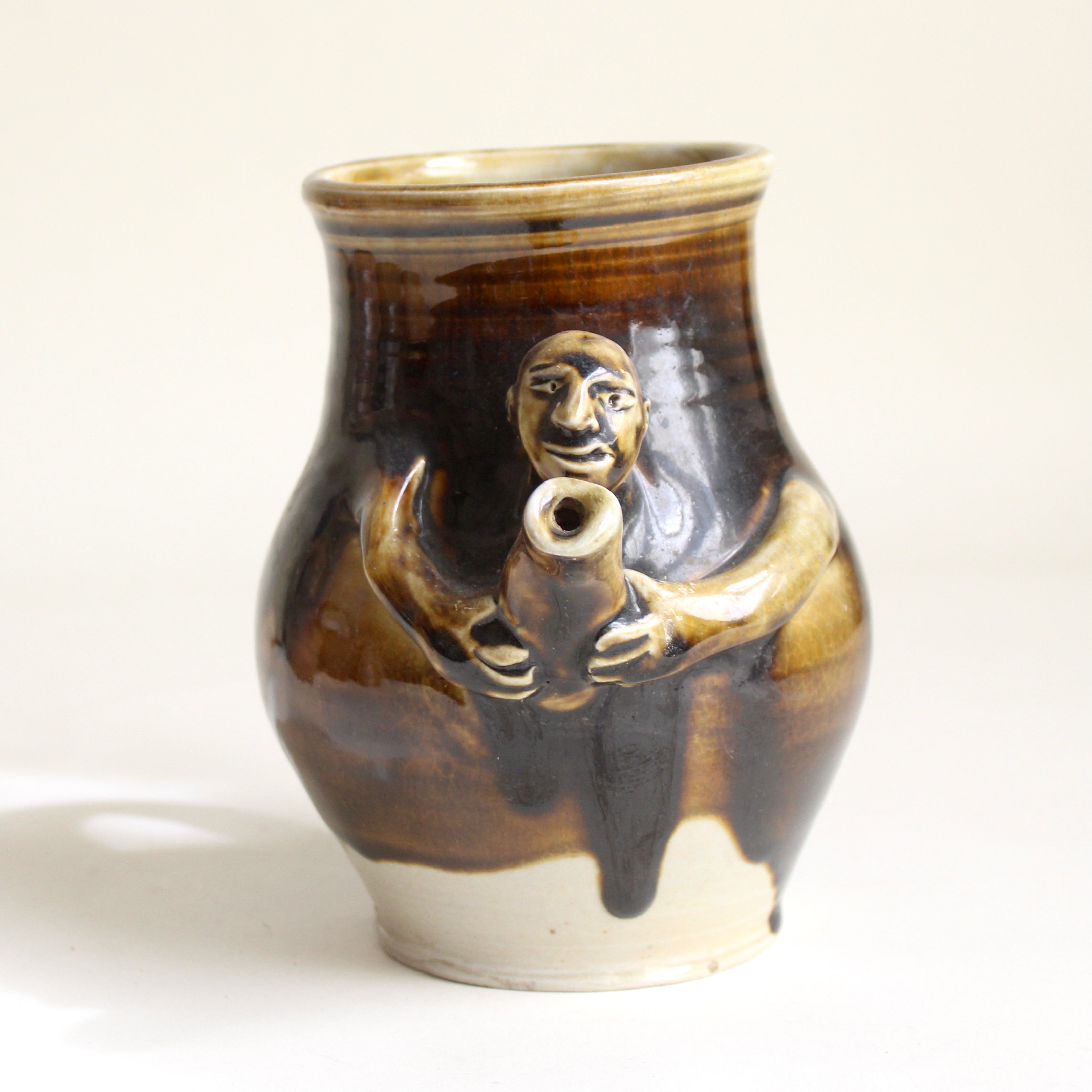 This fun little pot features a man holding his spout! I threw this piece from porcelain clay which gives the glaze an incredible luscious transparent amber color. The man is modeled and attached to this sturdy pot which will only increase in value as it is sure to last for a few hundred years.