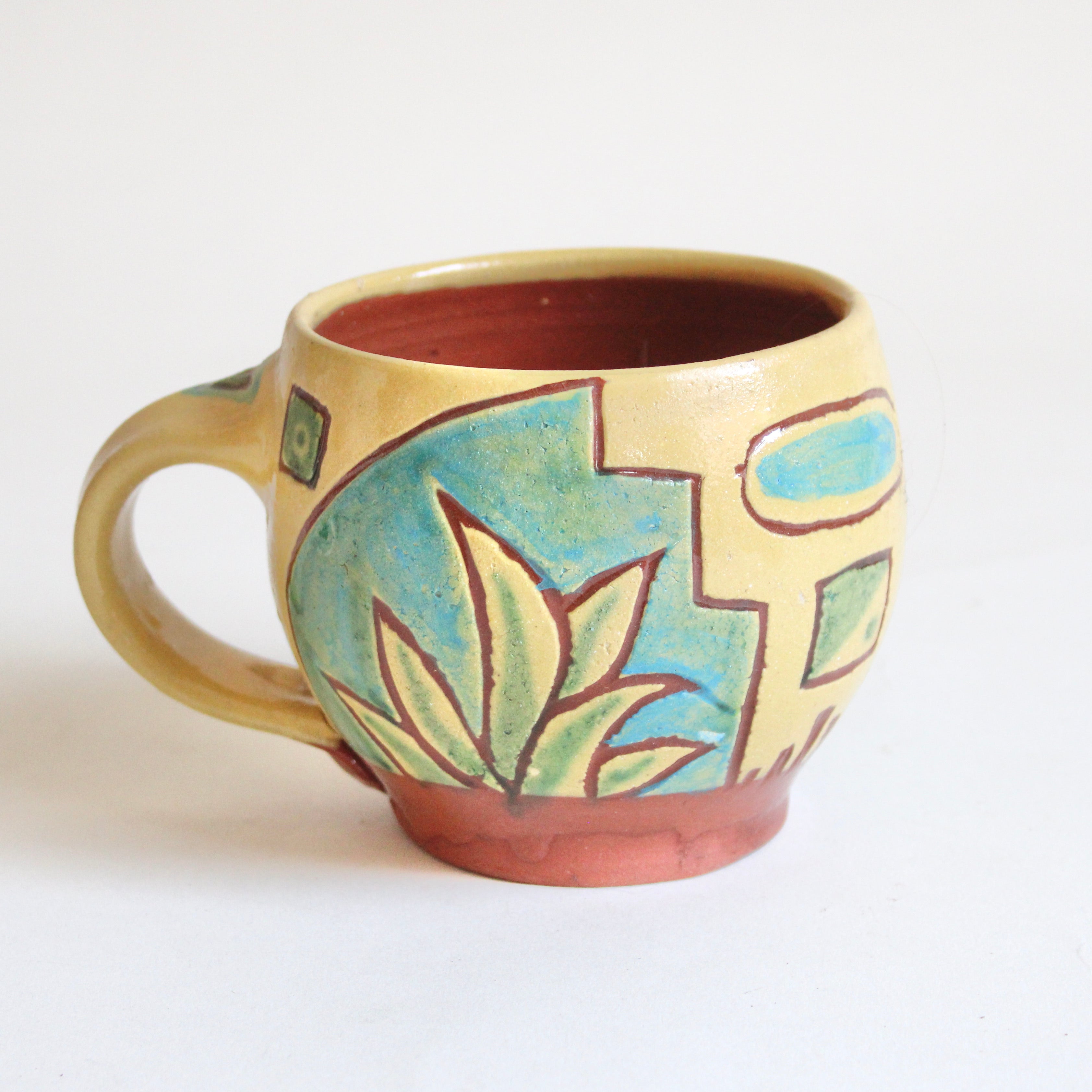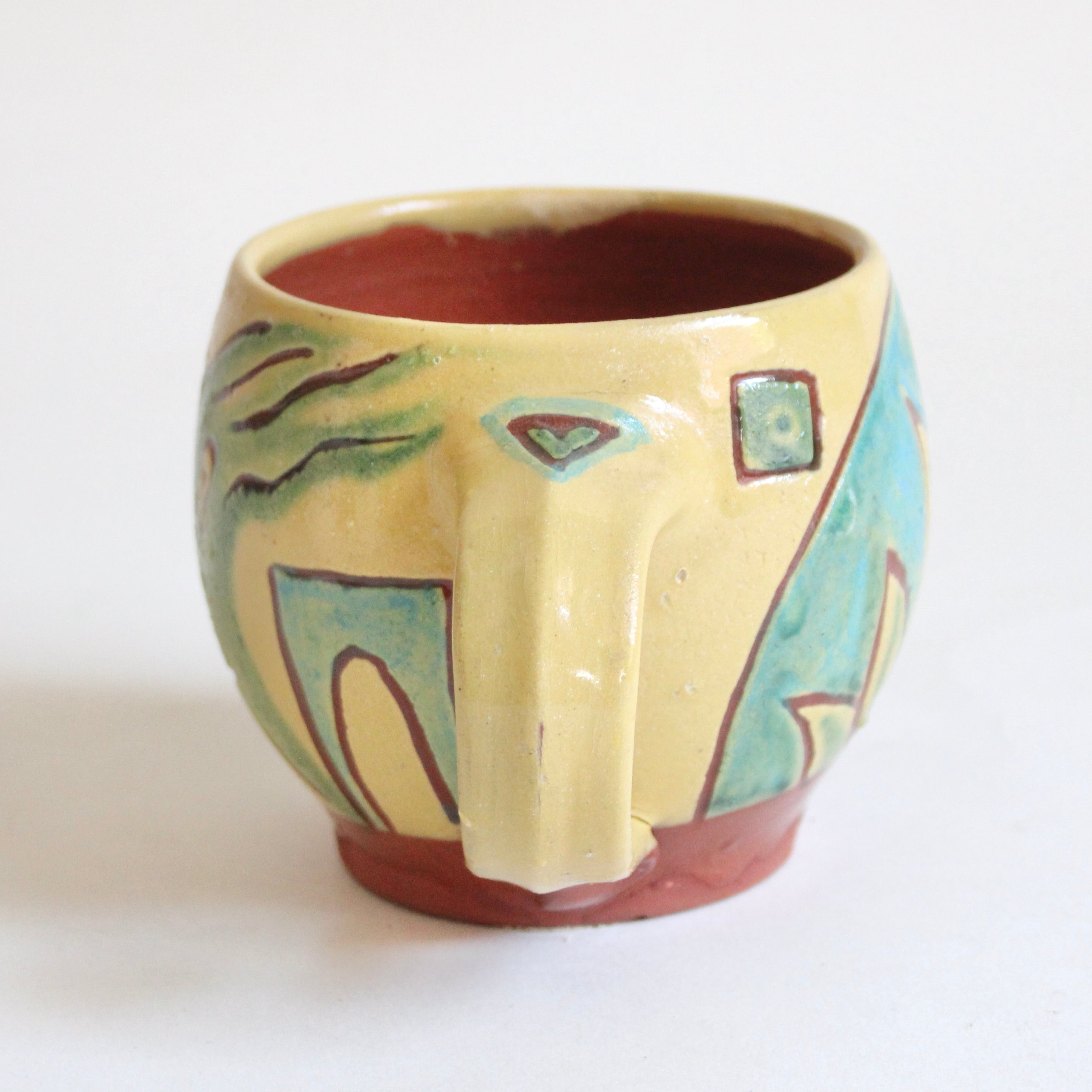 This happy mug will brighten your coffee break with its whimsical design in bright yellows and green glazed artwork over a finely crafted red earthenware cup.