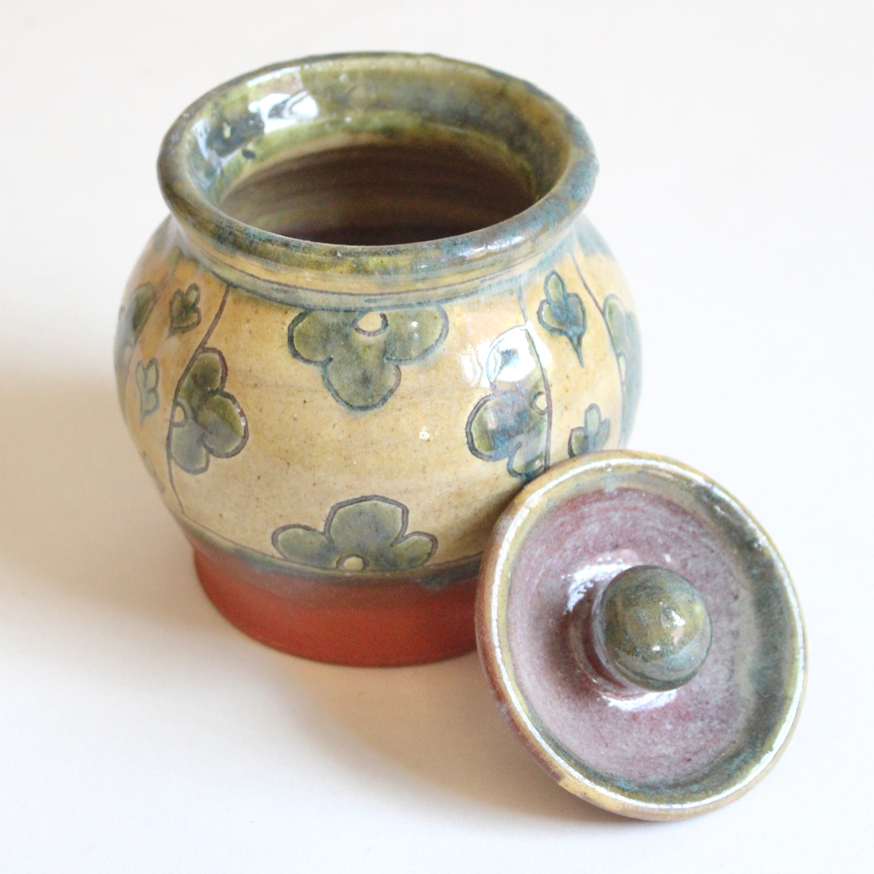 This sweet little jar with its well fitted lid is hand thrown from red earthenware clay and glazed in yellow and green. Perfect for sugar or spices.
