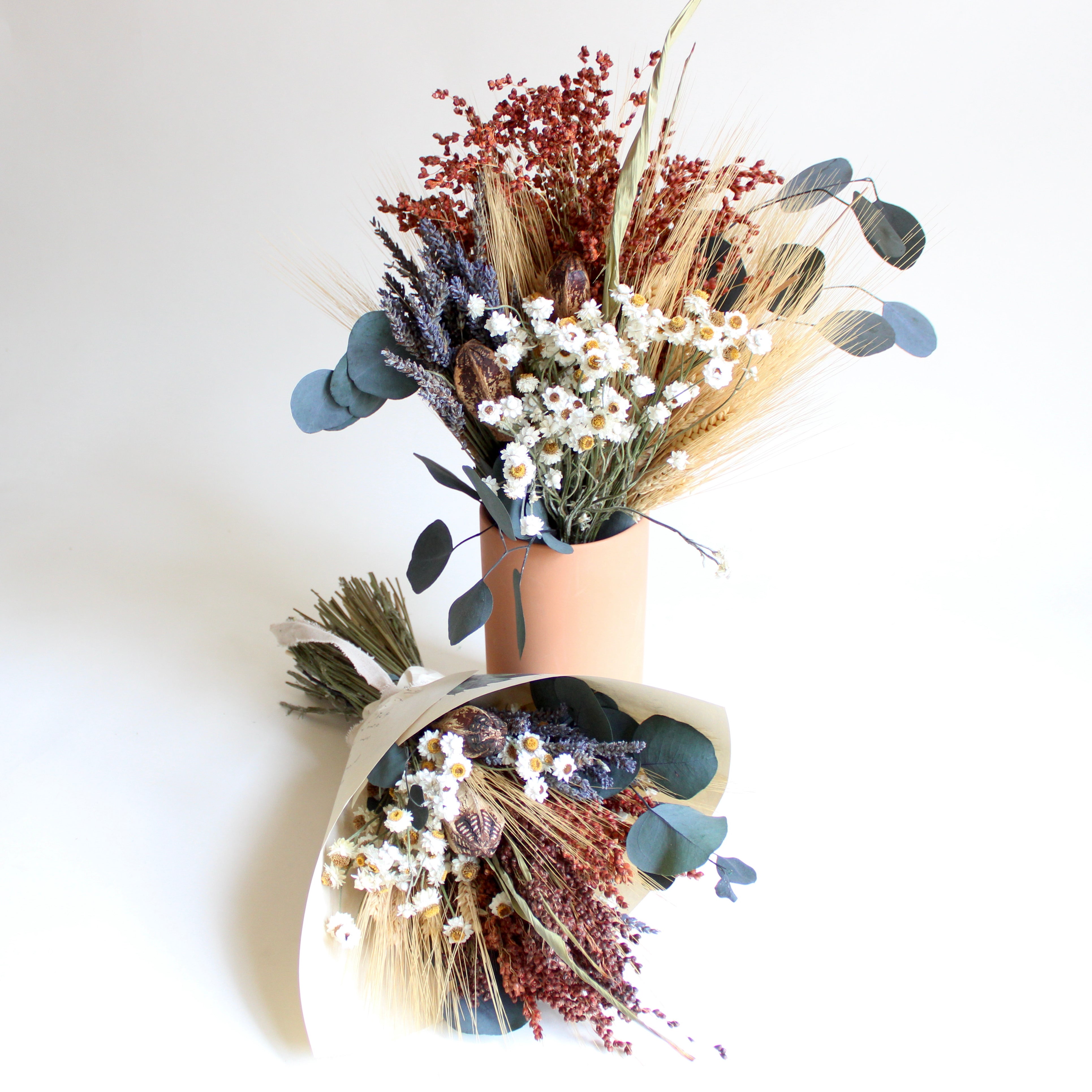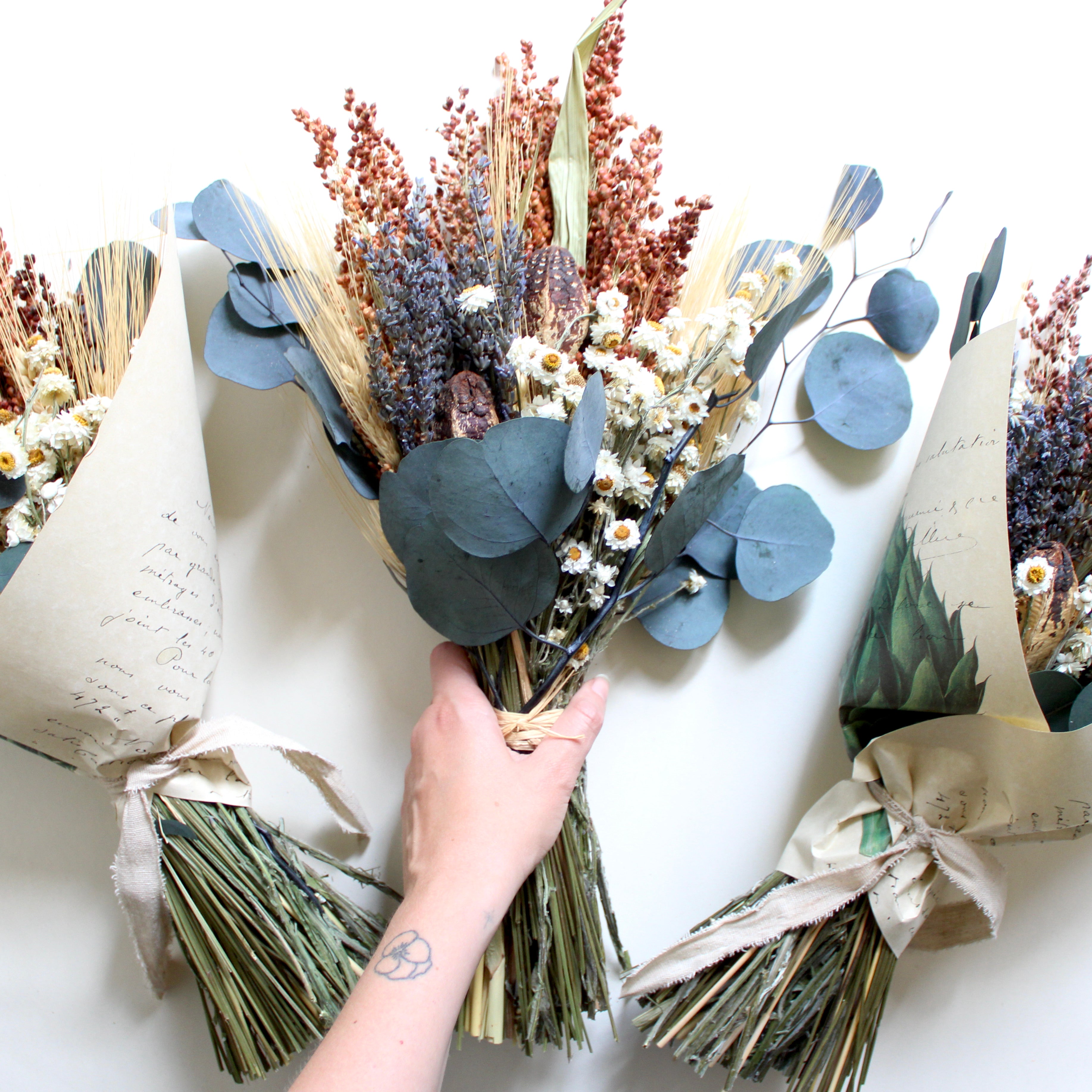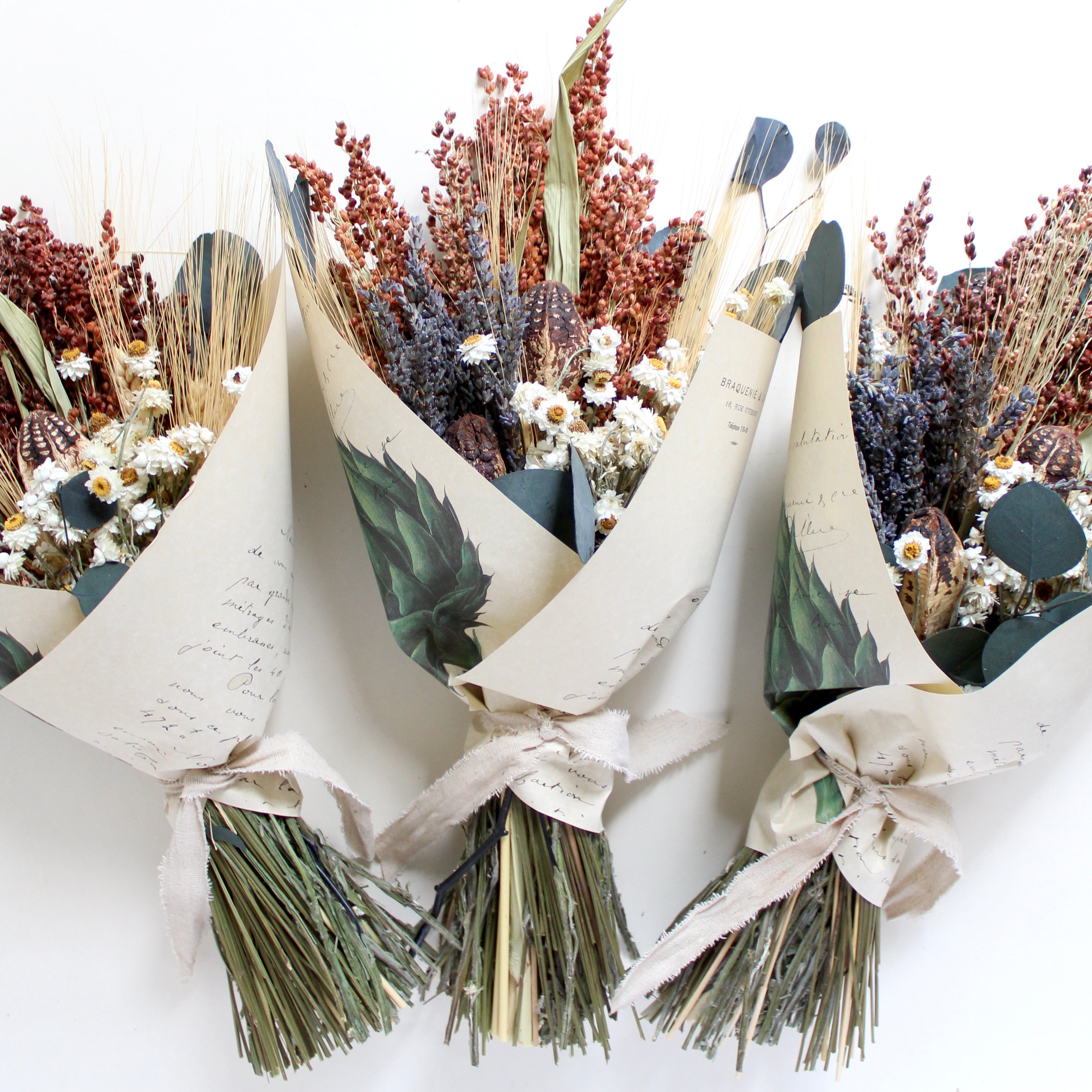 Field Bouquet features eucalyptus, lavender, ammobium, bearded wheat, broom corn, and mahogany pod.