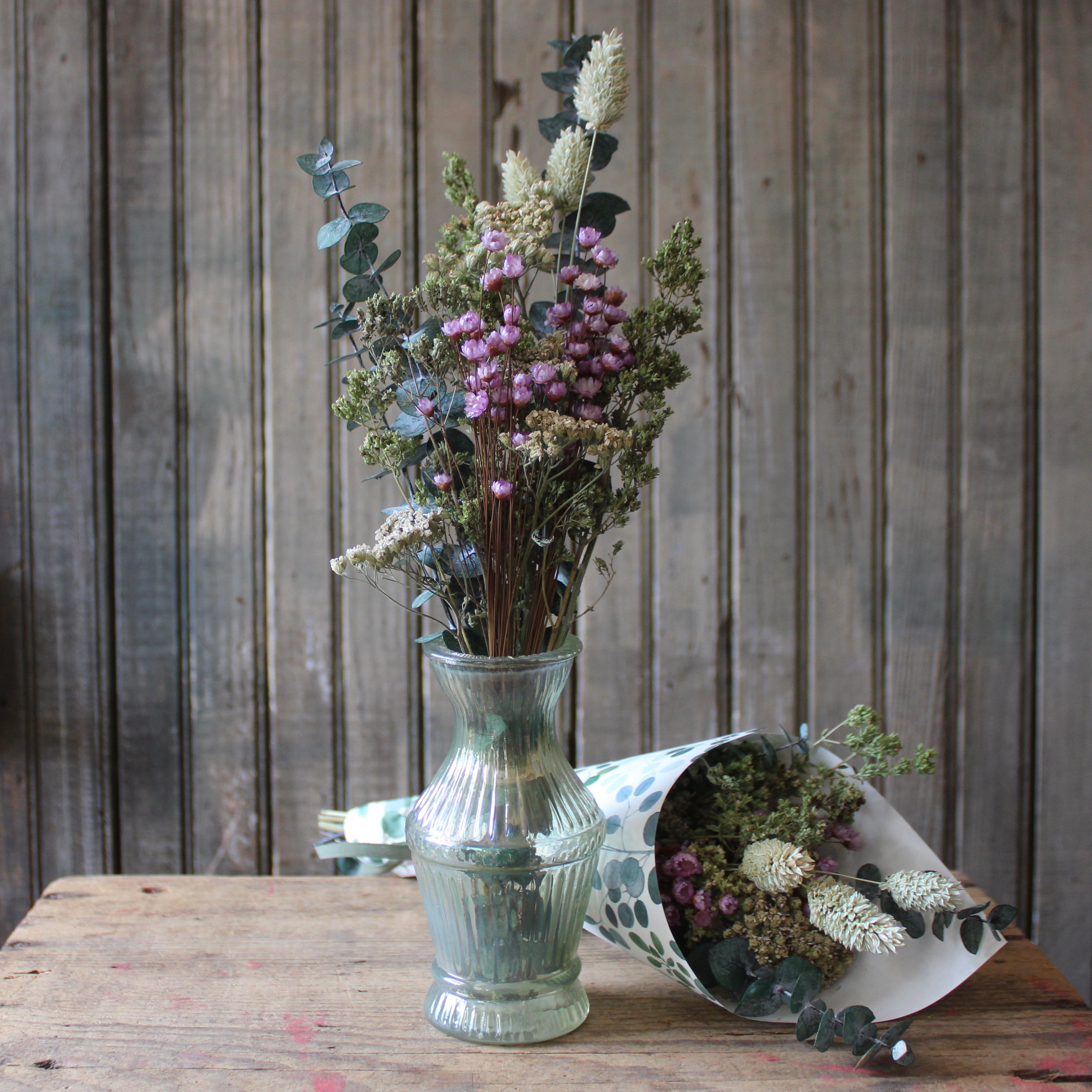 Dried and preserved flowers are mostly care free. The main factors that effect them are light or humidity. Direct sunlight can cause flowers to fade, and moisture can be absorbed and make certain flowers "wilt". If they end up getting dusty, we recommend canned air or a blow dryer on a low cool setting.