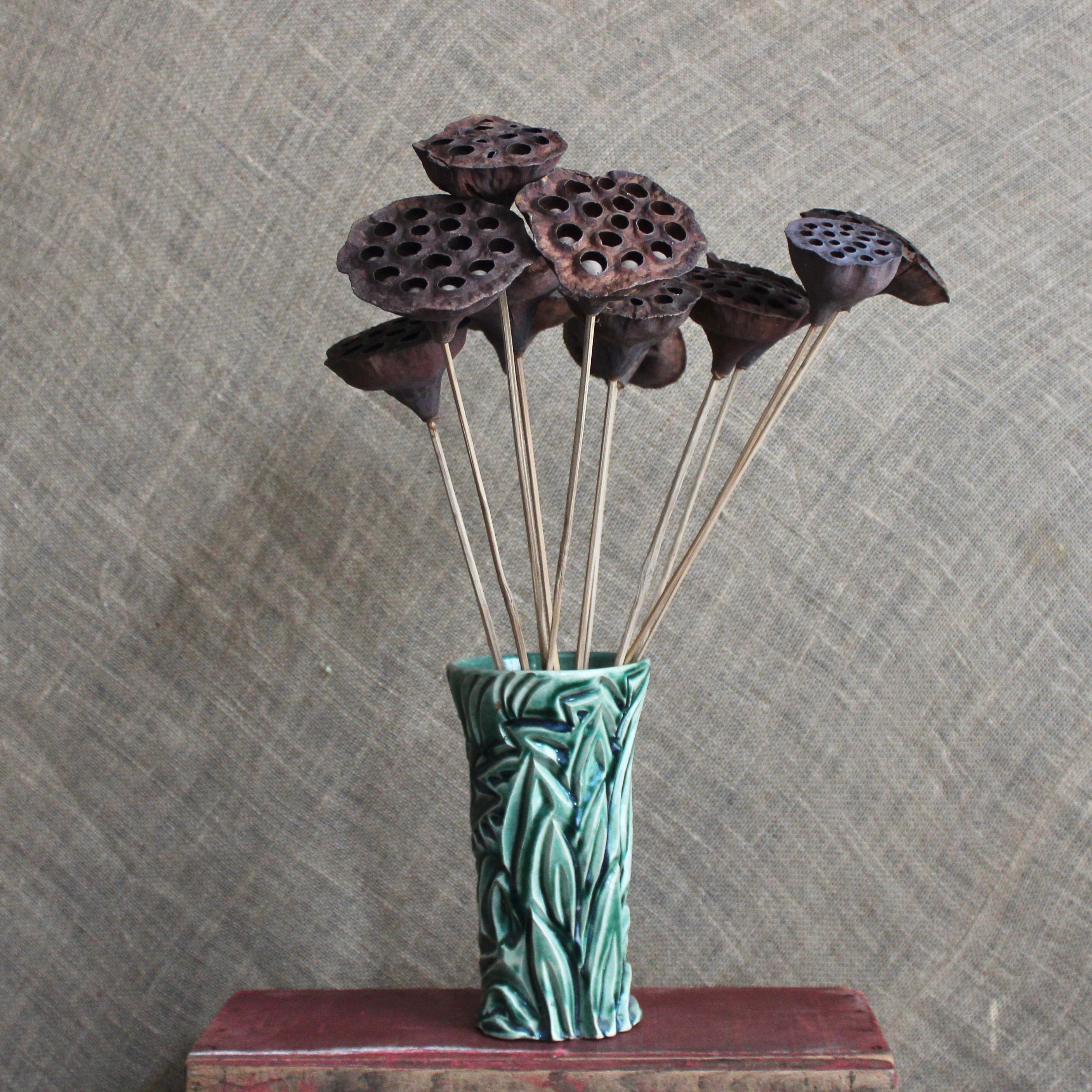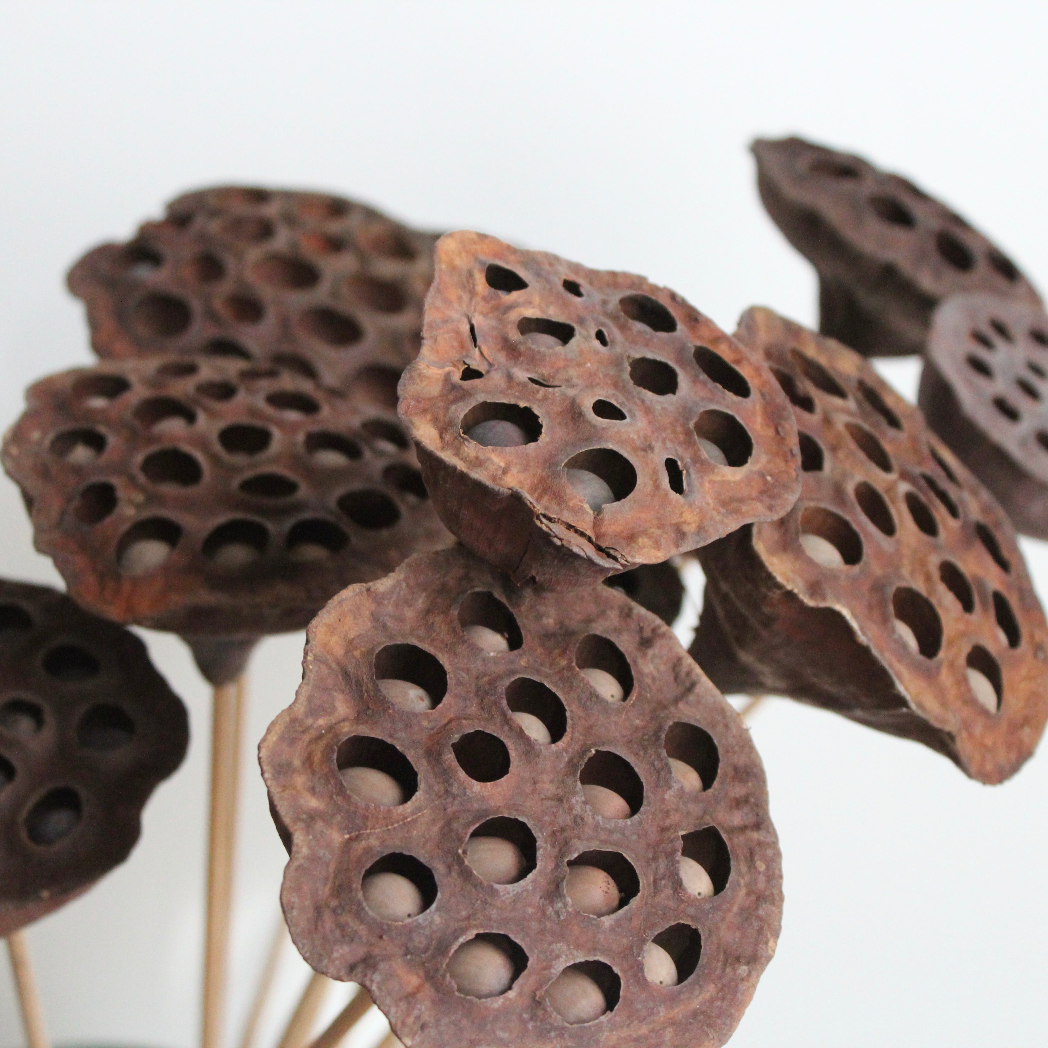 Typically found in ponds, lotus pods are left behind from the beautiful lotus flower bloom. An object of interest, Lotus Pods will add instant intrigue to super natural or modern arrangements. Each pod has been adhered to a long reed stem for arranging ease.