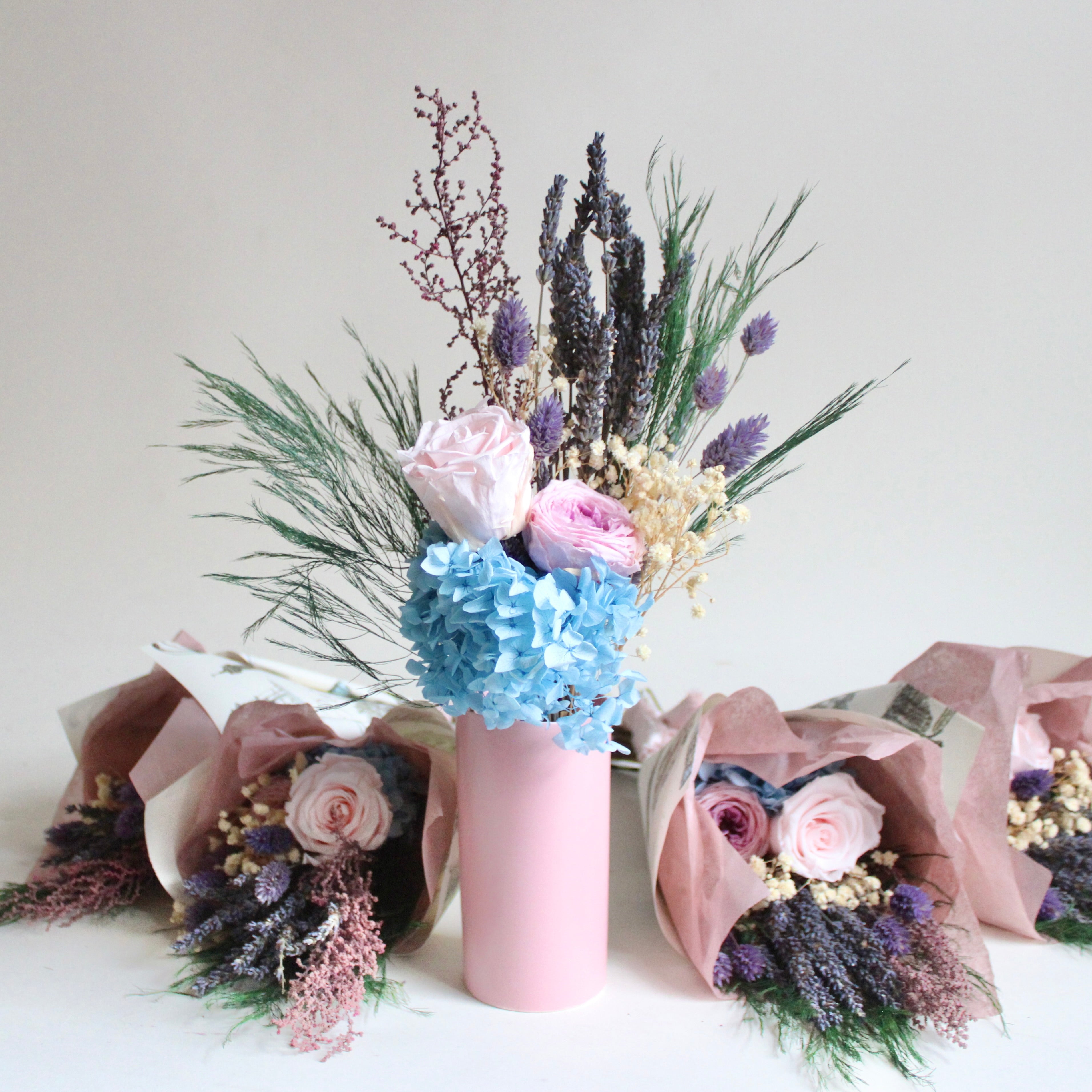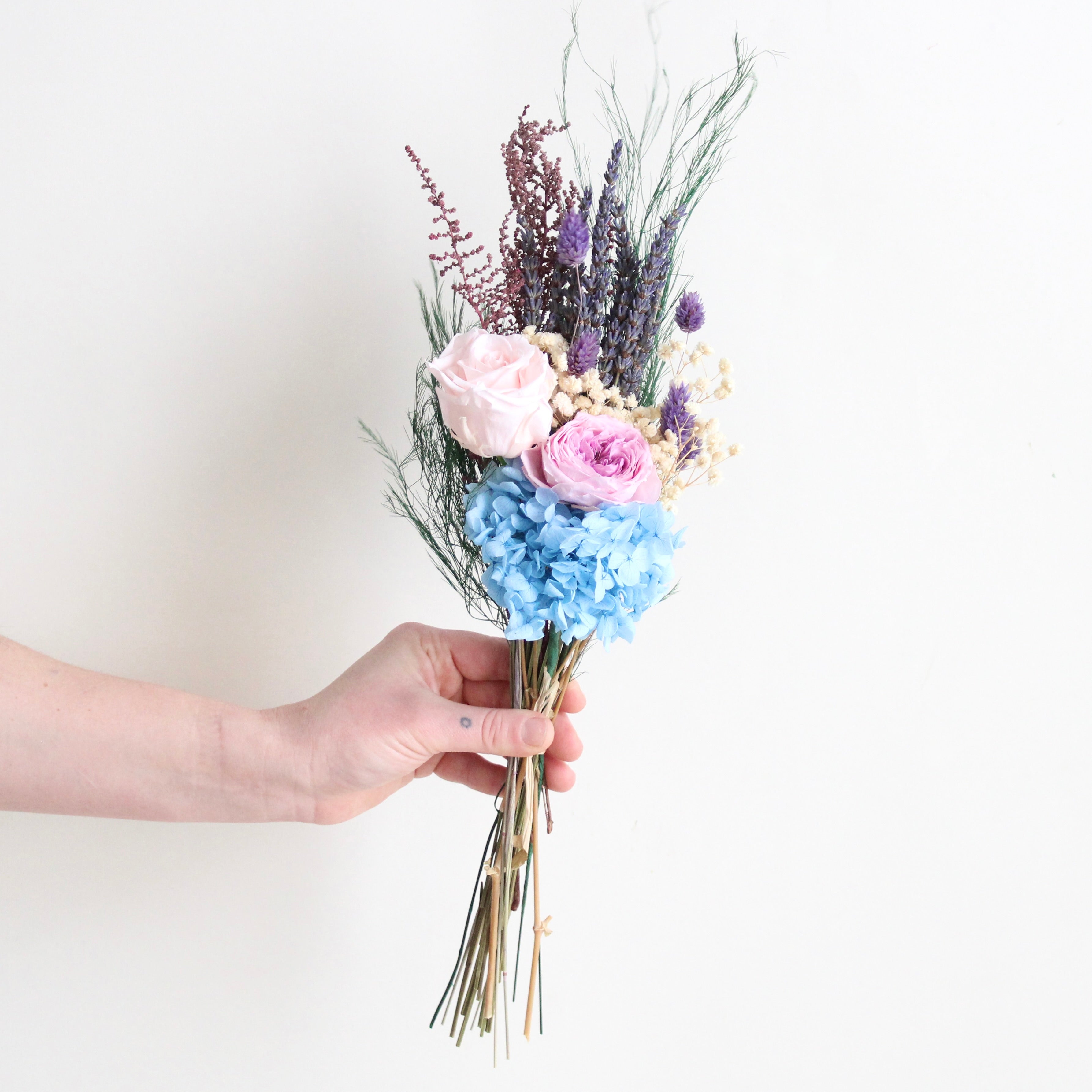 Paris Bouquet features lavender, phalaris, baby's breath, stoebe, hydrangea, tree fern, and preserved roses.