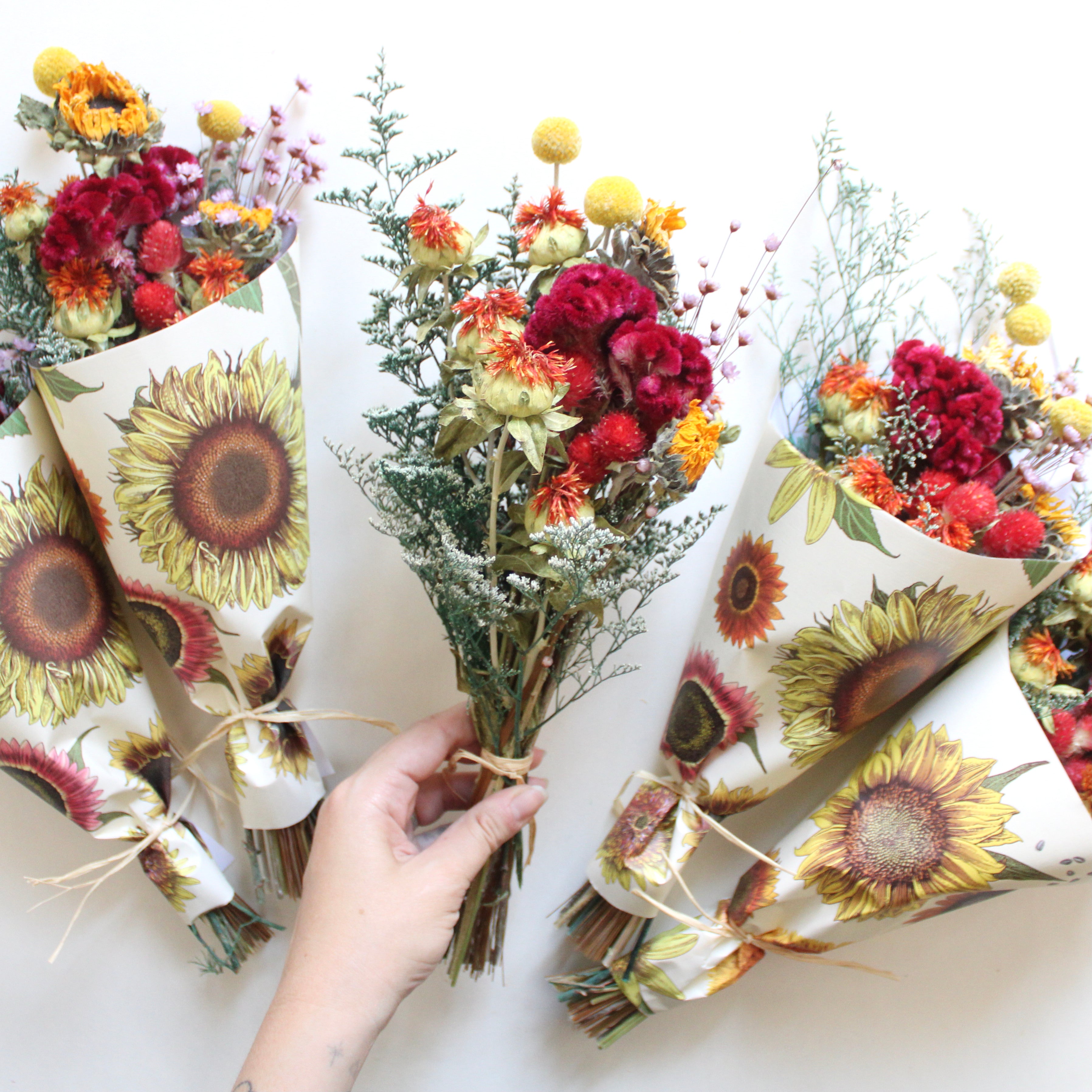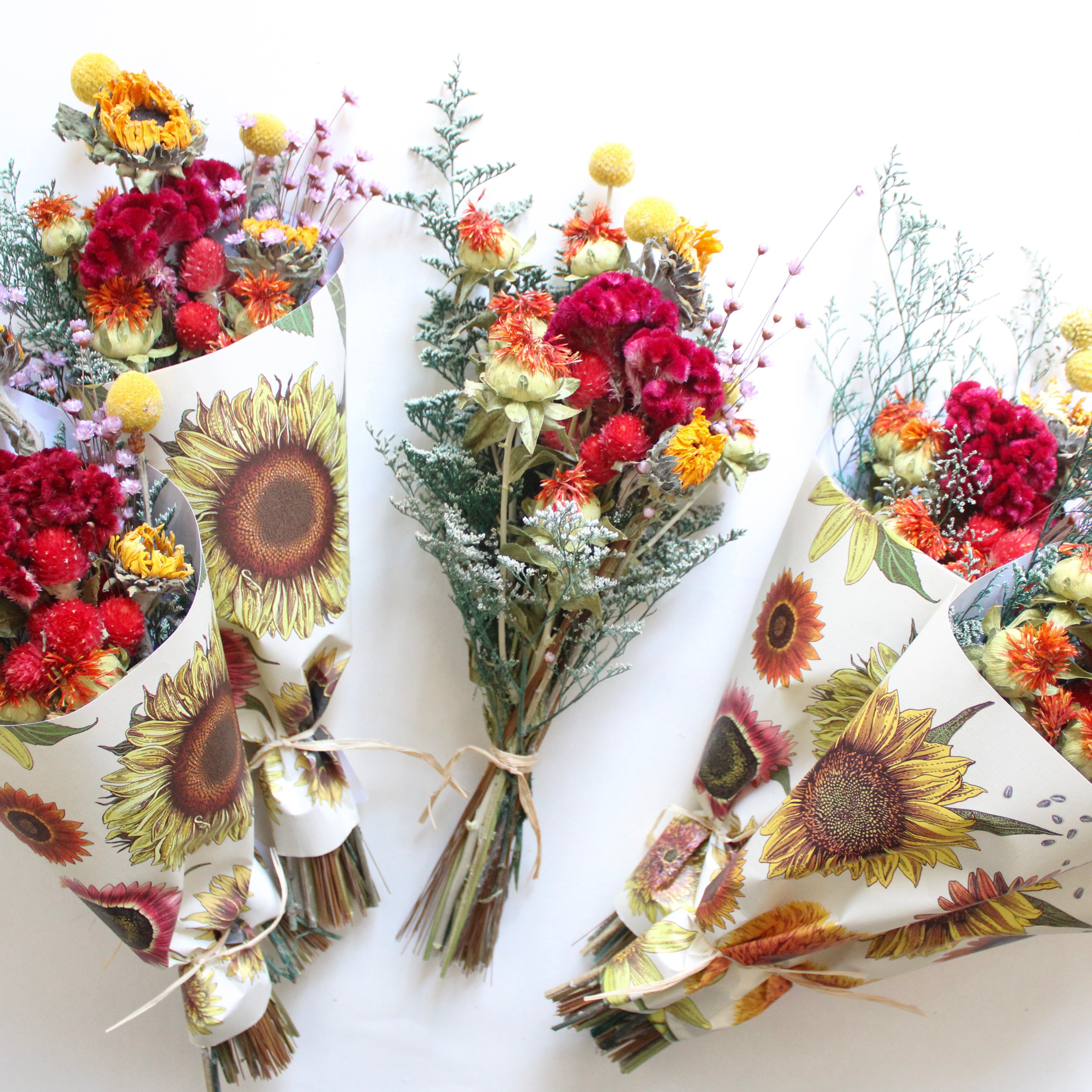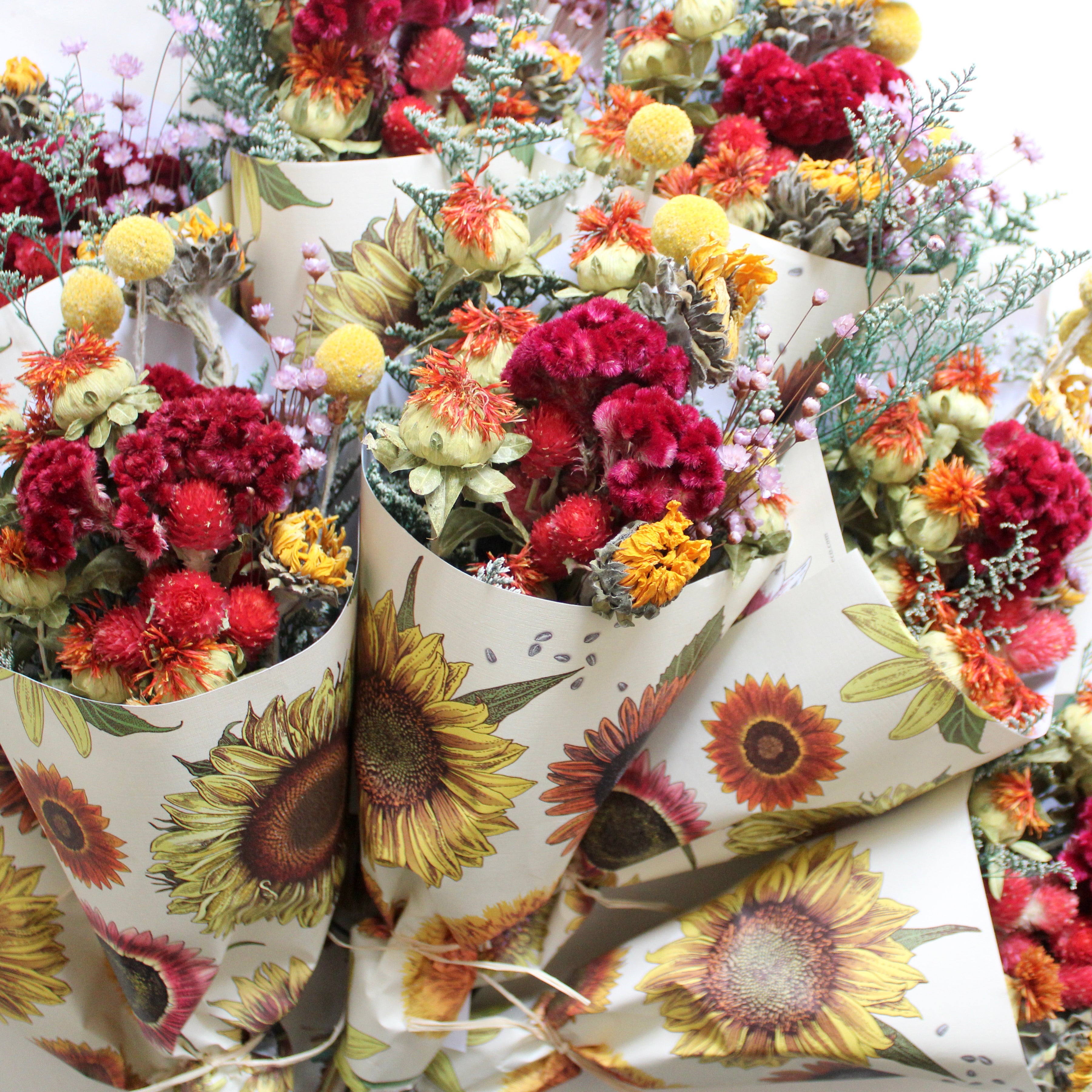 Sunflower Field Bouquet features sunflower, safflower, billy button, gomphrena, star flower, caspia, and cockscomb.