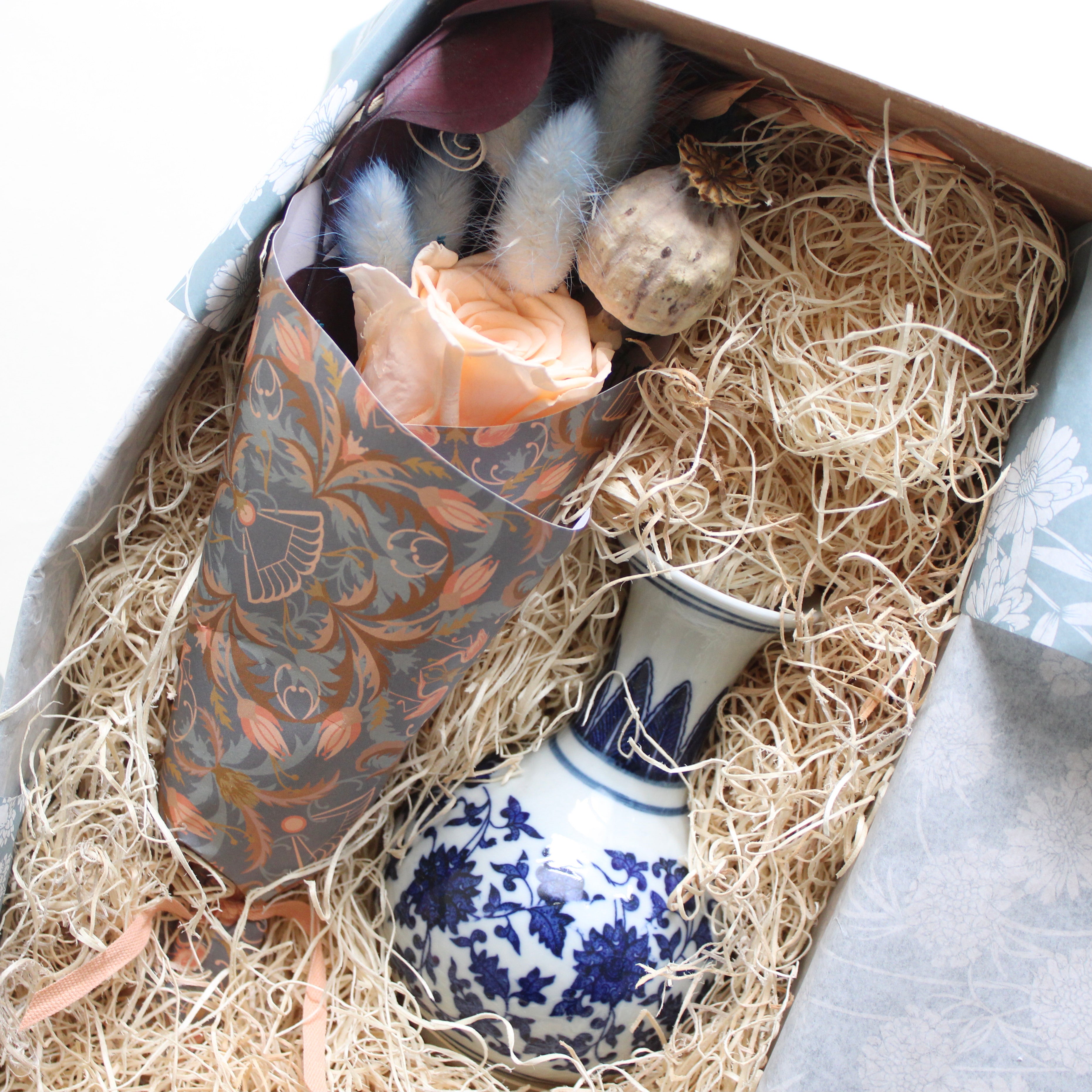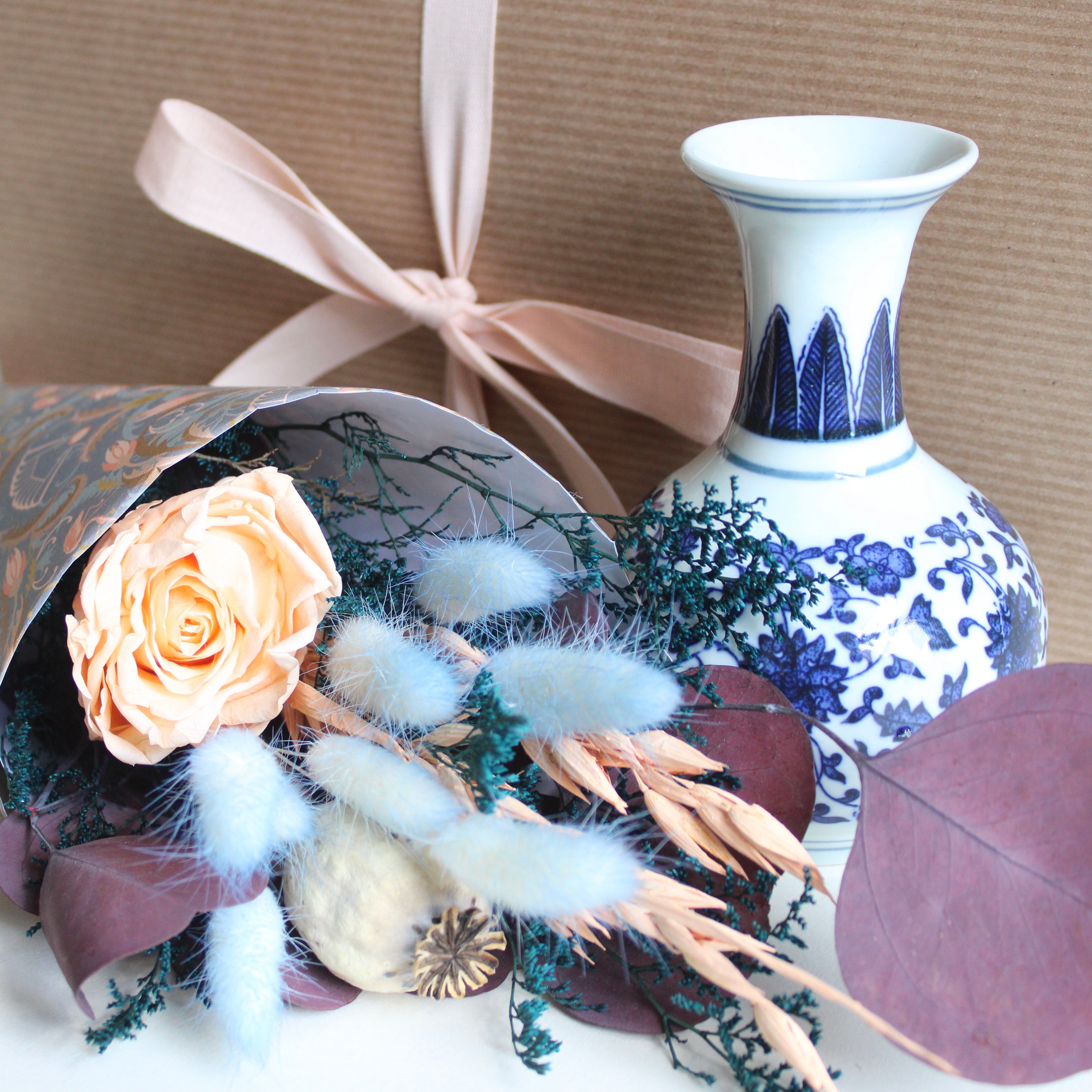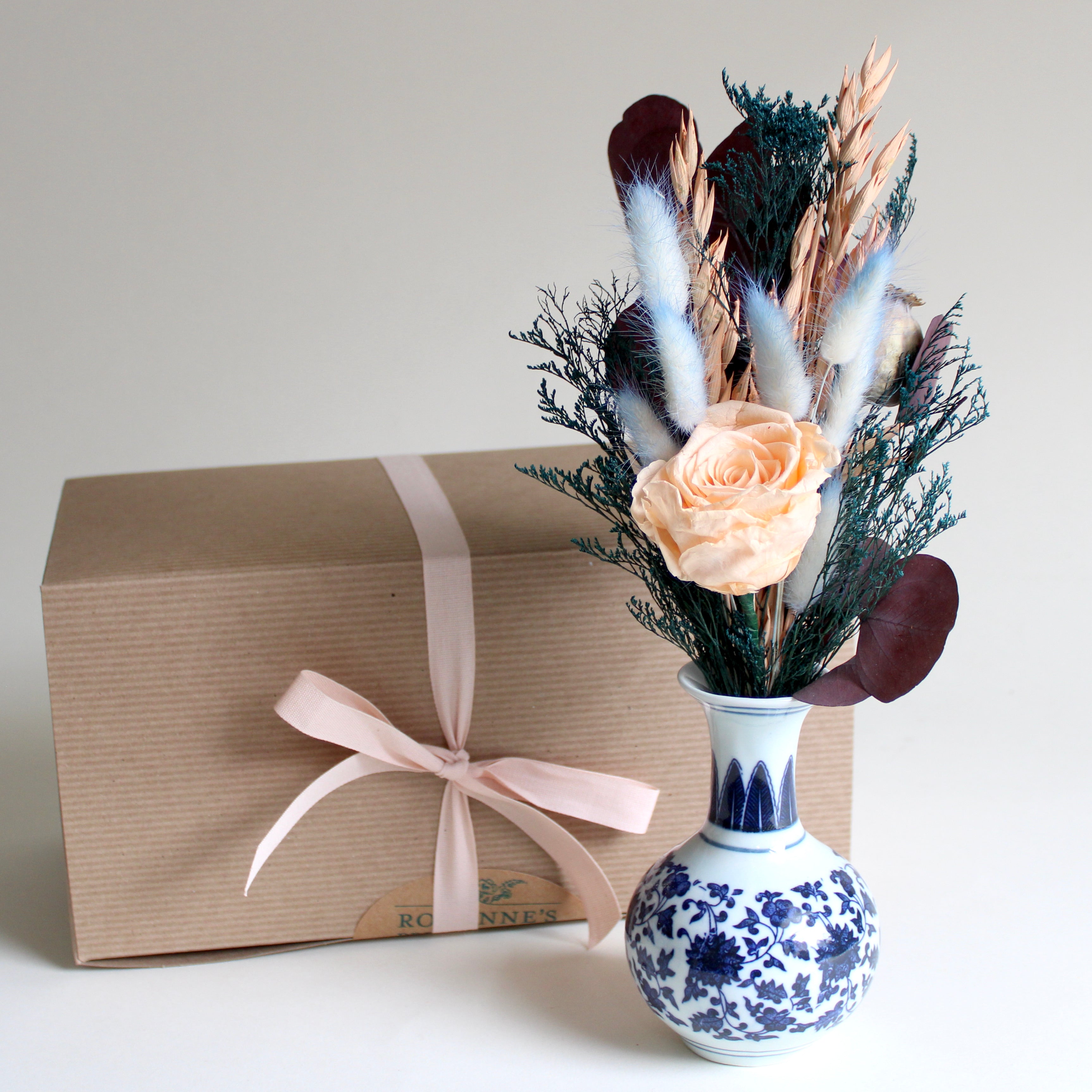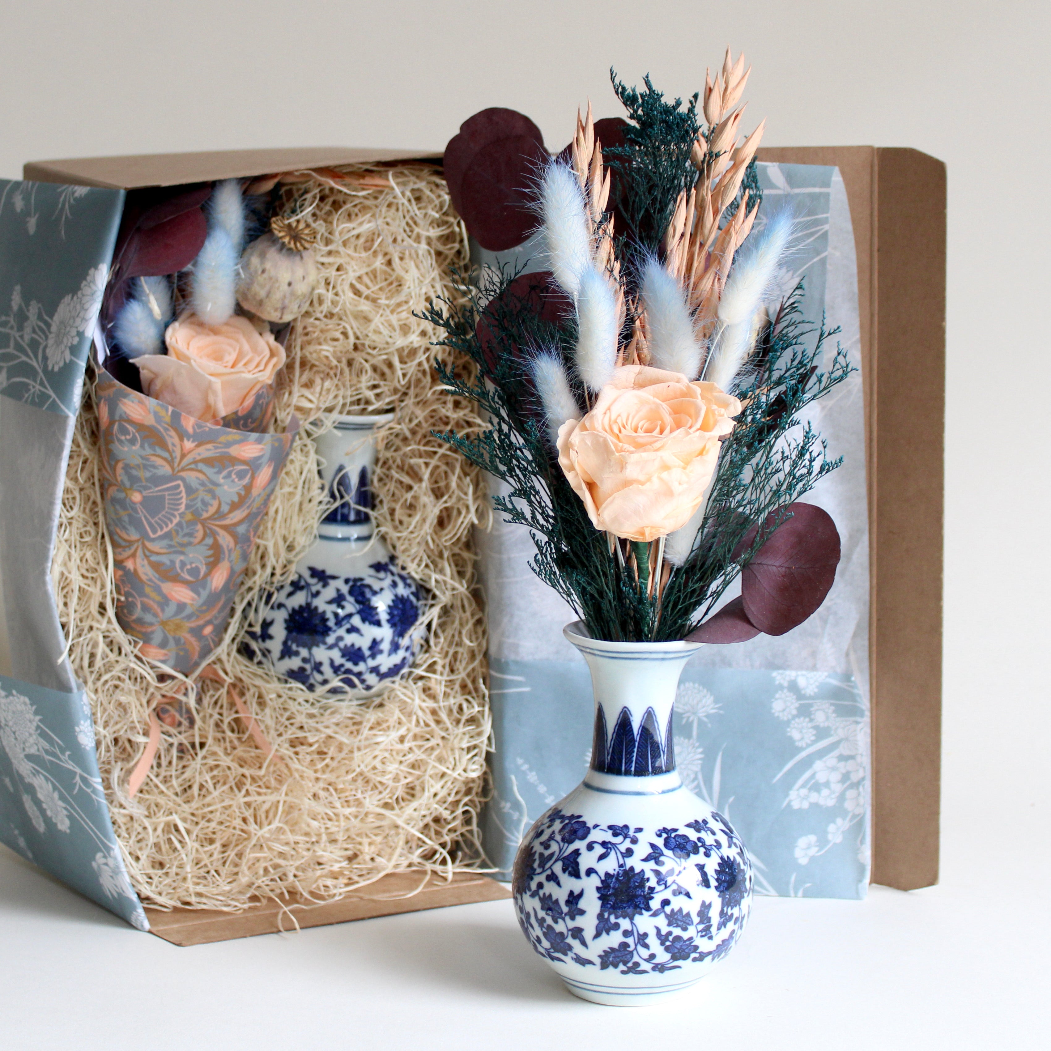 A bouquet designed especially for the lovely blue and white vase—a delightful gift that comes perfectly boxed and bowed, ready to surprise and delight.
