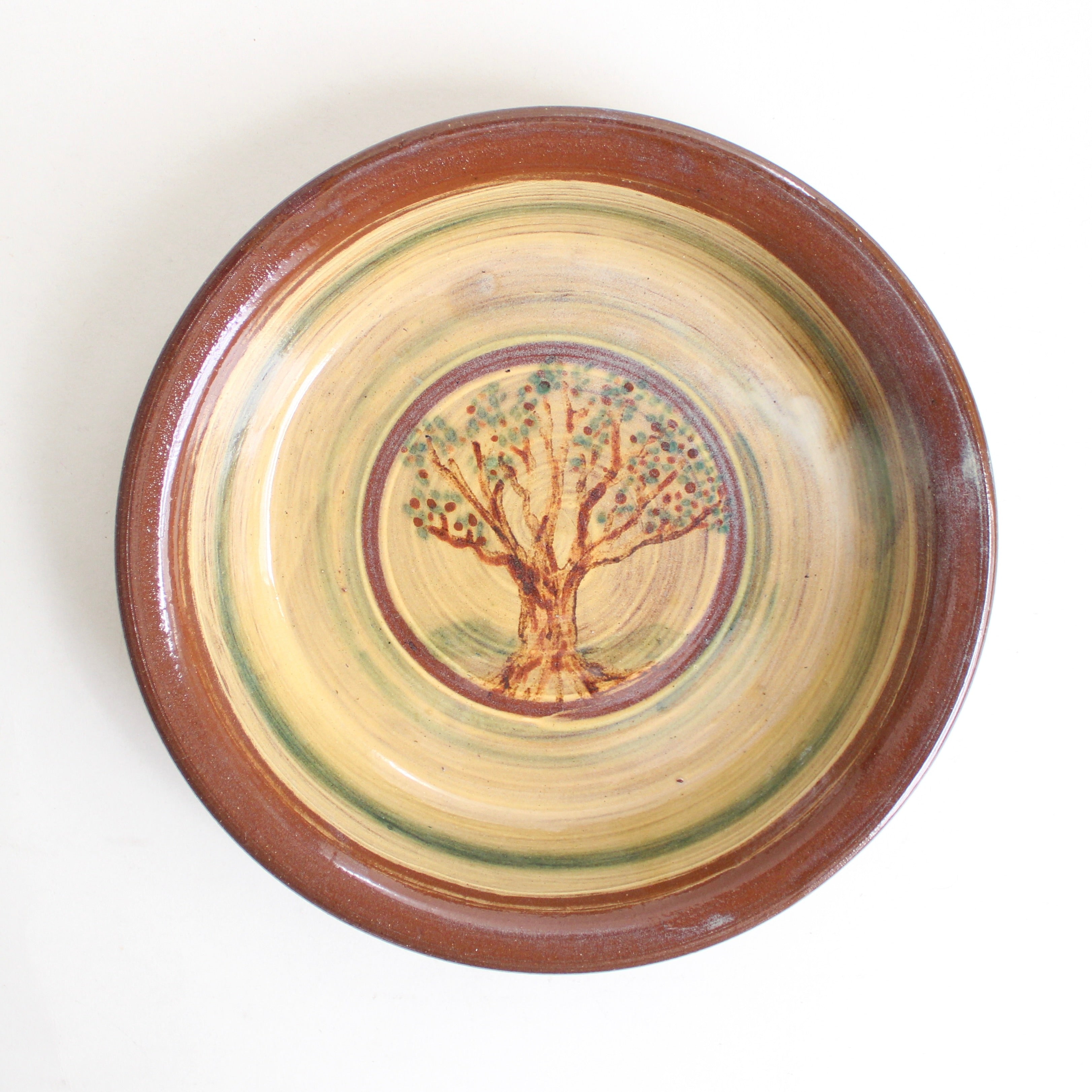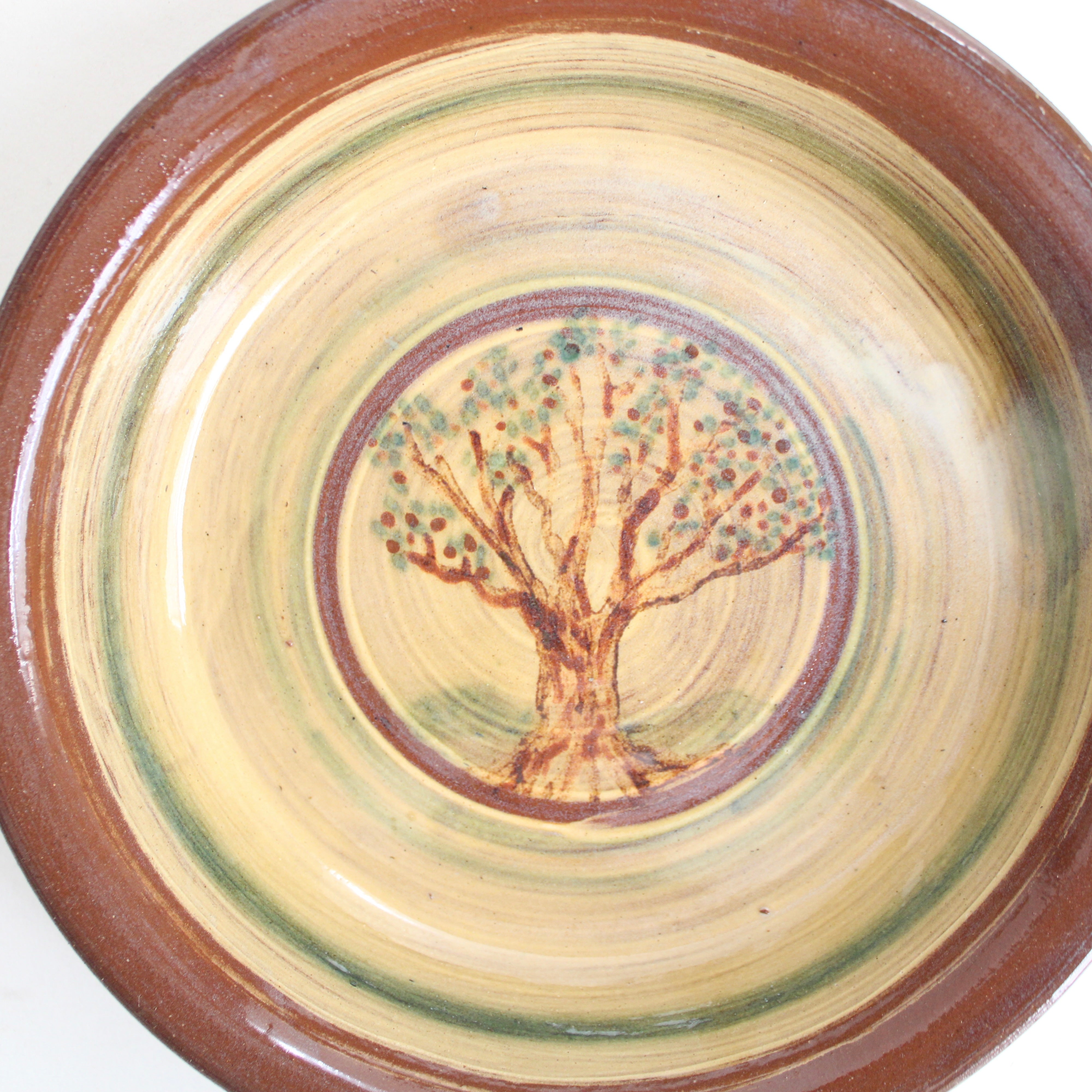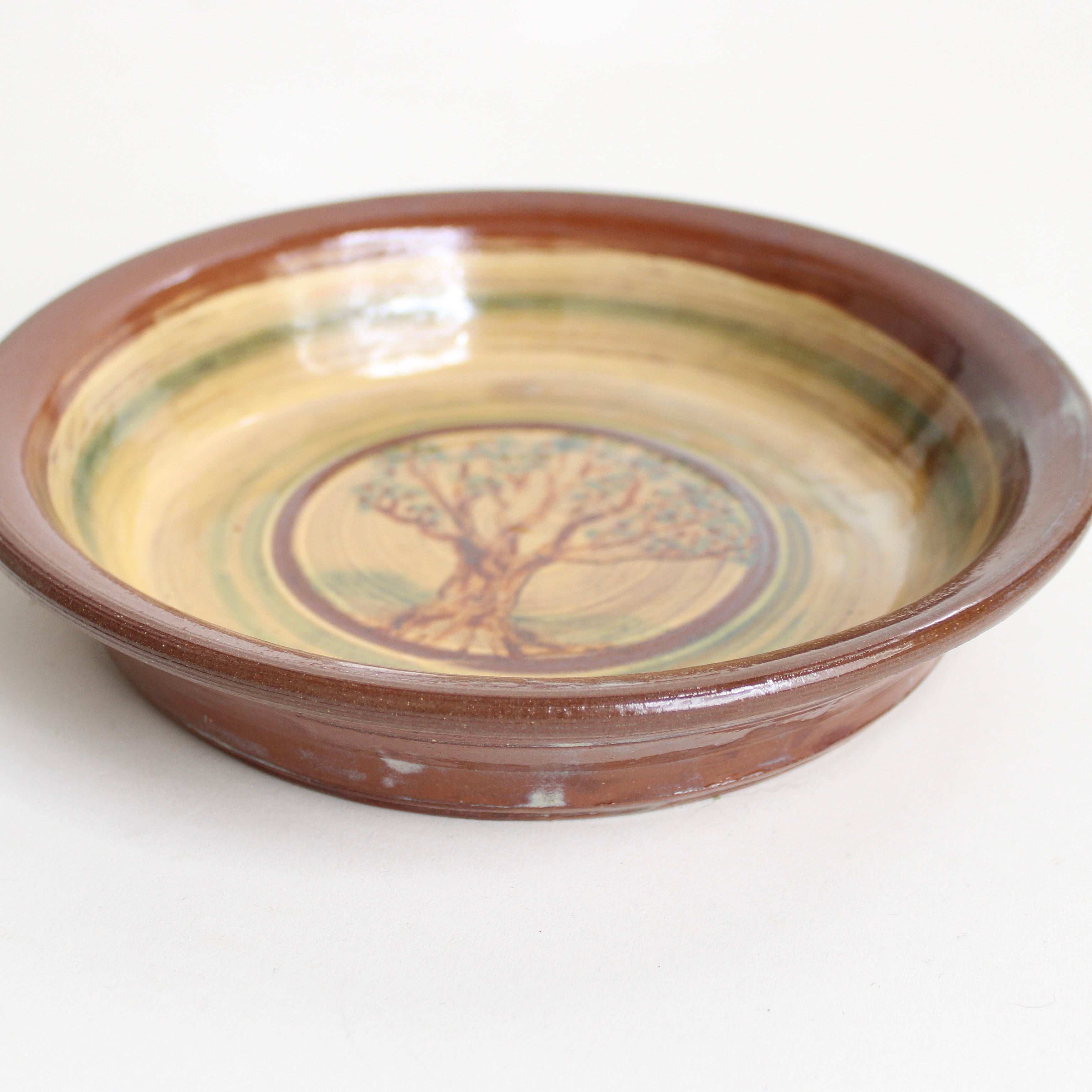 This hand thrown and glazed red clay pie dish is decorated with a spreading tree painted in colored slip beneath a honey colored glaze. Traditional and functional, this beautiful piece could bake a pie or be displayed in an old farm house at Christmas. Truly charming and distinctly made by Eric Hahn, a Pennsylvania potter rooted in the land.