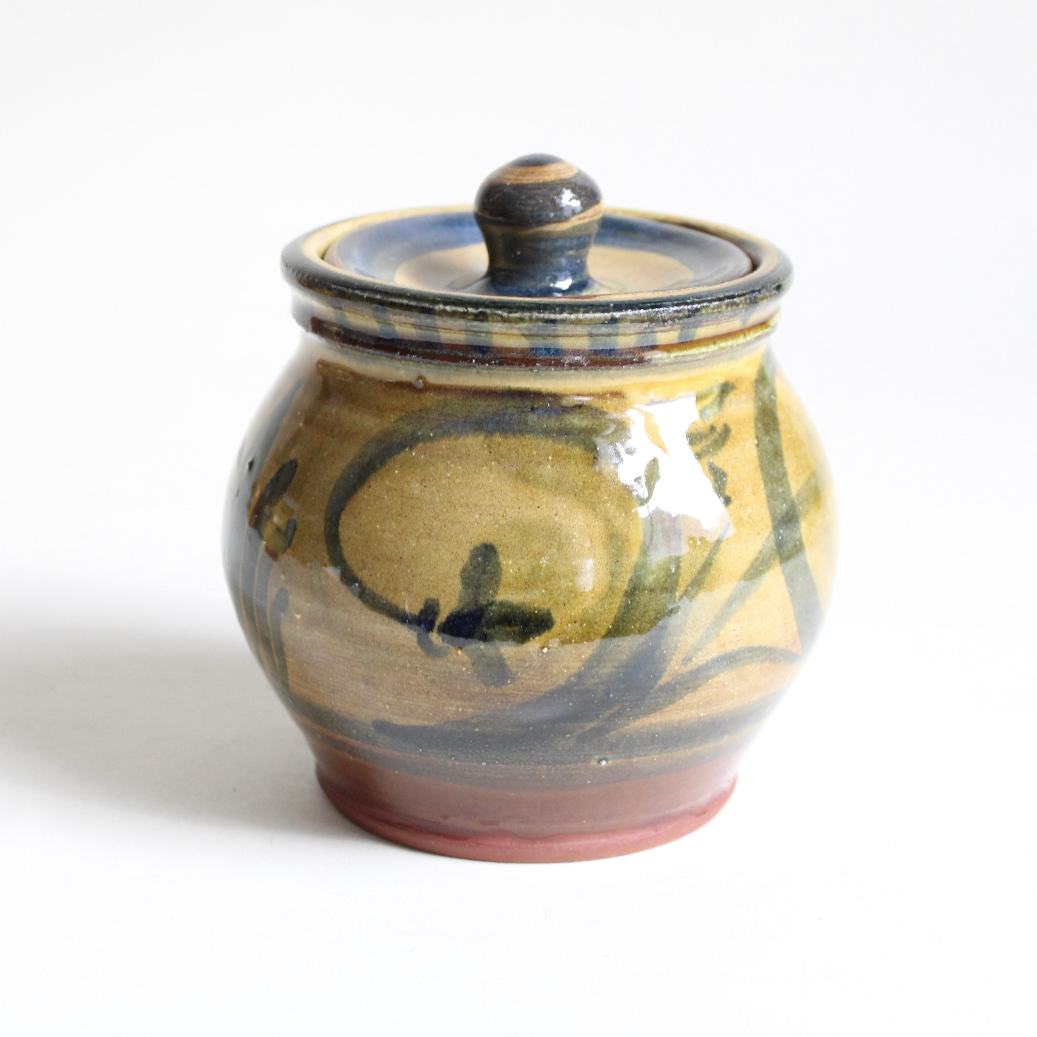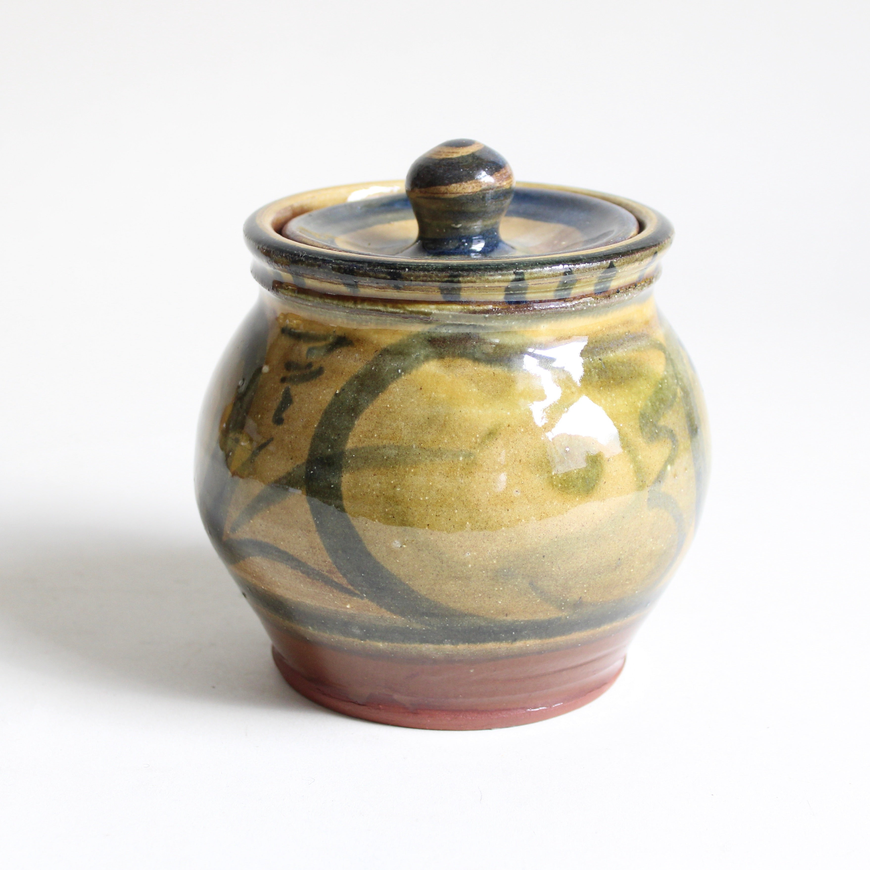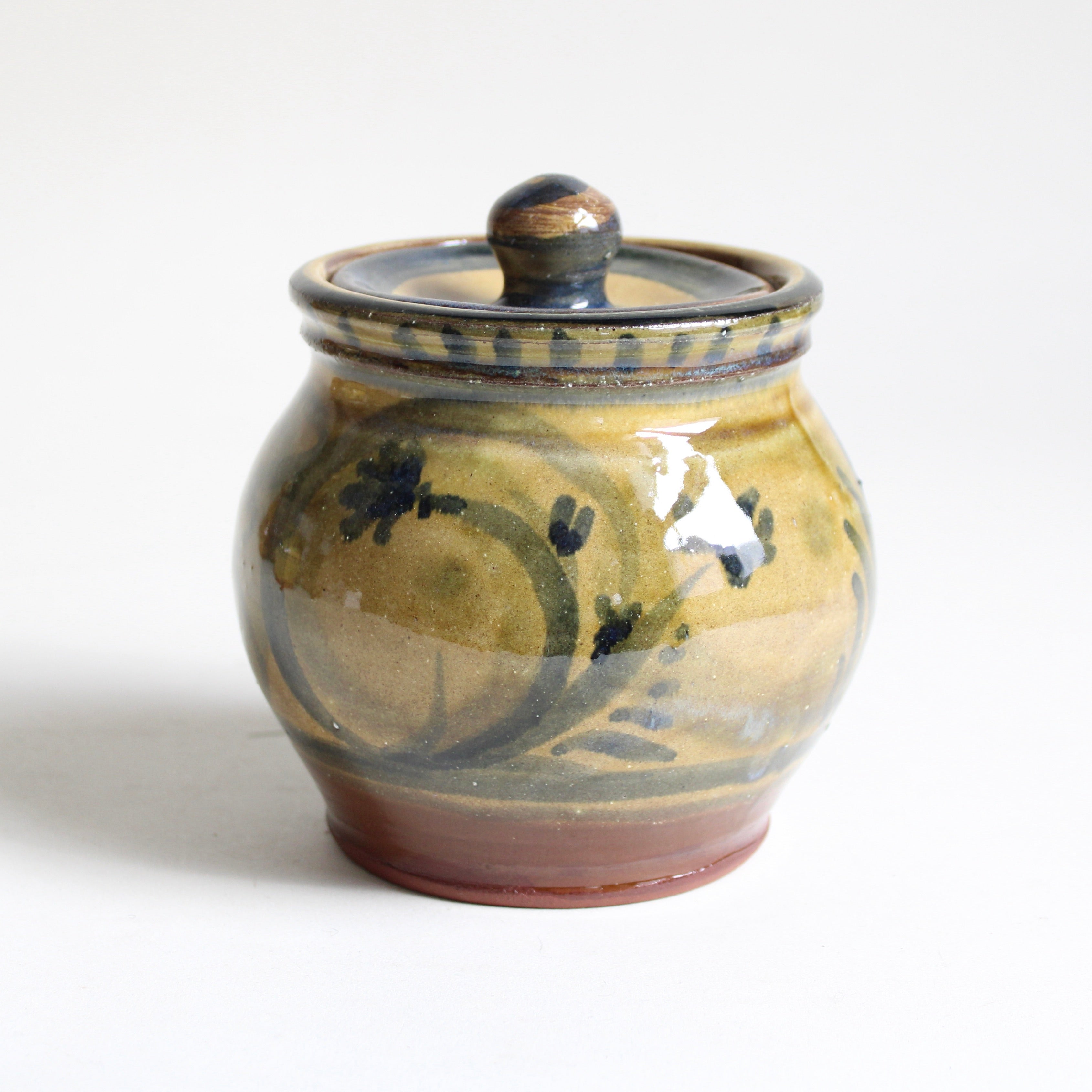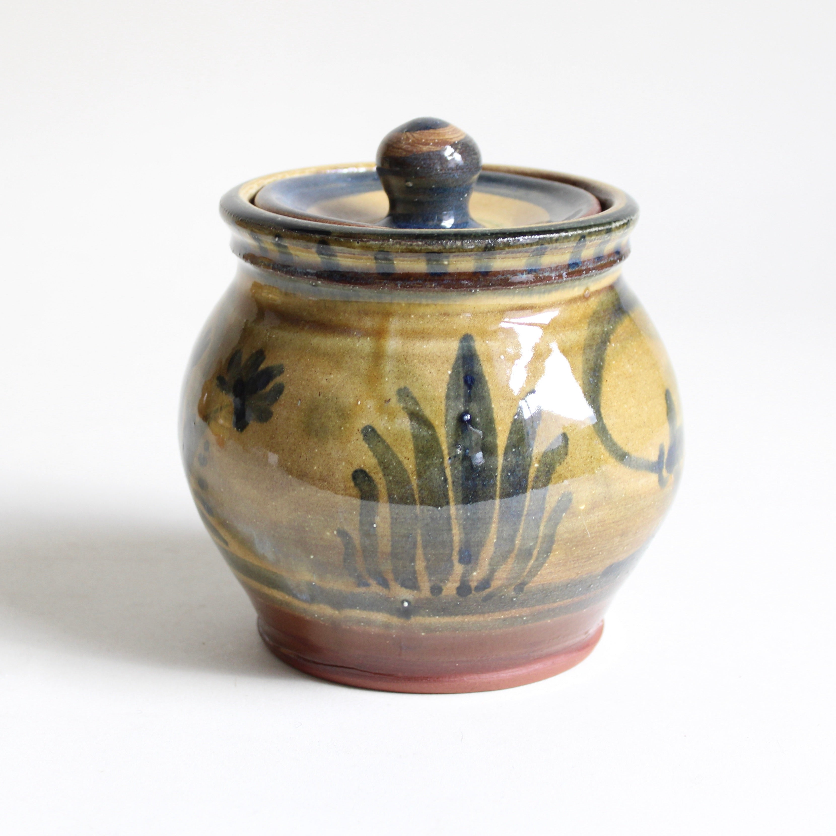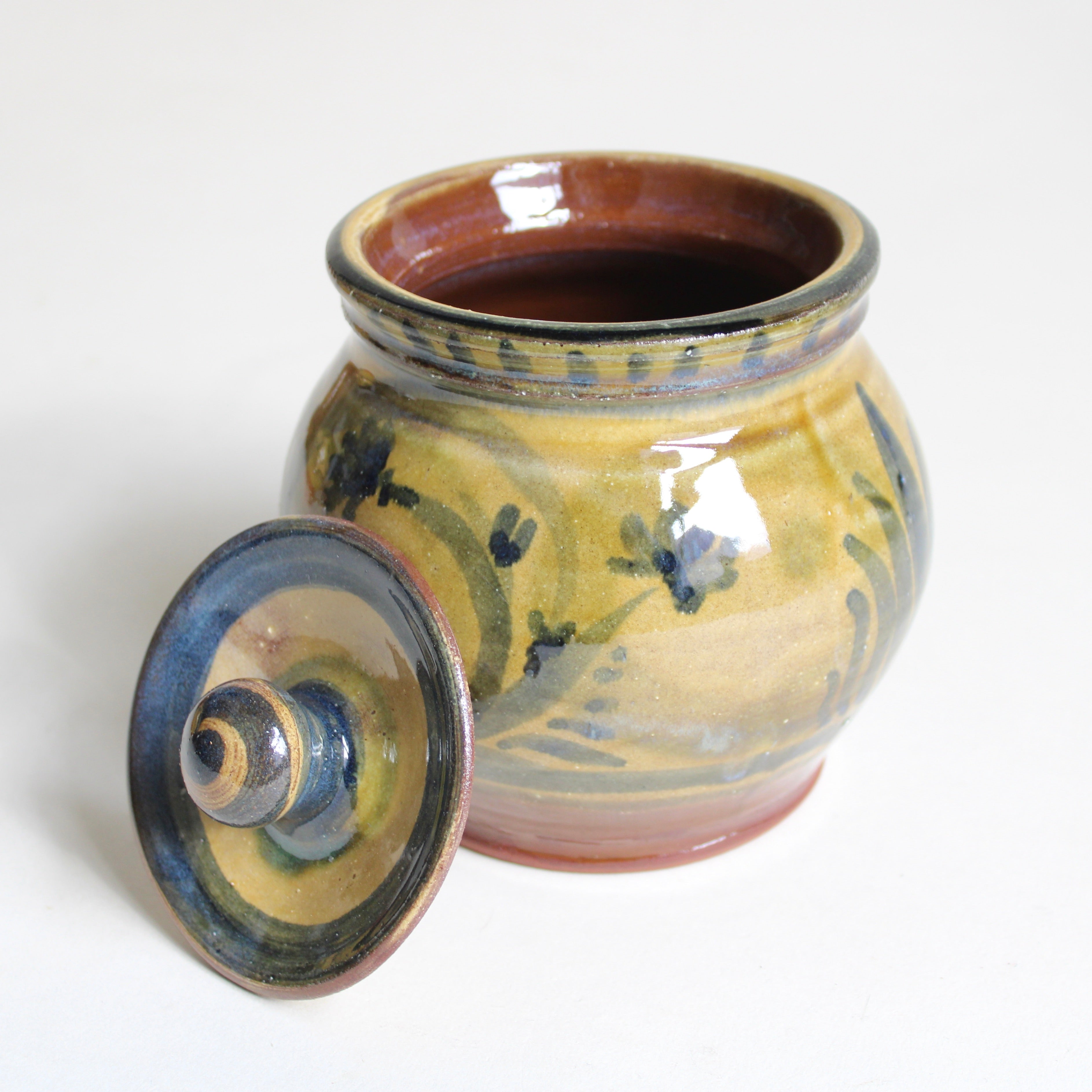 I love the simplicity of this sweet little redware jar. Perfect for herbs or a sugar bowl, this hand thrown, red clay pot is decorated in light yellow with hand painted floral designs. Its glossy glaze is lead free(as are all of my pots) and fired until the clay rings like a bell!