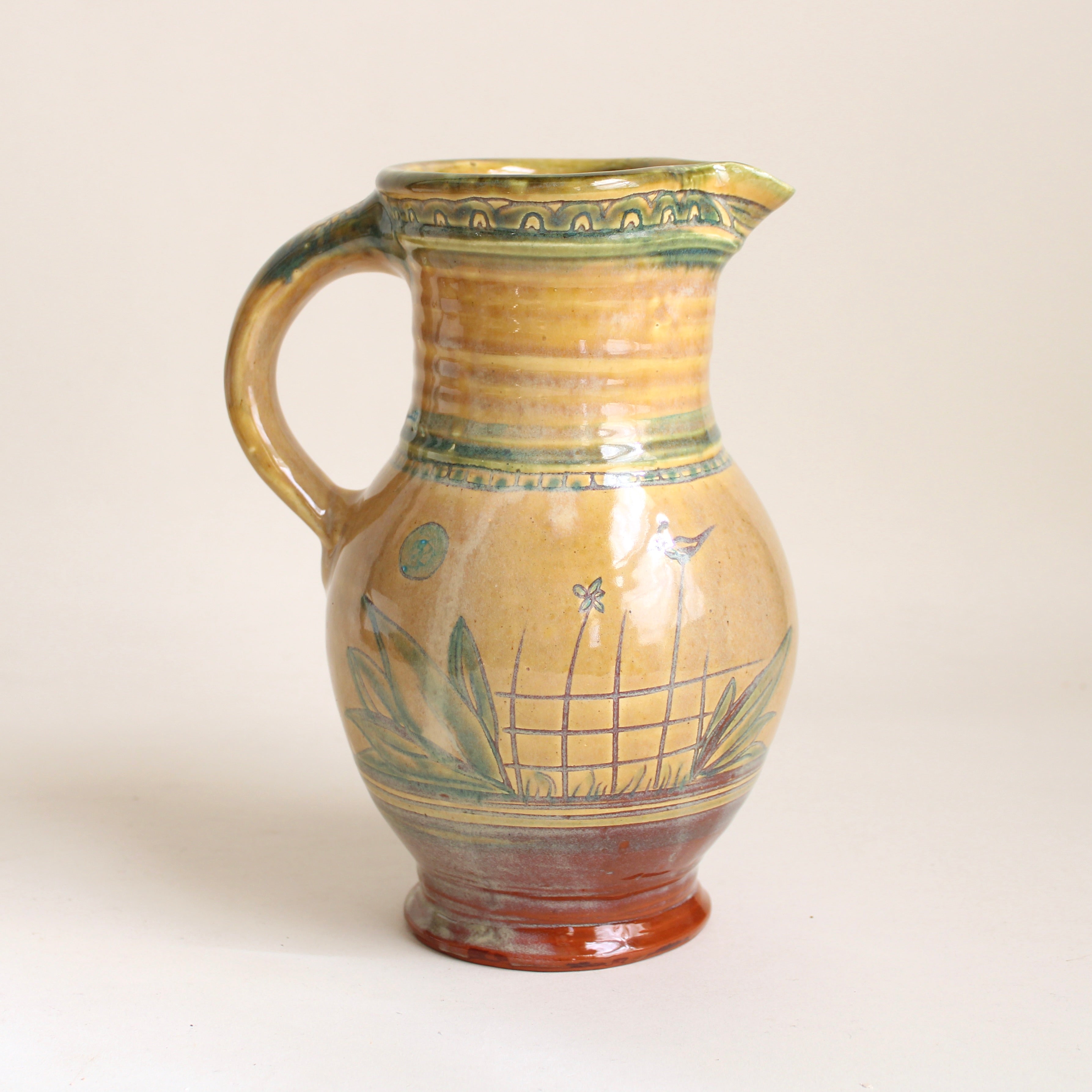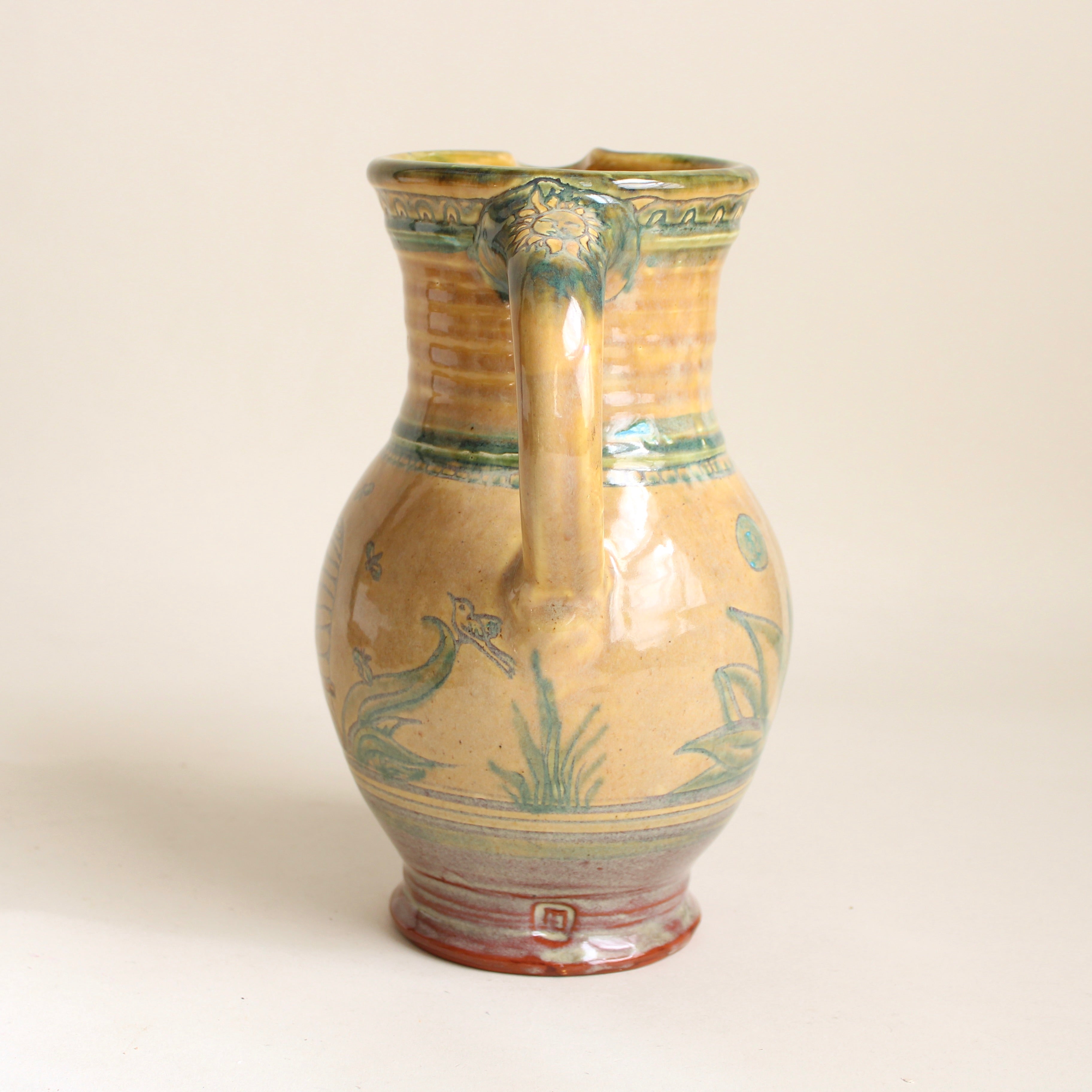 This distinctive red clay pitcher is inspired by the antique folk pottery of France yet made in the Pennsylvania tradition of the Moravian potters of the Colonial era. Baroque and exquisite, this is a hand thrown and decorated pitcher from the work shop of Eric Hahn, a Pennsylvania potter of sixty years.