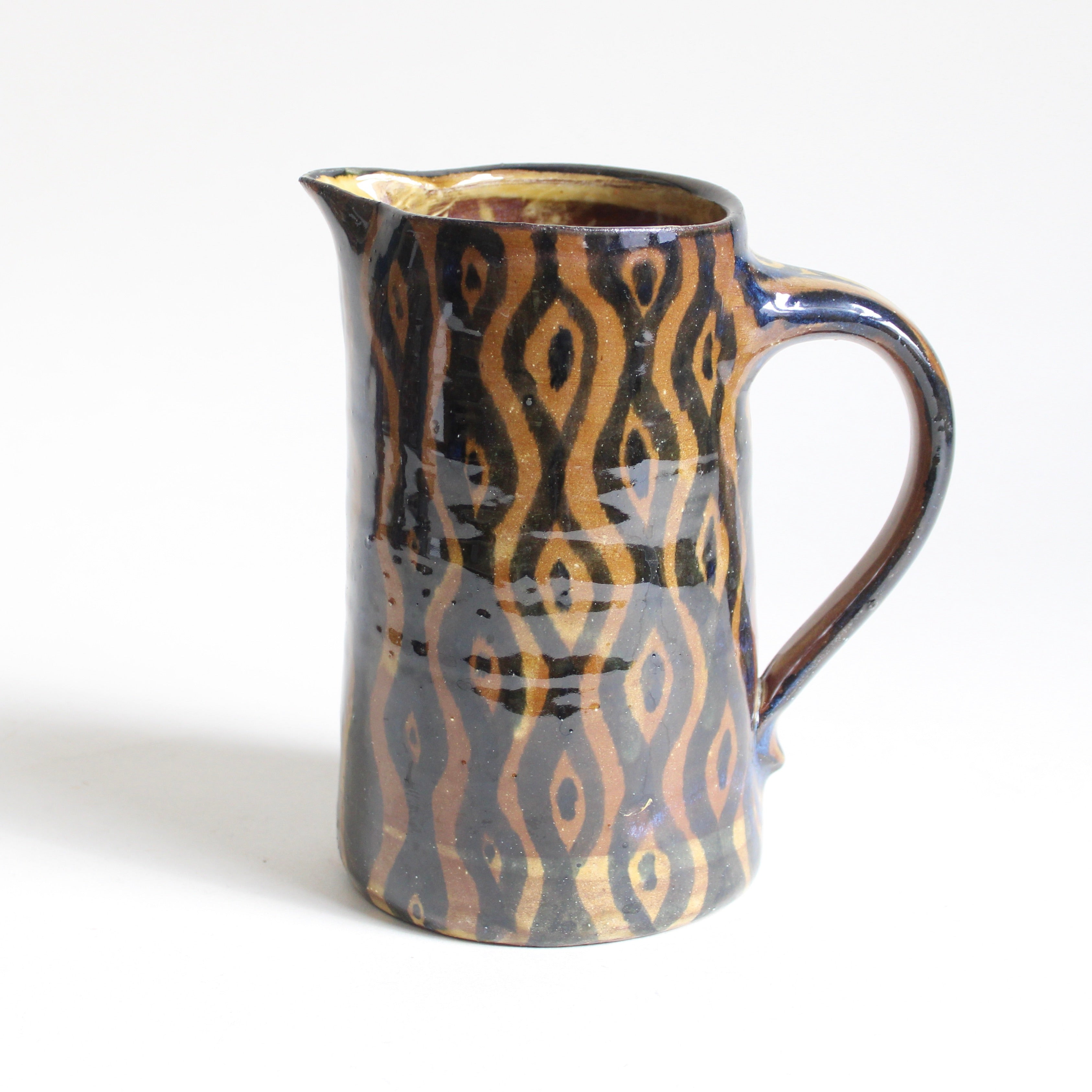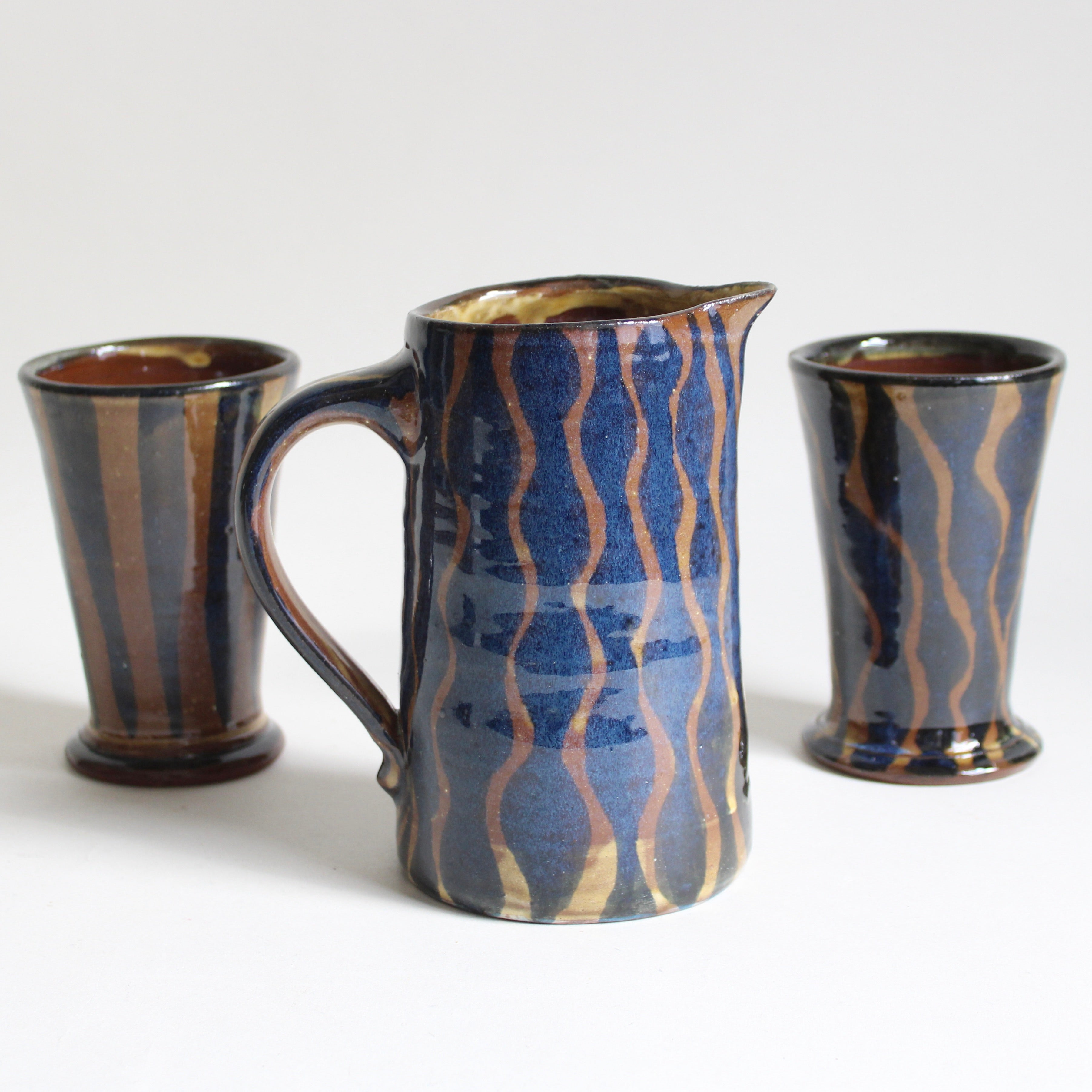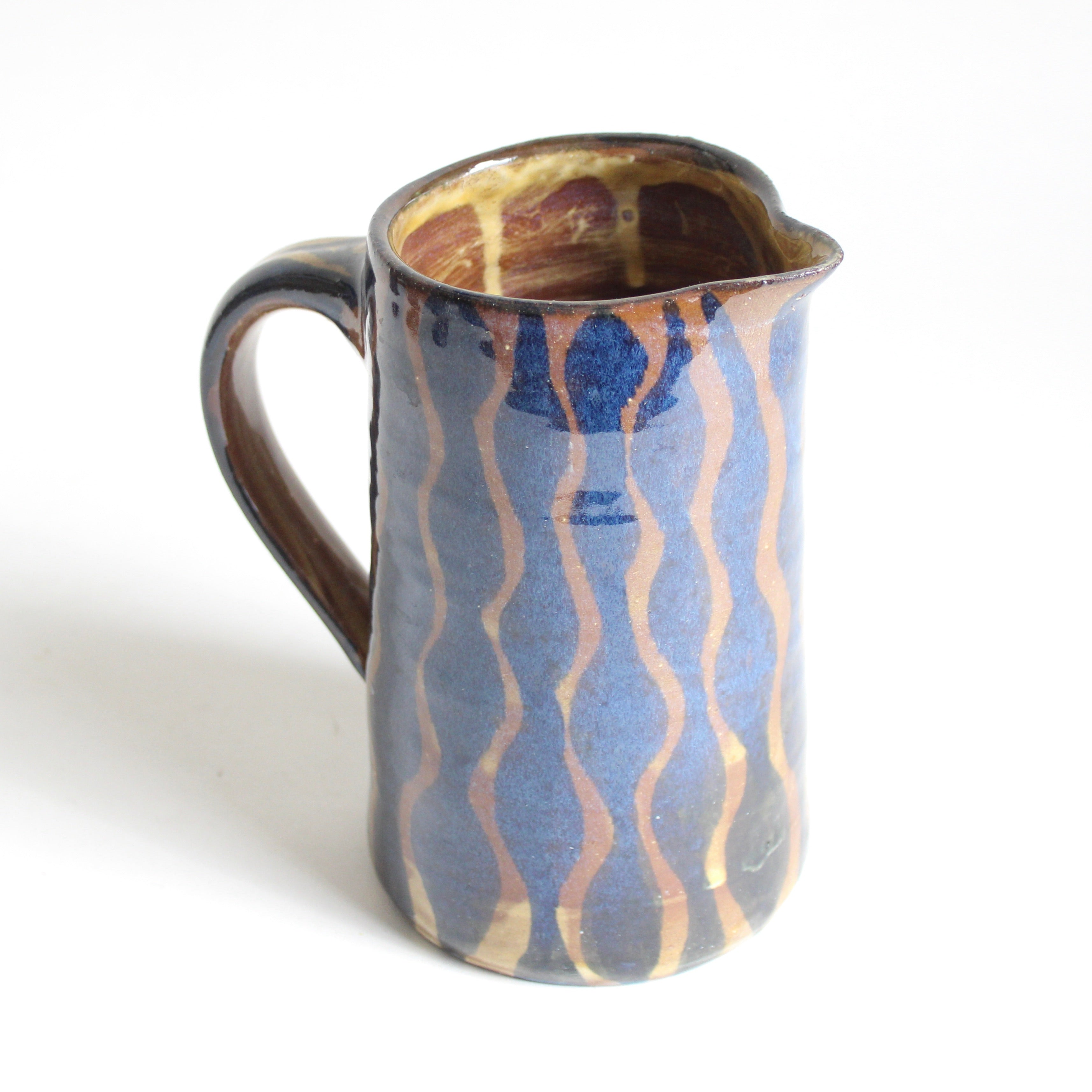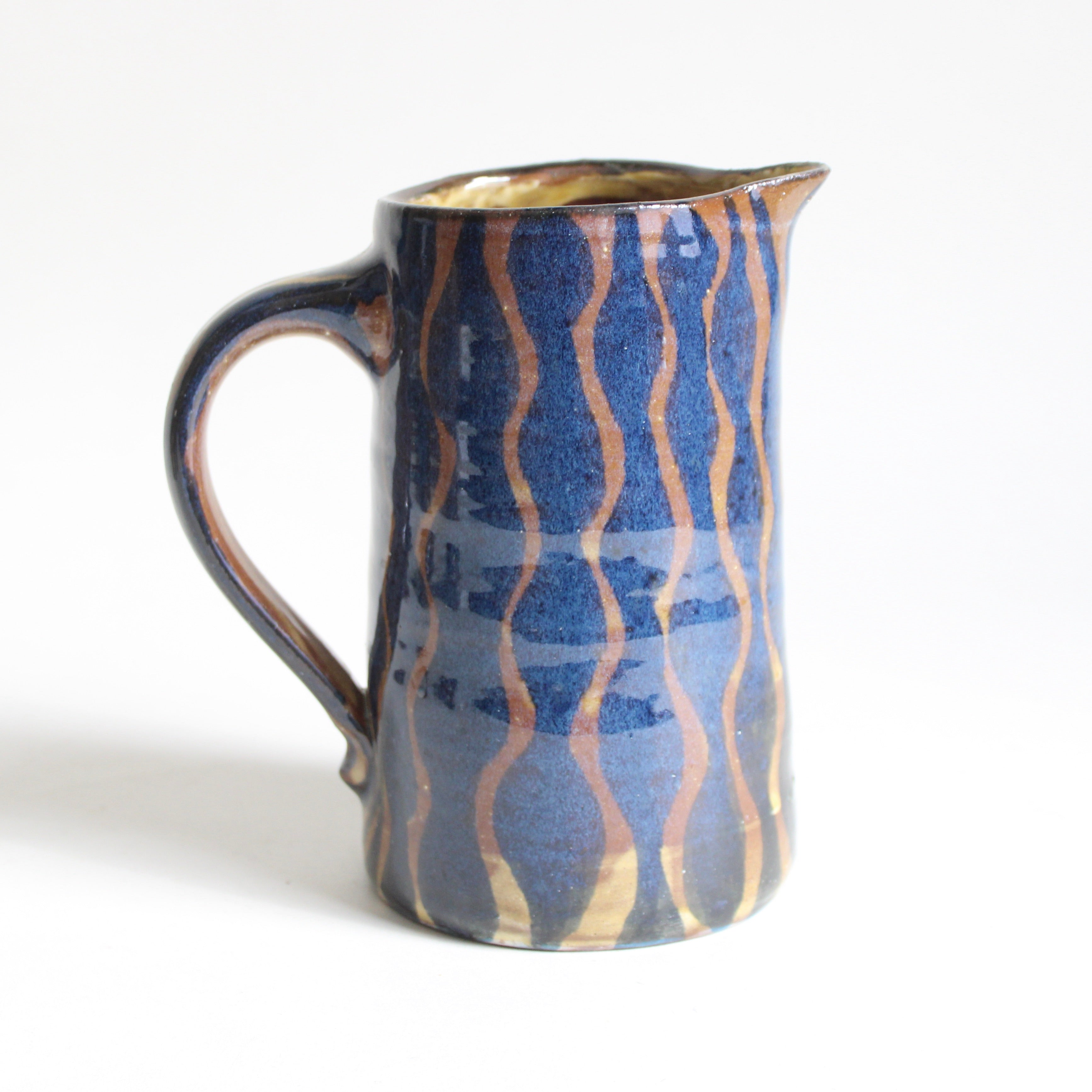 Hand thrown from red earthenware clay and hand painted in a flowing blue, rippling design - this fully functional gem will brighten your table for years with its classic form. Pour hearty mugs of meade or complement flower arrangements at your table. Truly fine pottery.