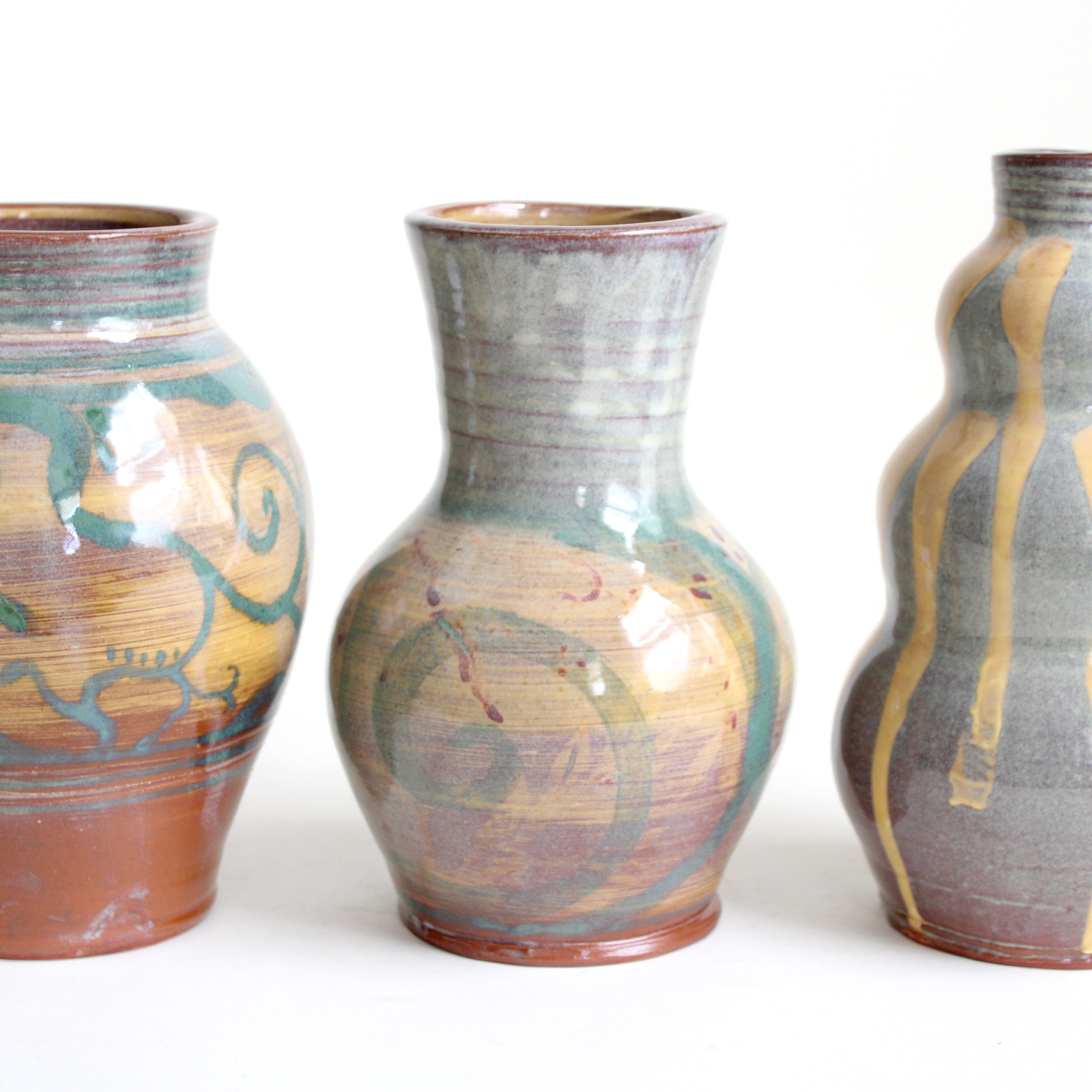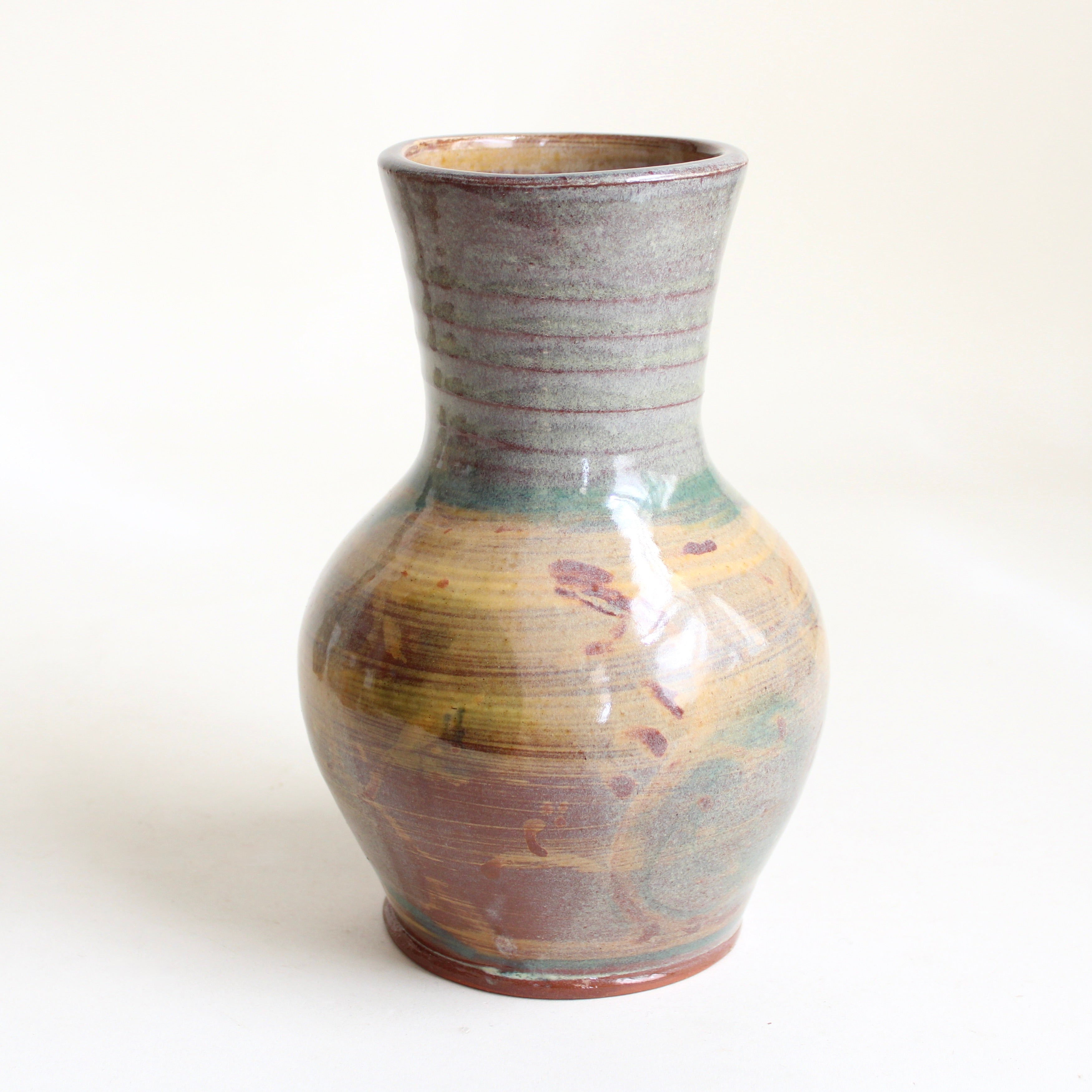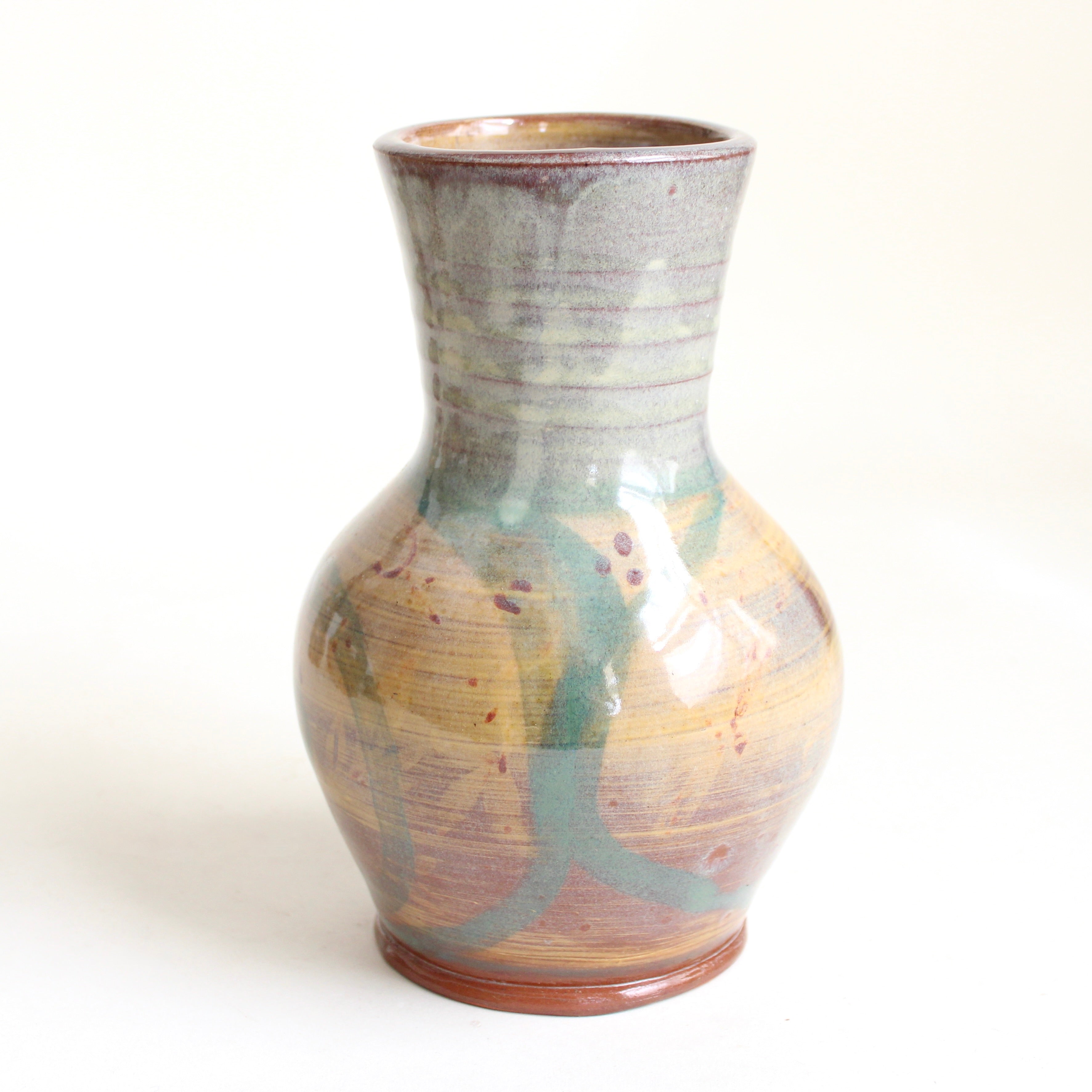 This hand thrown red clay vase is wonderfully decorated in colored clays painted beneath a misty flowing glaze. Fully functional and perfect for flowers and twigs.