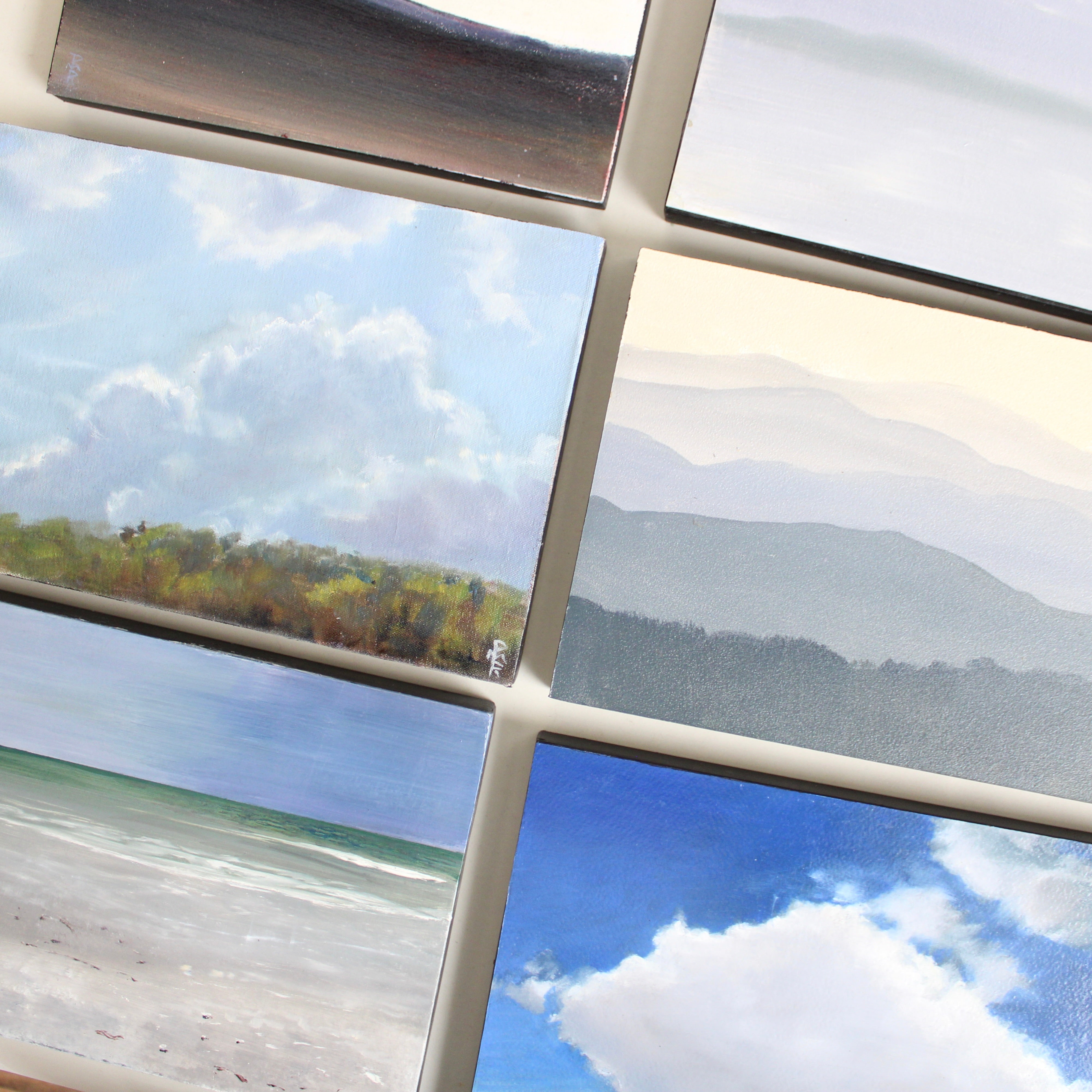 These paintings are edited out of a large group of studies and stream of consciousness, pieces I’ve done over the years. All are original, one-of-a-kind oil paintings on primed archival panels, ready to hang or be framed. On occasion these studies have been used to create larger paintings, but more often they are simply a moment in time captured in paint.