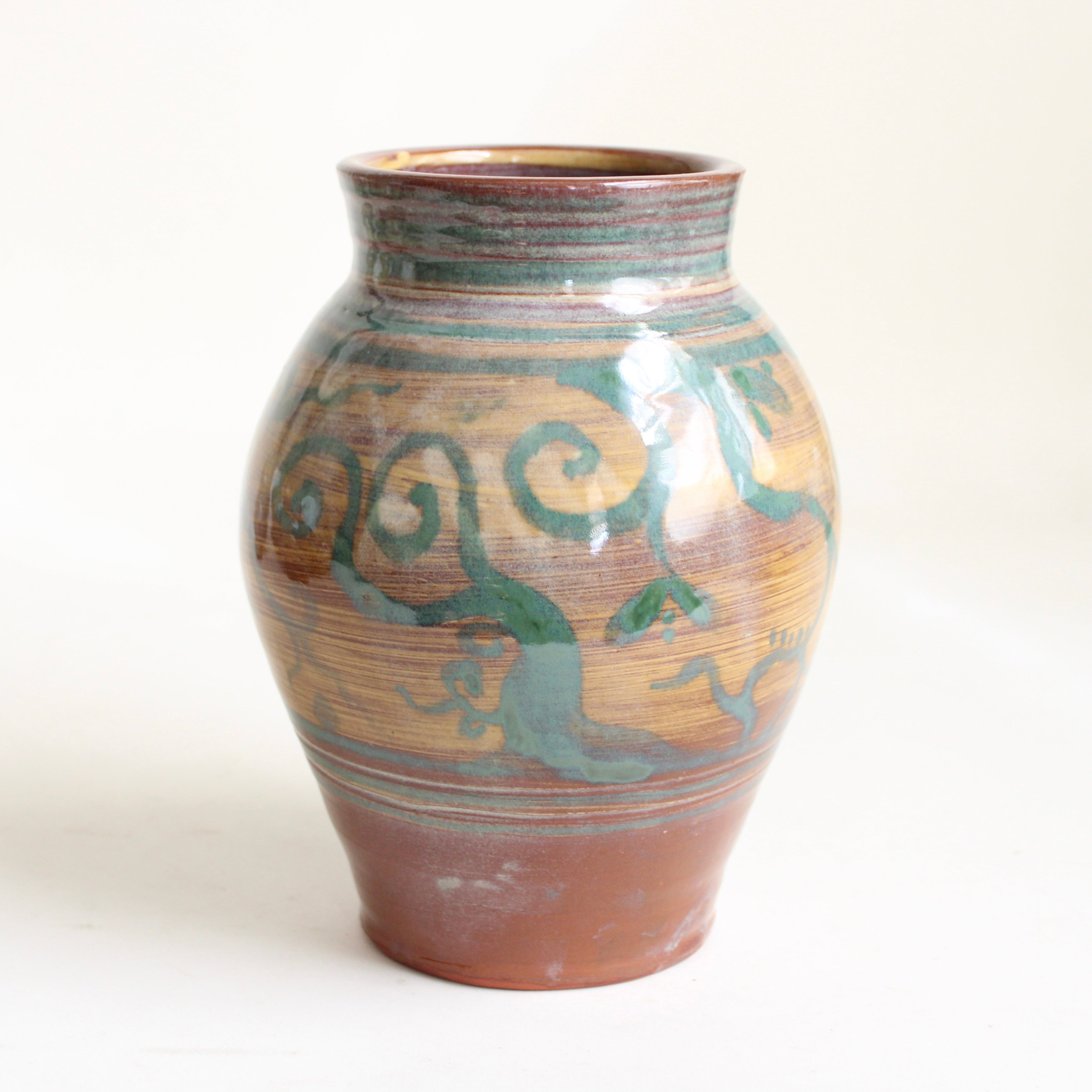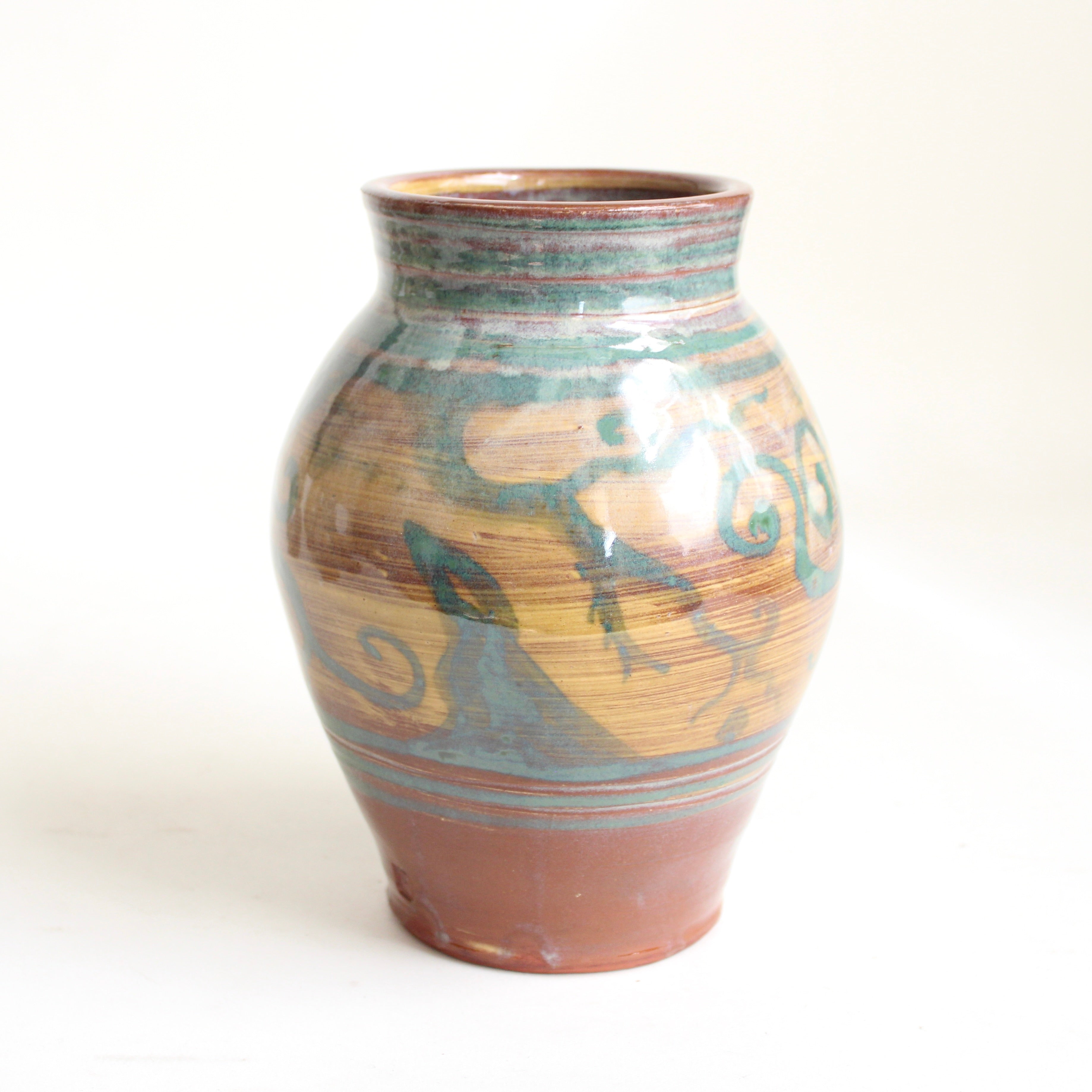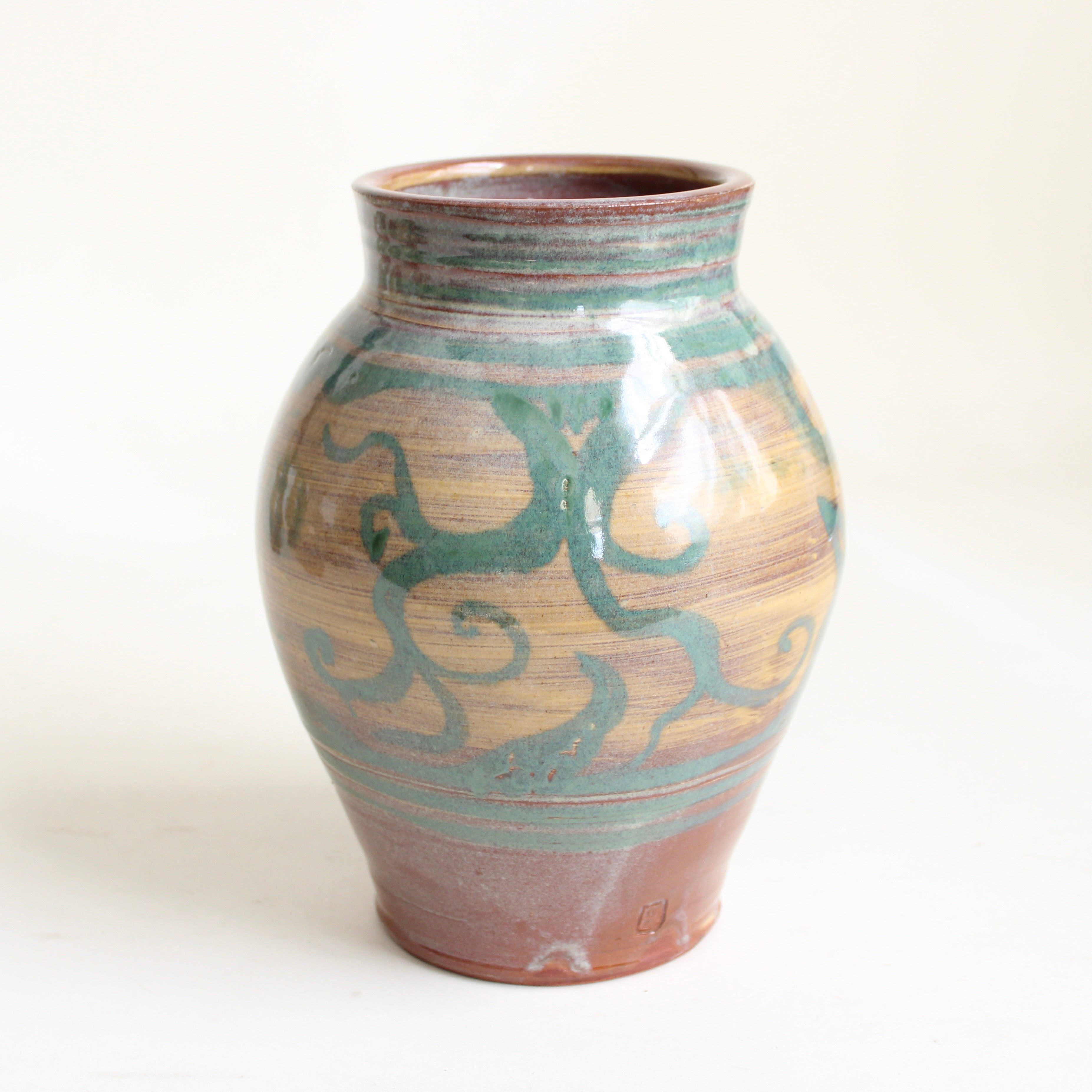 This vase is ancient and alluring, painted in colored clay beneath an amber glaze over a curvaceous hand thrown form. Fully functional and enigmatically beautiful.
