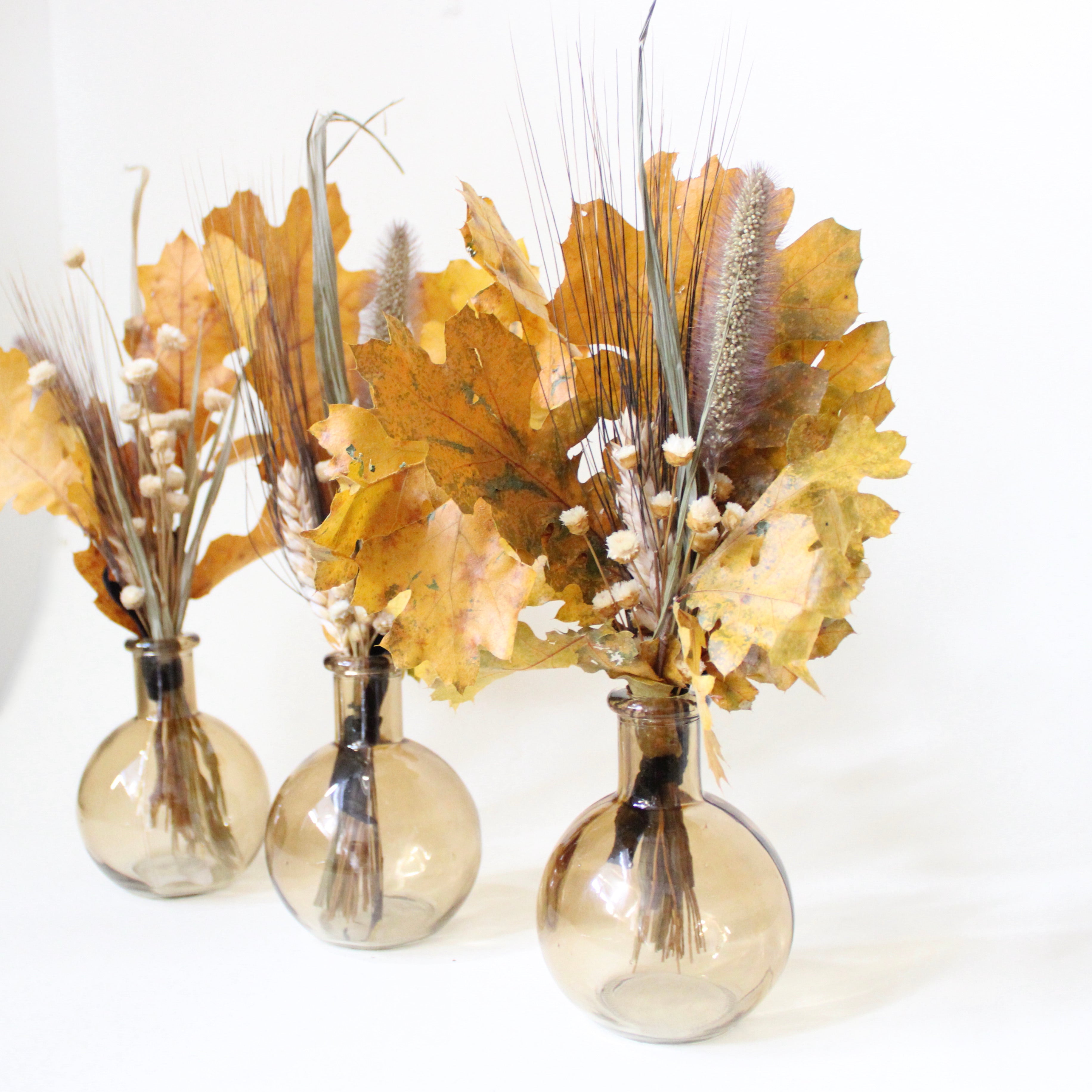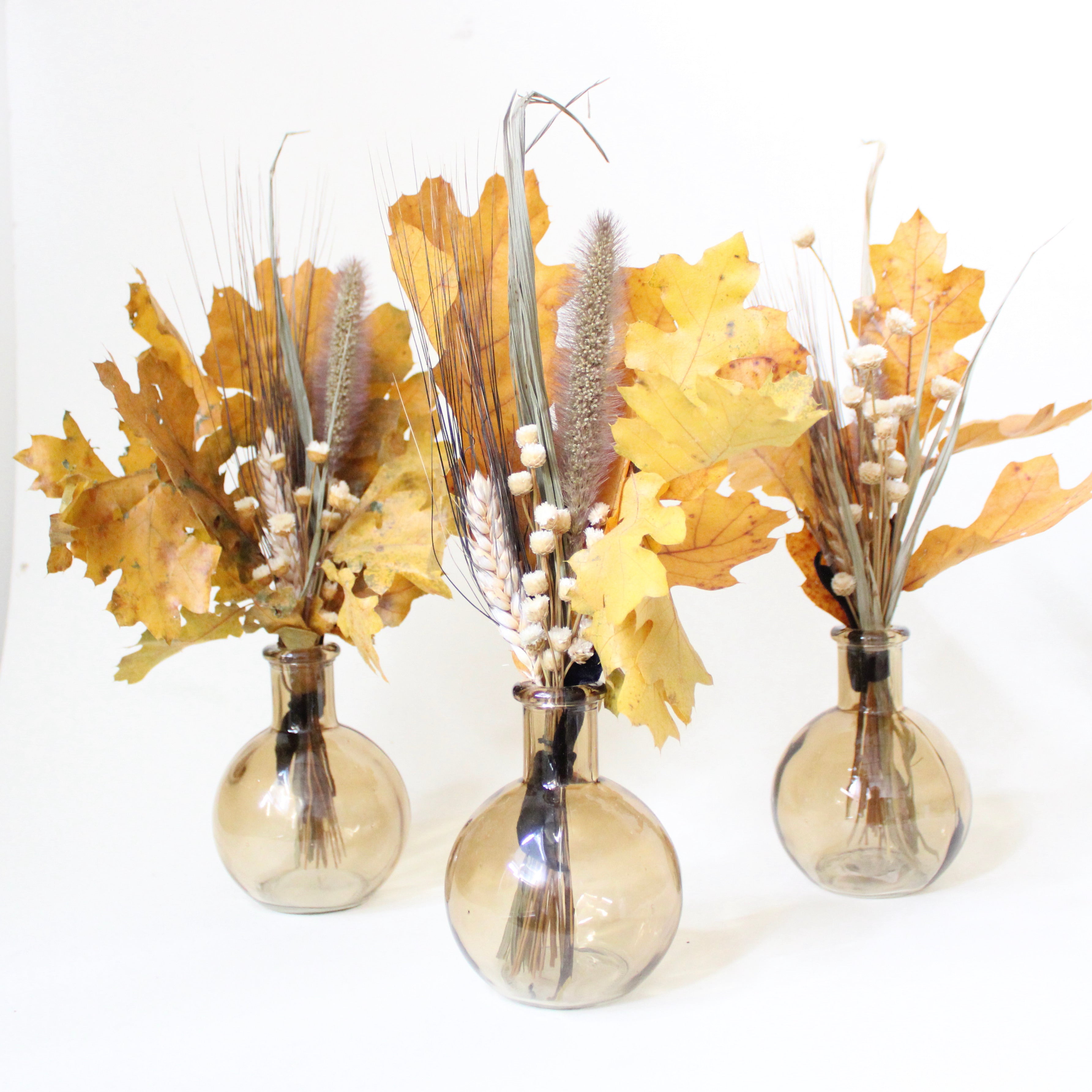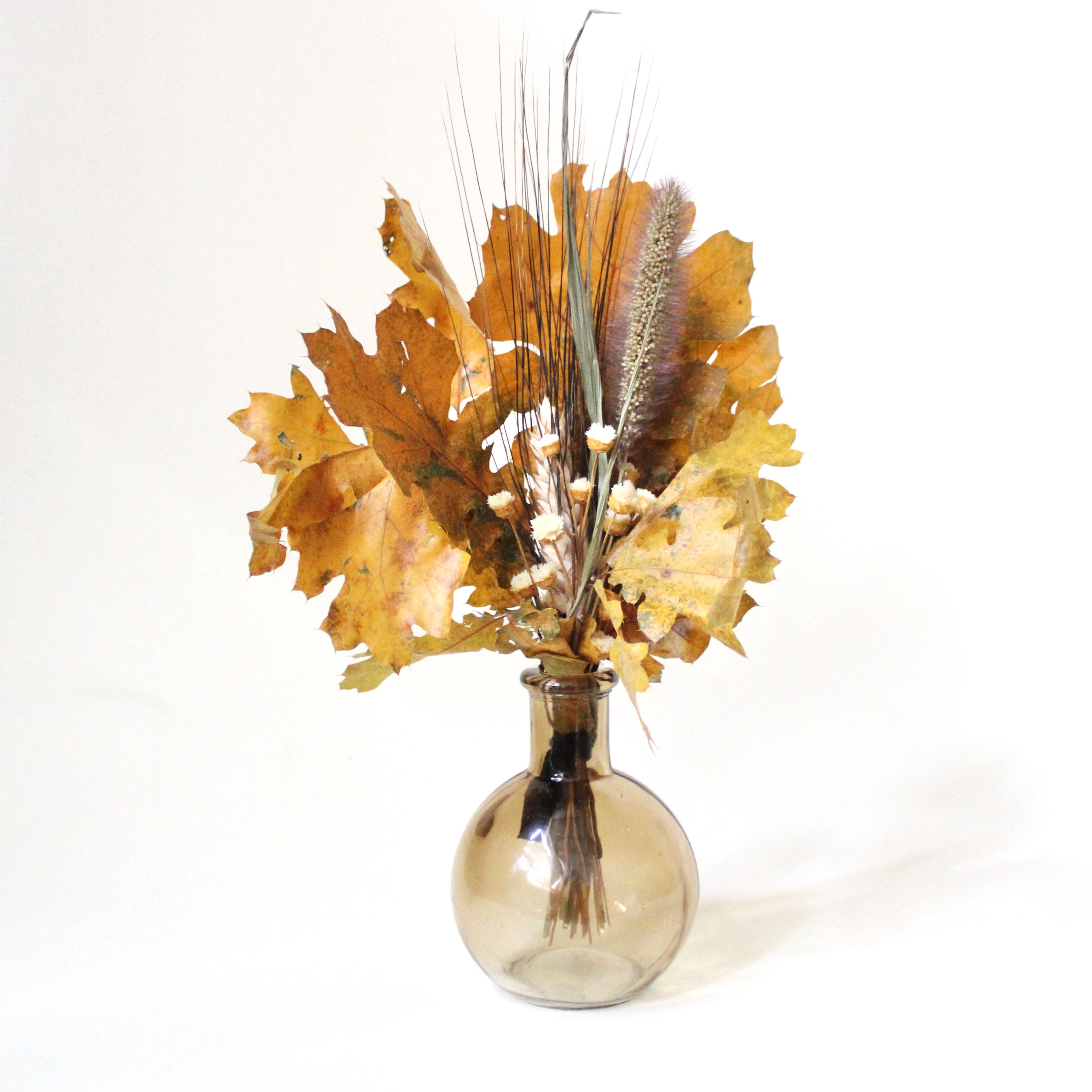 Autumn Ember Arrangement features happy flower, oak leaves, purple mist millet, and bearded wheat.