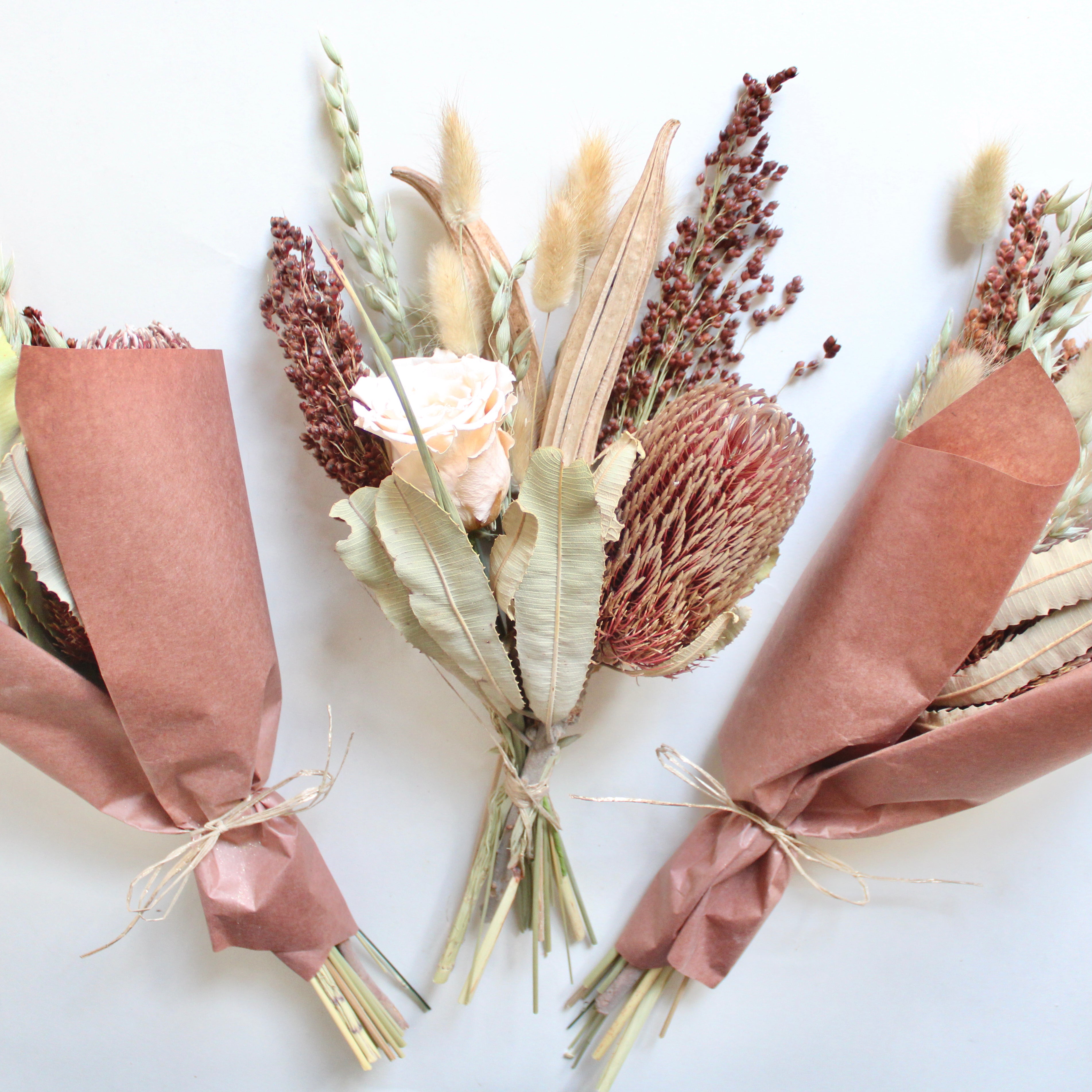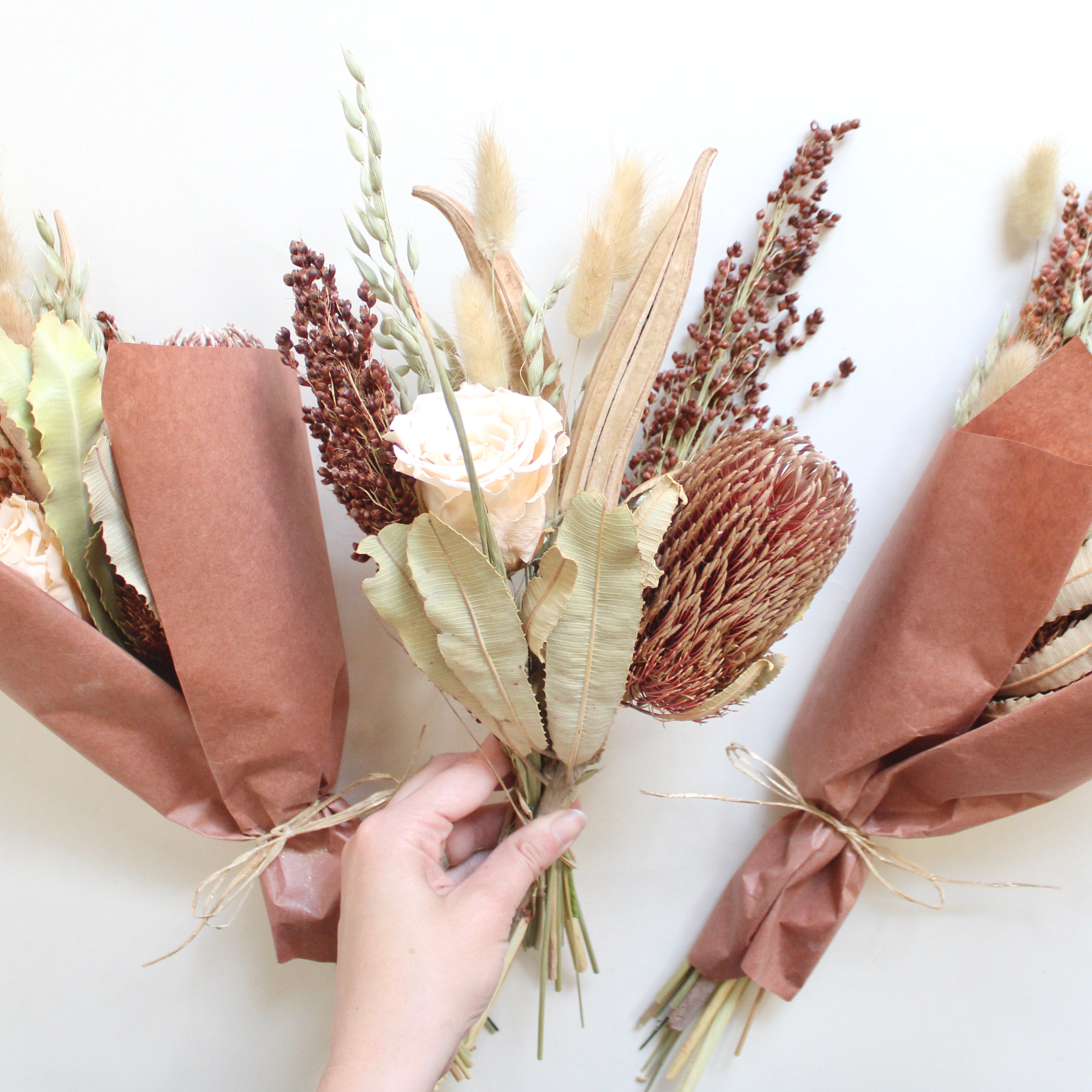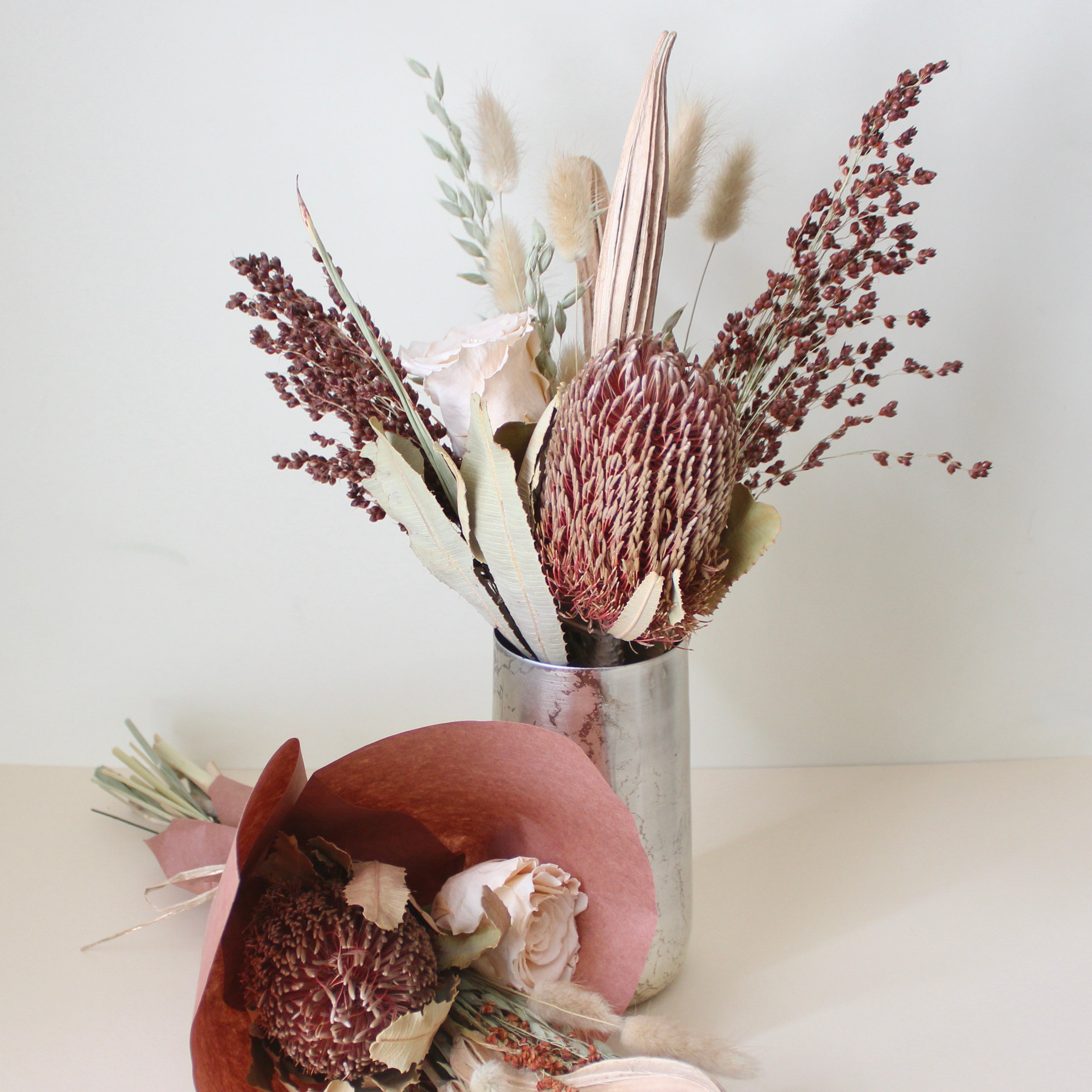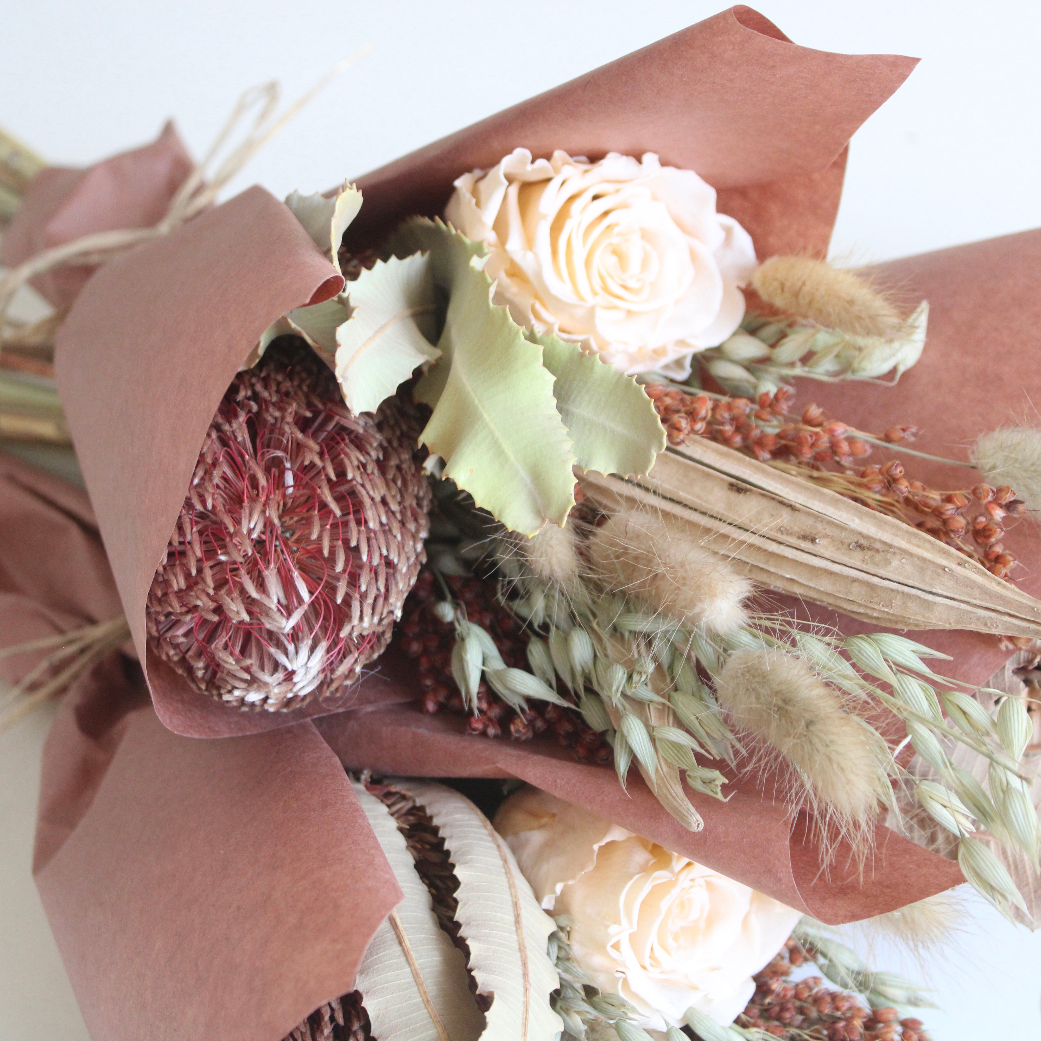 Desert Rose Bouquet features banksia, broom corn, okra, bunny tails, avena, and preserved rose.