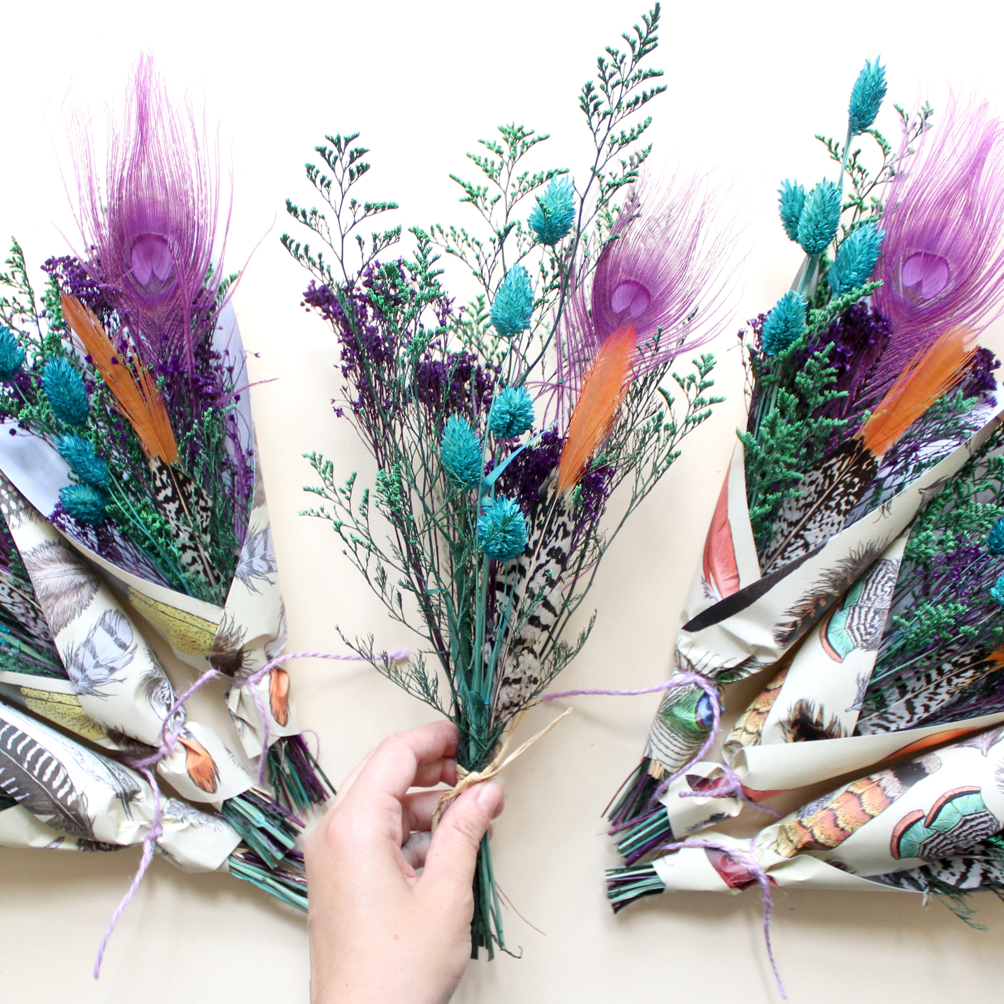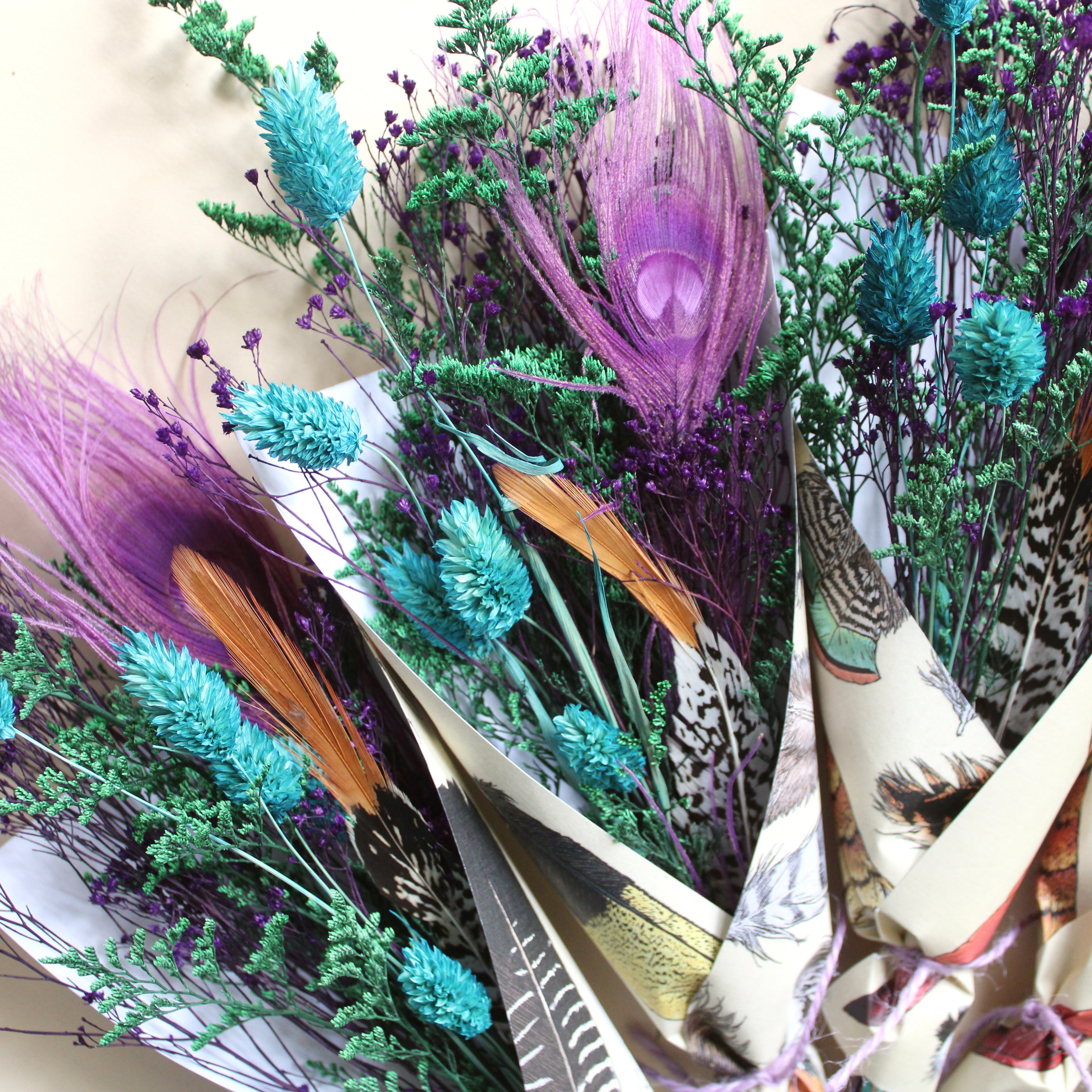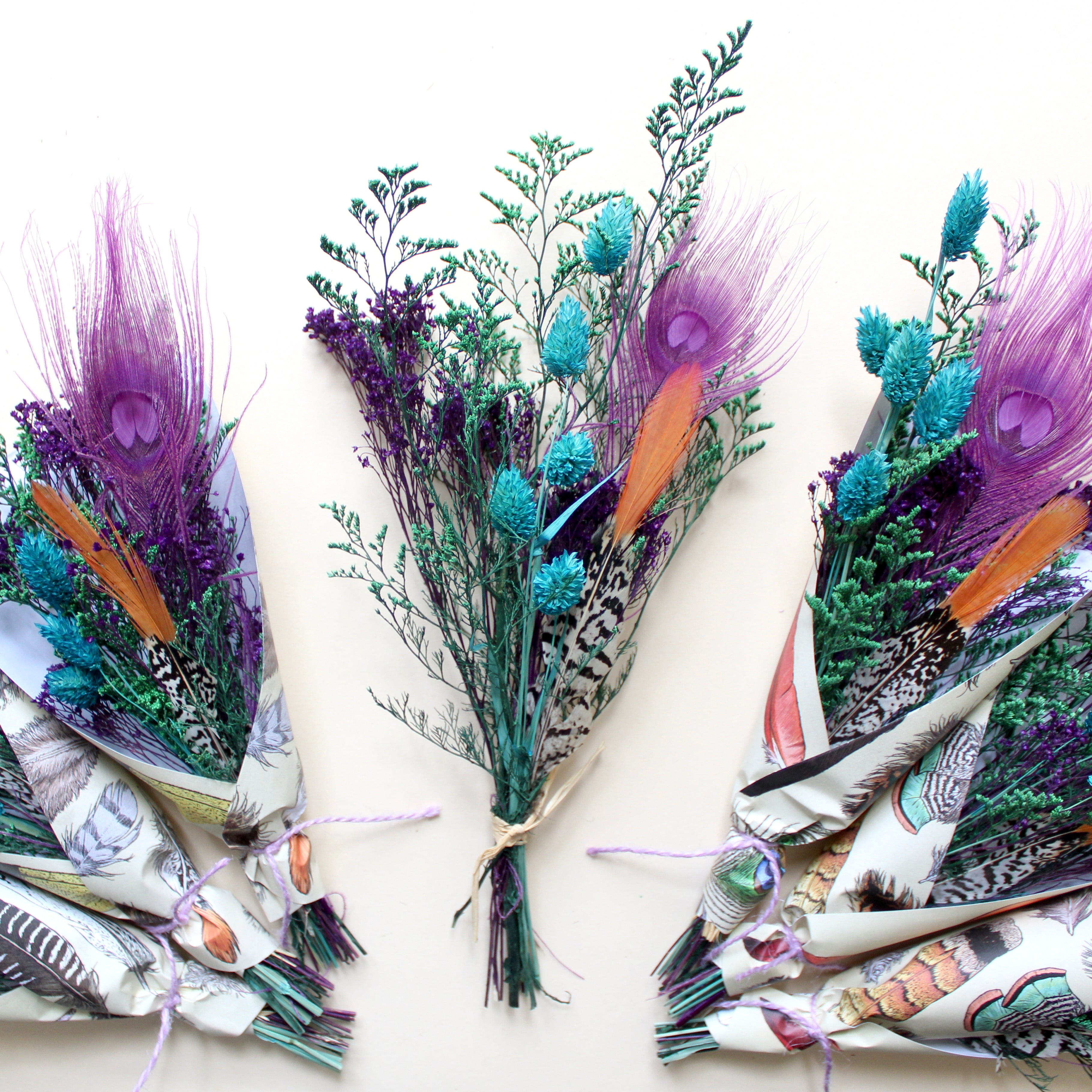 Birds Of A Feather Bouquet features caspia, phalaris, broom bloom, pheasant feather, and peacock feather.