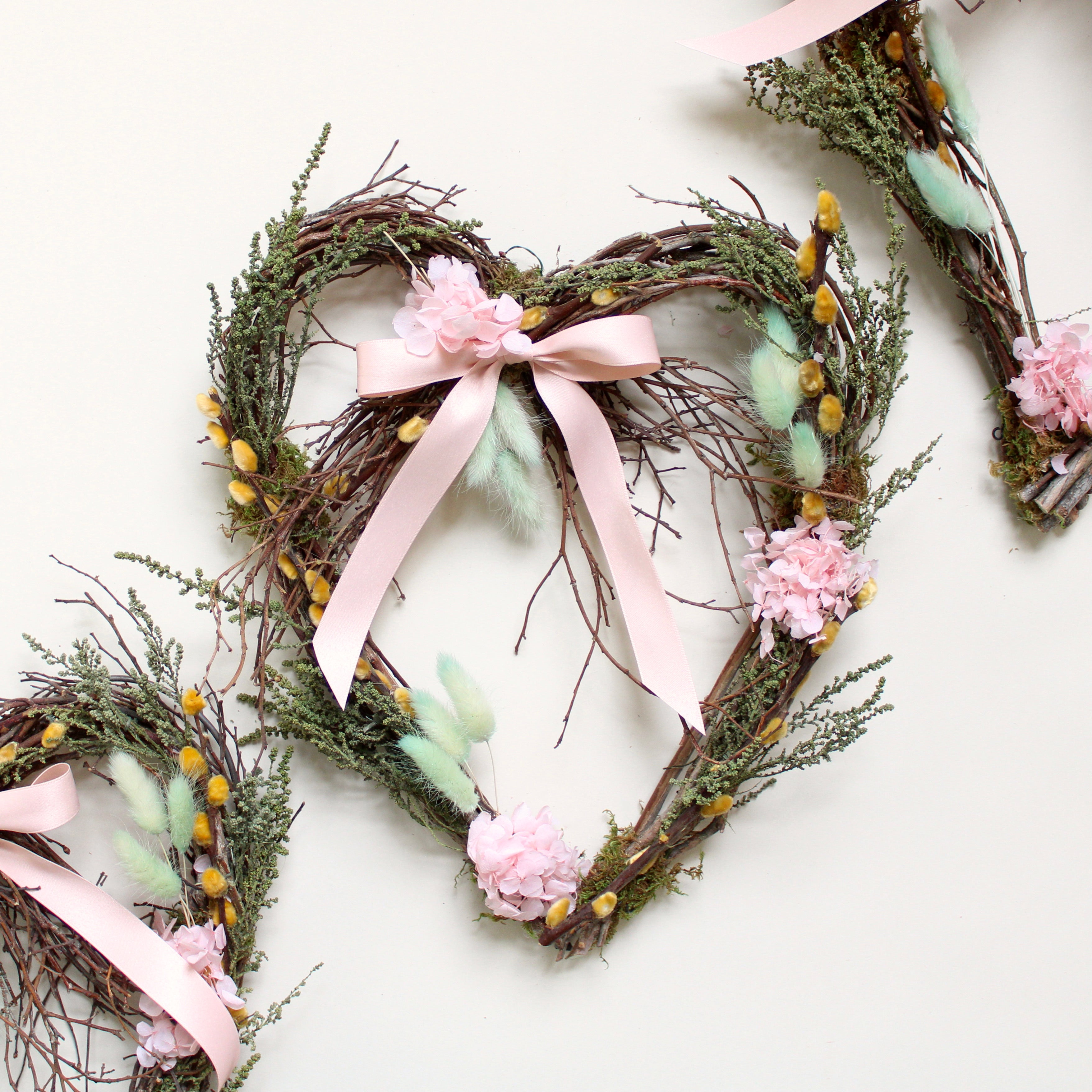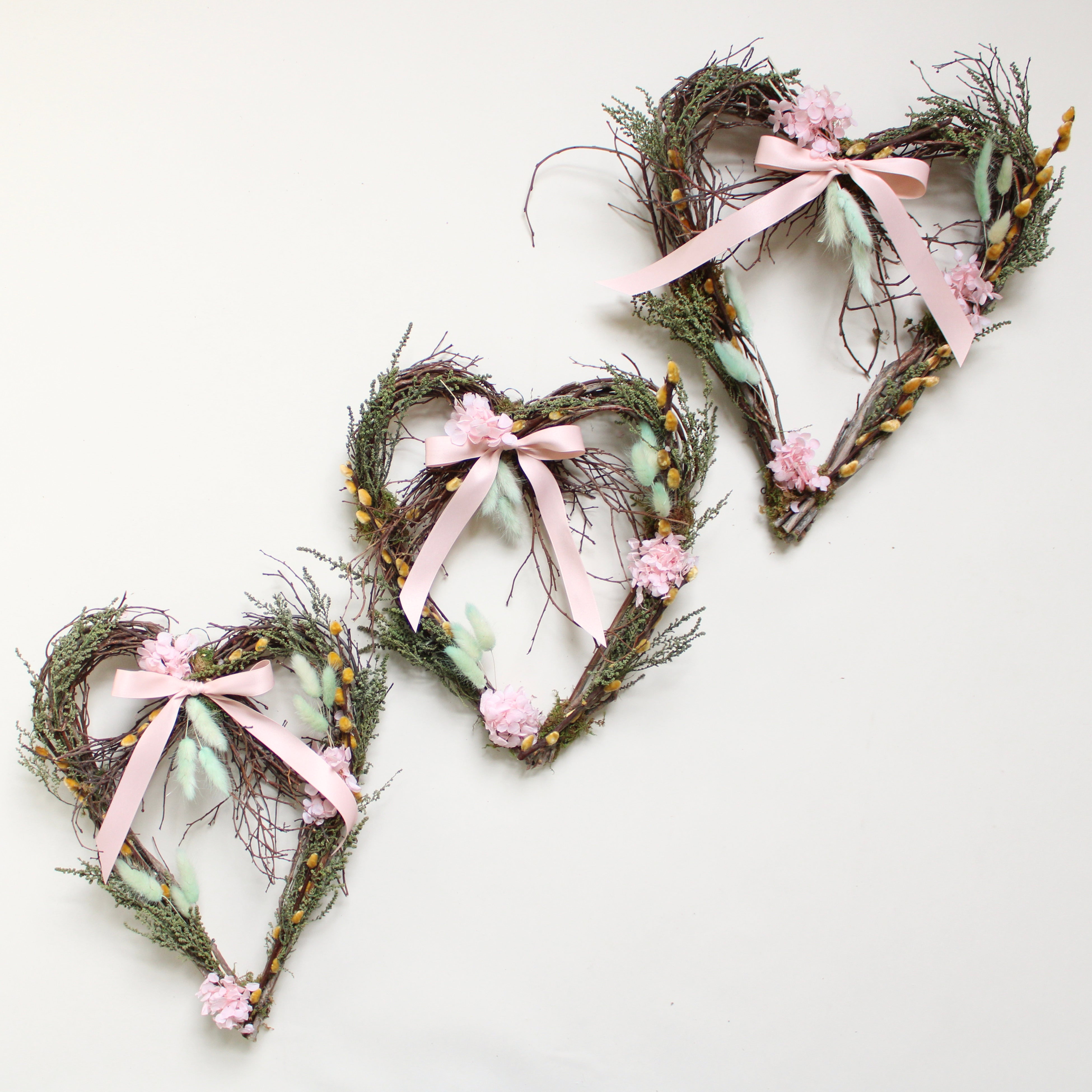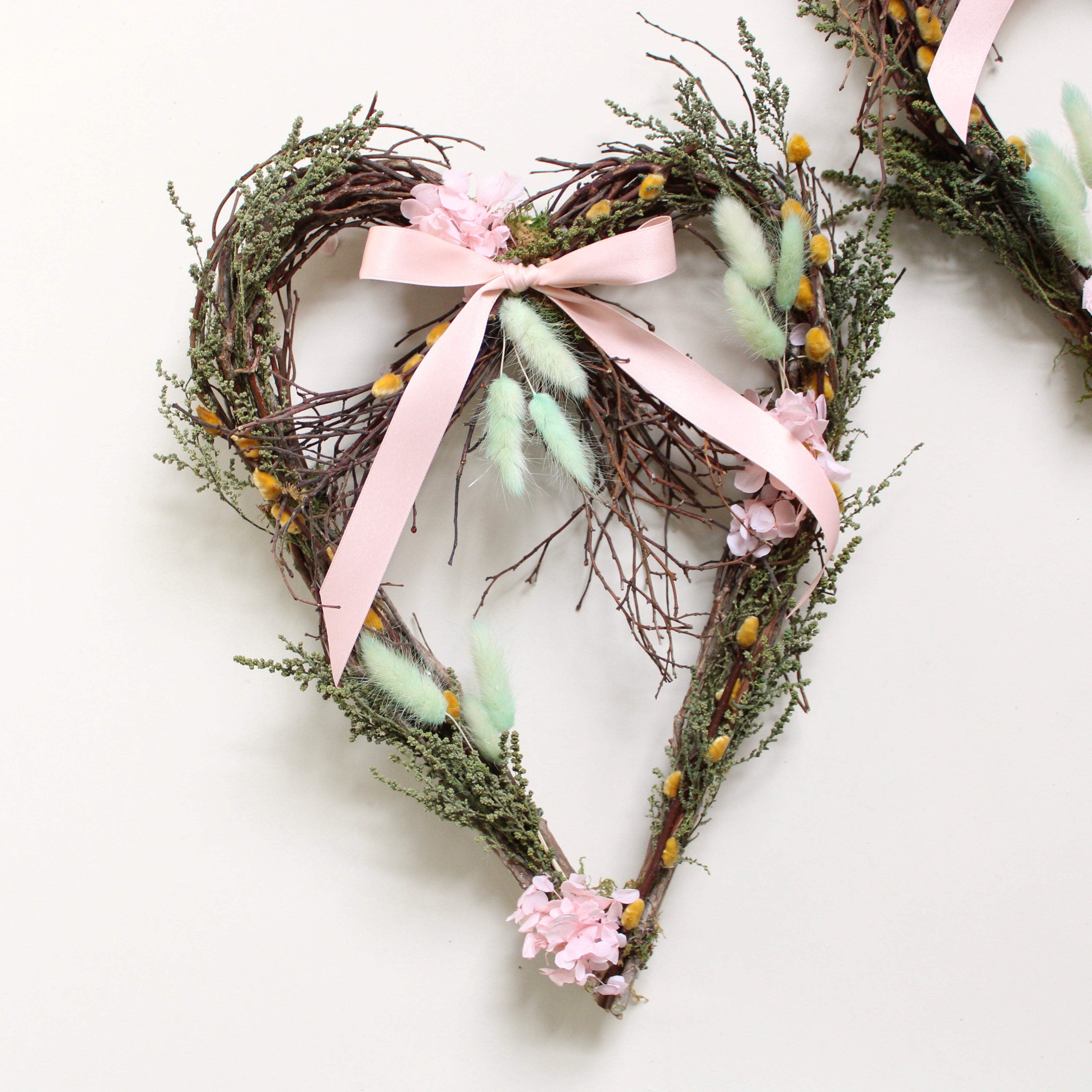 Budding Blossom Heart Wreath features hydrangea, pussy willow, bunny tail, and stoebe.