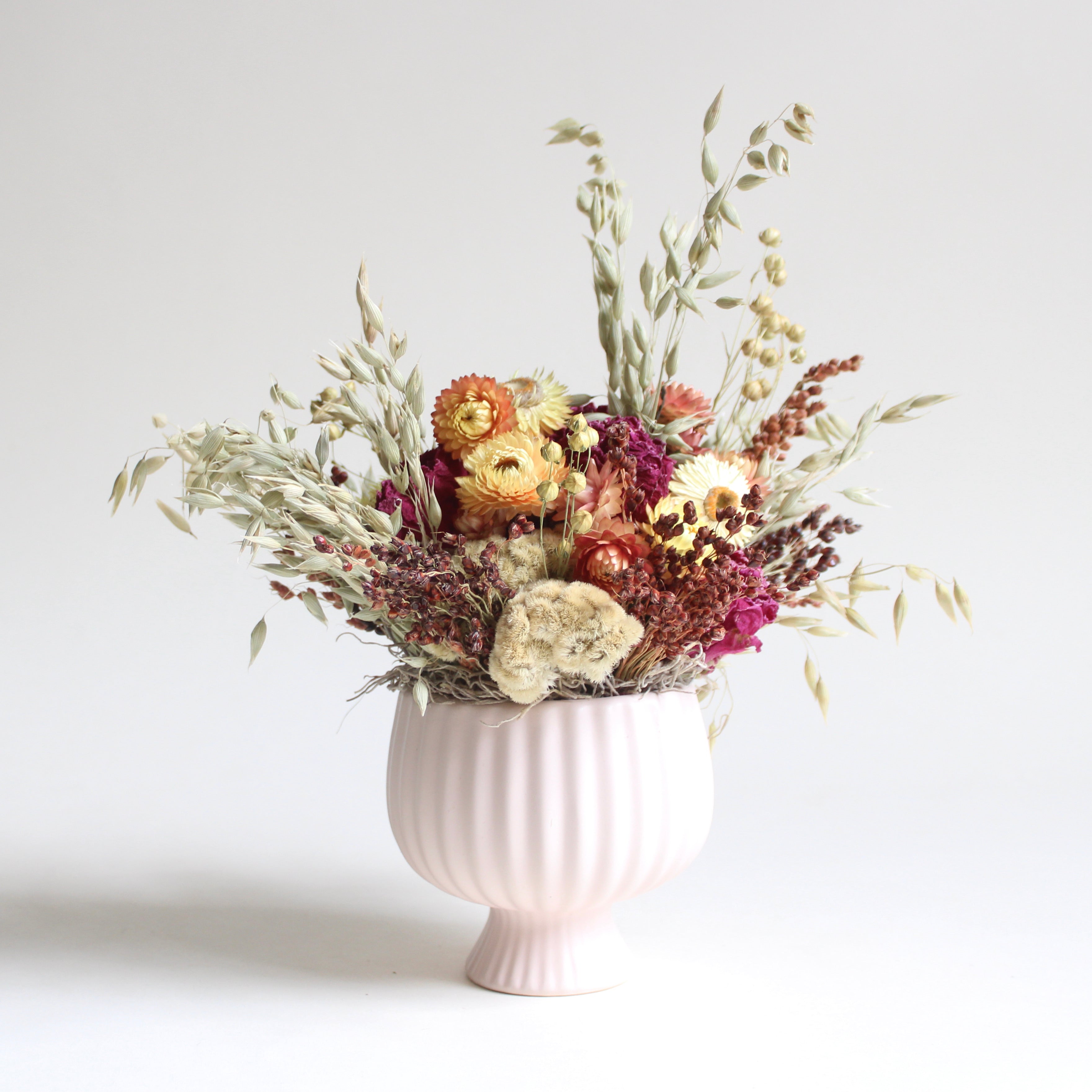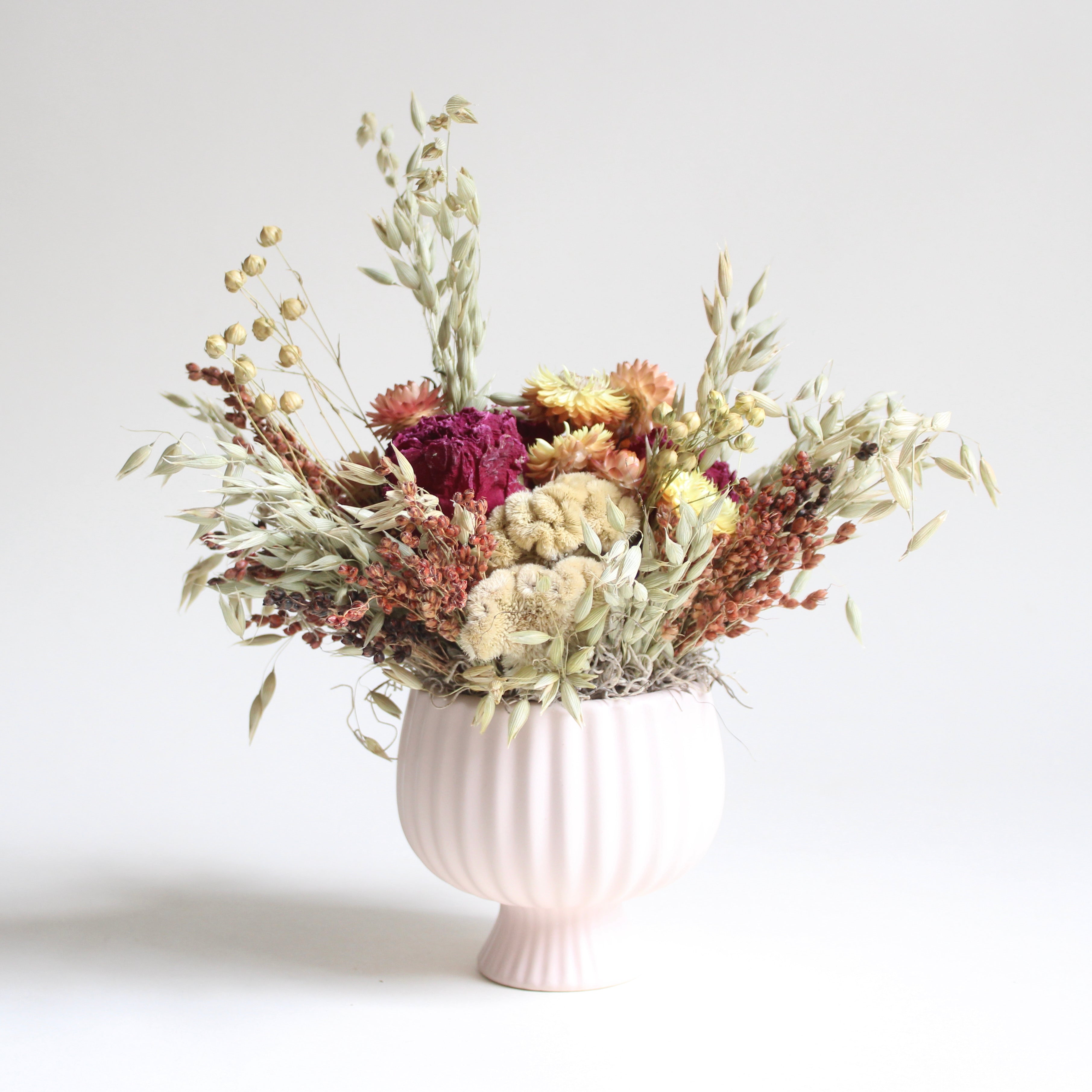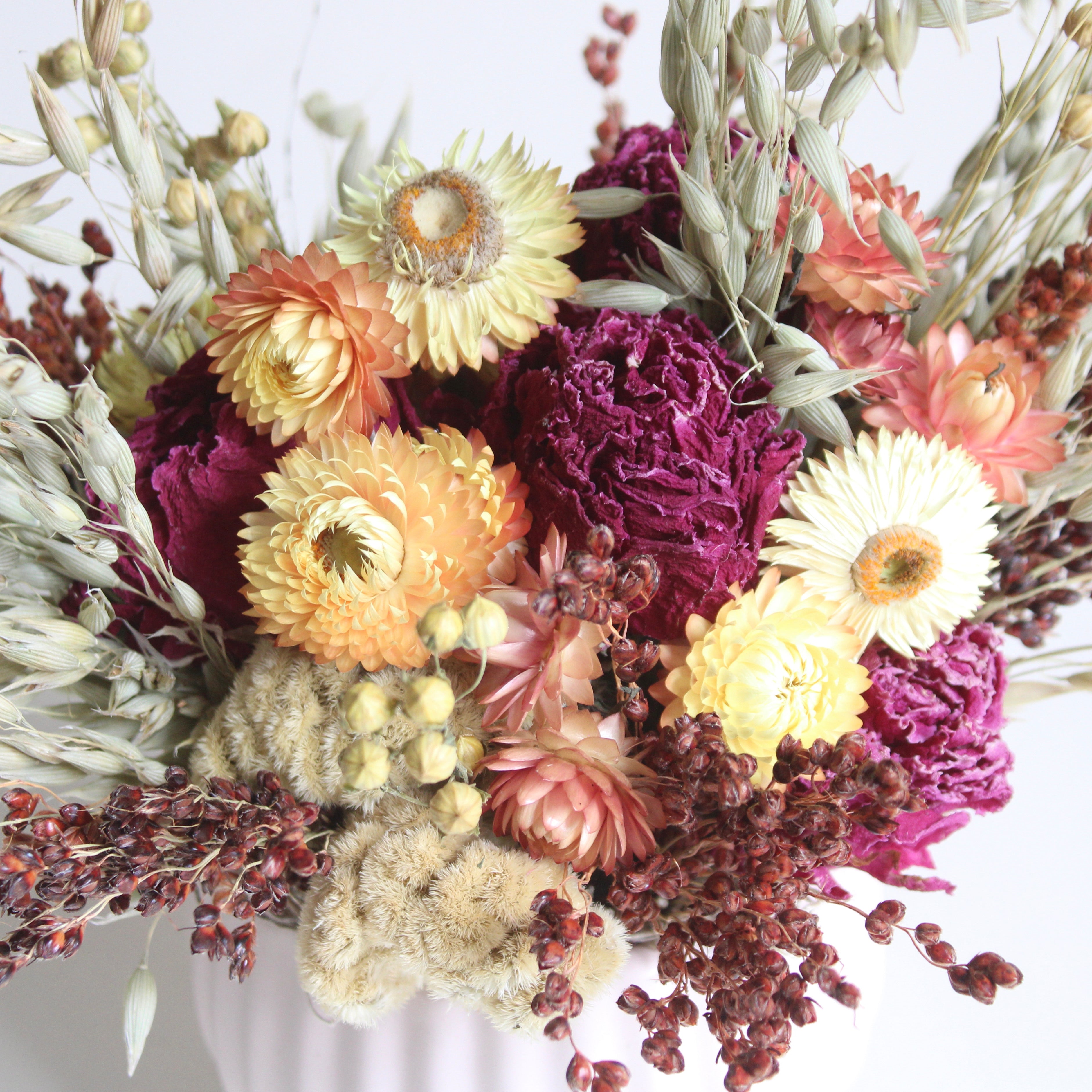 Cup Of Garden Arrangement features strawflower, broom corn, avena, peony, cockscomb, and Spanish moss