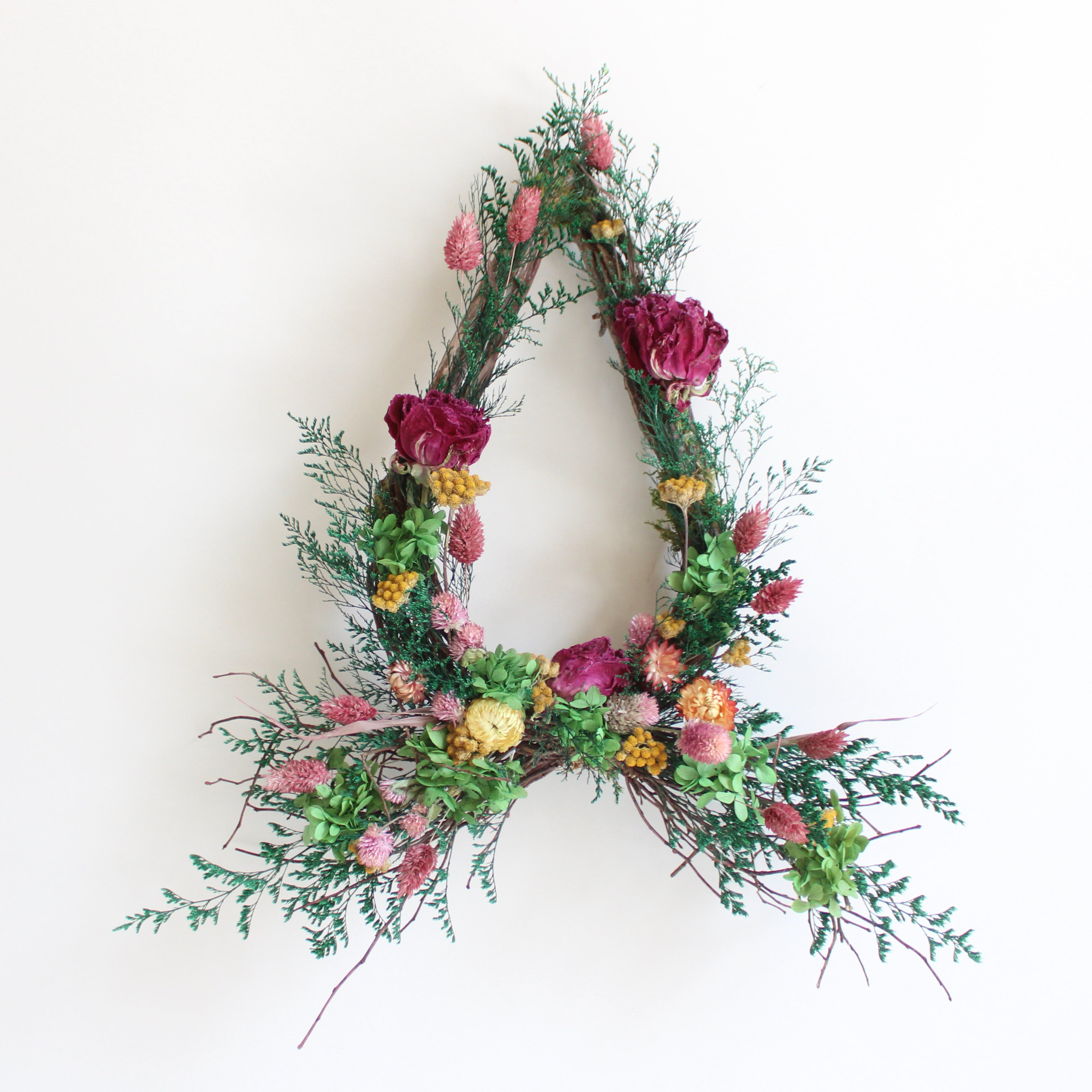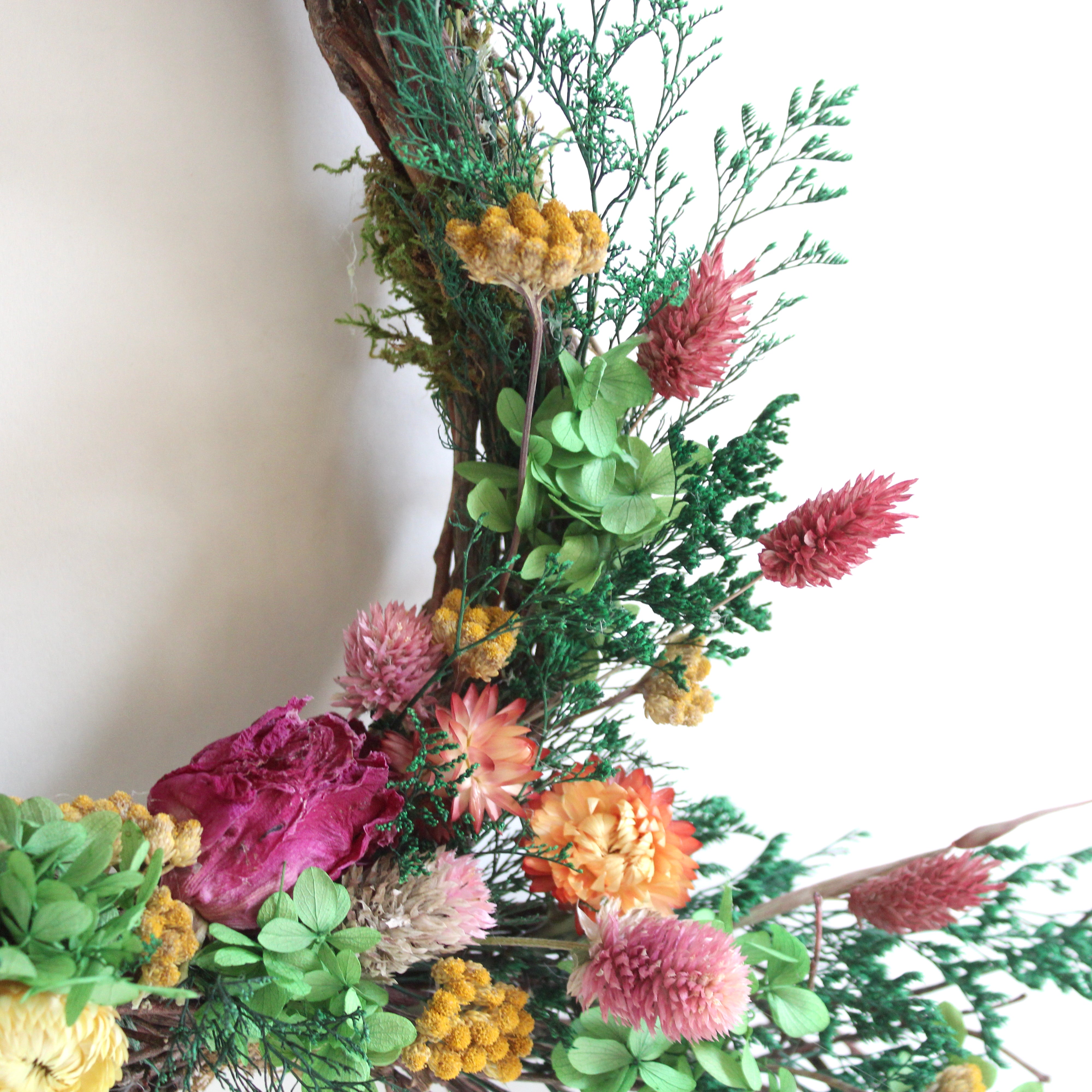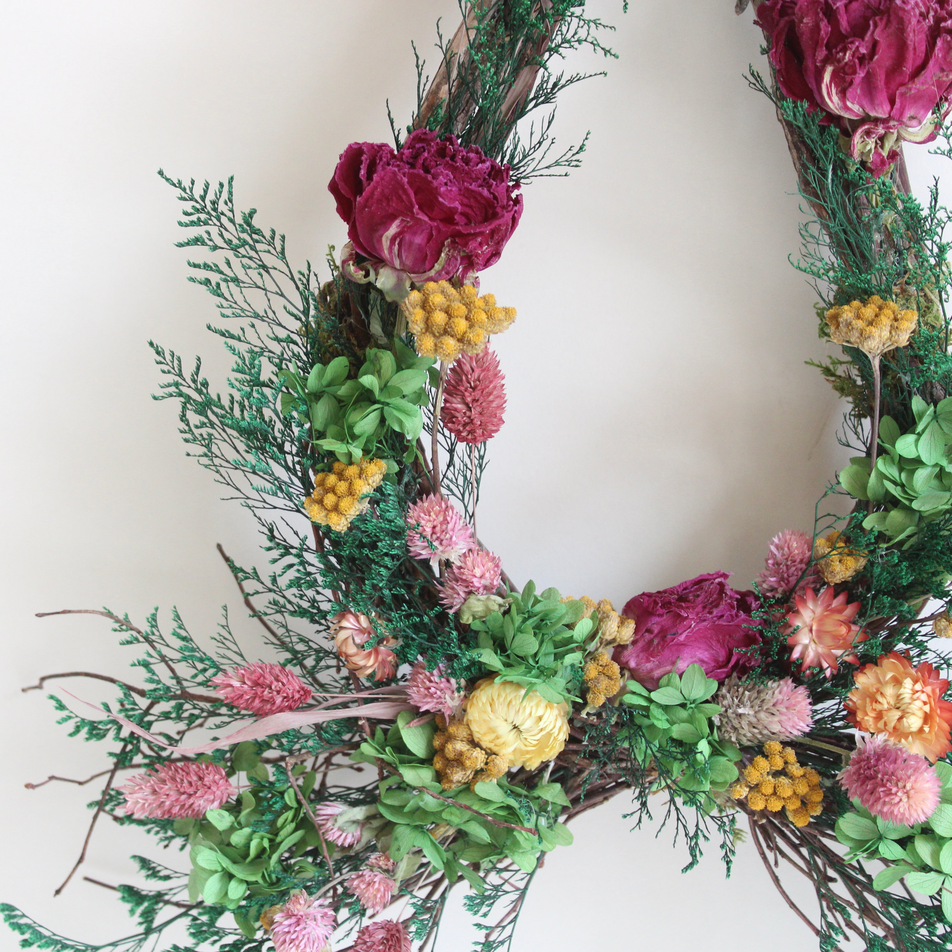Fairyland Wreath features peony, gomphrena, lonas, caspia, hydrangea, strawflower, and phalaris.