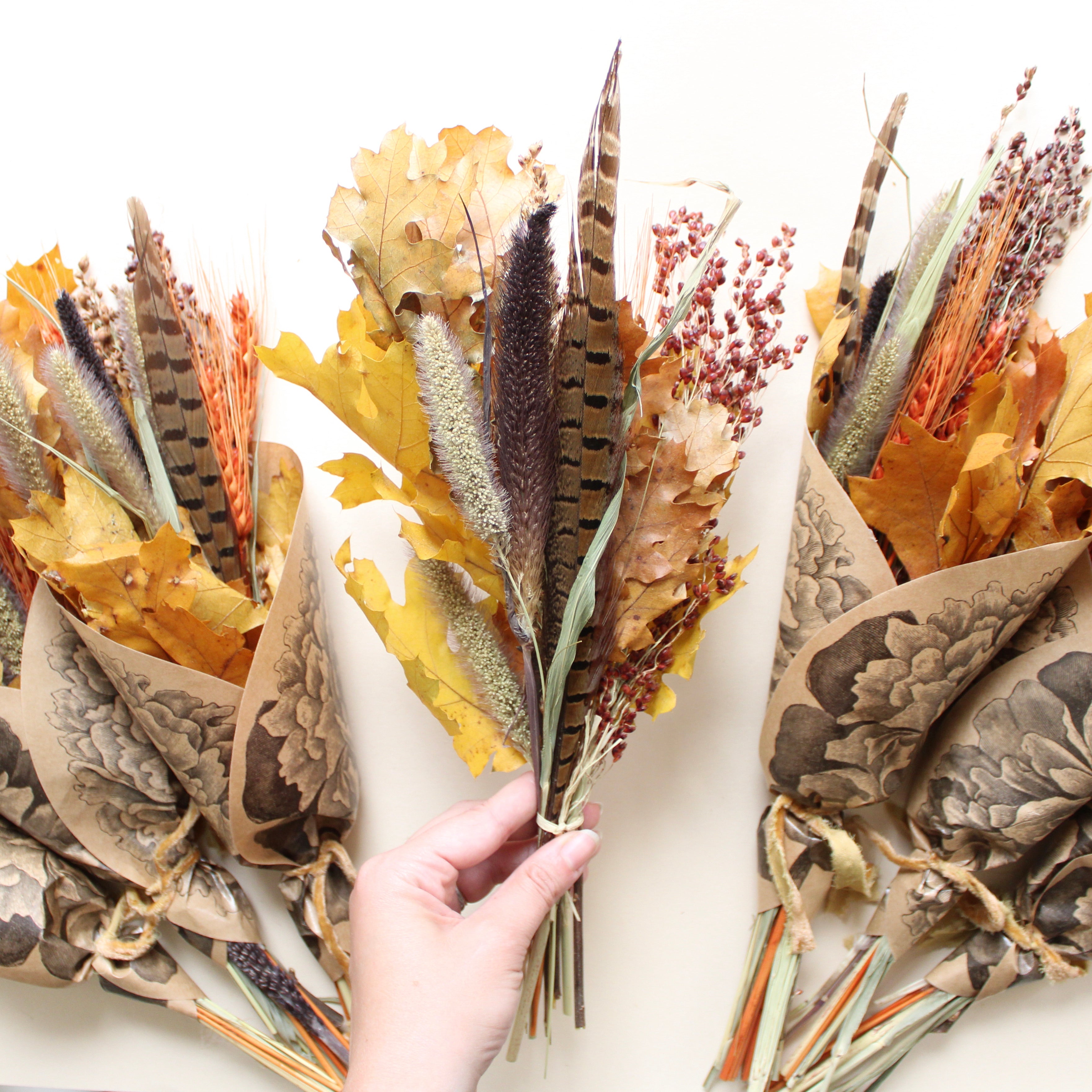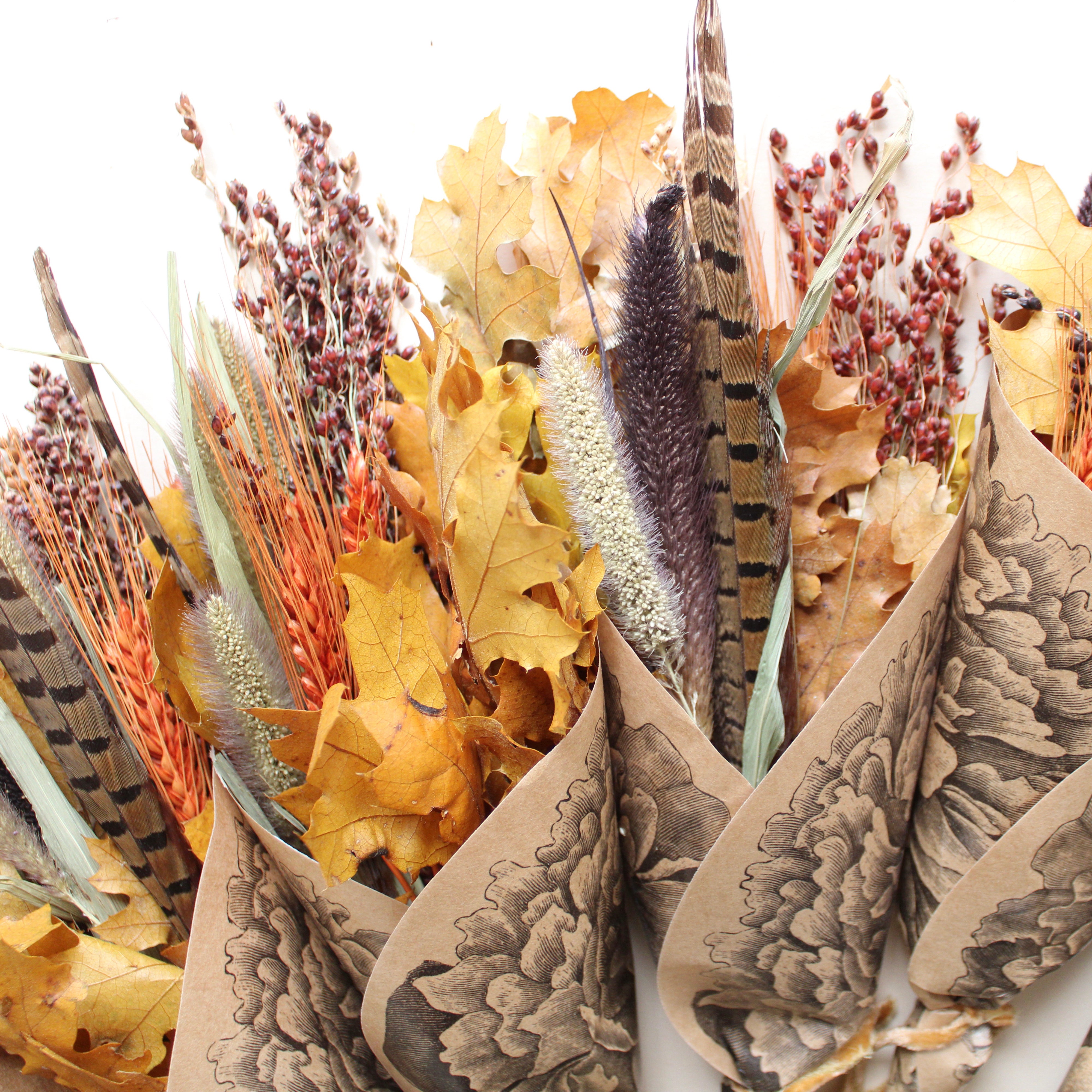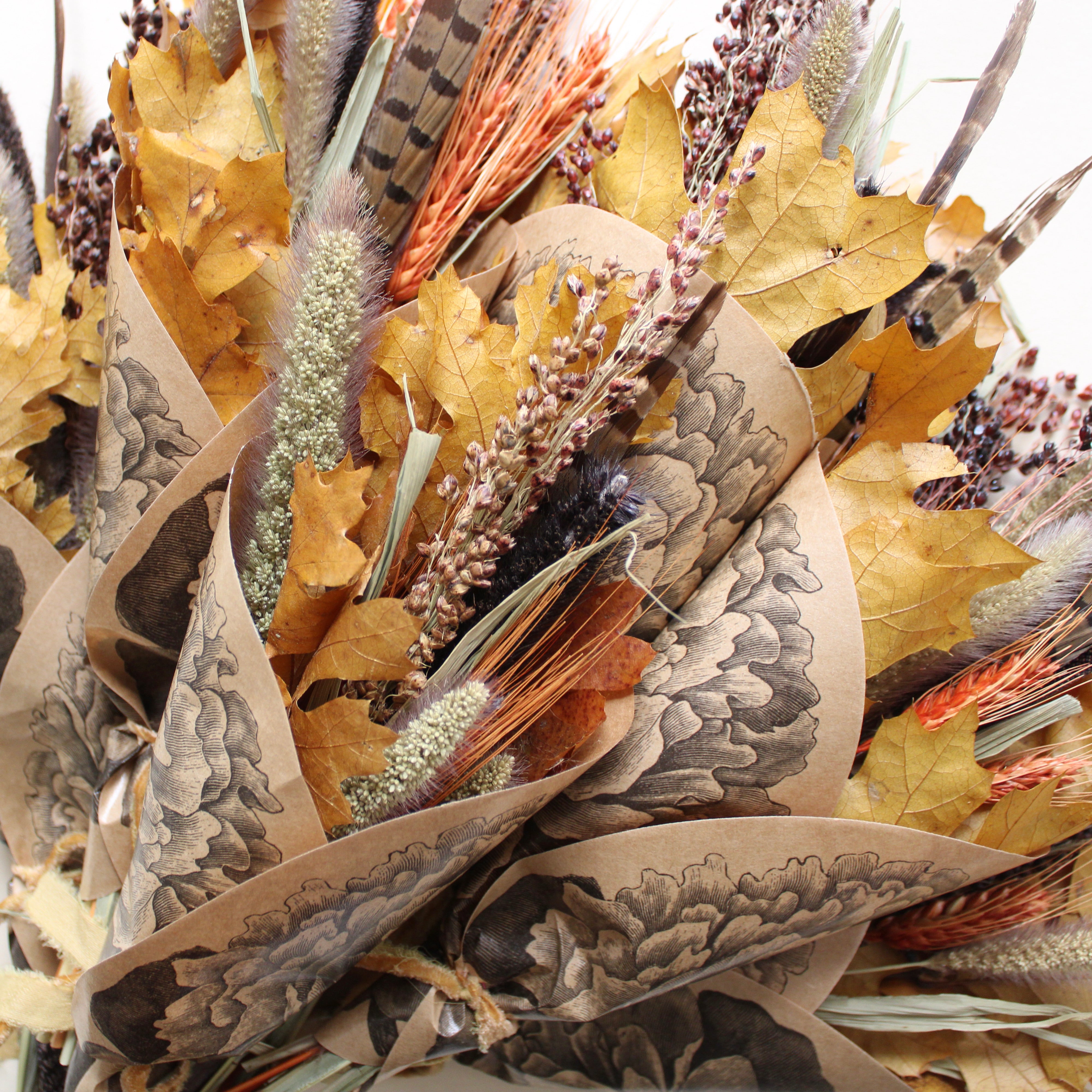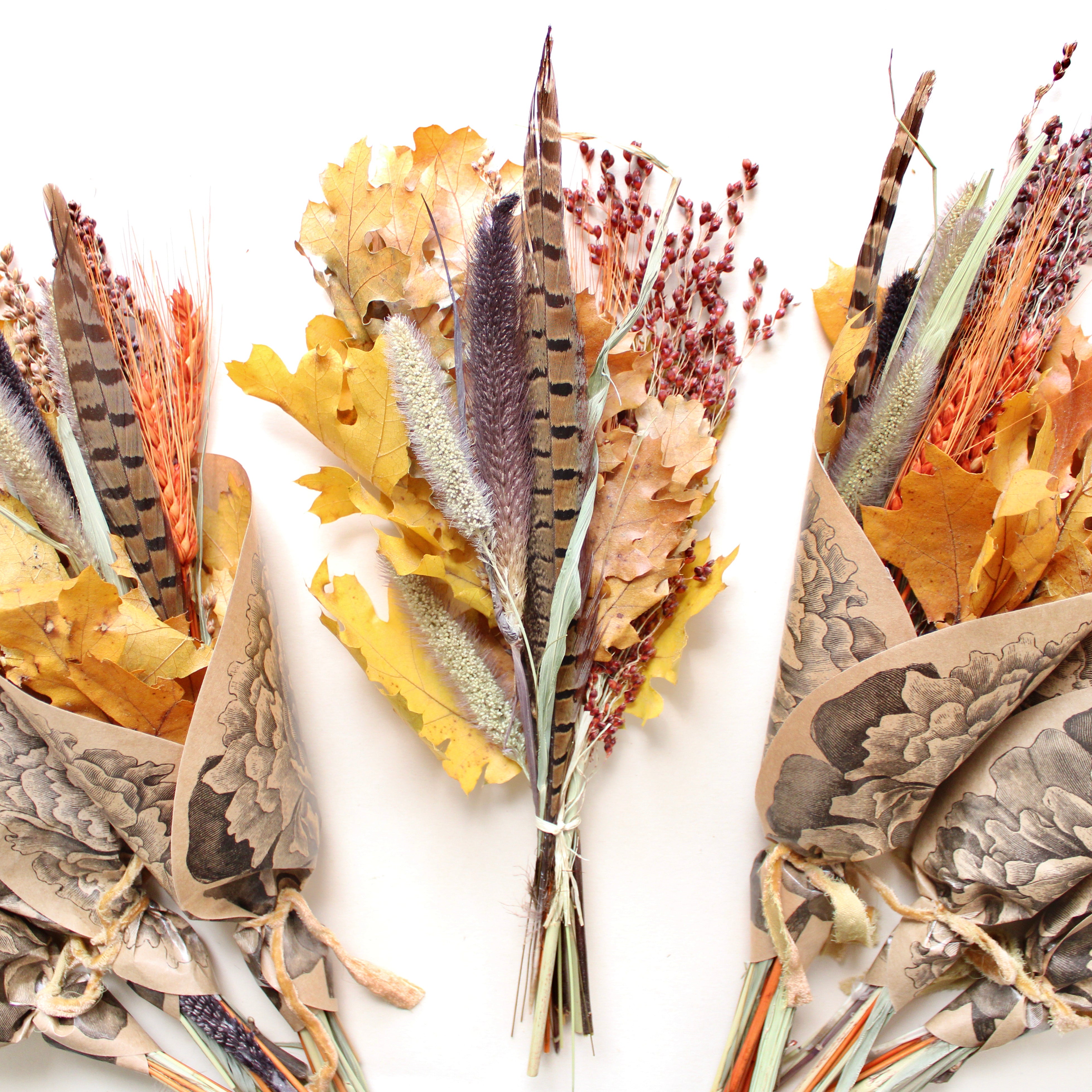 Foraged Fall Bouquet features broom corn, bearded wheat, millet, pheasant feather, and preserved oak leaves..