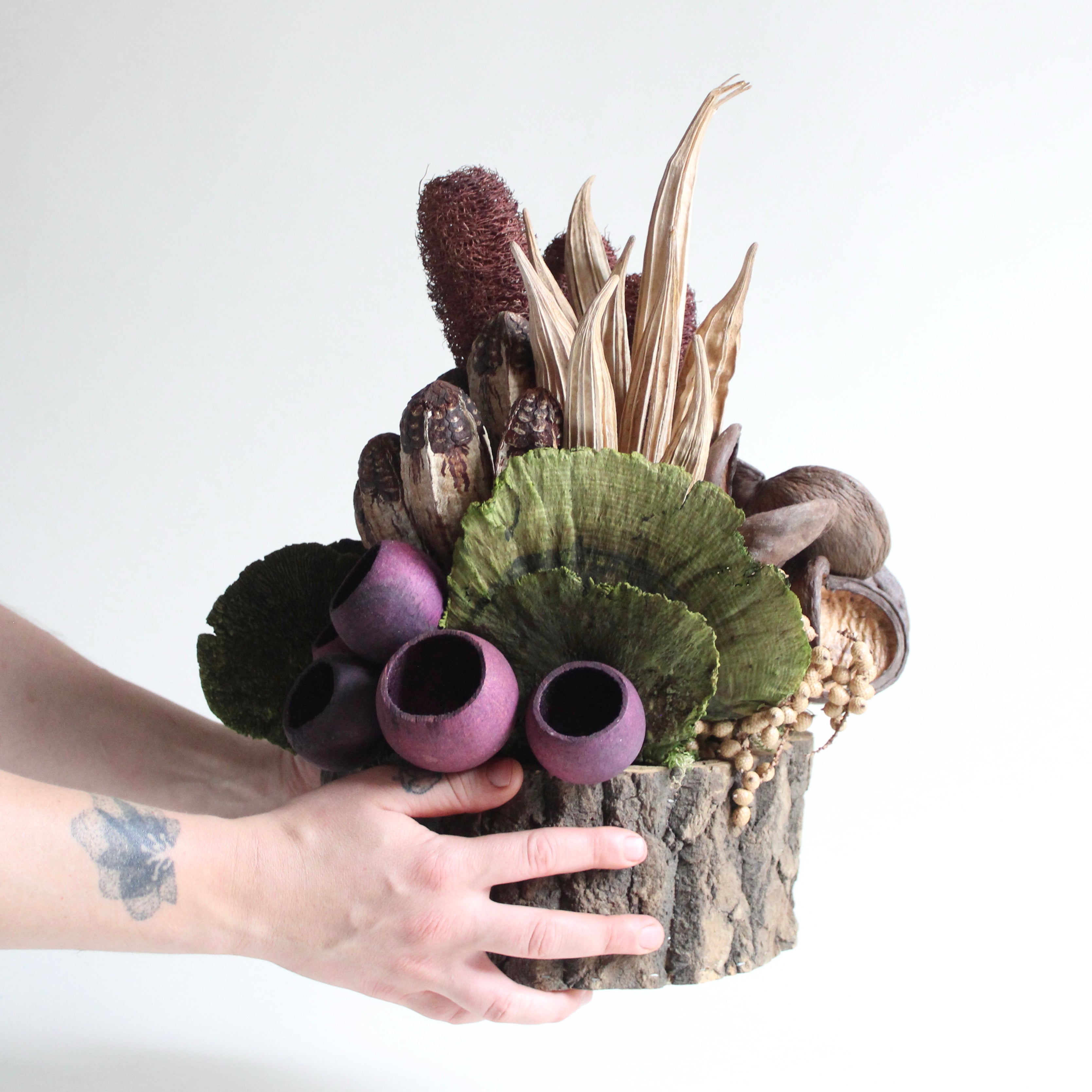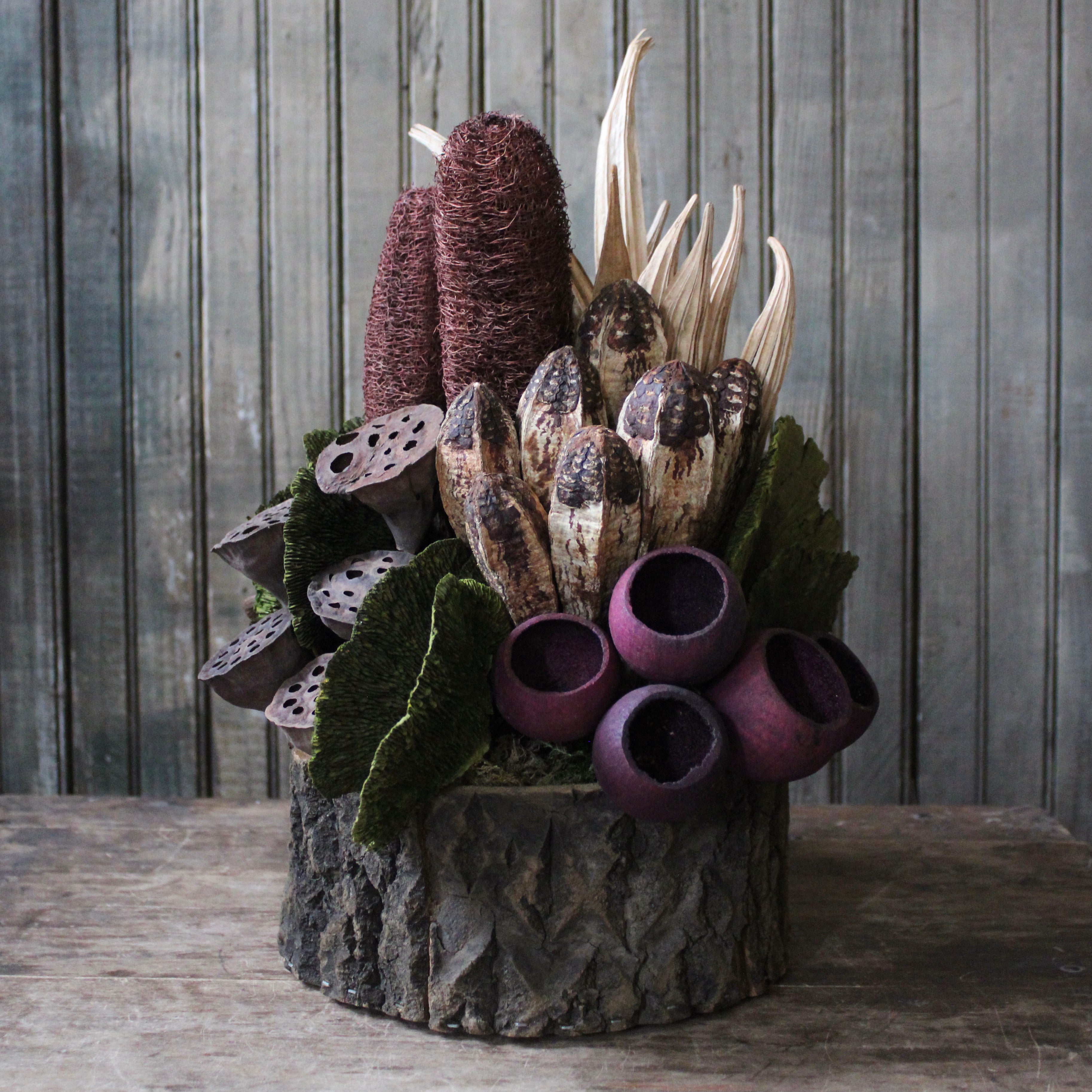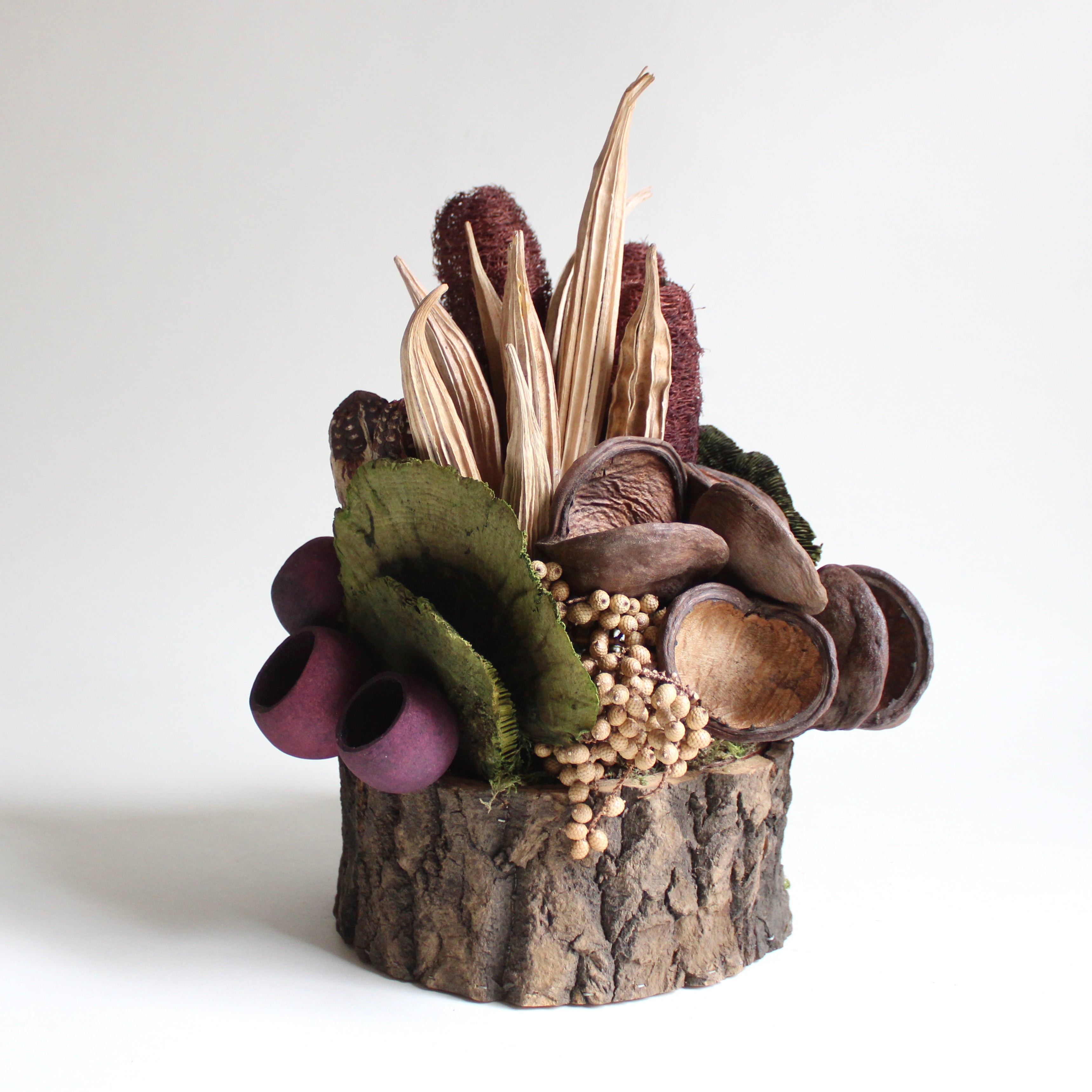 Forest Floor Arrangement features sponge mushroom, okra pod, lotus pod, badam nut, camellia berry, and luffa.