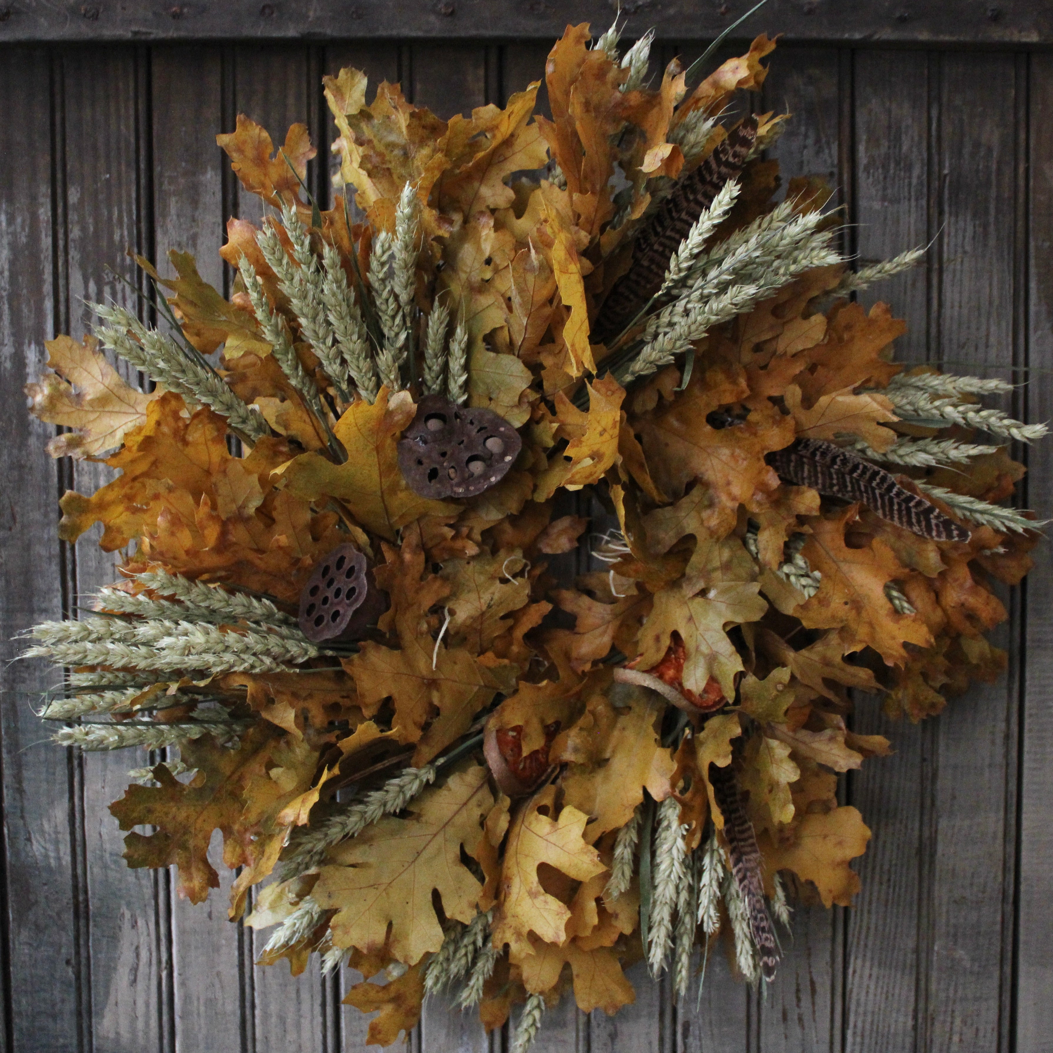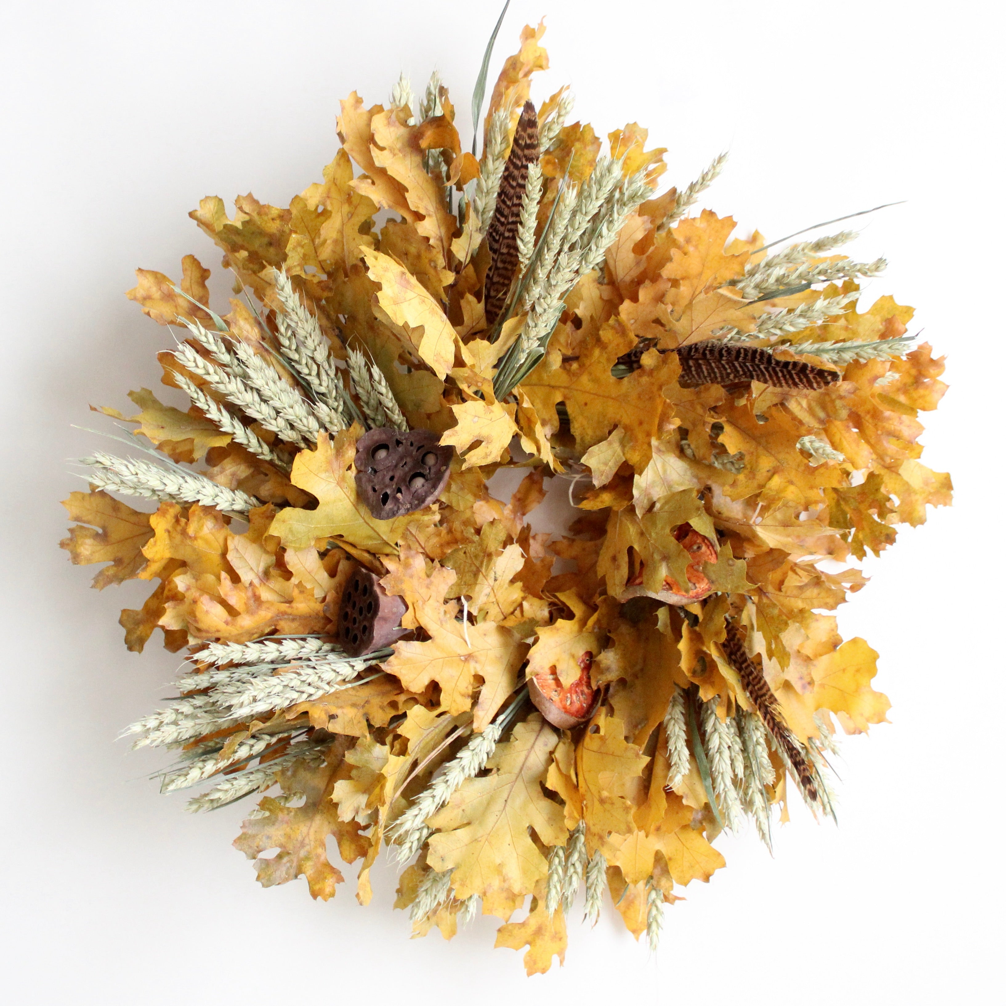 Harvest Wreath features oak leaves, rye wheat, pheasant feathers, quince slices, and lotus pods.