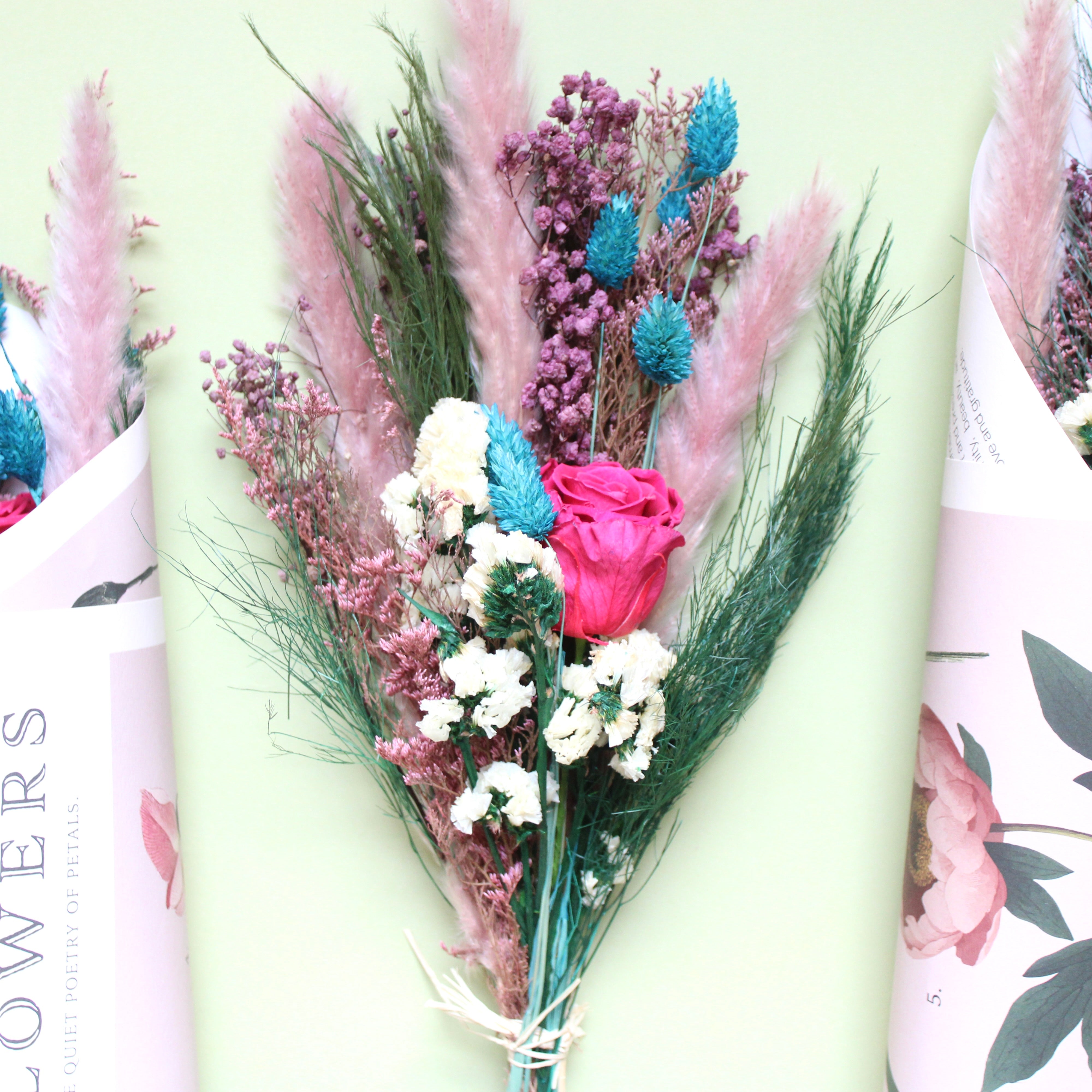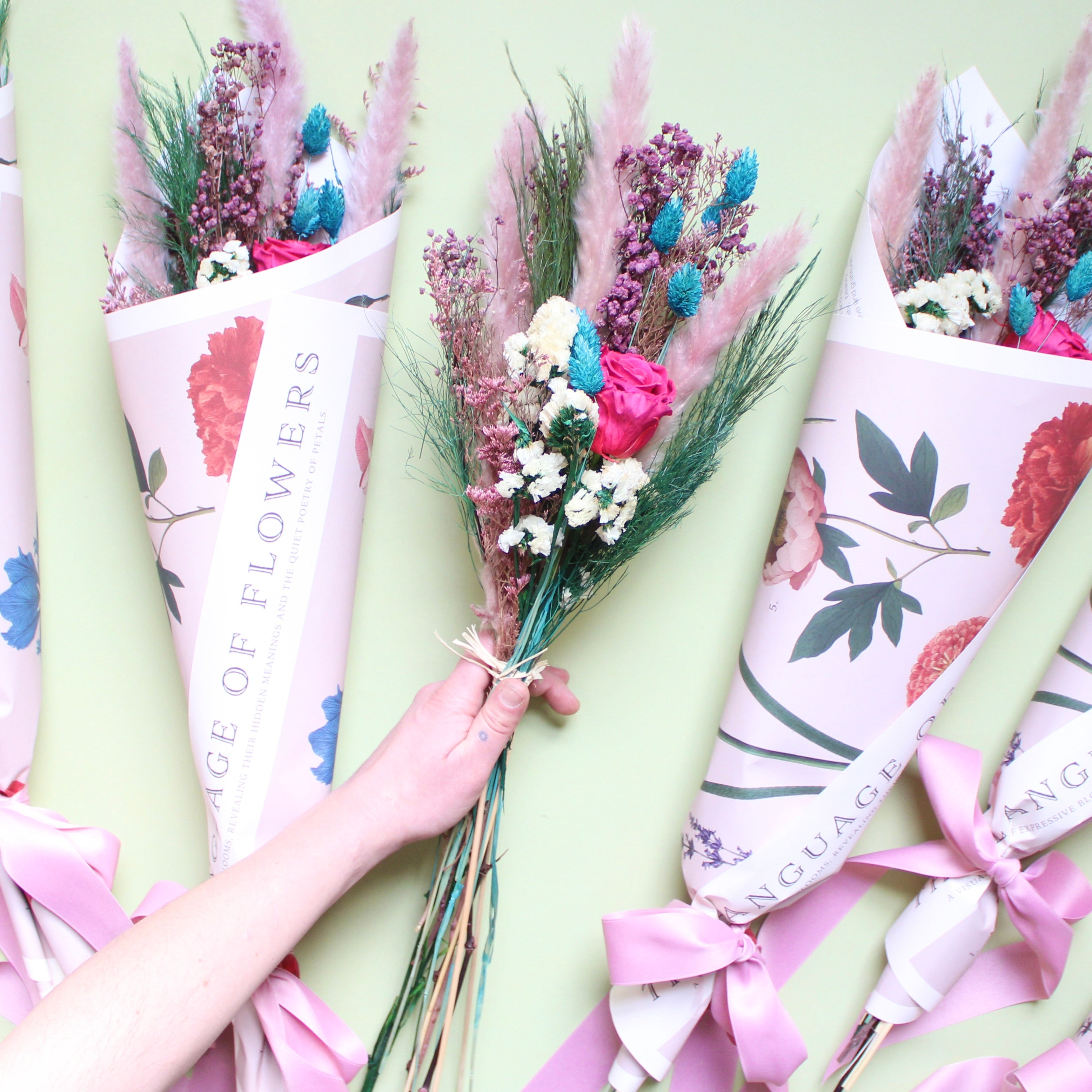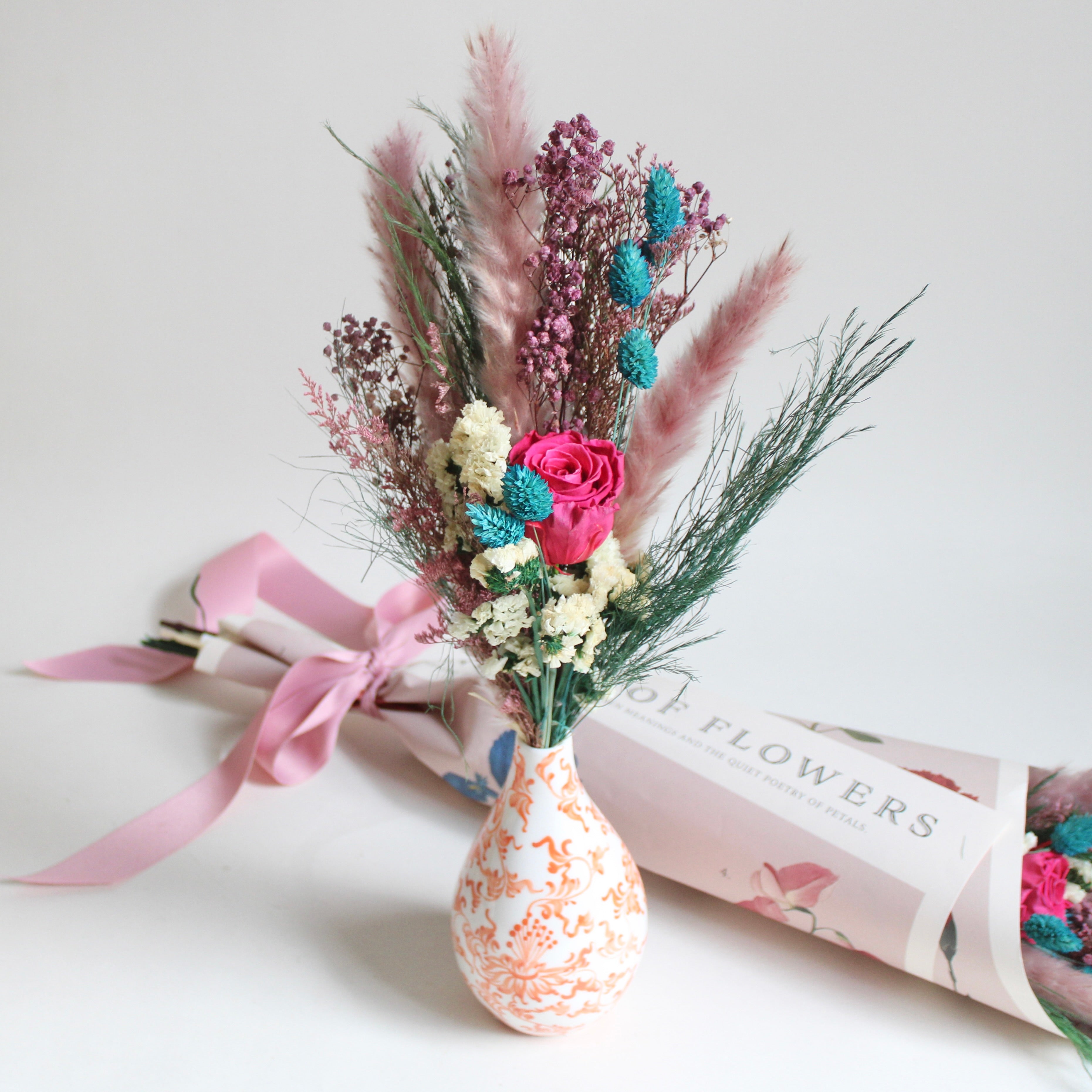 Language Of Flowers Bouquet features caspia, pampas grass, phalaris, statice, baby's breath, tree fern, and preserved roses.