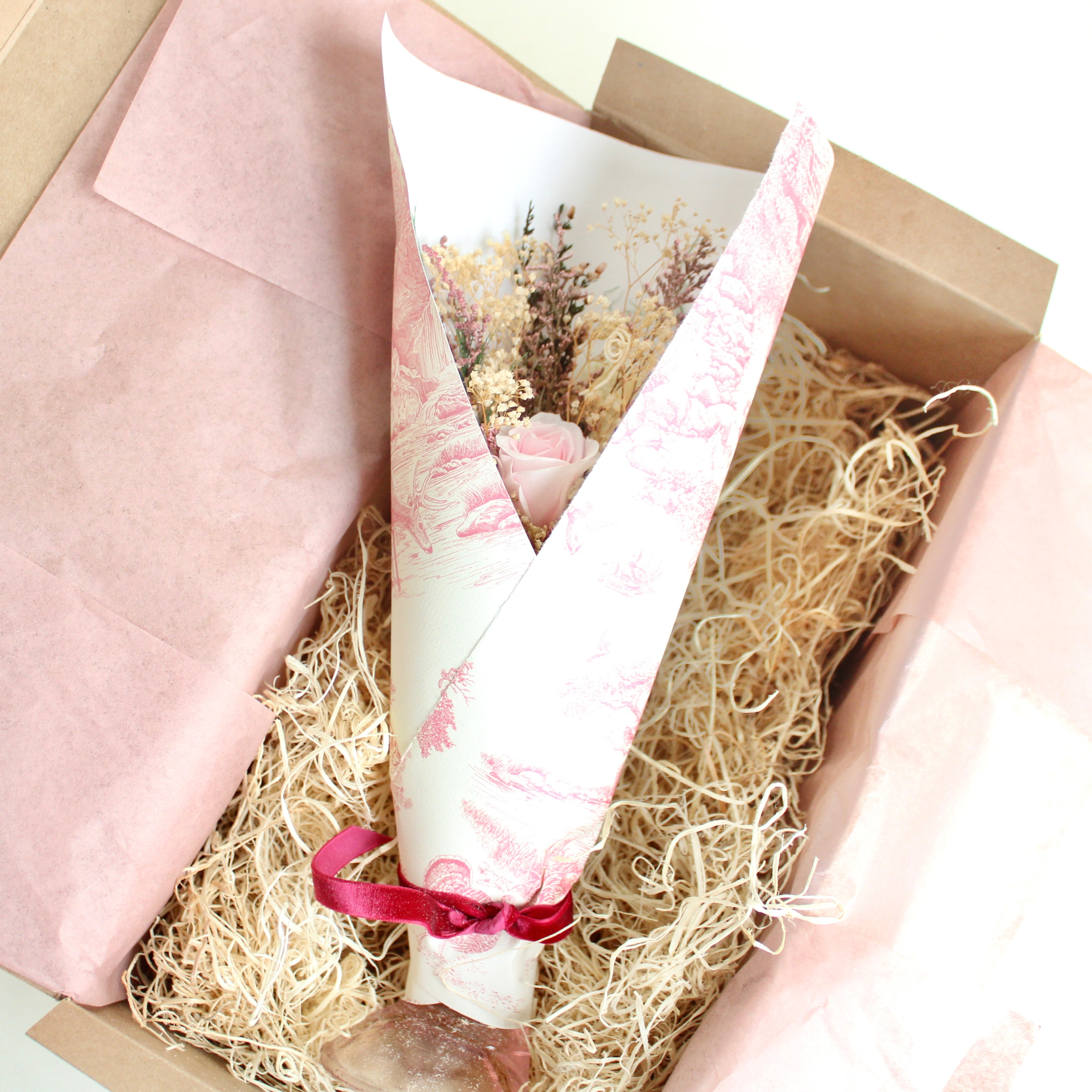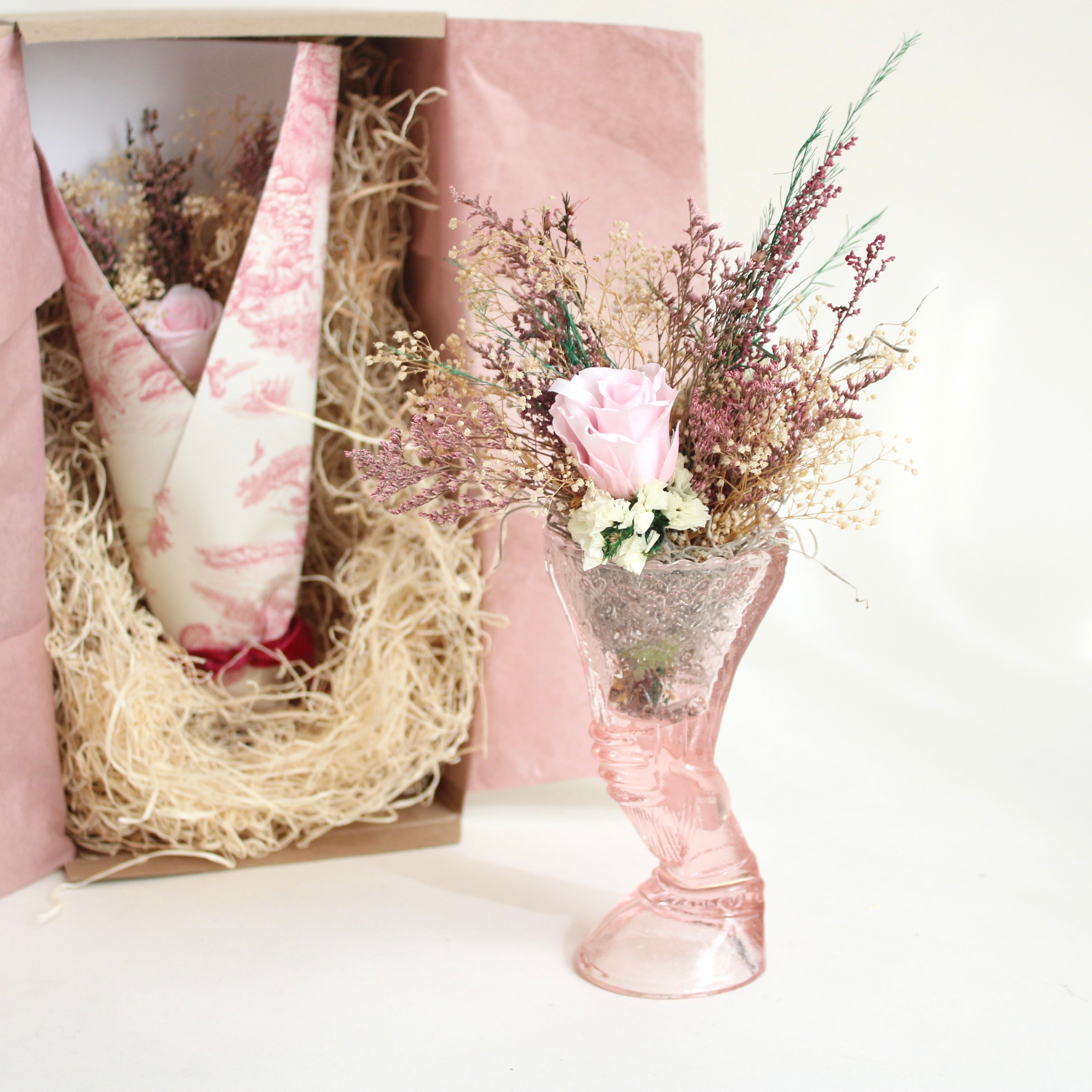 A Victorian-inspired hand vase, holding a sweet, dreamlike collection of blooms. Thoughtfully packaged and ready for gifting—an arrangement made for meaningful, memory-making moments.