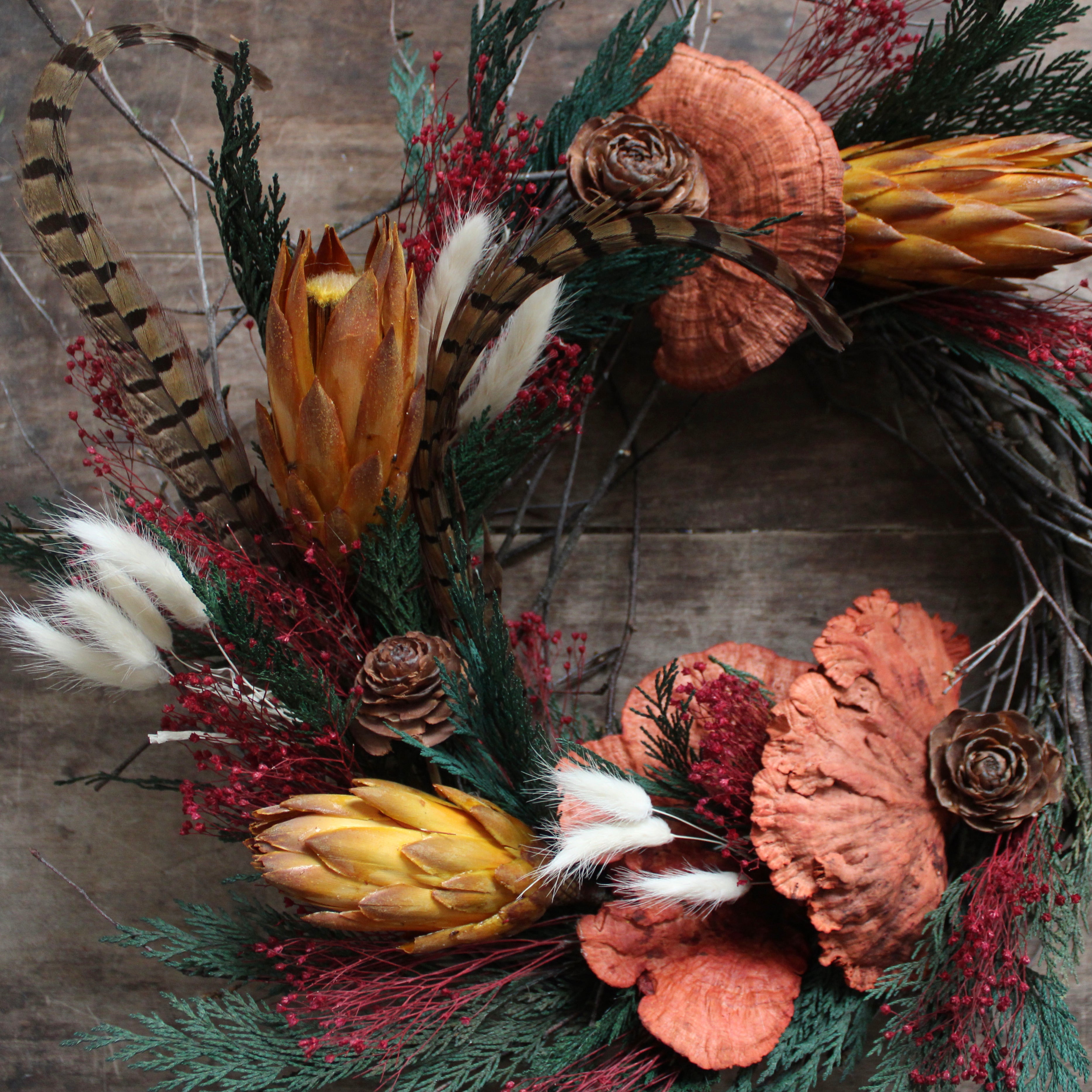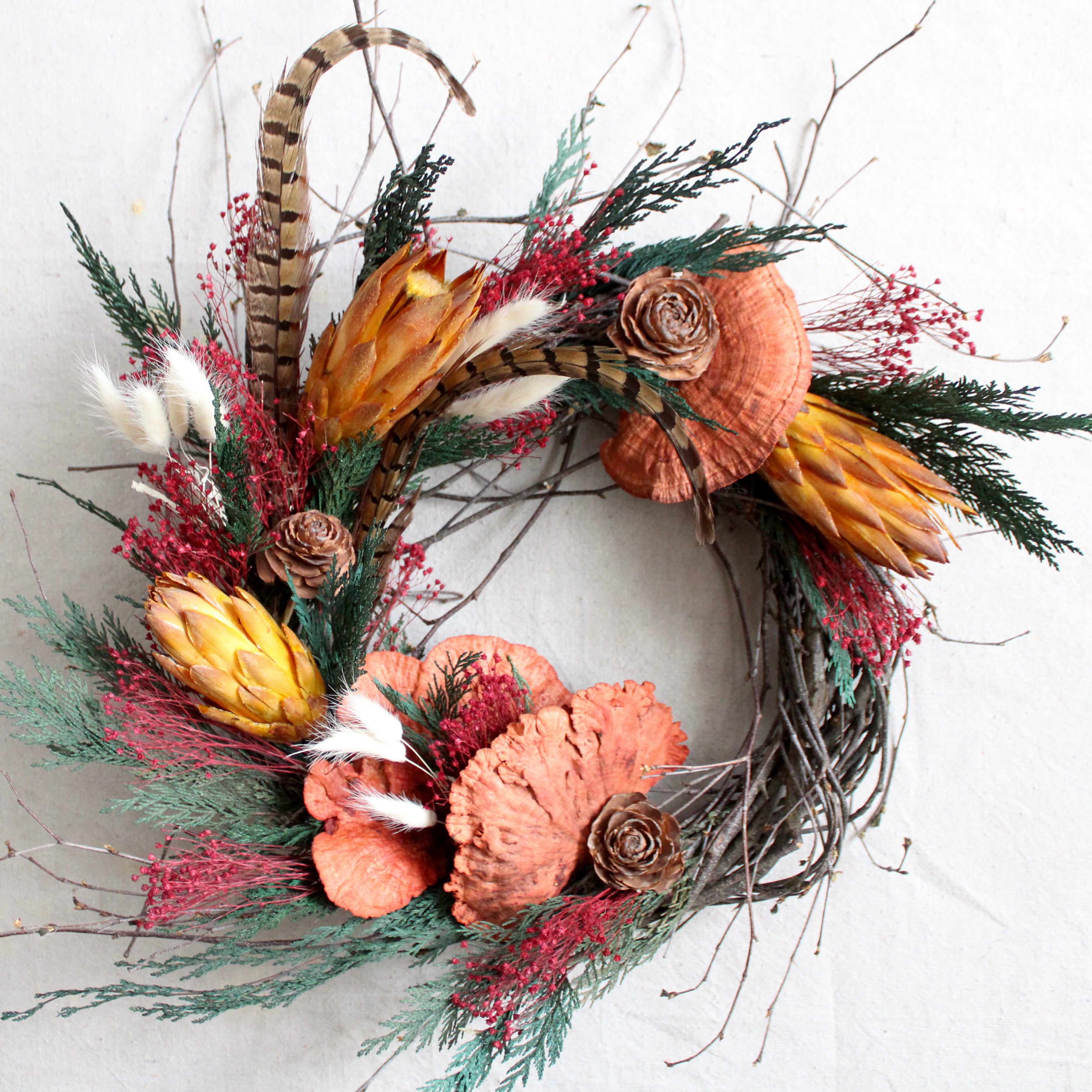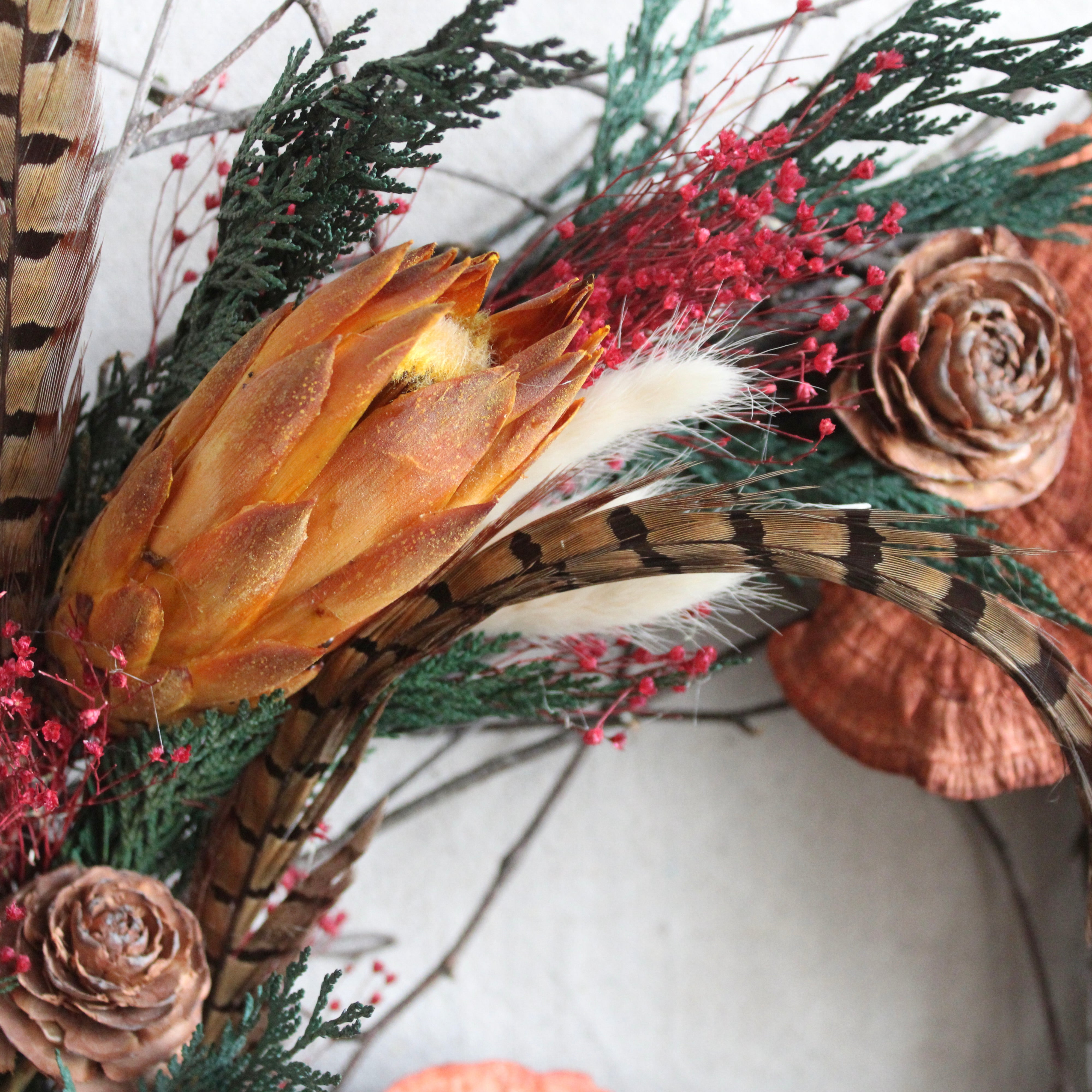 Tippi Wreath features sponge mushroom, protea, cedar rose, cedar, bunny tails, broom bloom, and pheasant feathers.