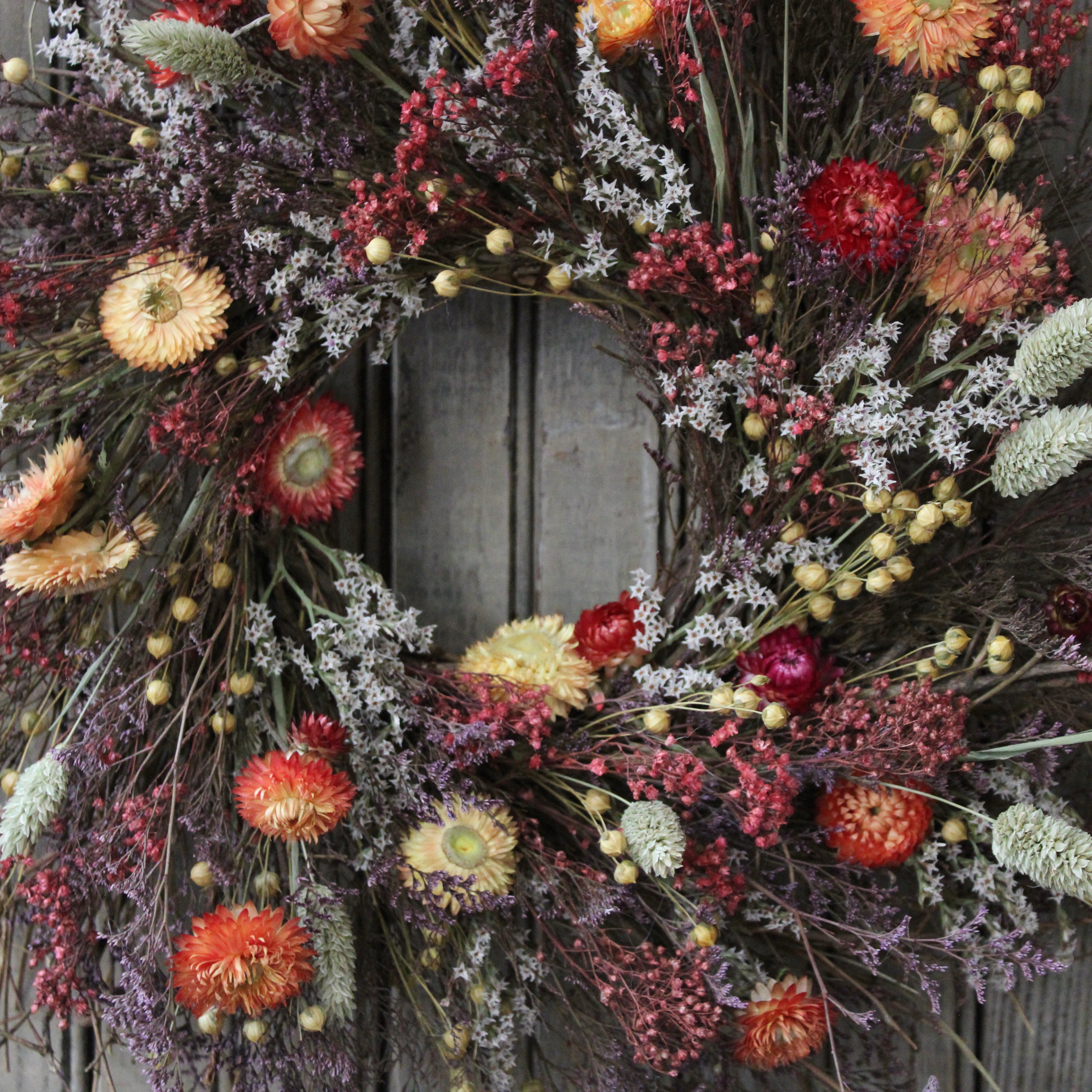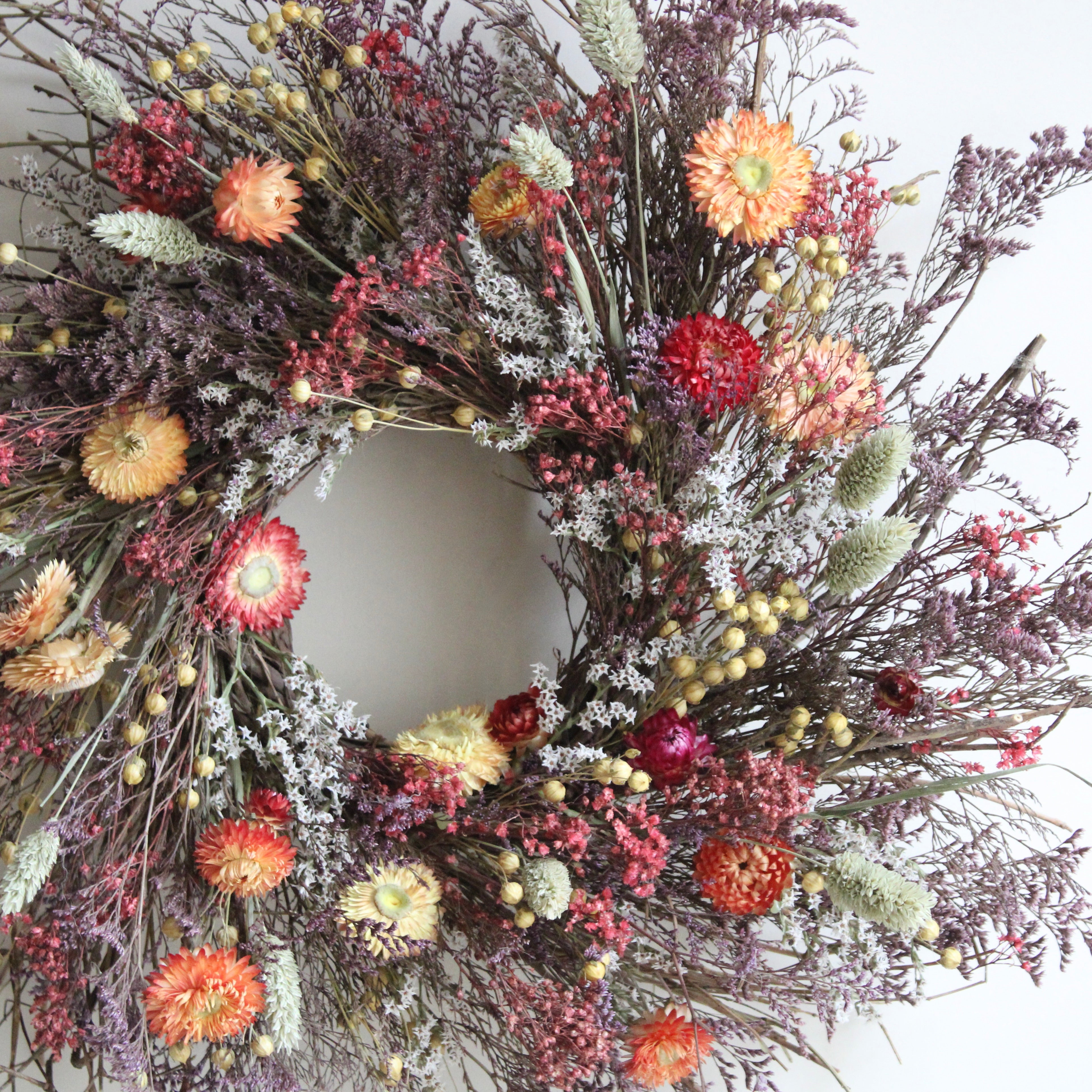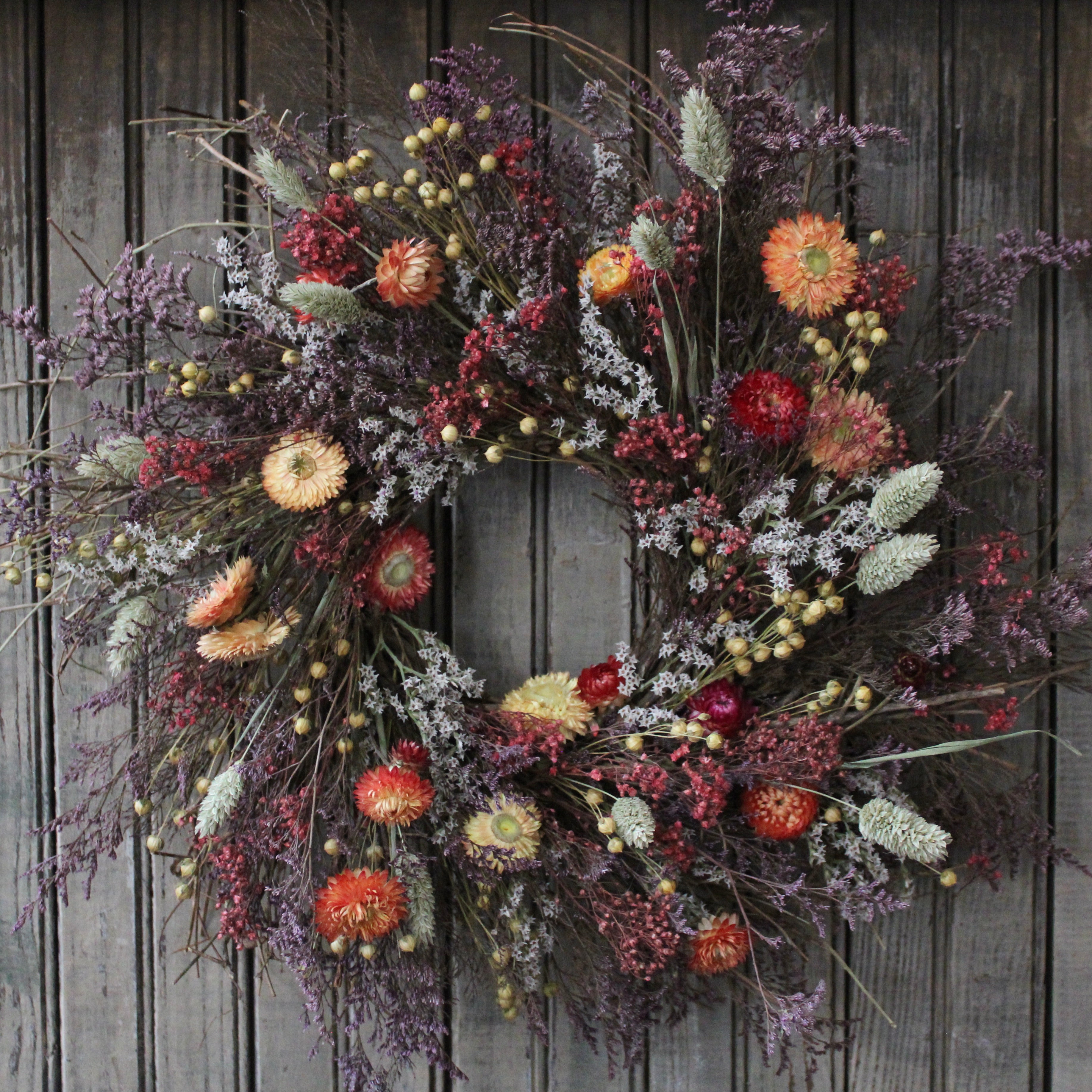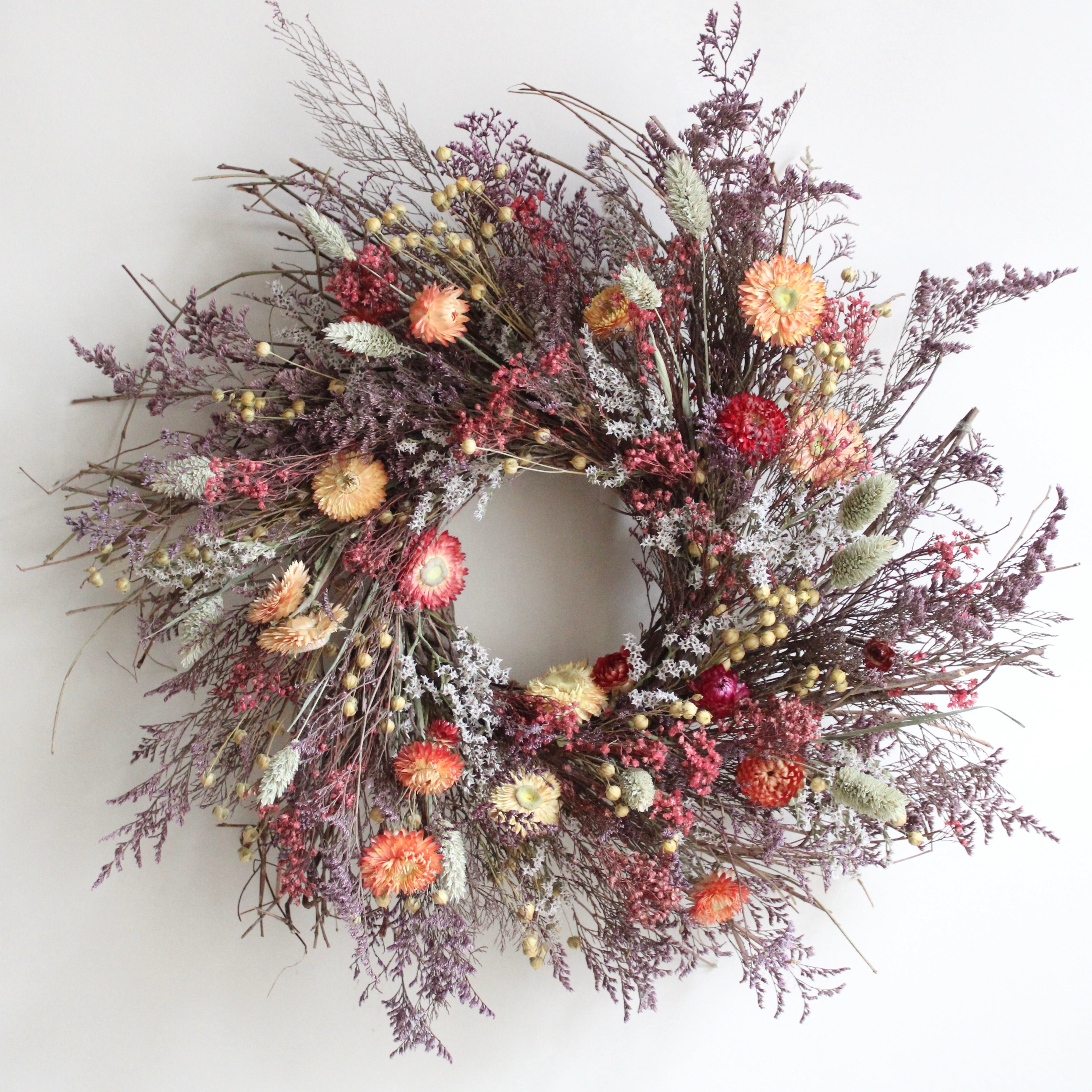 Wildflower Wreath features strawflower, caspia, phalaris, broom bloom, flax, and statice.