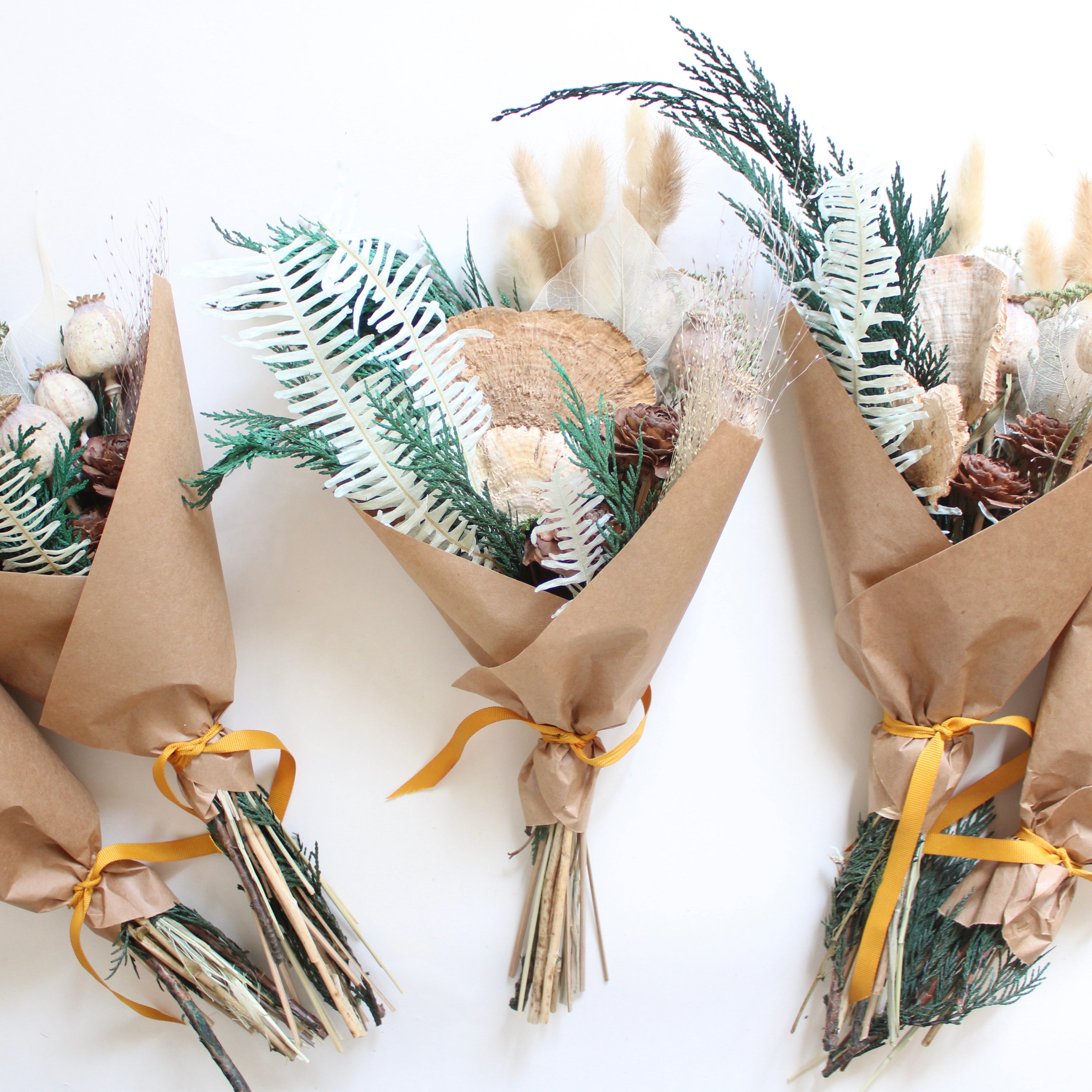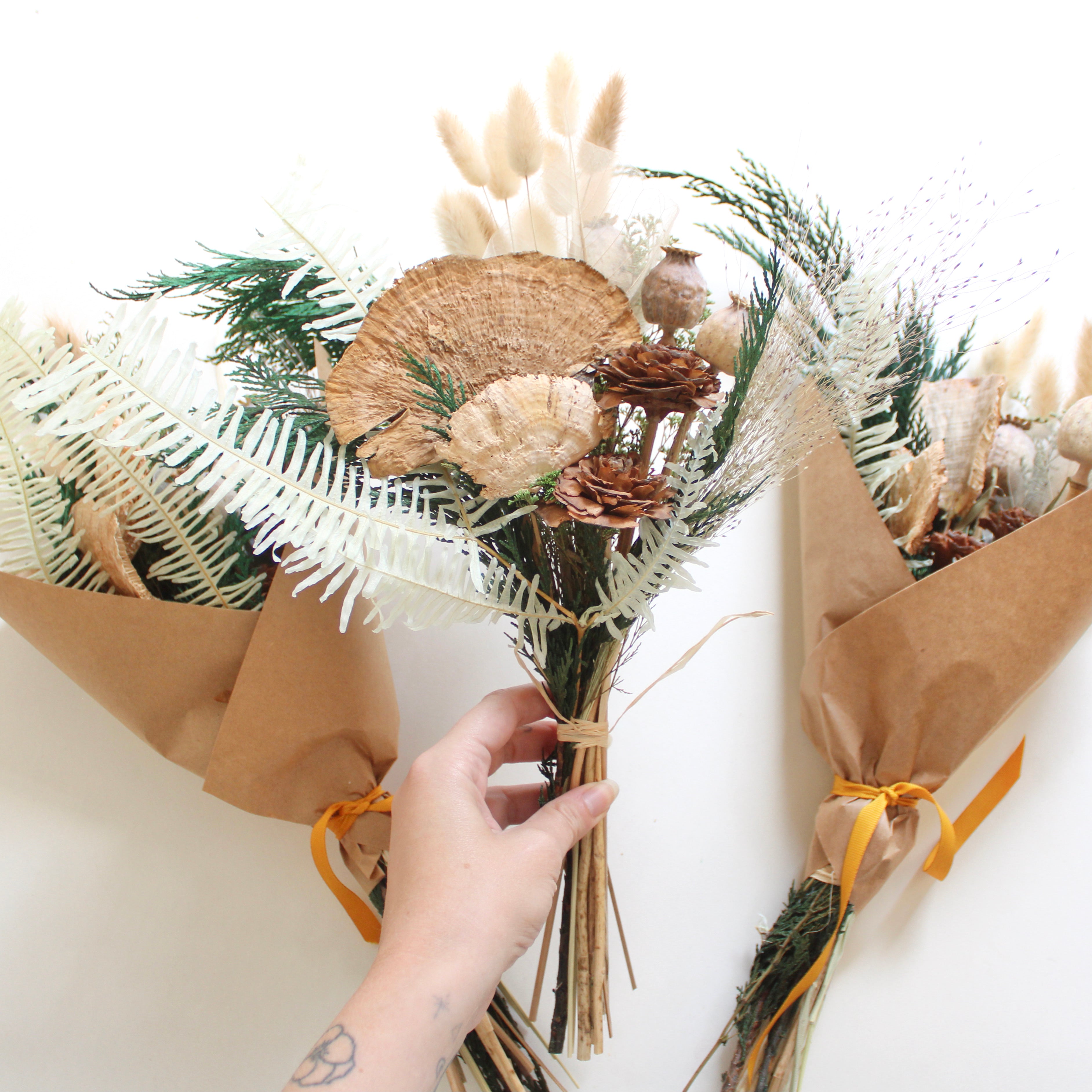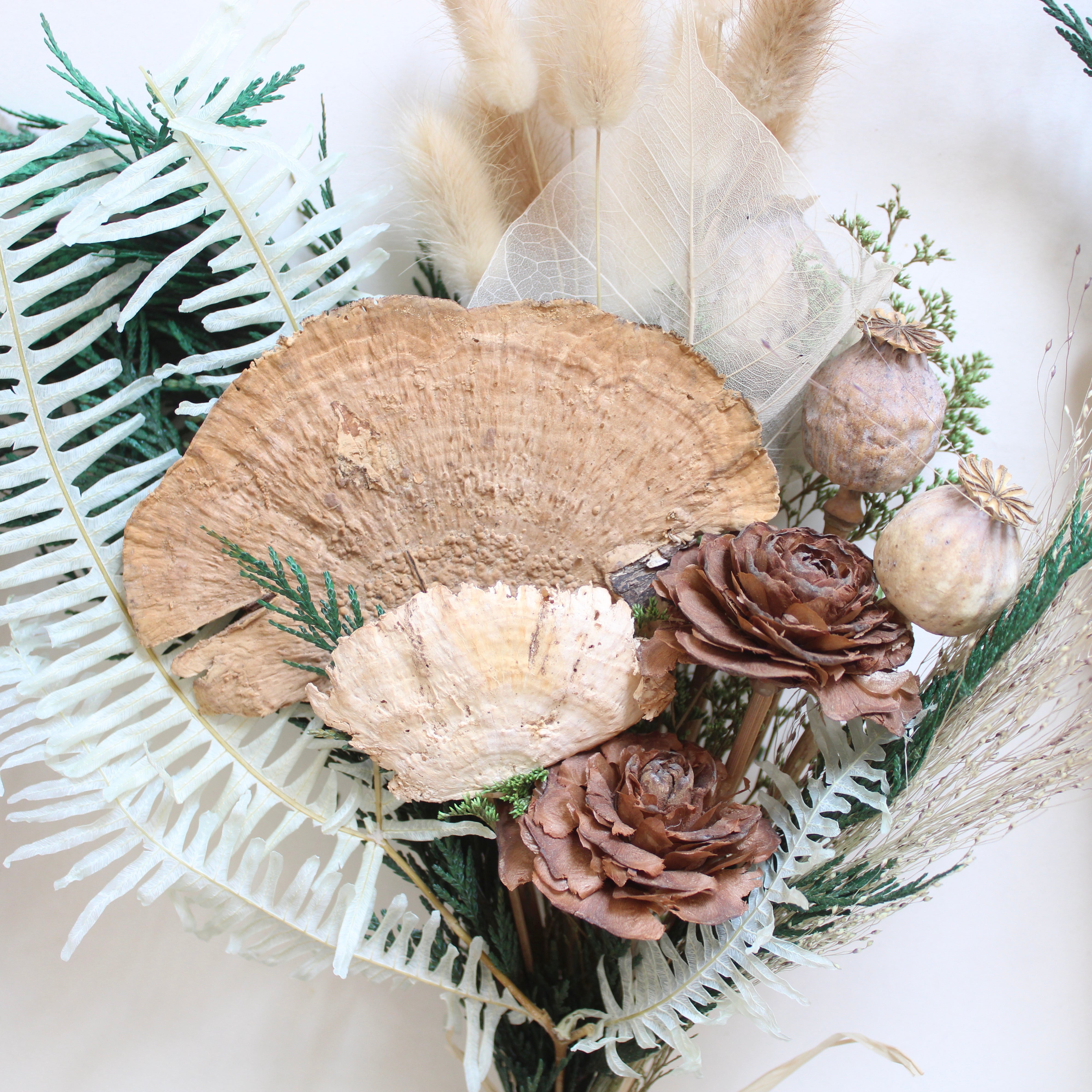 Winter Woodland Bouquet features preserved cedar, sponge mushroom, cedar cone, bunny tail, skeleton leaf, preserved caspia, explosion grass, and poppies.