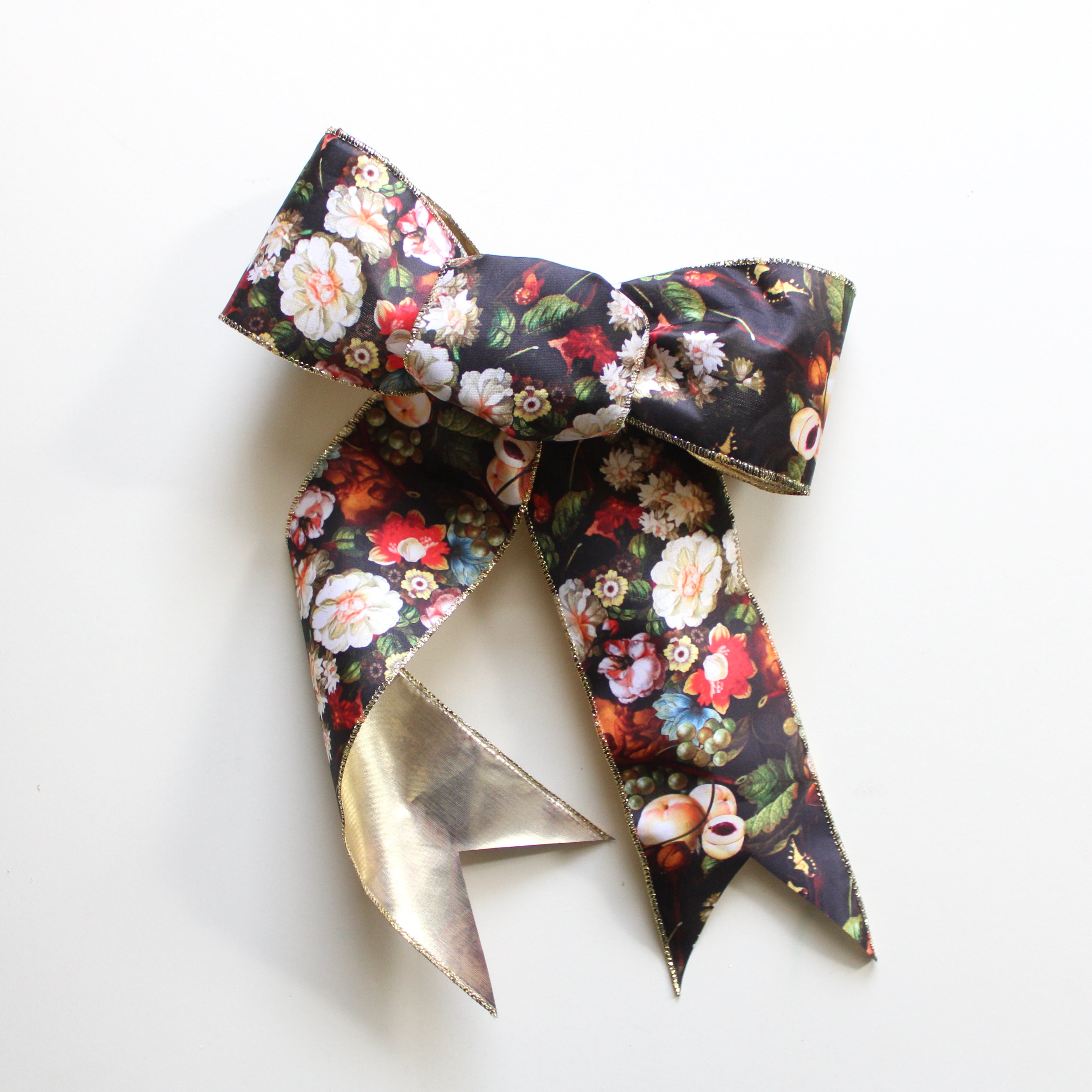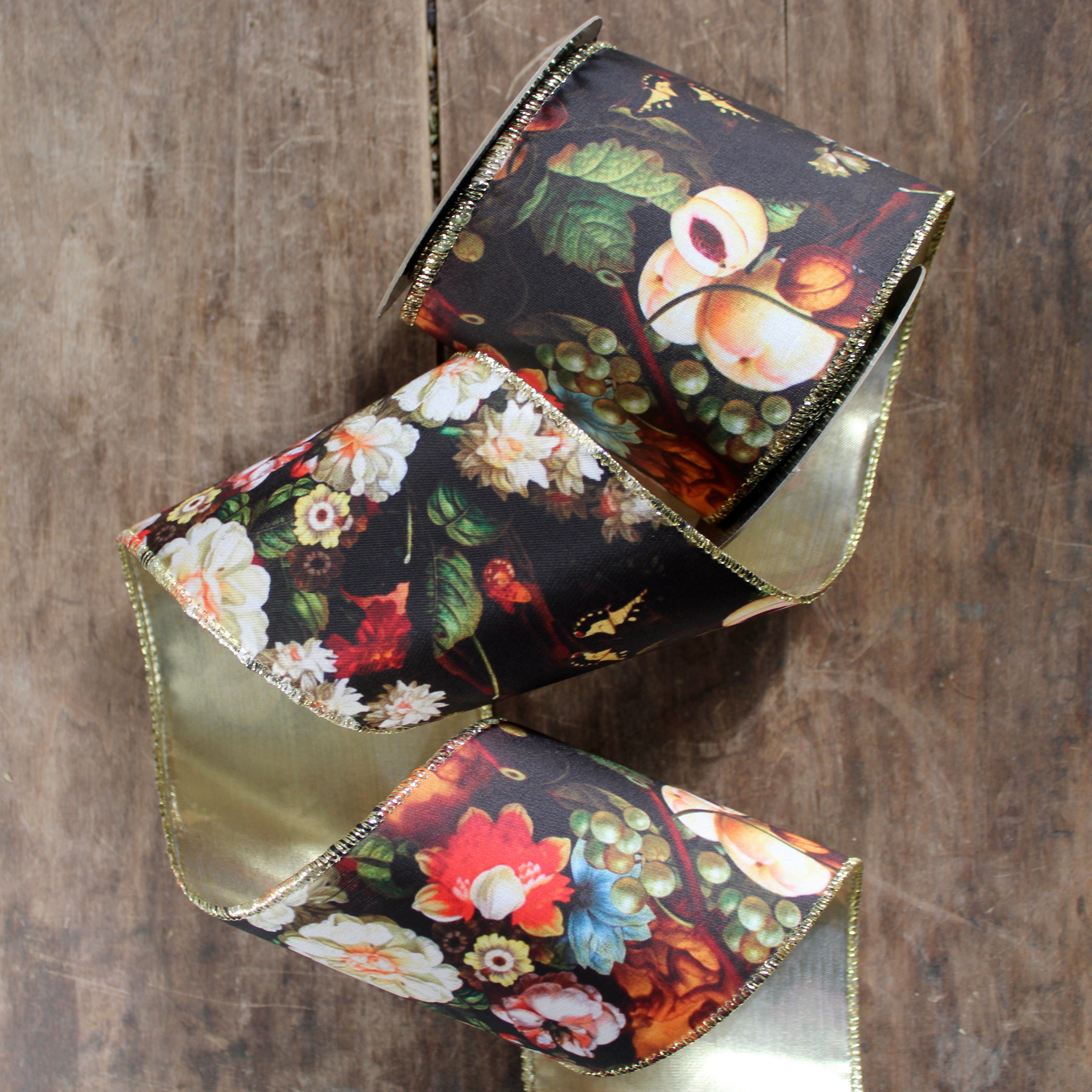 Beautiful, luxurious ribbon with the most delightful Dutch masters design. Fruits, flowers, and butterflies adorn the wide ribbon, a wonderful finishing touch to a wreath, bouquet, or gift.