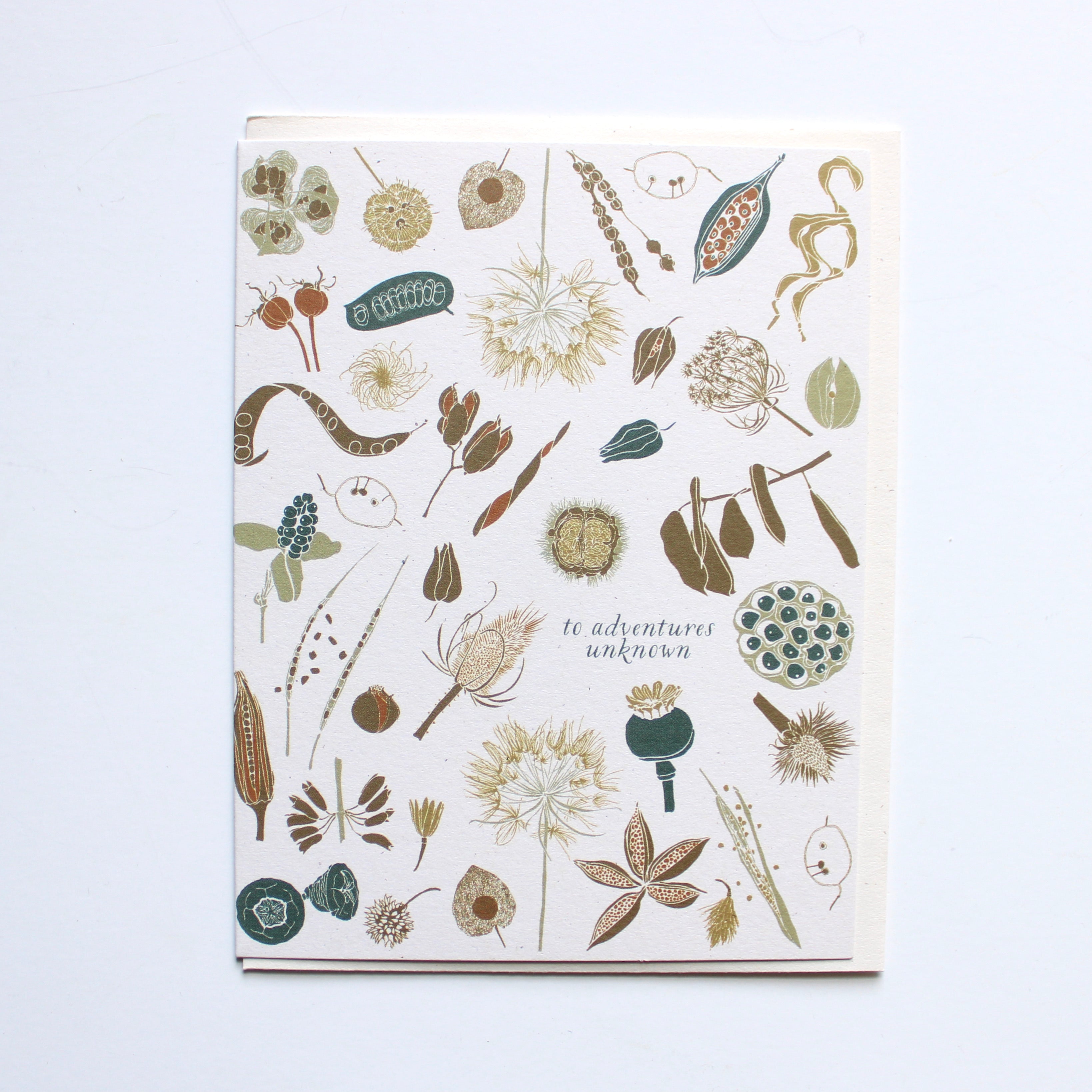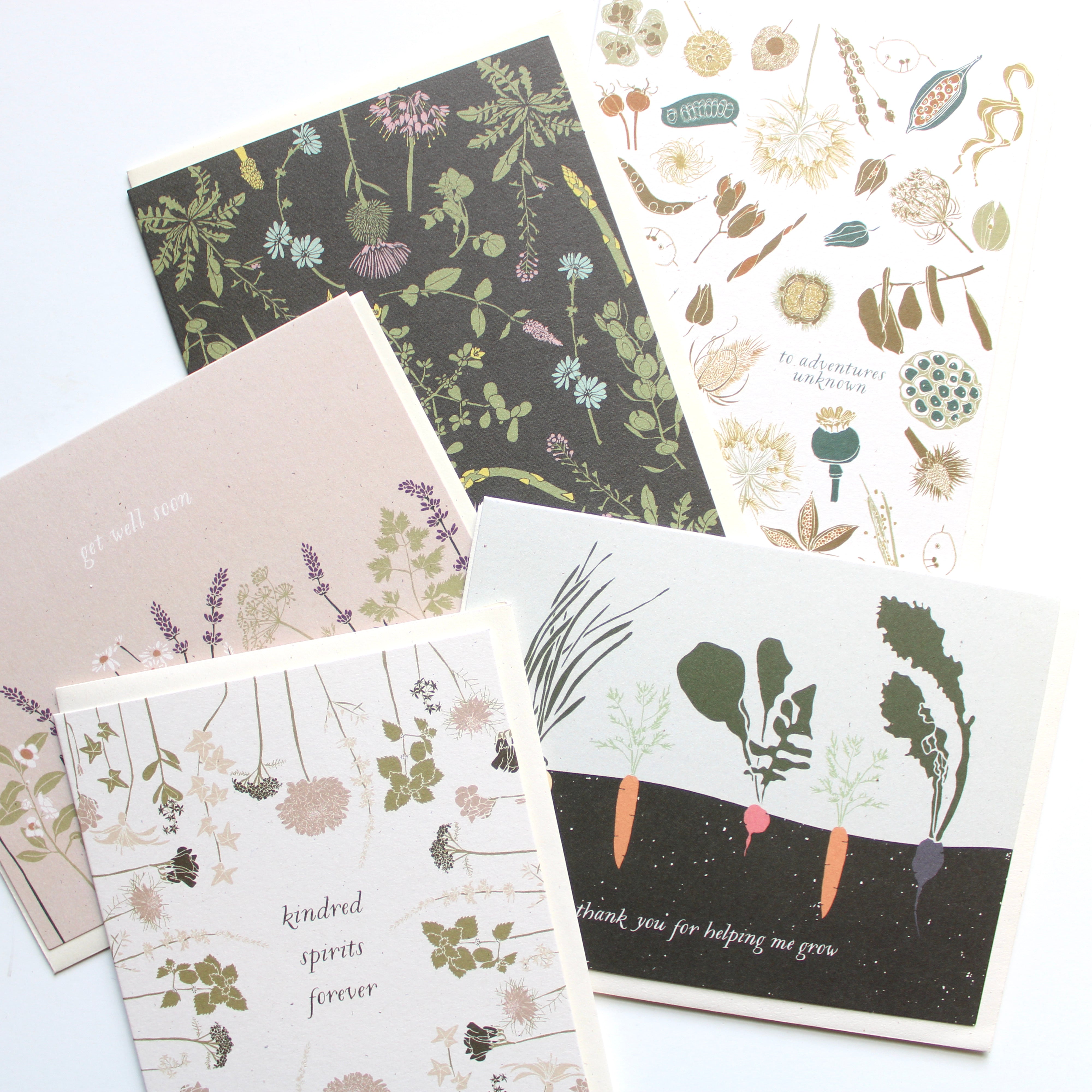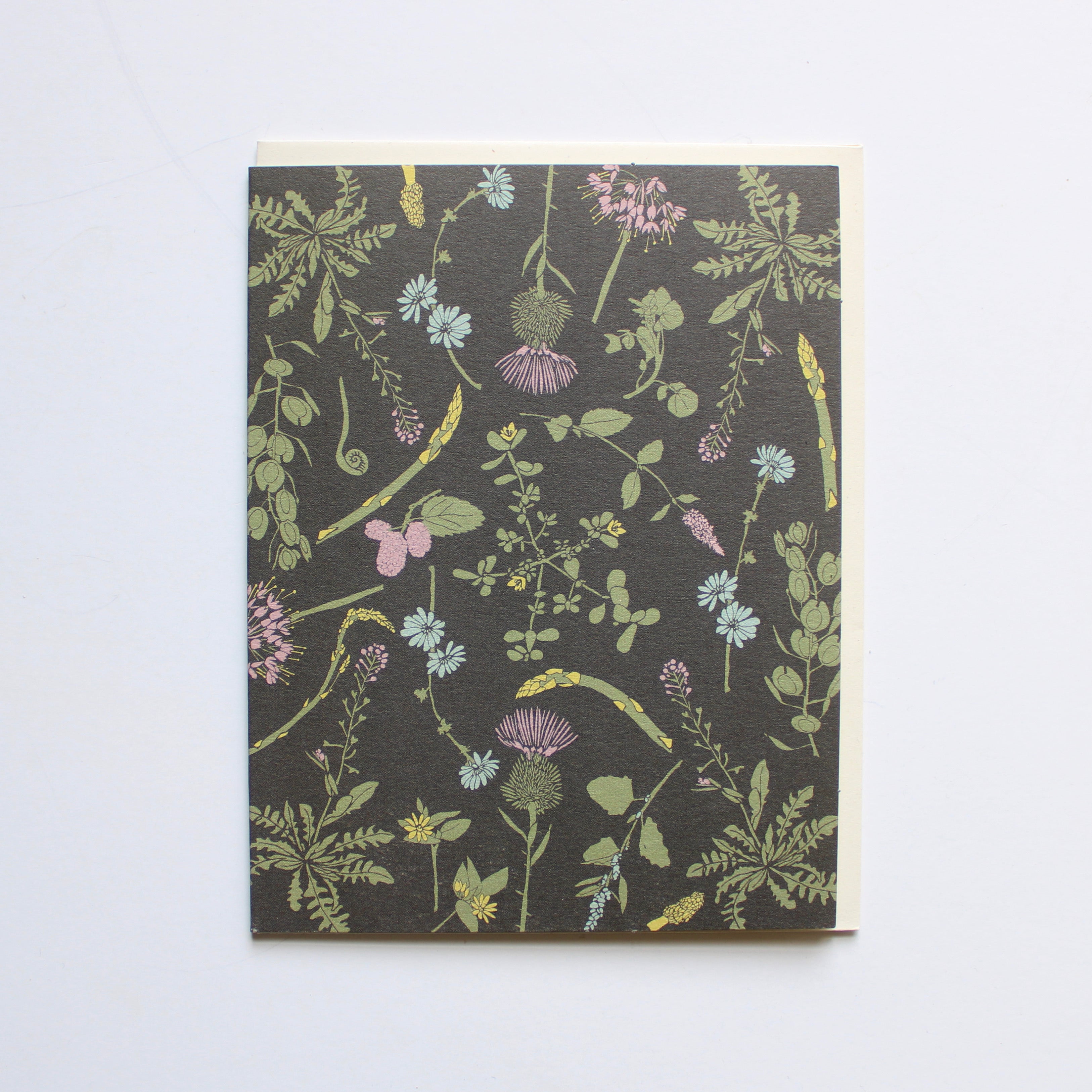 - Size : A2 / 4.25” x 5.5” - Details : blank inside + cream envelopes, speckled 100% recycled, card stock - Packaged : with envelope in clear sleeve, ready to display - Made : June & December / USA