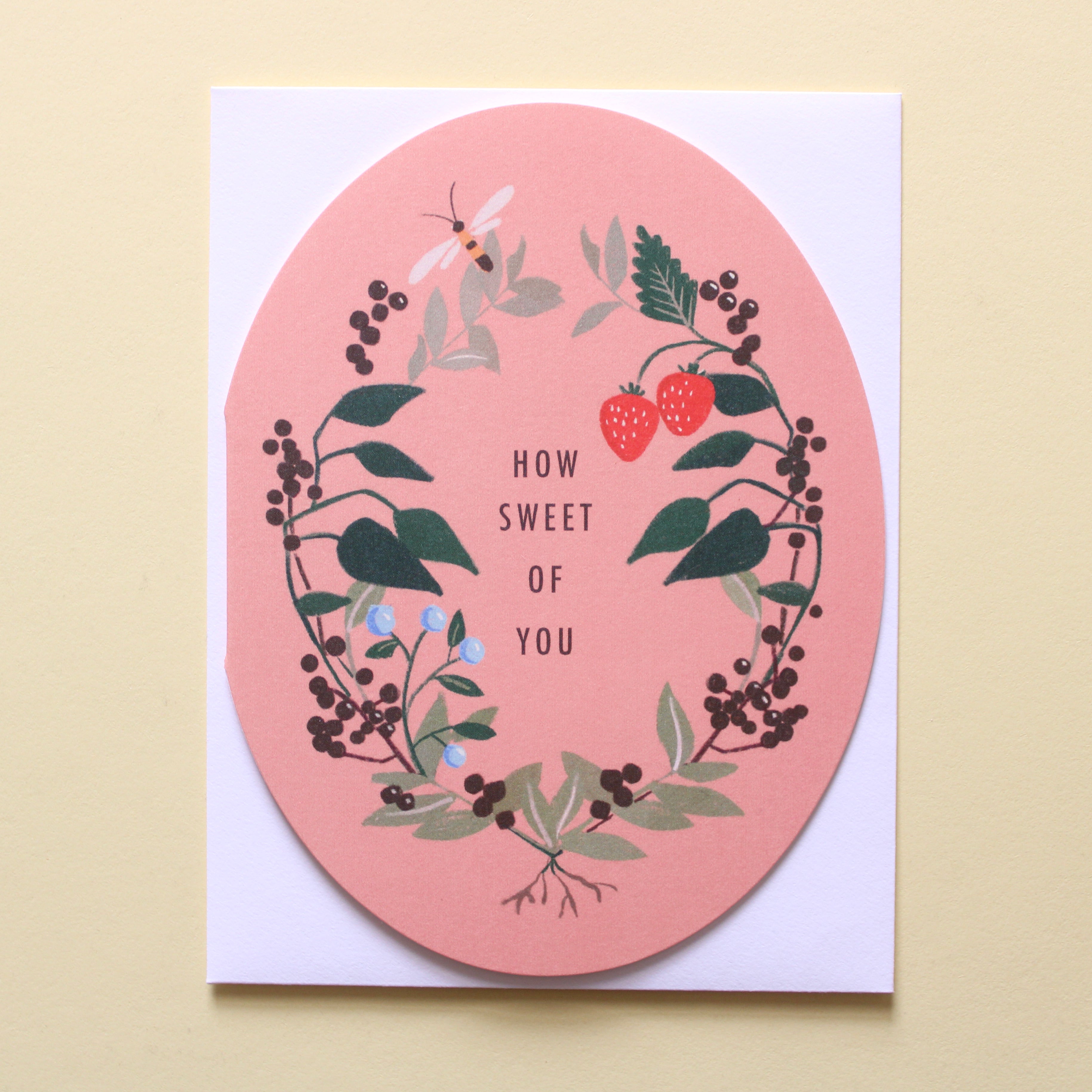 Beautiful warm white cover paper. 4.25 x 5.5". Blank interior. Includes coordinating envelope and plastic sleeve. Made in USA.