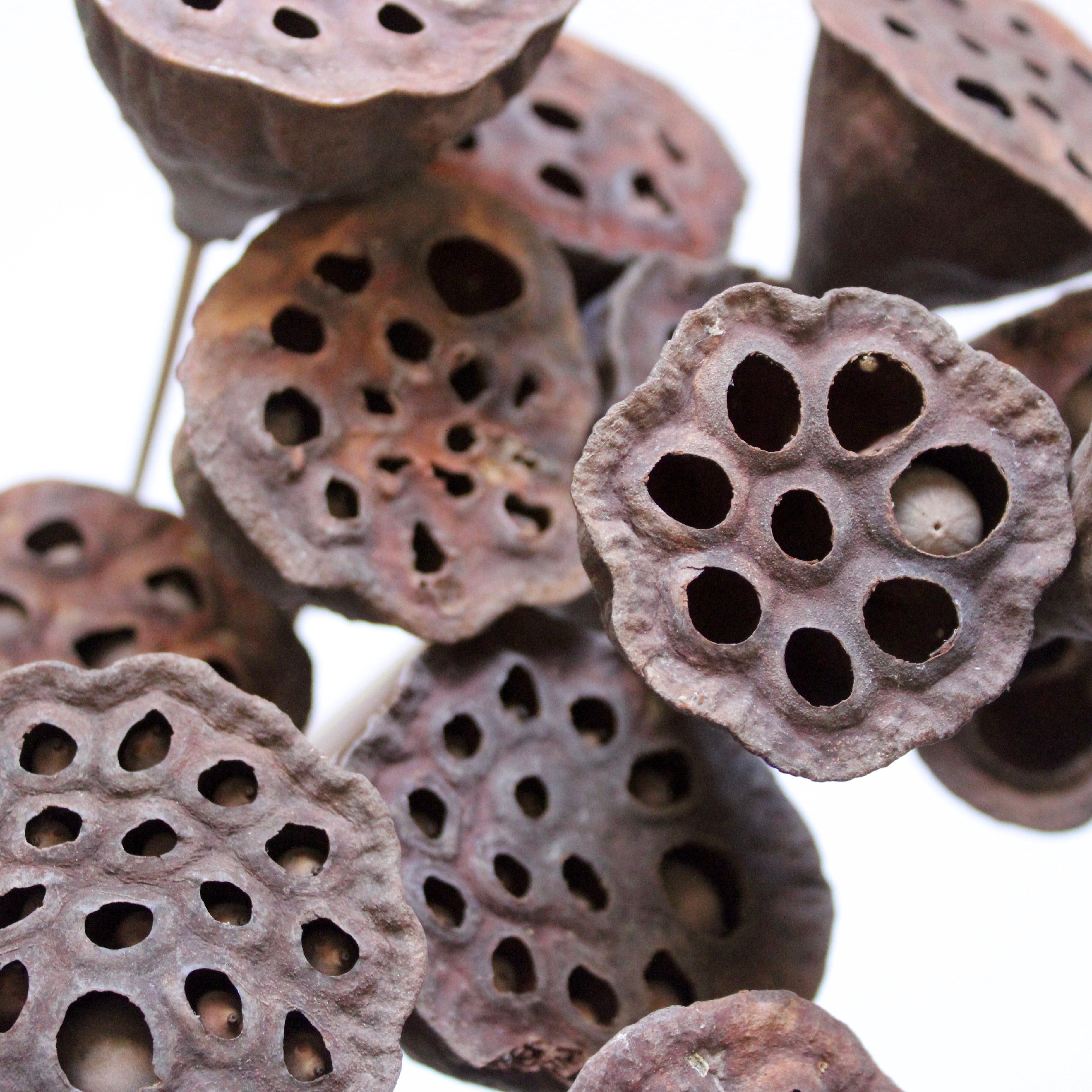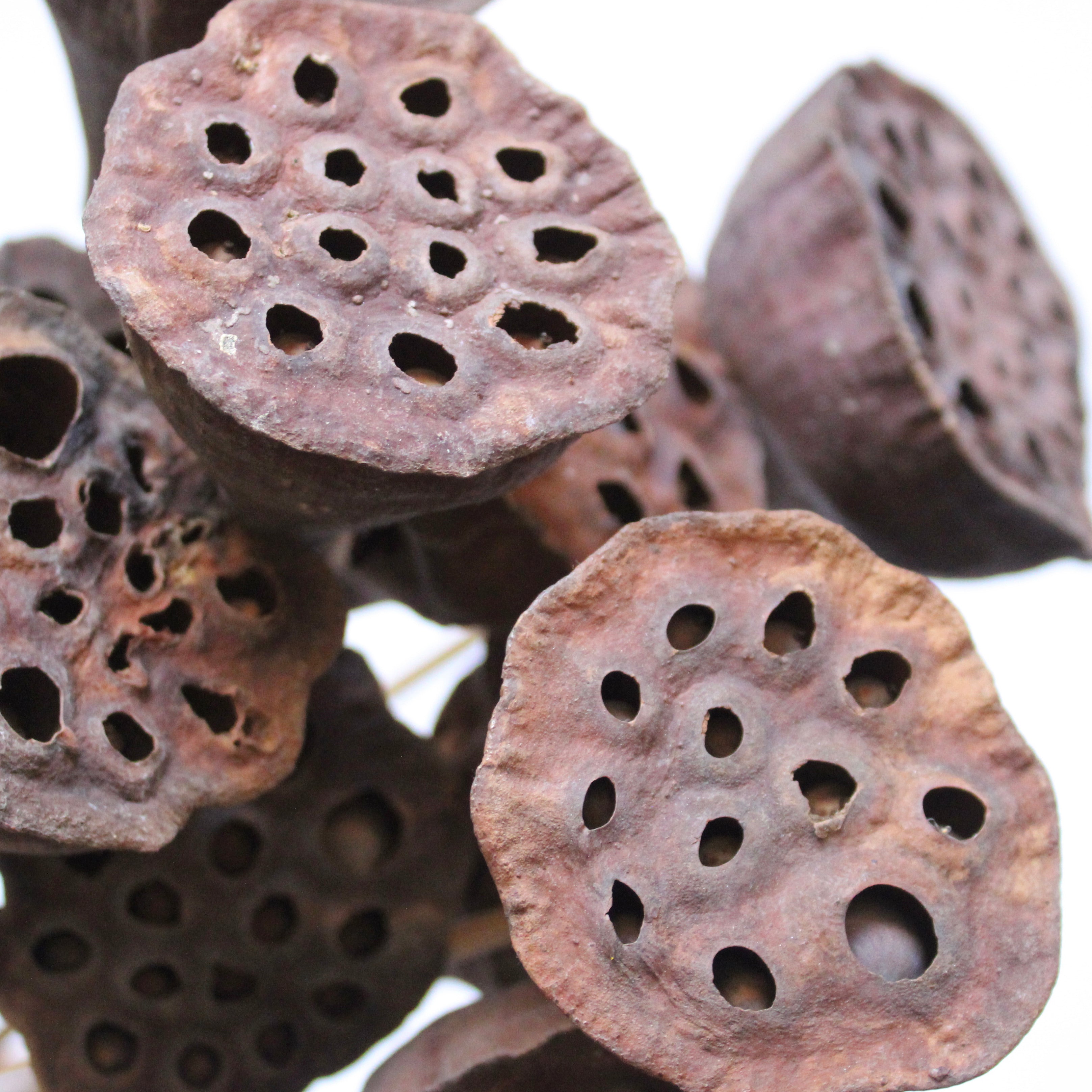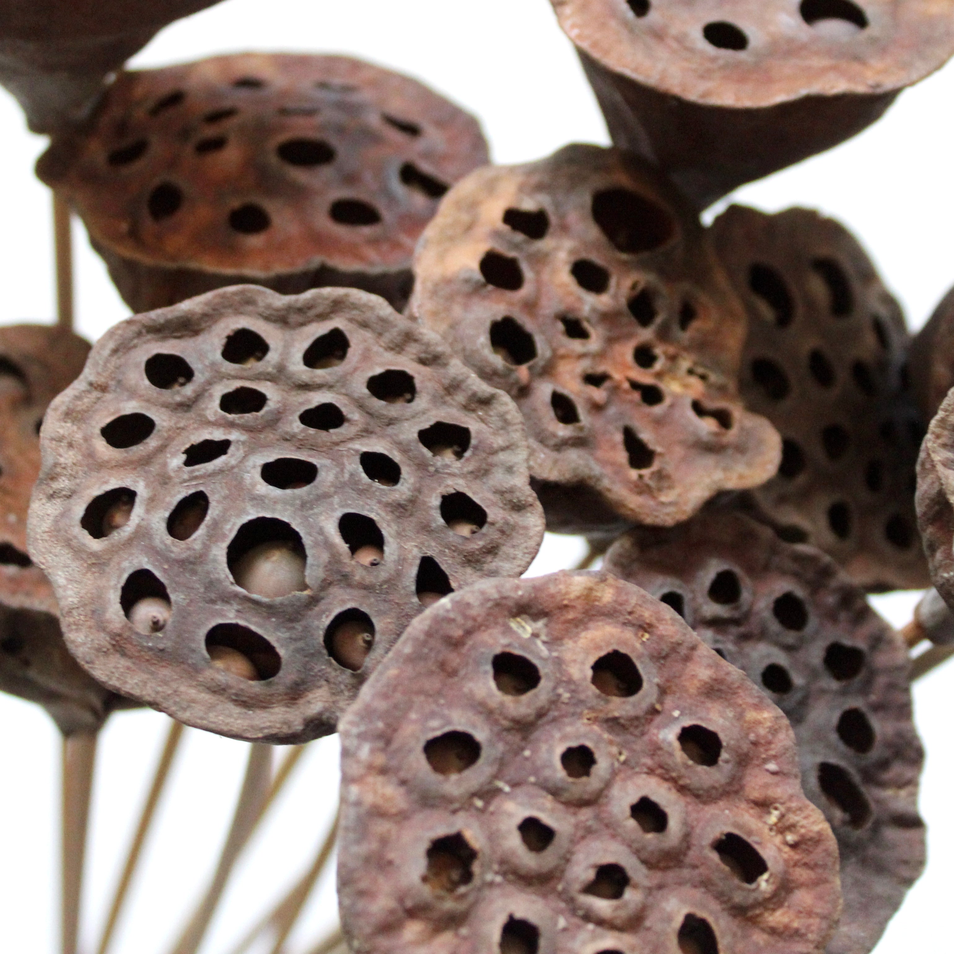 Typically found in ponds, lotus pods are the captivating remnants of the lotus flower’s stunning bloom. With their striking natural design, these pods bring instant intrigue to both organic and modern arrangements. Each pod is carefully attached to a long reed stem, making them effortless to incorporate into your creations.
