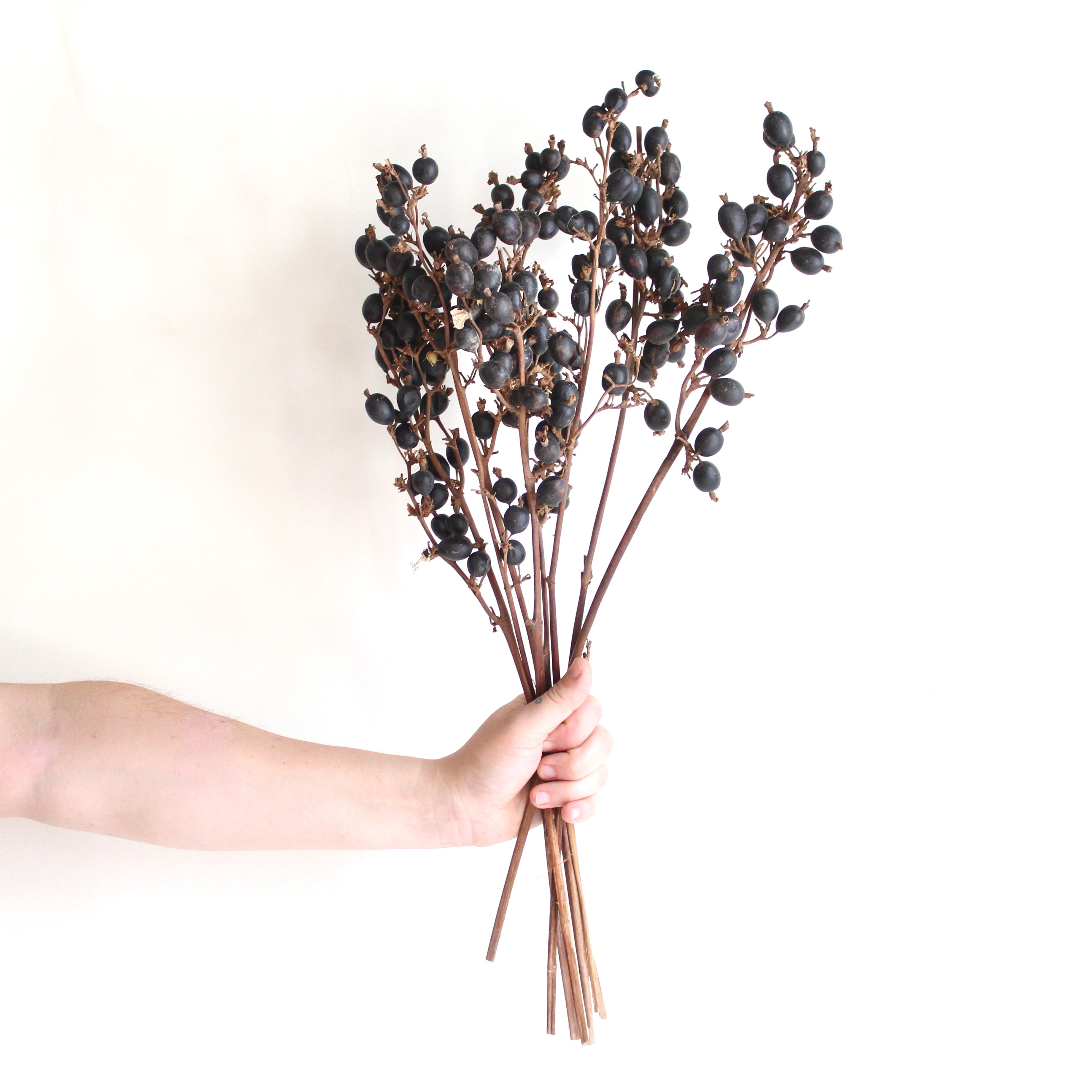 A tall, branching stem clustered with dark, dramatic berries—dried blackberry brings striking height and texture to any arrangement. Its deep color and sculptural form make it a standout element, whether used on its own or mixed into a larger design. We love how impactful just one stem can be.