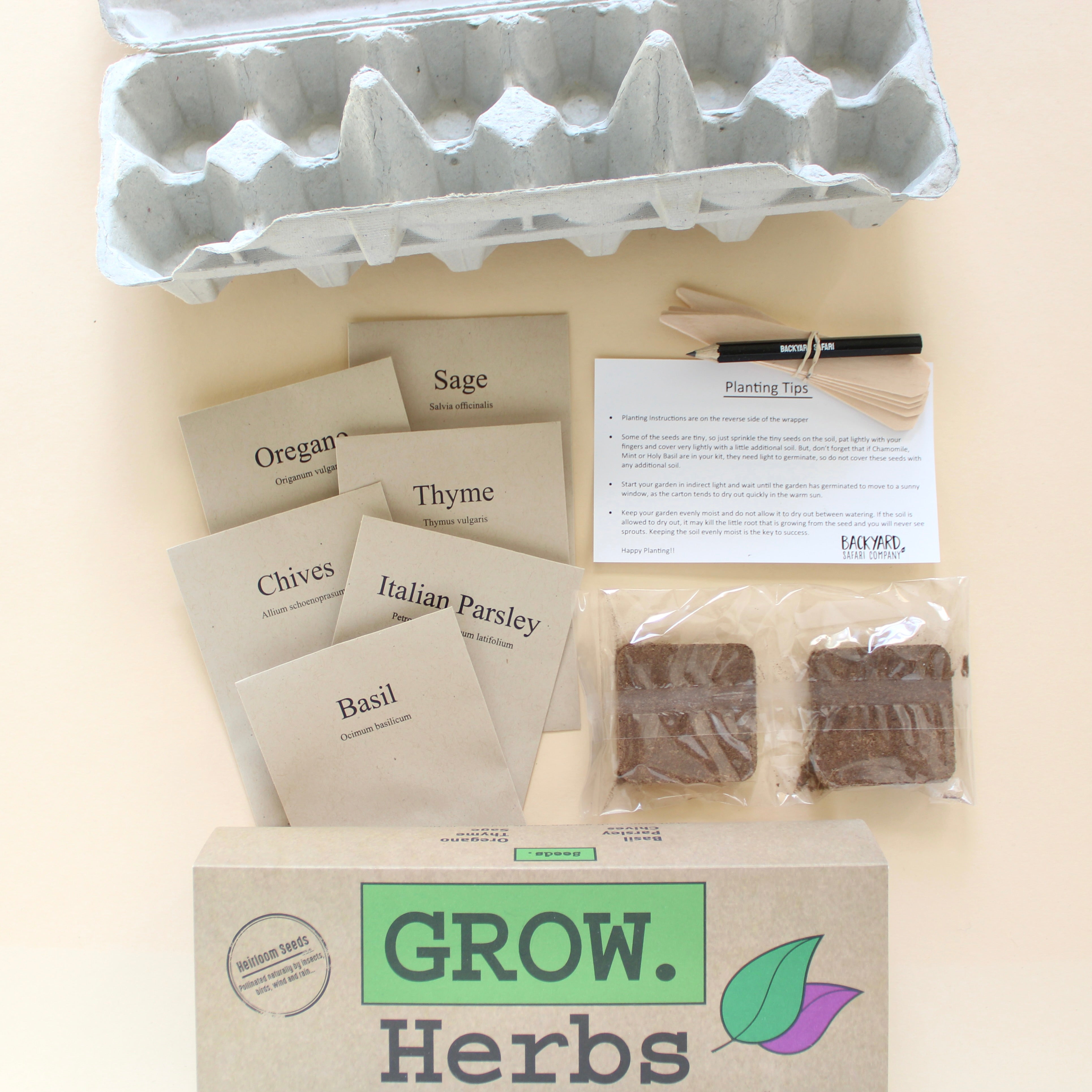 6 packages of Heirloom Seeds, Starter Soil, Wooden Plant ID Stakes, Growing Instructions, Pencil & 100% Recycled Fiber Egg Carton Planter!