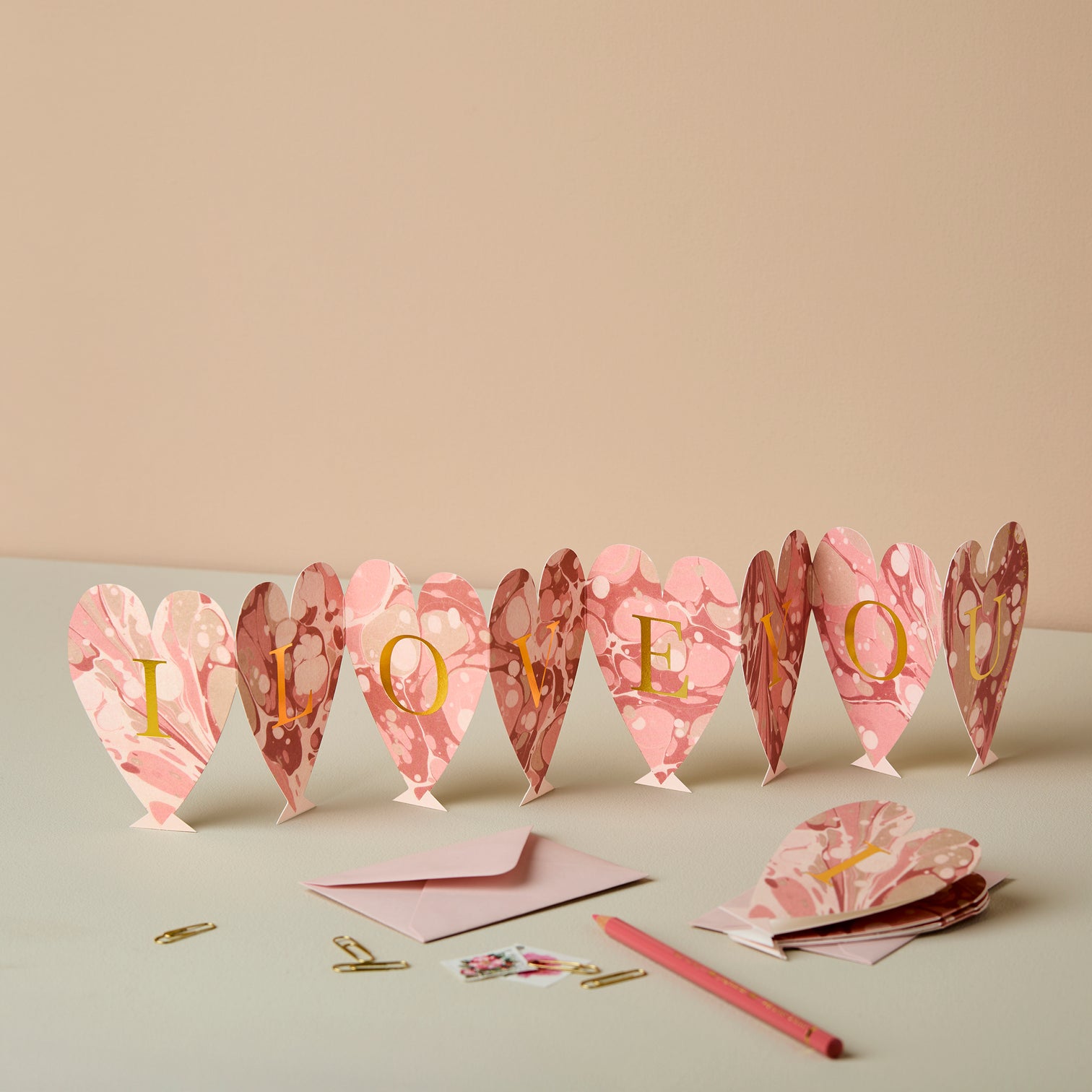 Pink marbled hearts make up this mini concertina card, with a gold foil letter printed onto each heart to read 'I Love You'. This is a really special design which looks beautiful displayed on a shelf or a mantelpiece at home. It is paired with a pale pink C7 envelope.