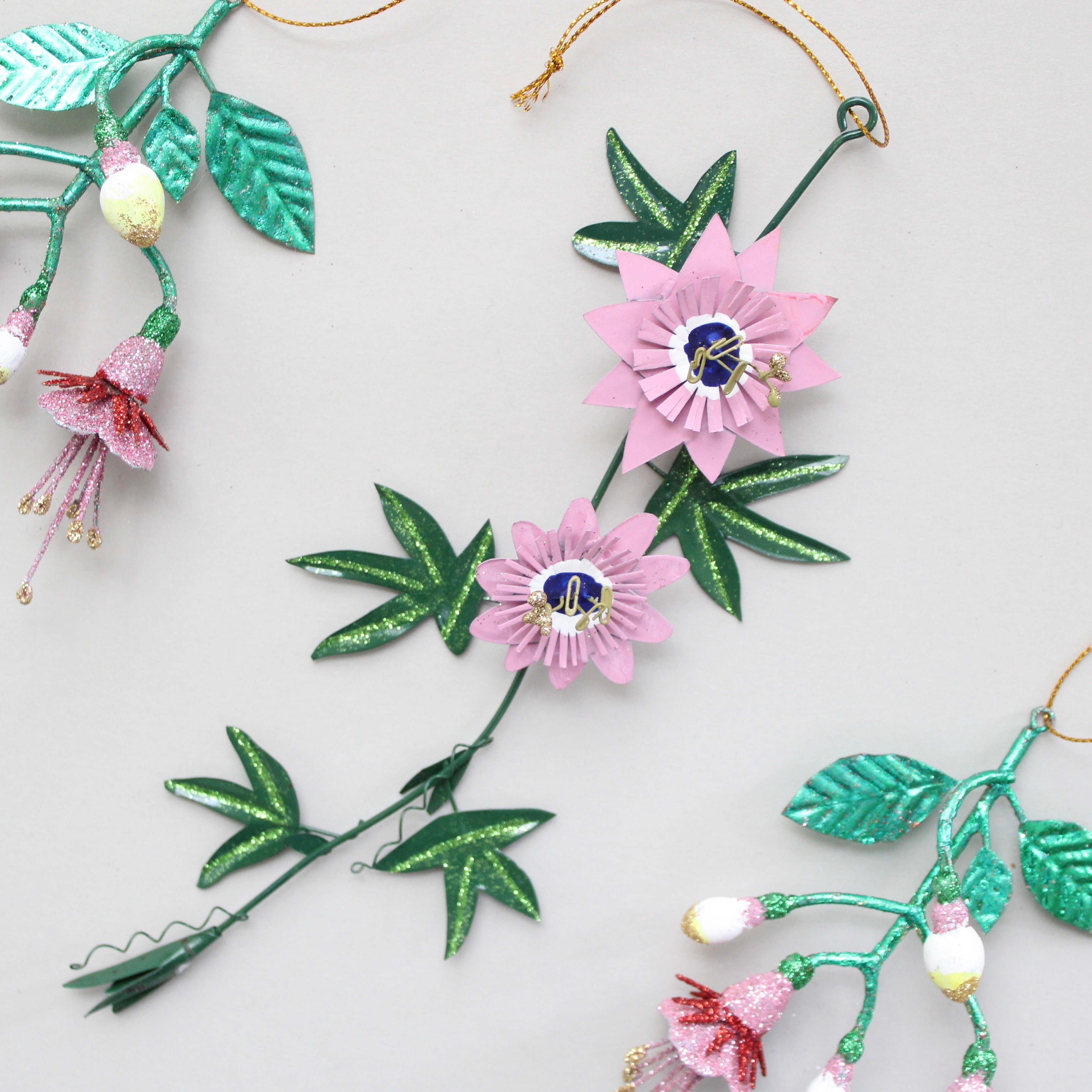 A bright bloom from warmer days, this passionflower ornament adds a cheerful note to any holiday tree. Lovely among an eclectic mix of ornaments or as part of a purely floral display, it brings a hint of summer’s color and charm to the winter season.
