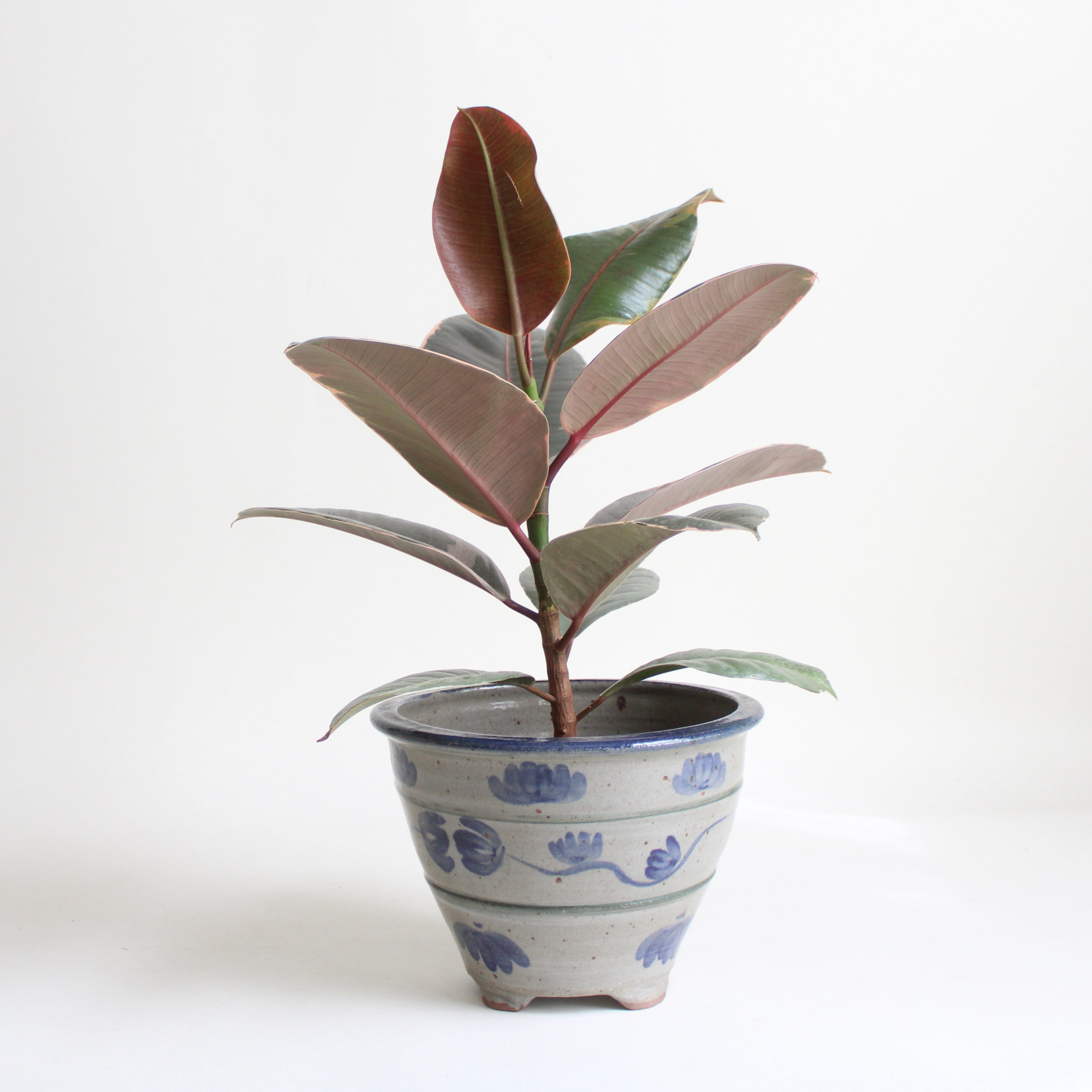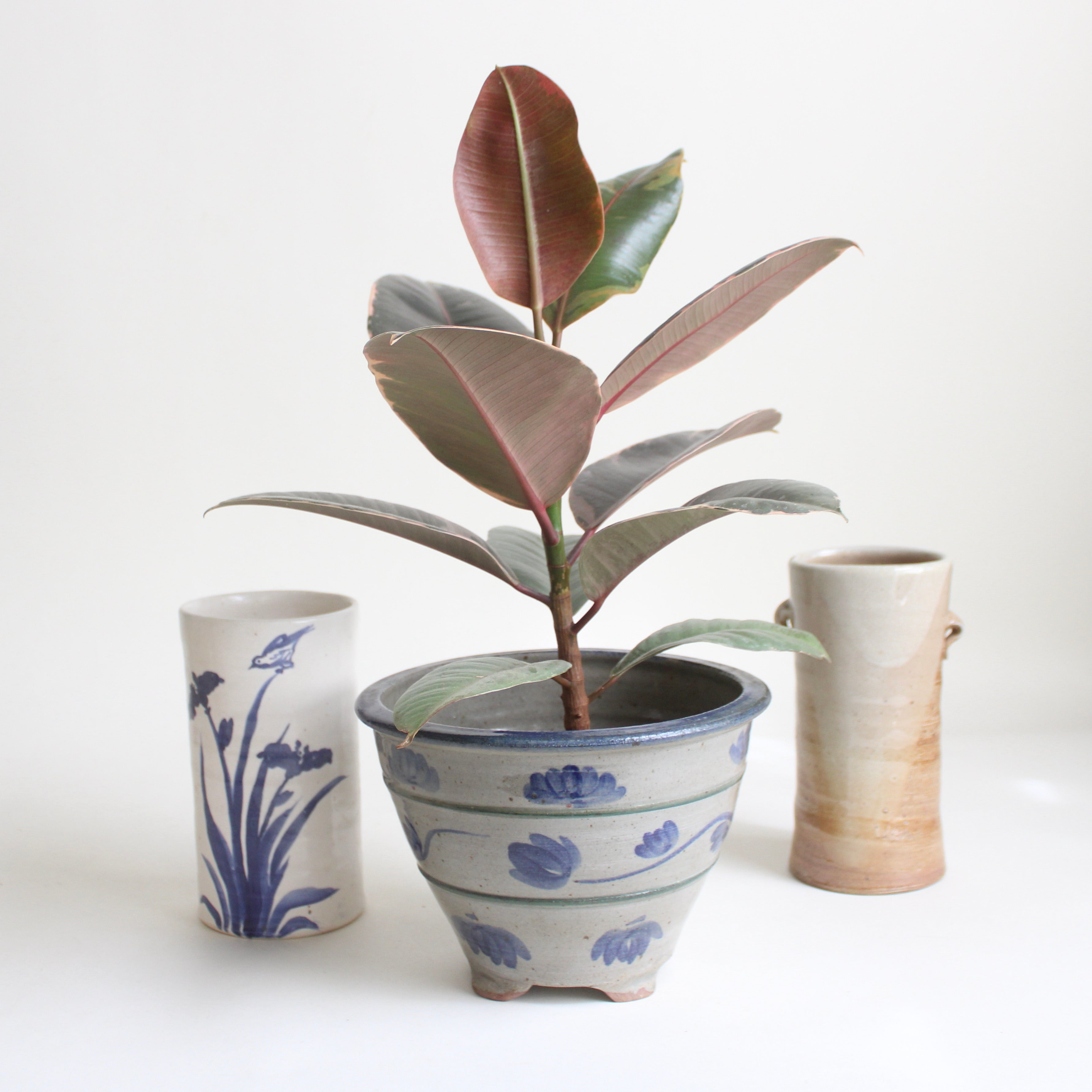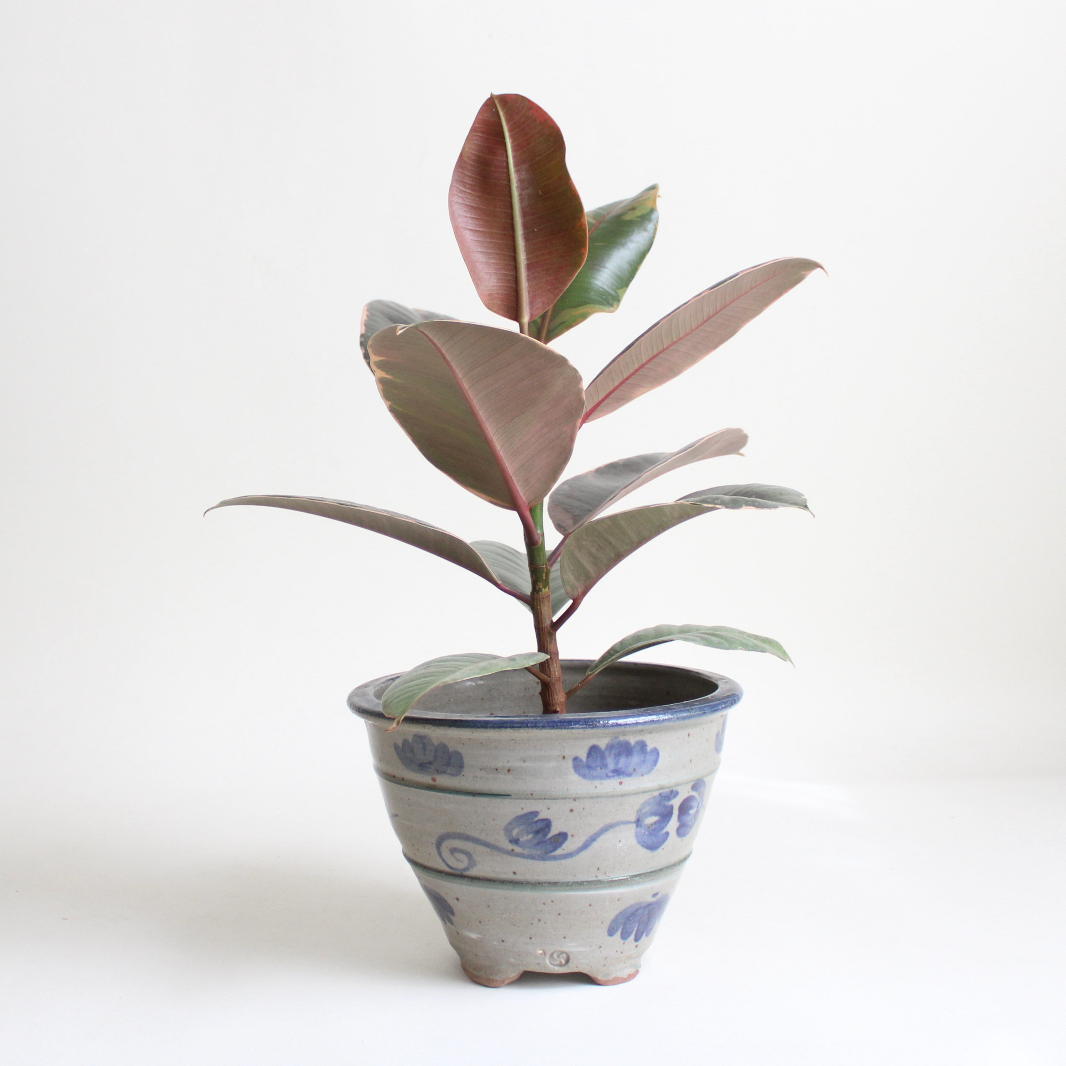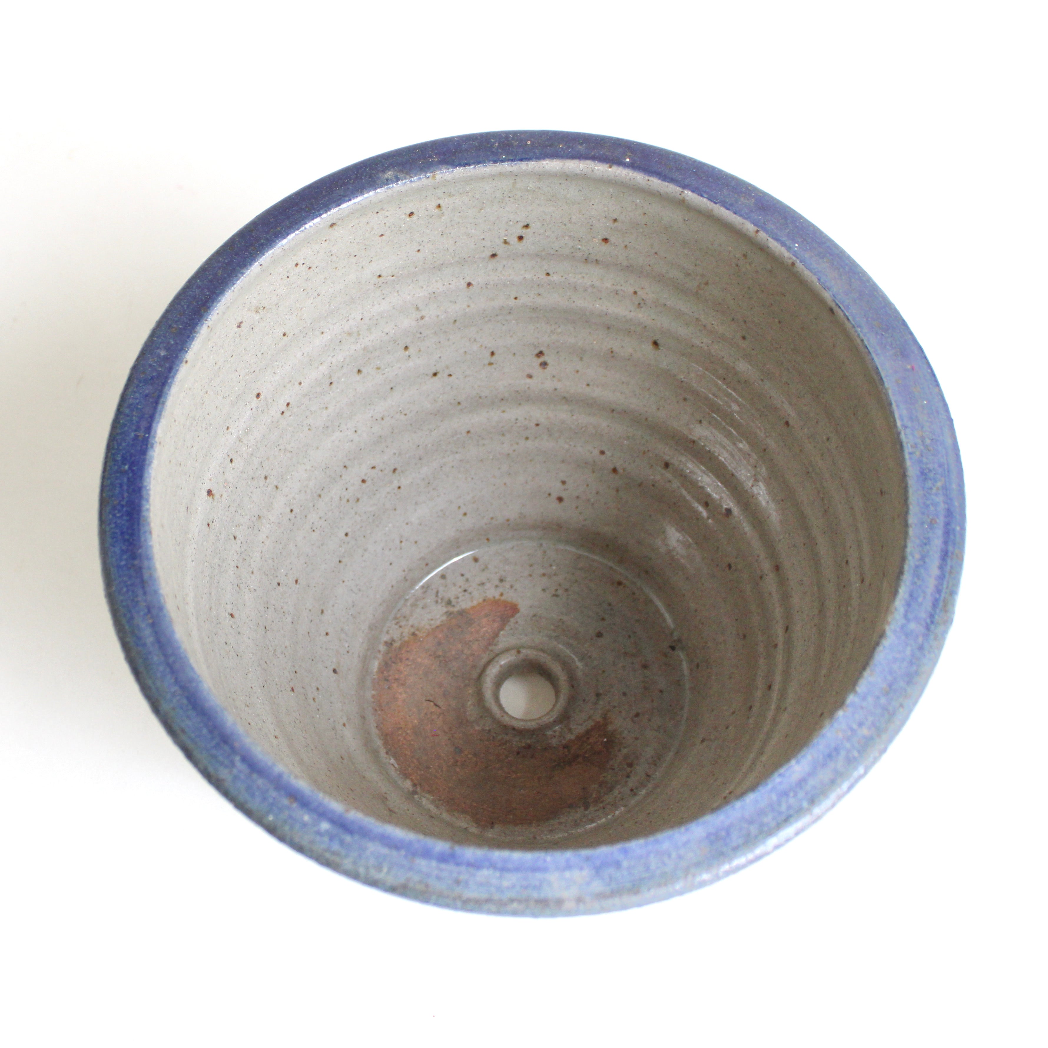 I found this planter in a dusty back corner of my kiln shed and remembered setting it aside years ago as a perfect example of one of my favorite glazes… Look closely at the pictures of this stoneware planter glazed in a soft gray with cobalt blue flowers… it is dated on the bottom from the 1990’s when my kiln was first built and my throwing skills were mastered. Truly a fine old piece that will complement any planting it contains.