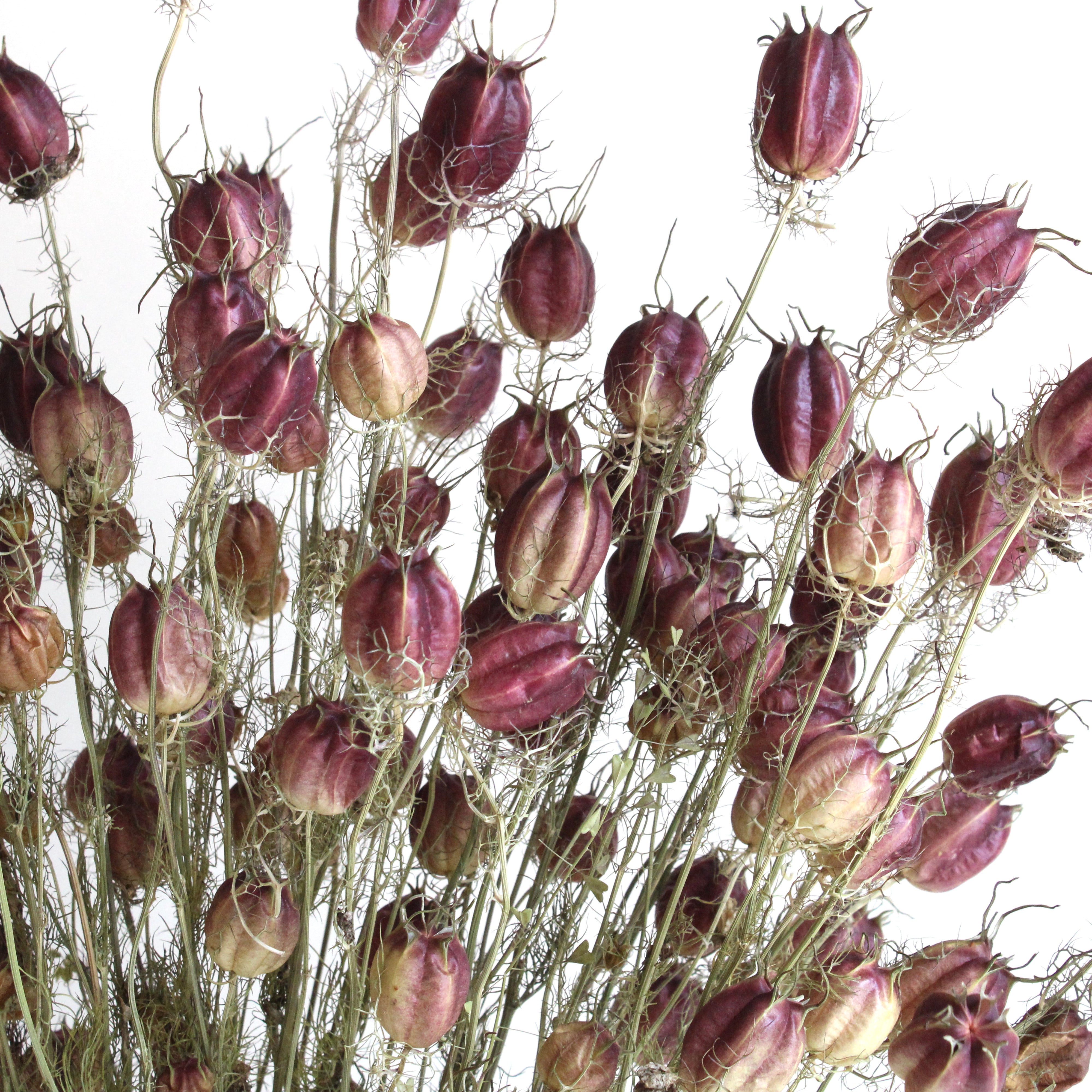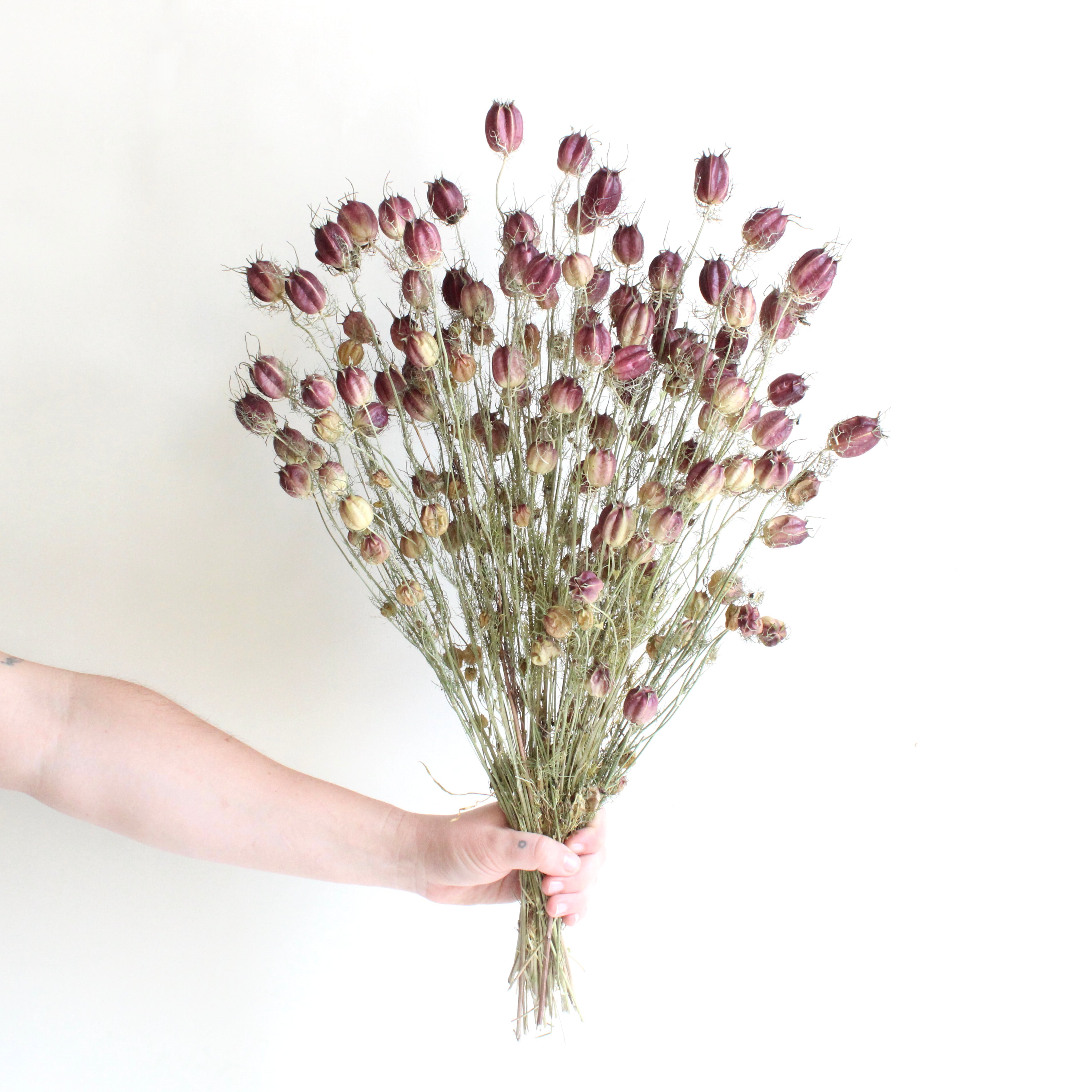 When picked at just the right moment, the delicate love-in-a-mist flowers pods can be preserved and lend their beautiful green and dark maroon colors to small or large arrangements alike. The lacy greens and unique pods make this bunch a must-have for your dried flower arsenal.